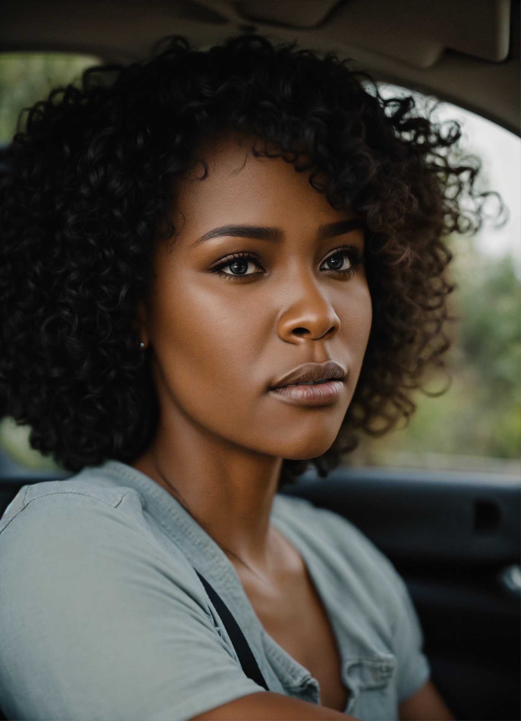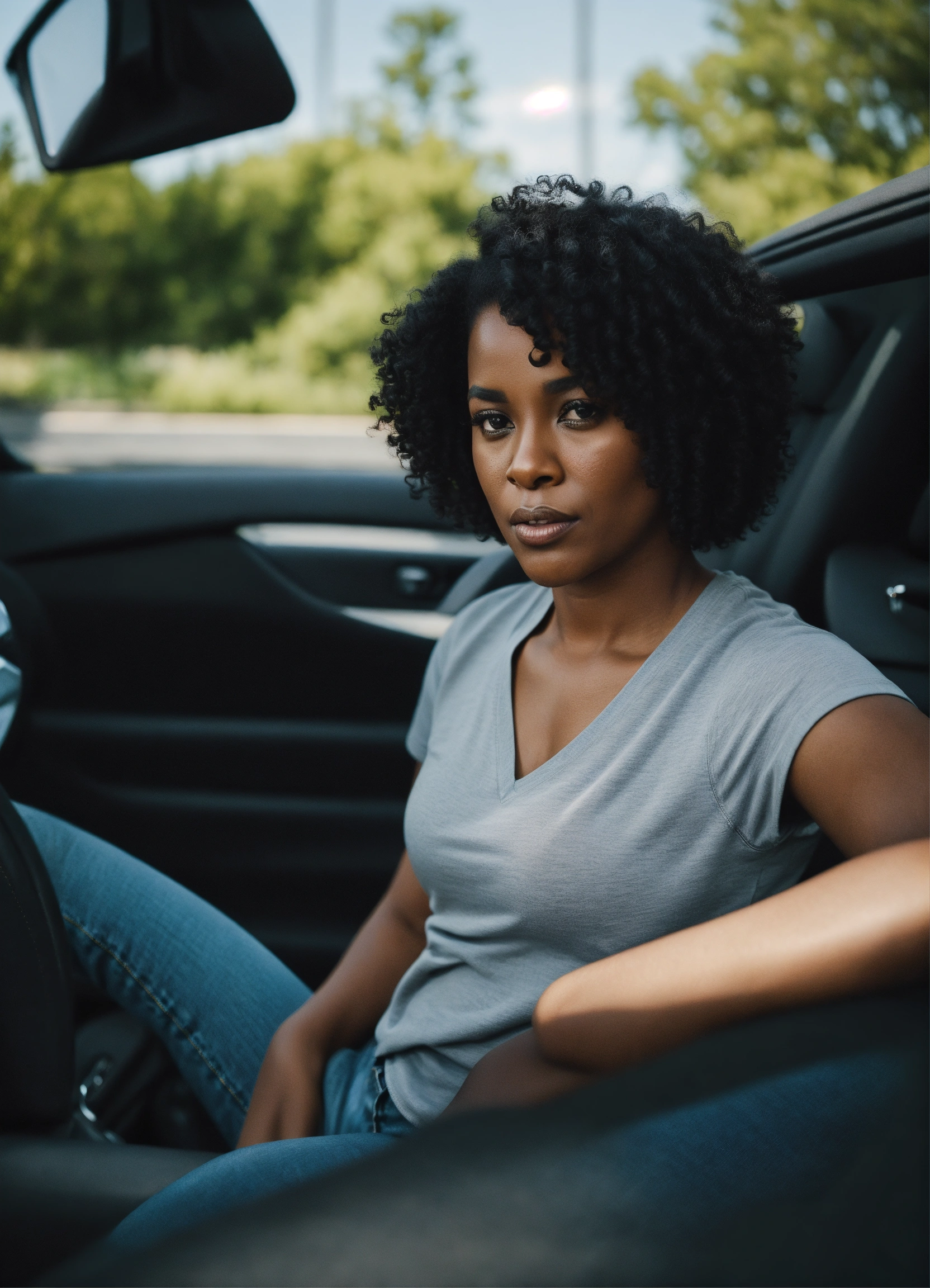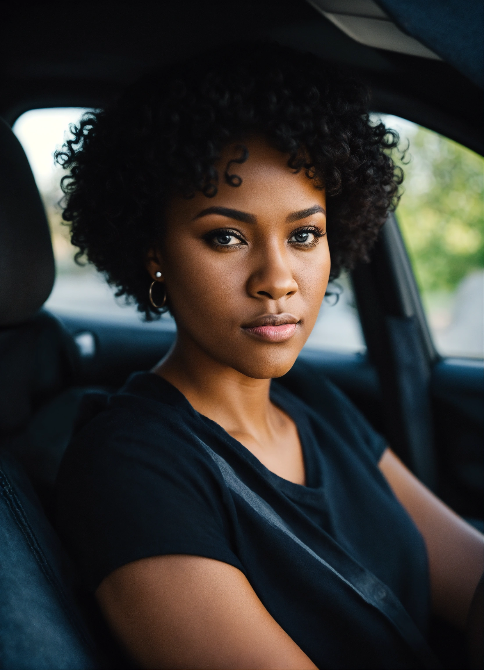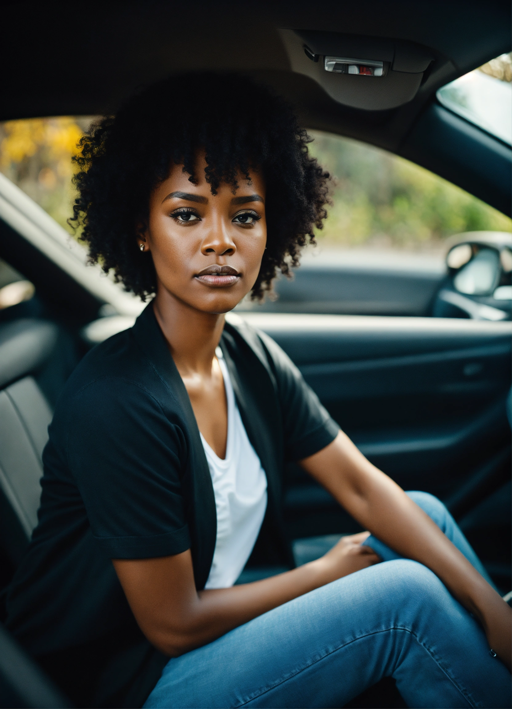 A black, beautiful 30 yo woman, short curly hair, serious and determined. she is in the driver's seat of a black car, wearing simple and discreet clothes, a t-shirt and jeans.