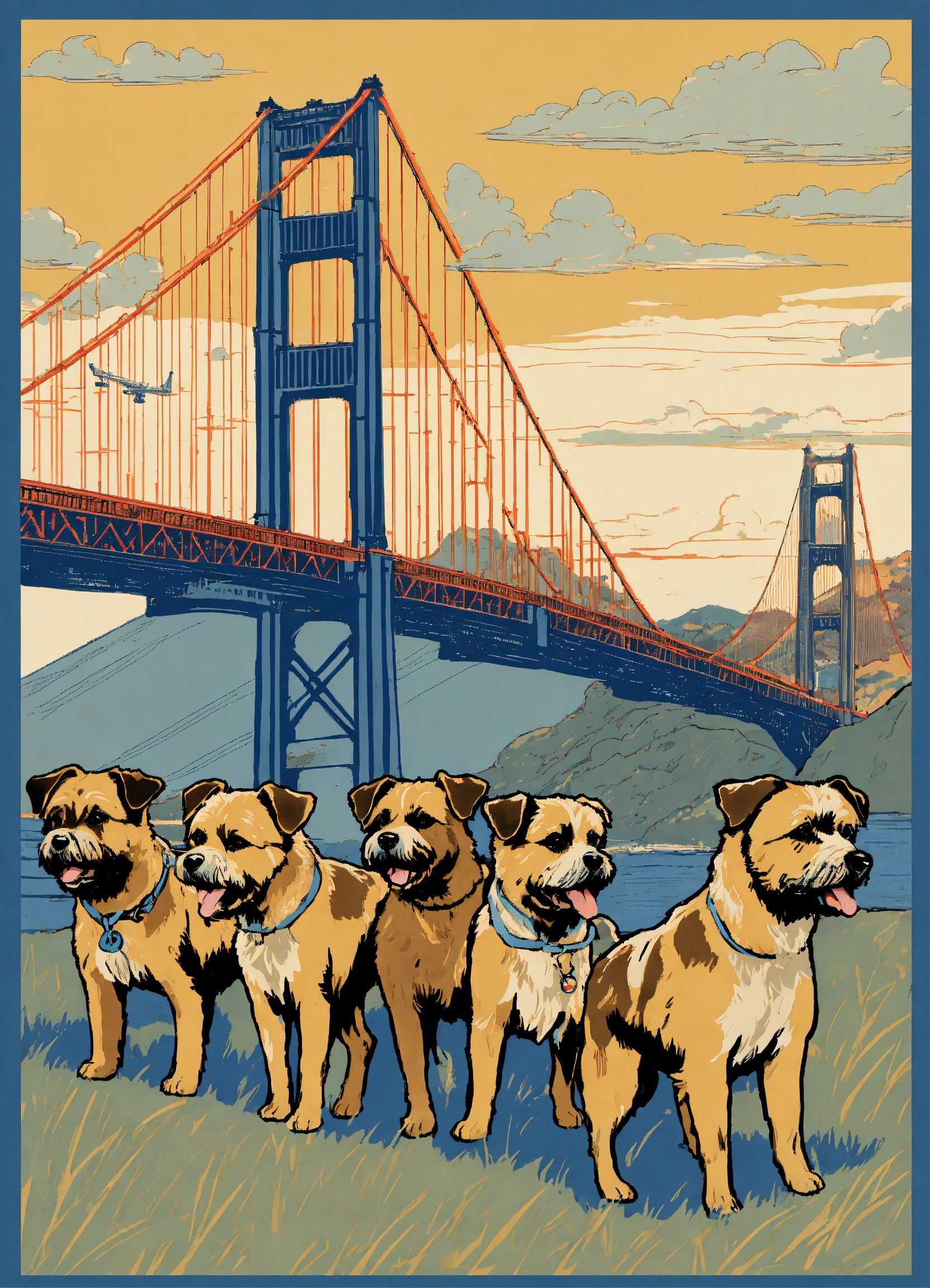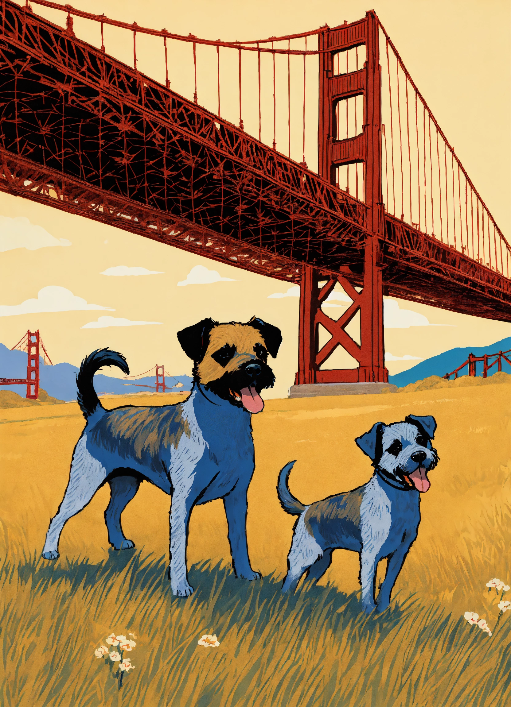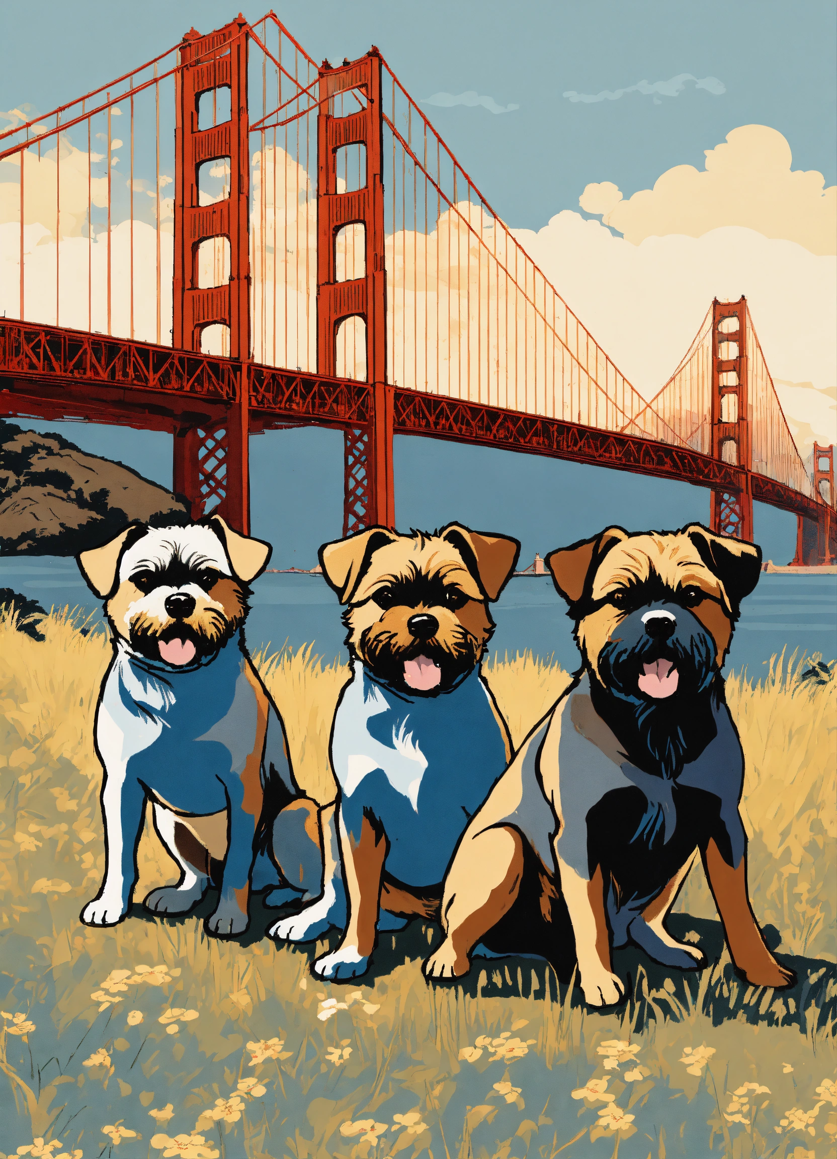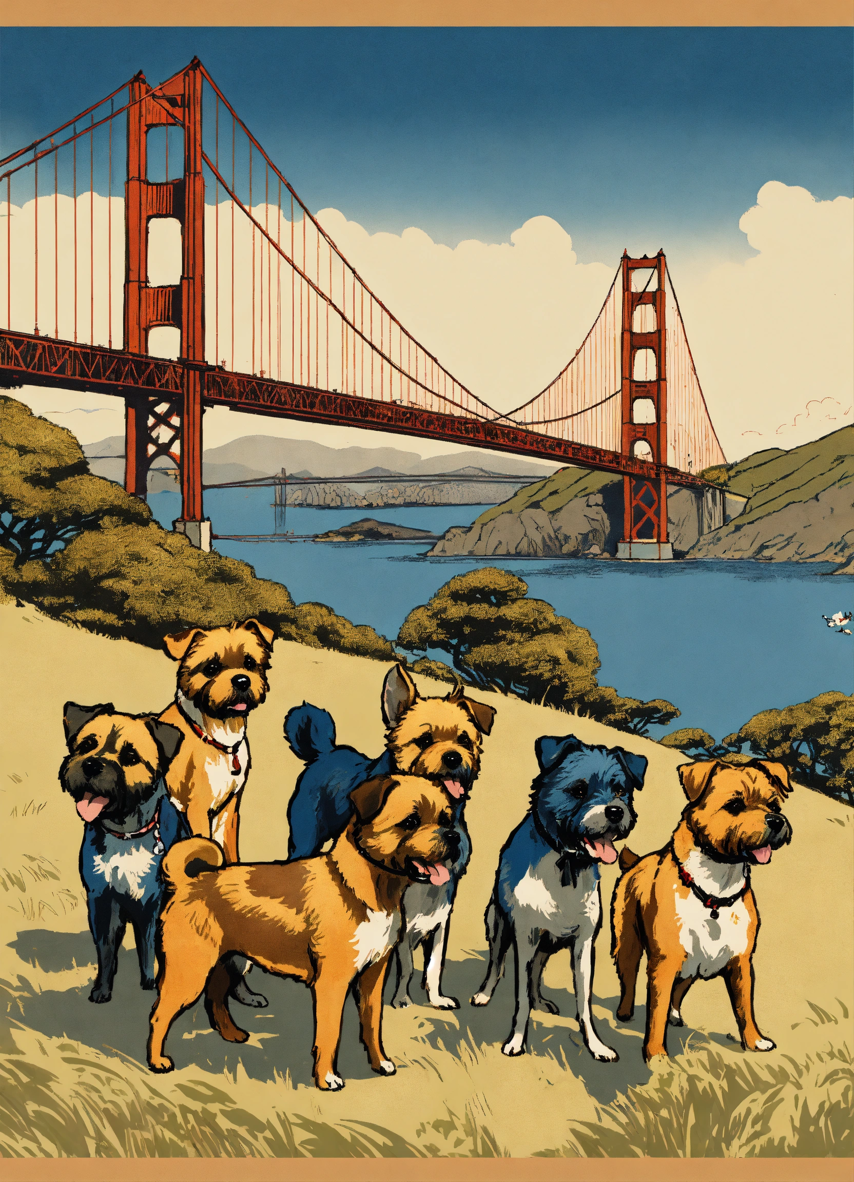 Ukiyo-e style print of group of border terriers, in grizzle and blue and tan, playing in a field, golden gate bridge.