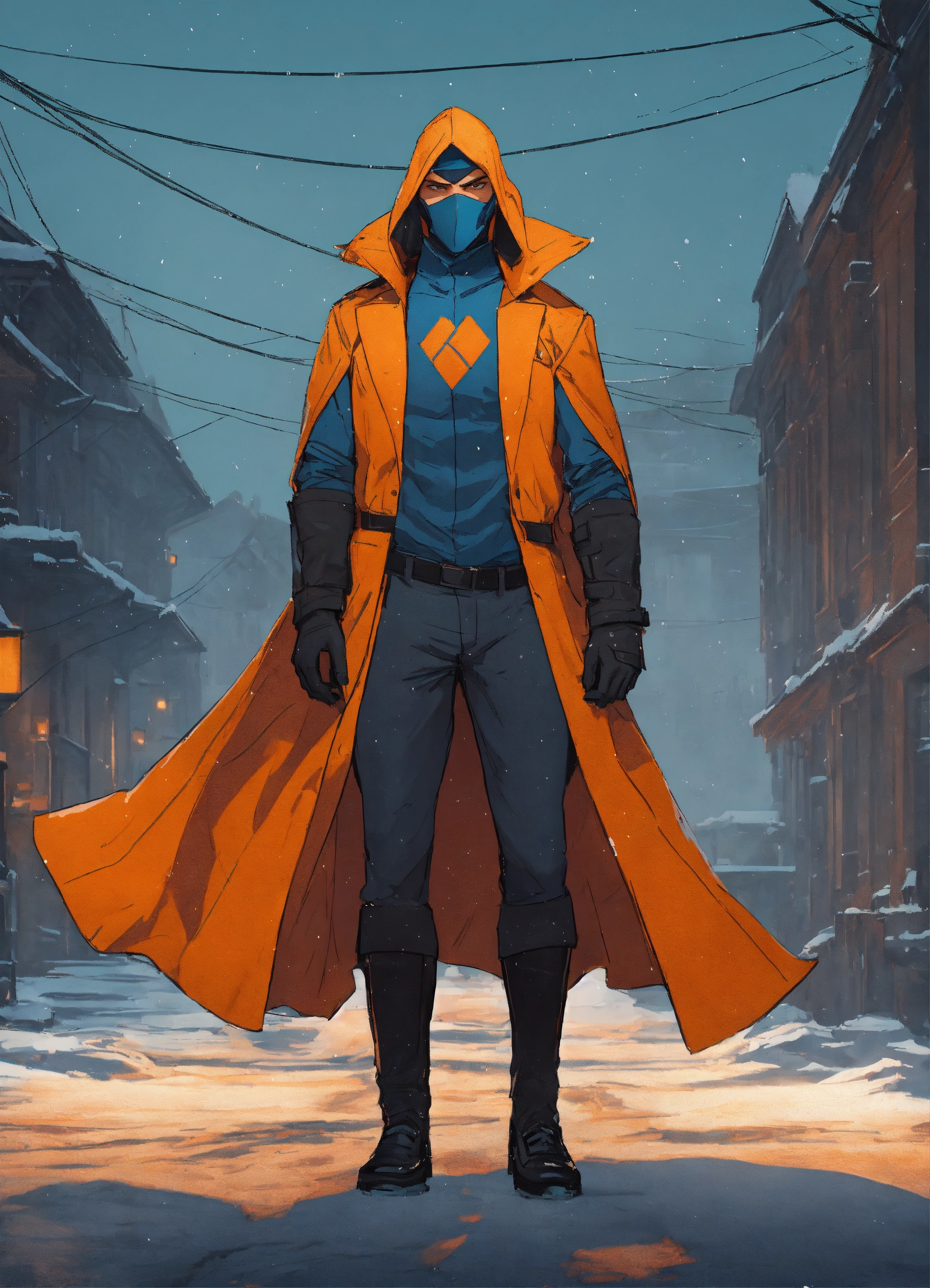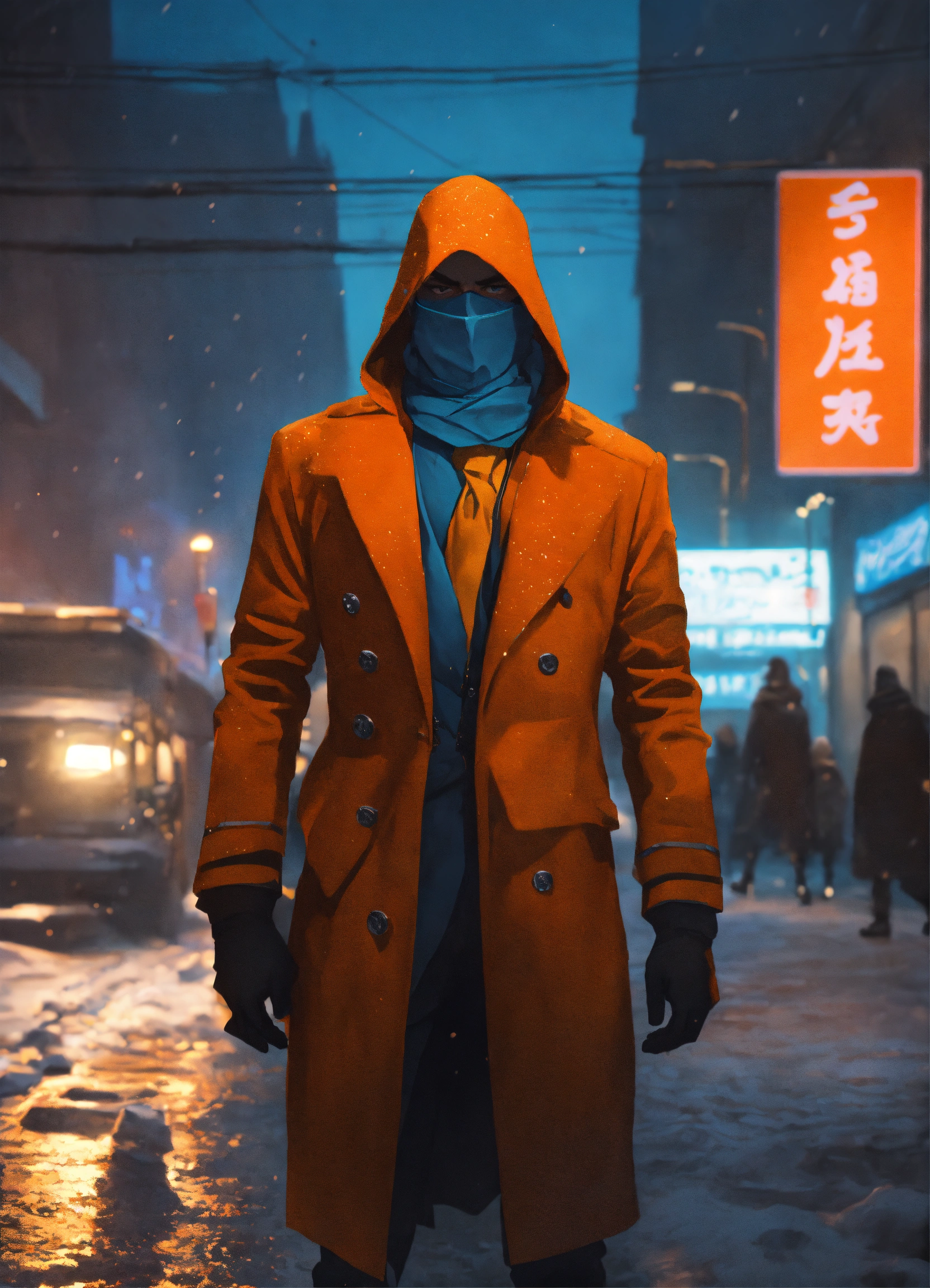 "the image shows liar, a tall, thin male supervillain, with a strong and menacing appearance. his face is covered by an orange balaclava that features the word 'liar' in bold golden letters. he wears a dark, elegant suit that accentuates his figure. her shoes are a striking light blue shade that contrasts with the rest of her outfit. the setting is a dark, snowy street in russia, creating a mysterious and dangerous atmosphere. the image is designed in high resolution (8k) and stands out for its detail, impressive shading and fluidity in the representation of the character, in the style of the wlop artist."