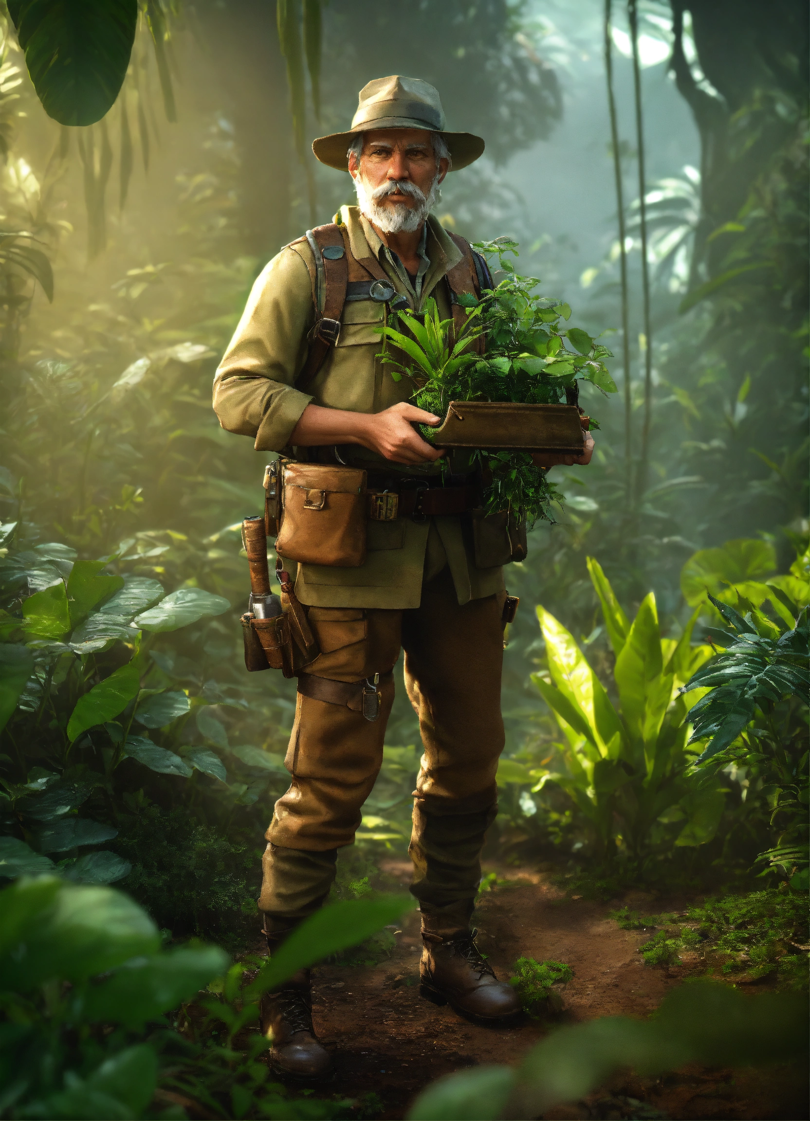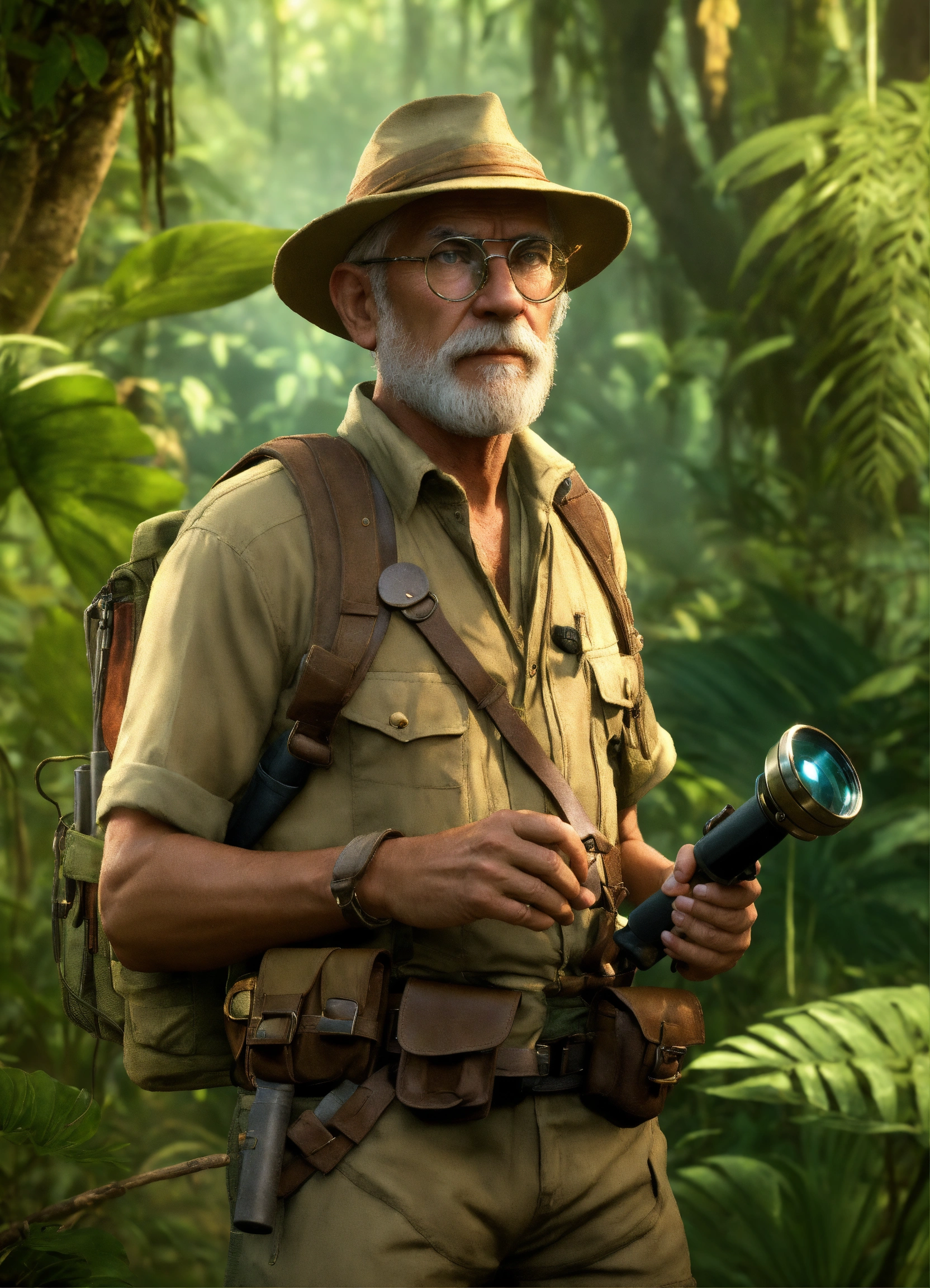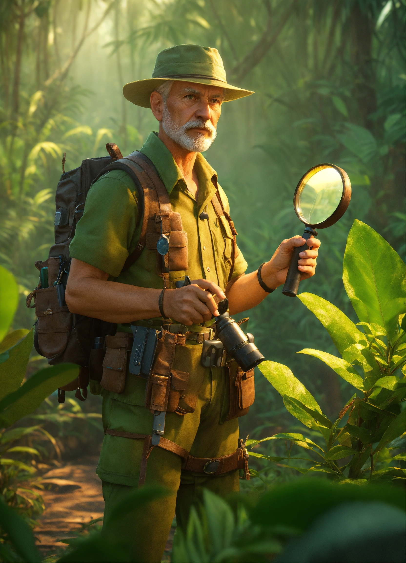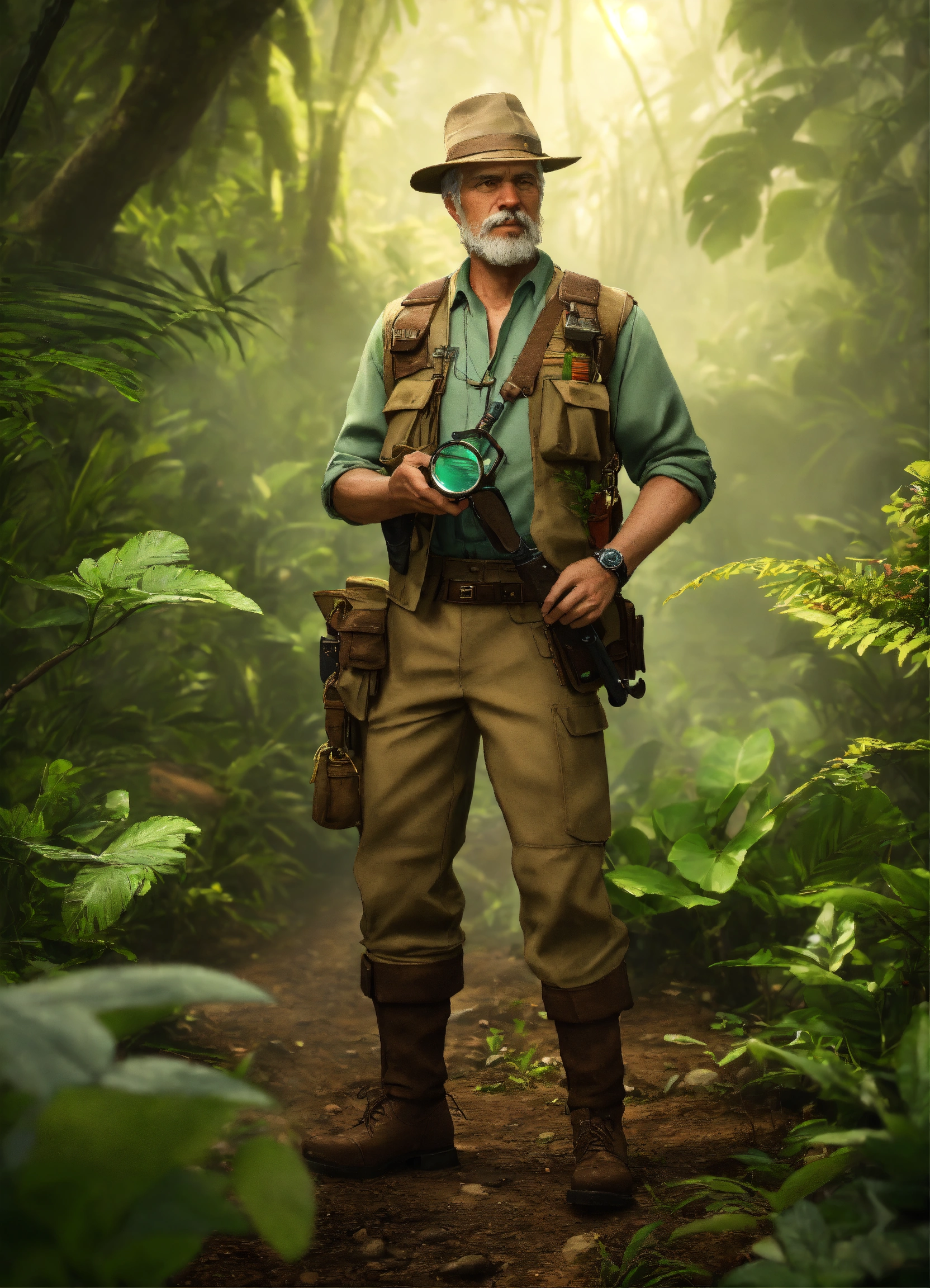 Establishing shot of a front view of a 60 year old botanist, who discovers a rare plant, in a humid jungle.detailed tenue and objets, with in expedition clothing, with a jumanji video game look, with a magnifying glass in this hand, with a machete in its holster attached to his belt. detailed image with vintage 3d adventure video game animation style, with natural lighting at dawn, high humidity atmosphere. detailed posture of the character, he is standing, he is holding his magnifying glass in this hand. detailed a rare plant discover, she is in the foreground of this image, in front of the character.