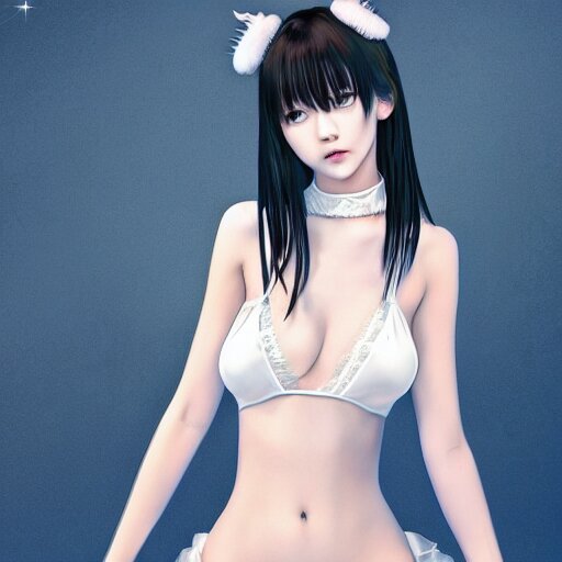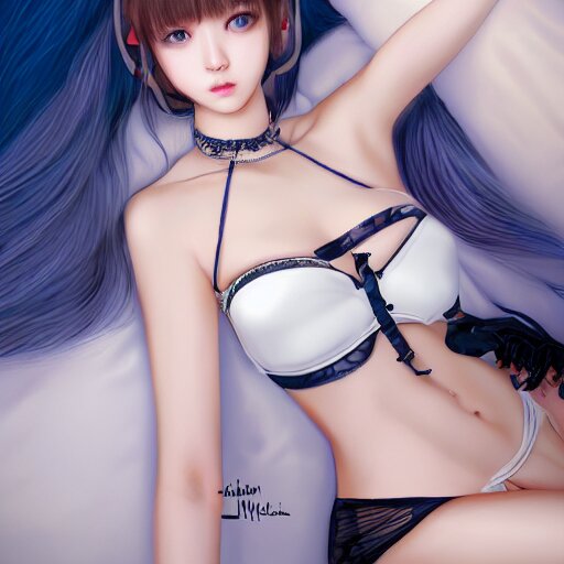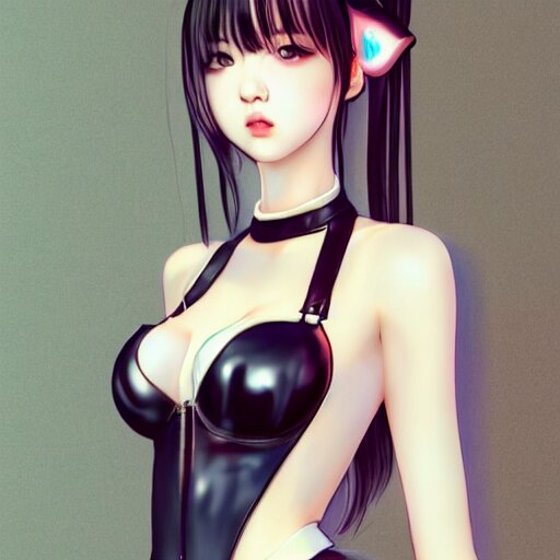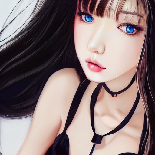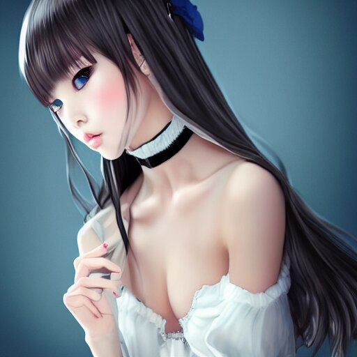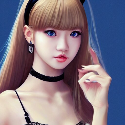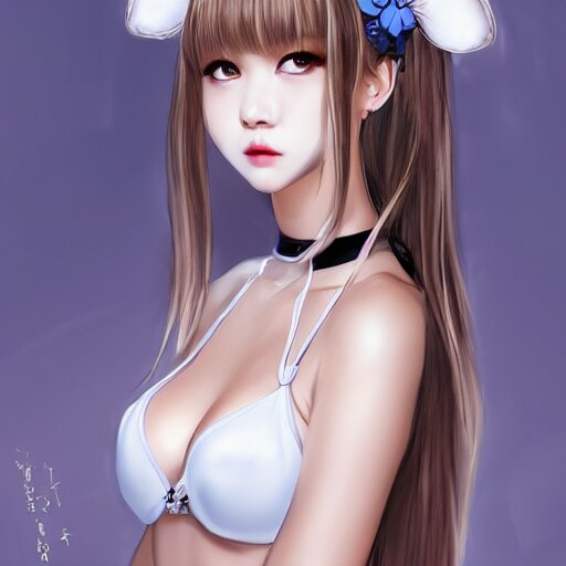 Realistic detailed semirealism beautiful gorgeous cute blackpink lalisa manoban wearing long silk soft silky white lingerie outfit, blue eyes blue iris, black hair black cat ears, black leather choker, proportional body, wlop, aztodio, taejune kim, sakimichan, artgerm, pixiv, instagram, artstation