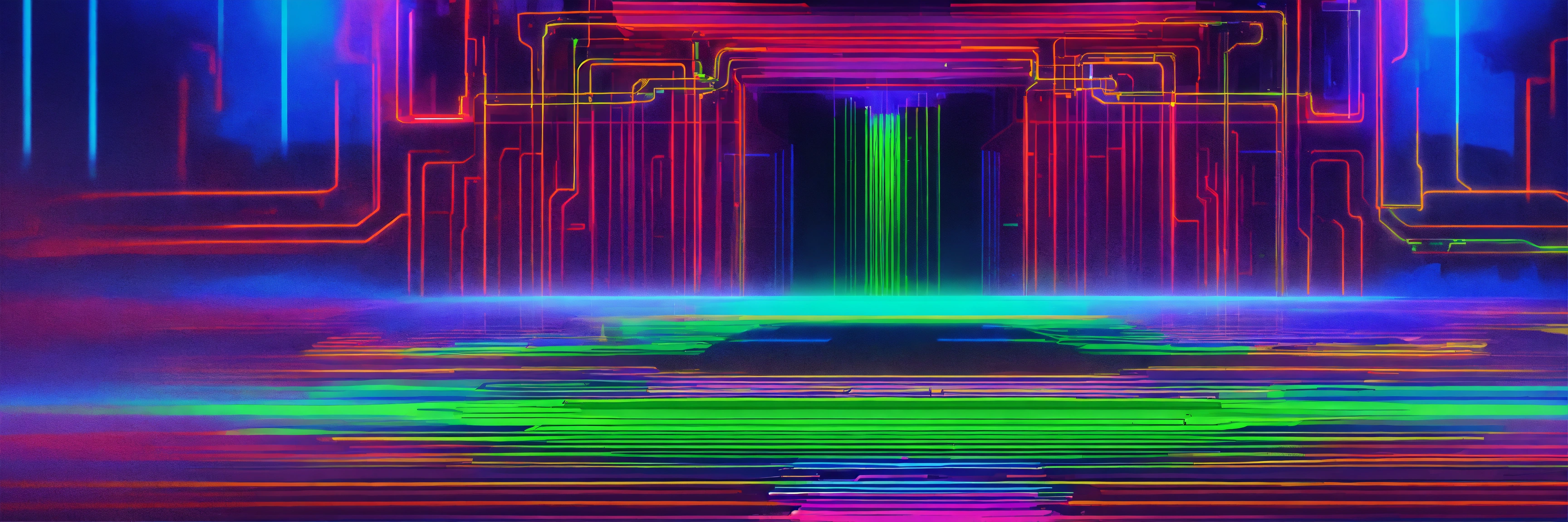 369, azure, center of image blurry, blank with circuit board, balancing energy colors, neon green, neon red, neon blue, path, bright and inviting, blank, abstract lines, god lines, green lines, purple lines, redlines, aura in harmony.