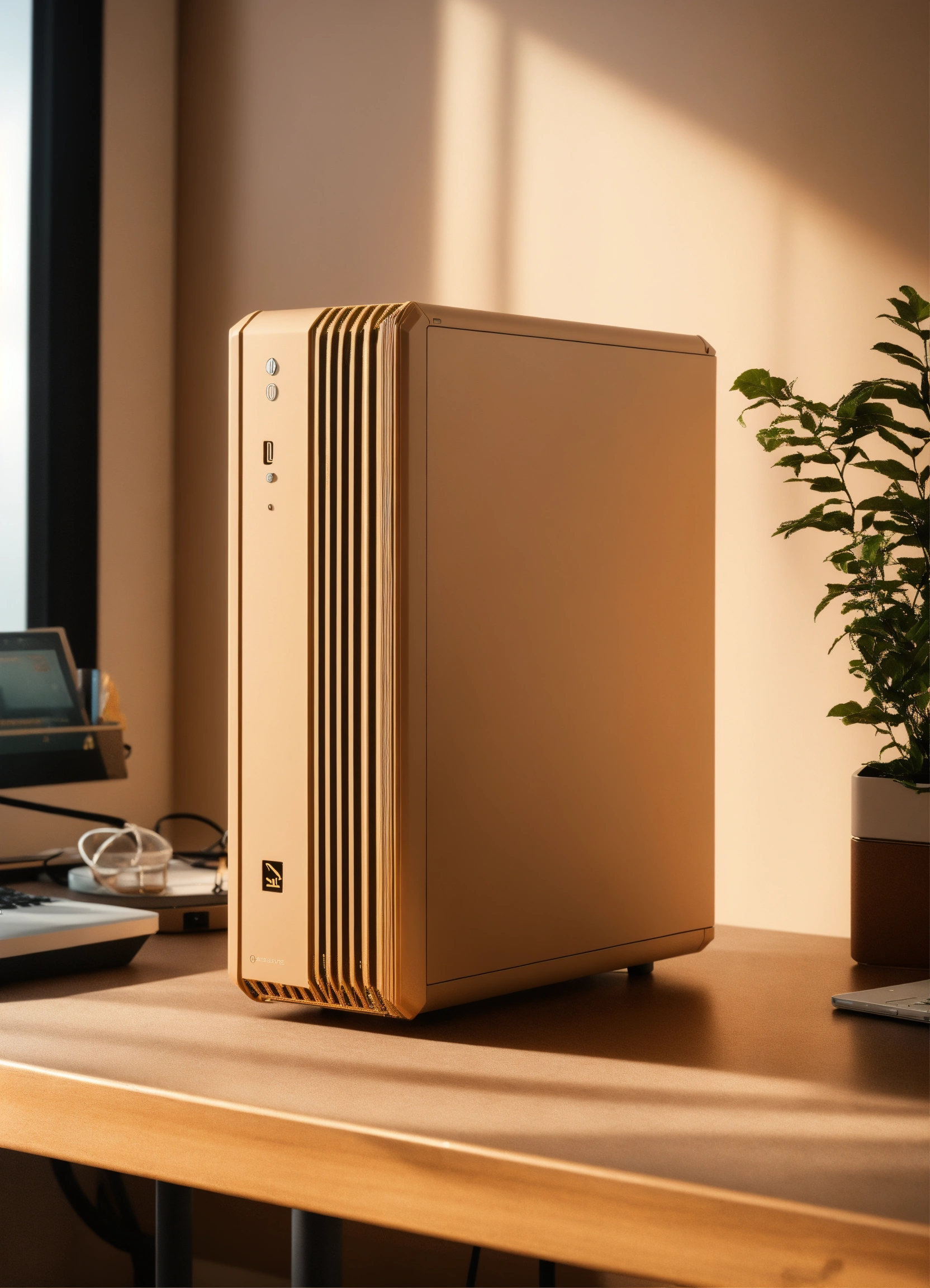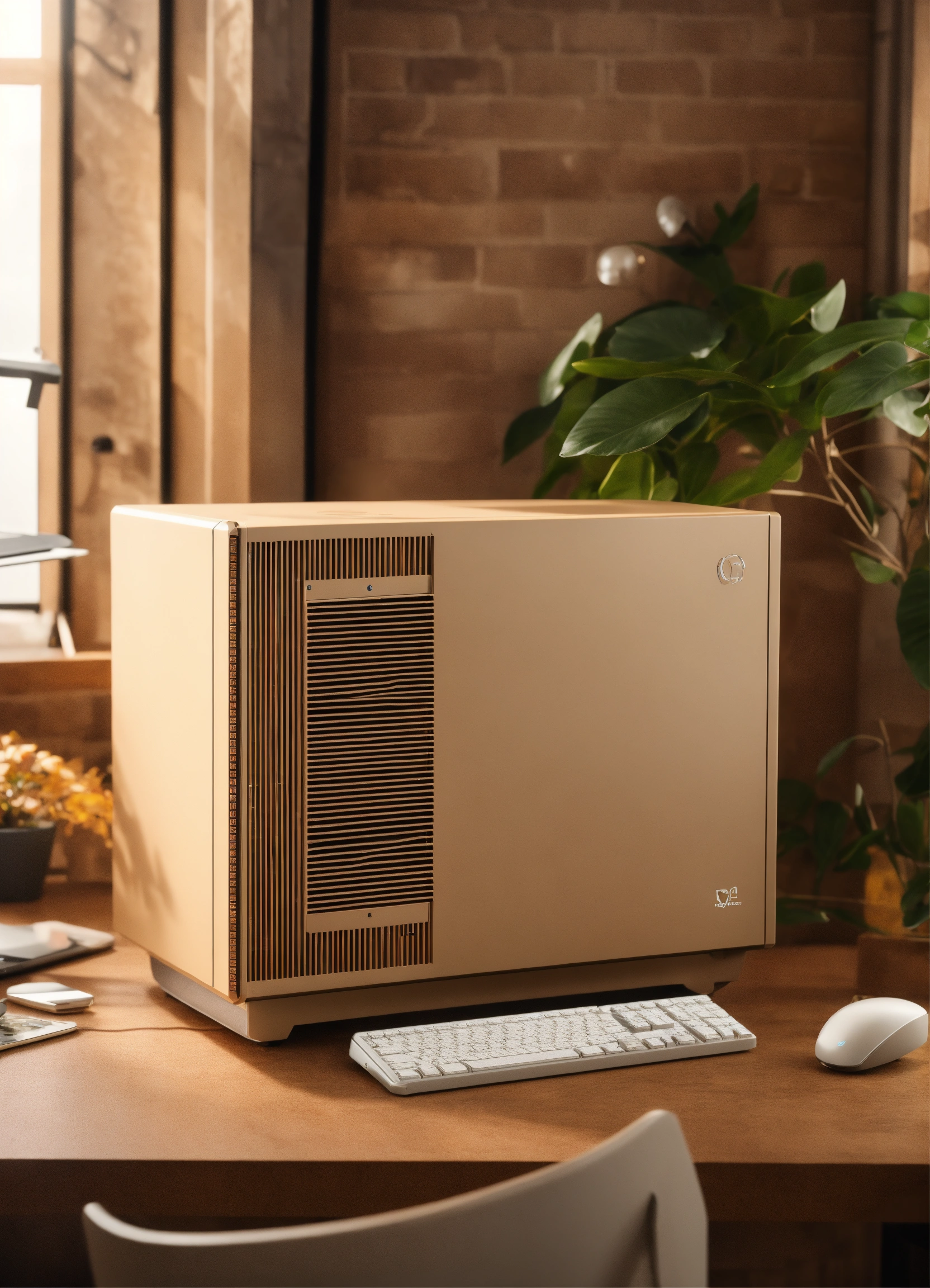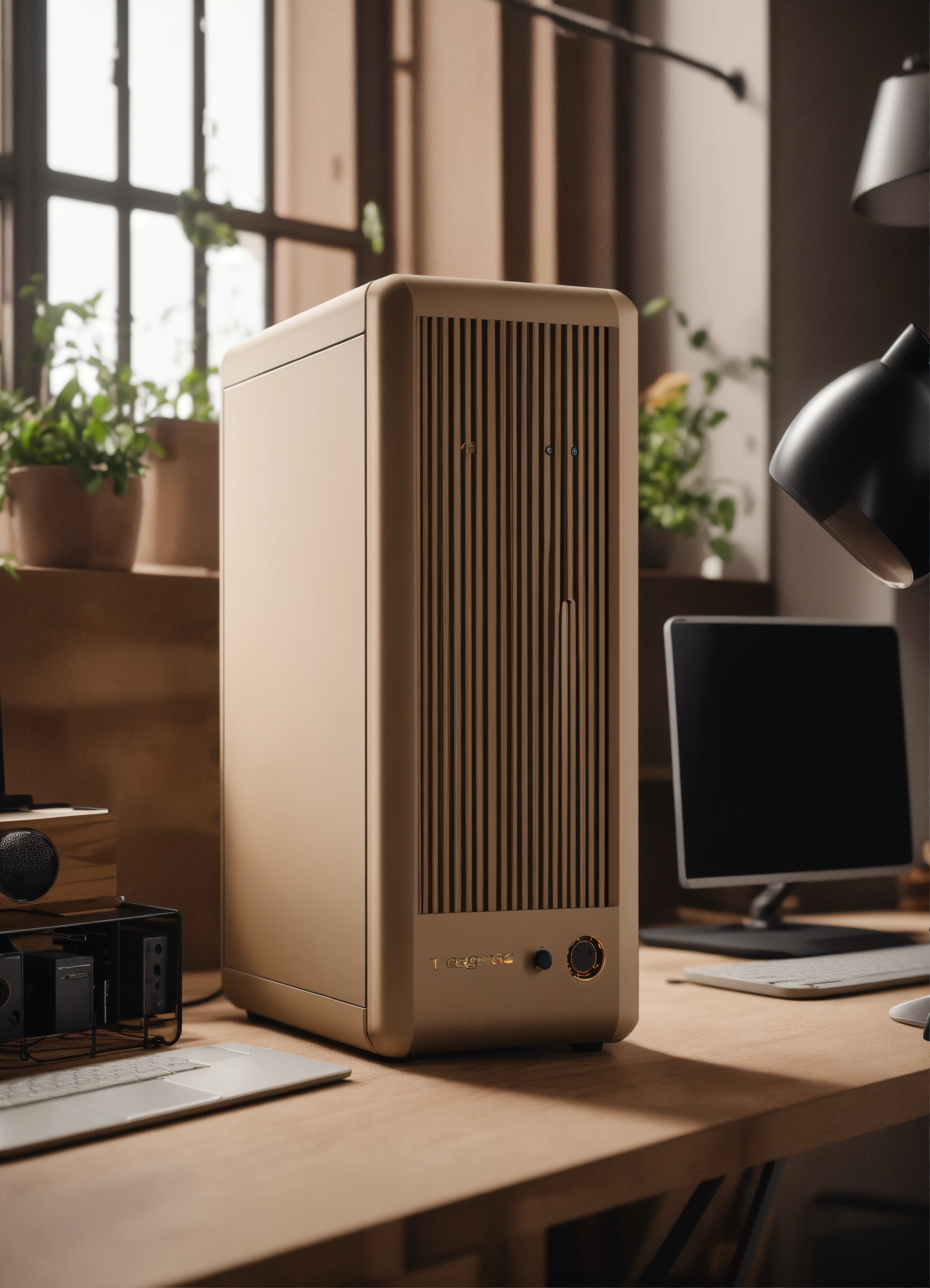 A stunning, minimalist beige pc case designed by teenage engineering. product ad retro. industrial design inspiration. unreal engine render, natural lighting, on desk, beautiful shot