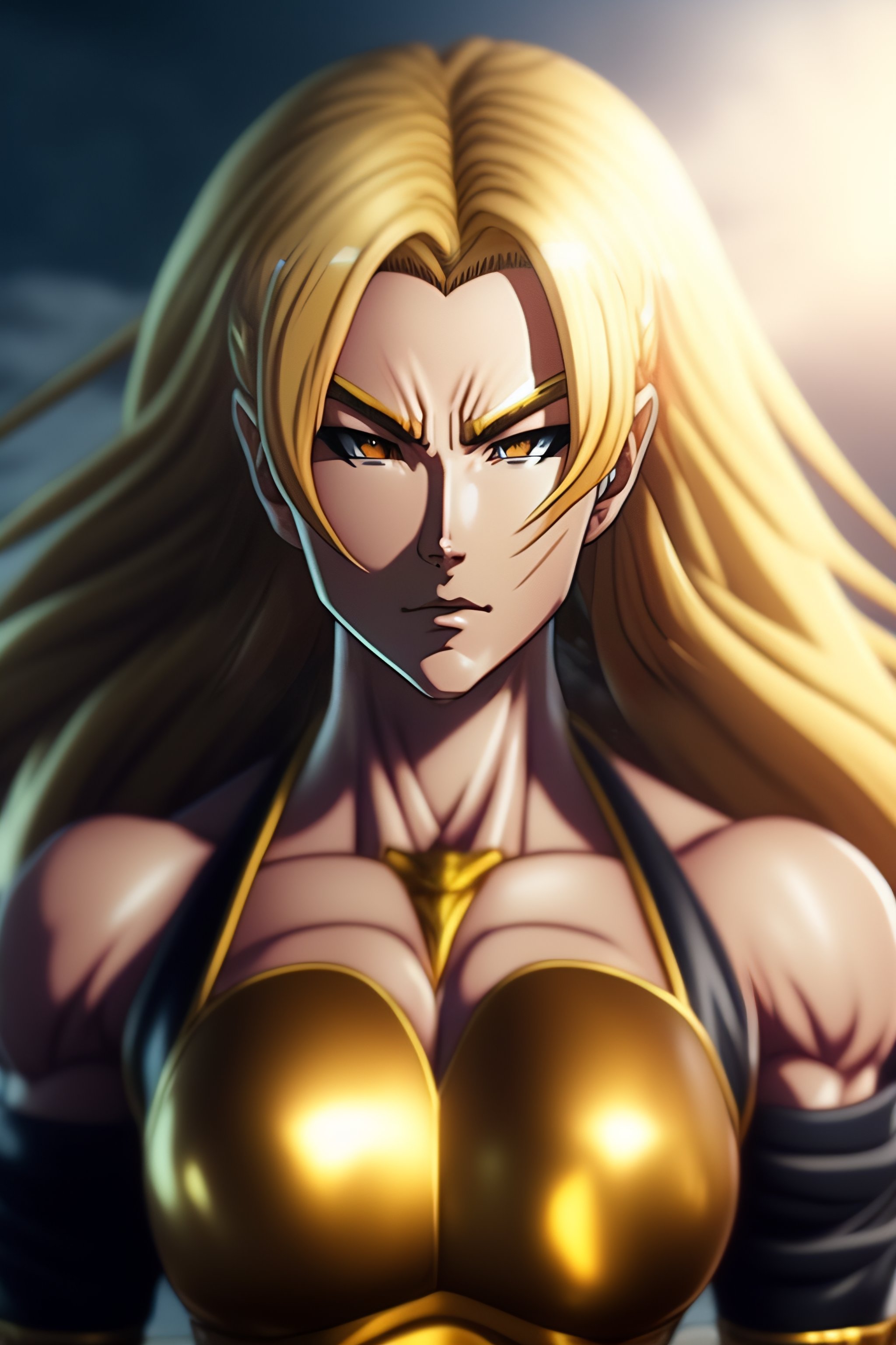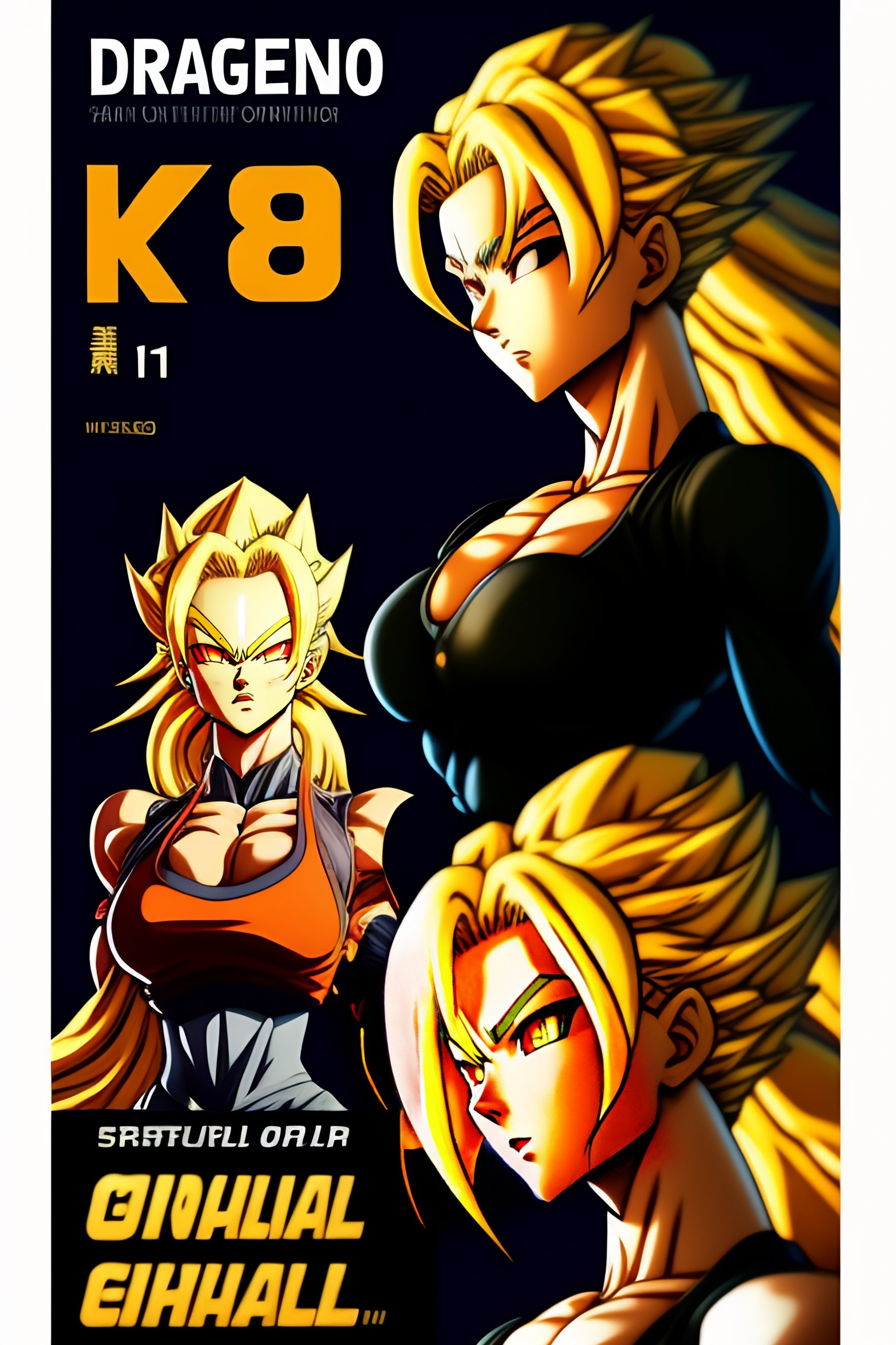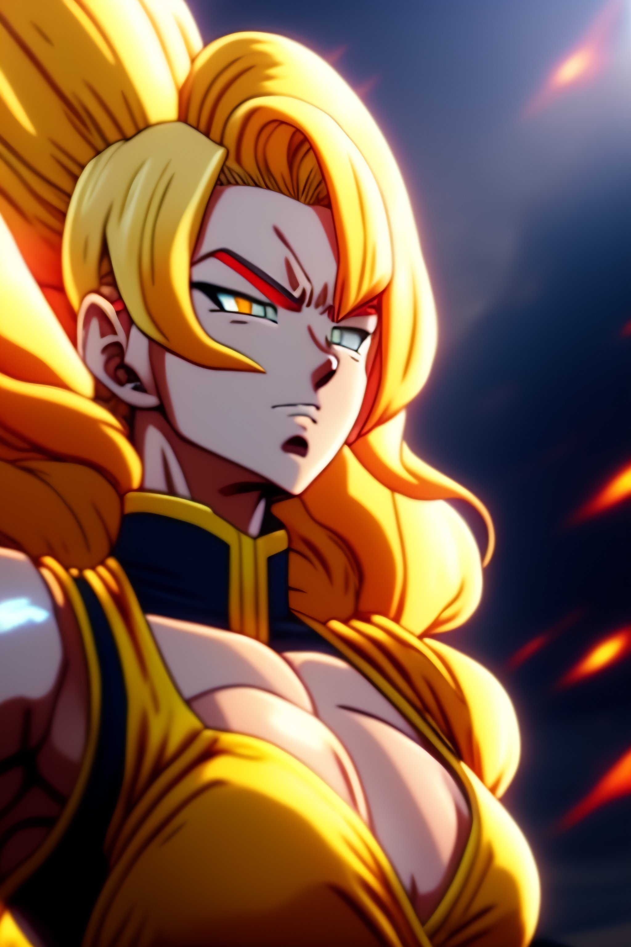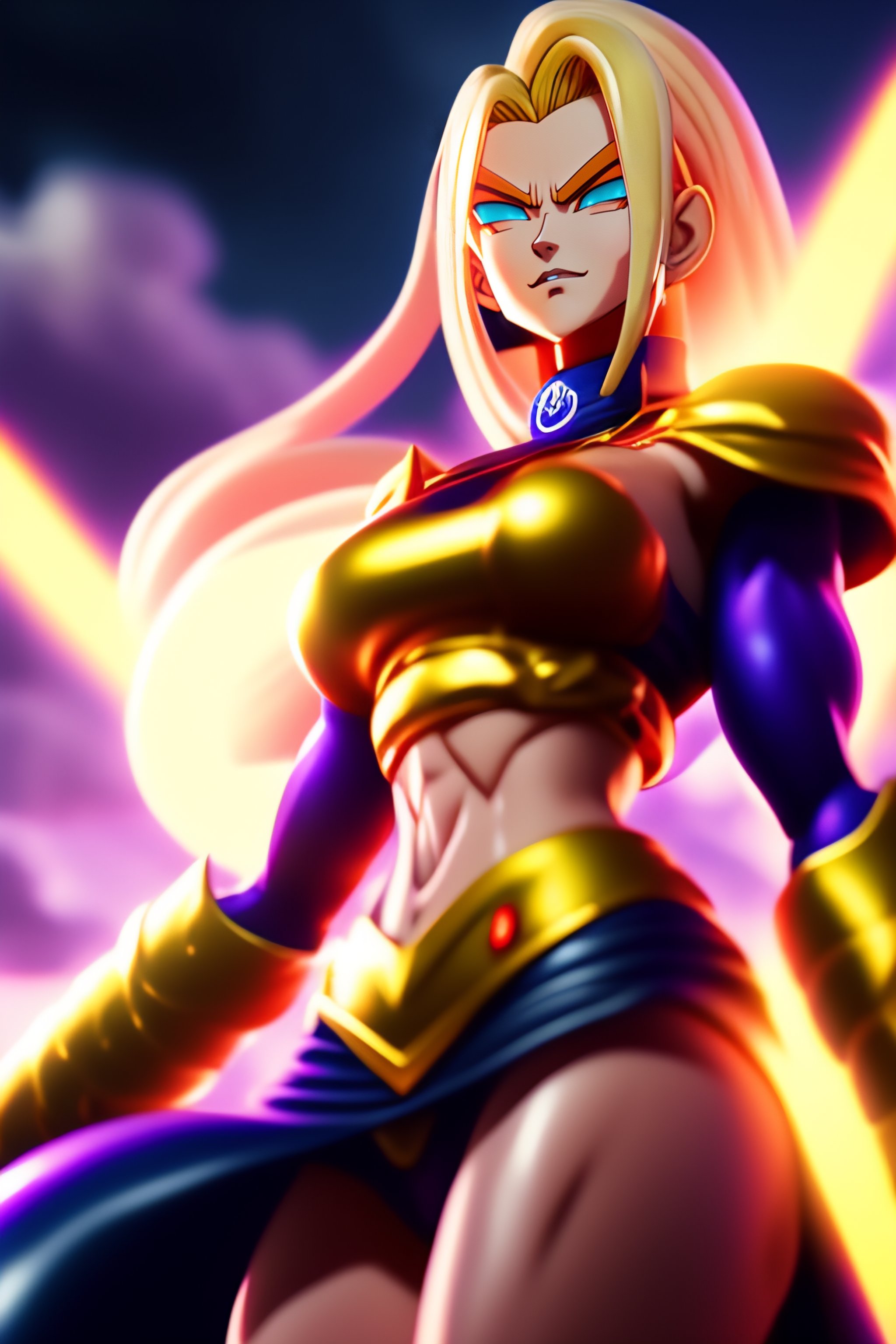 Full body blonde slender powerful female happy yet strong with aura of power surrounding 8k hi-res in a dragonball super anime style