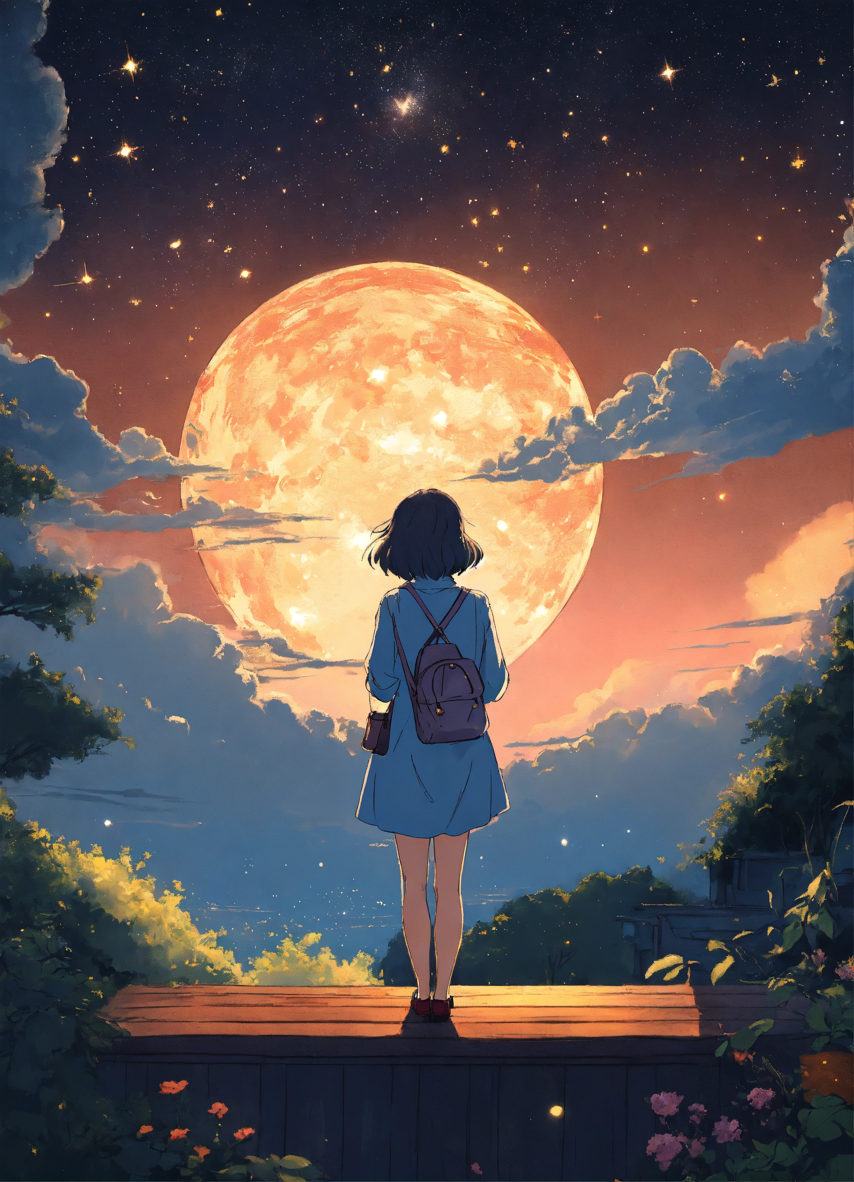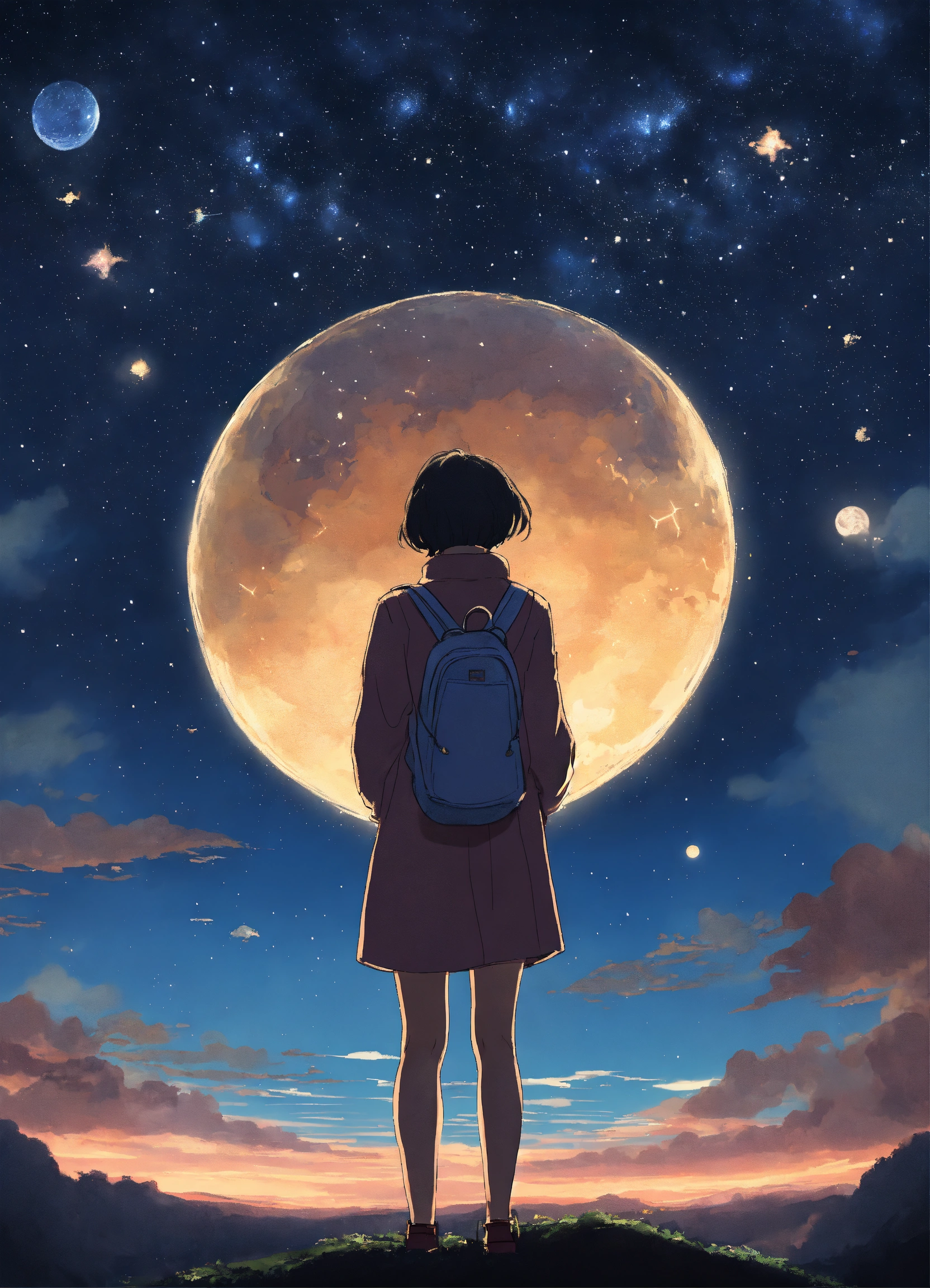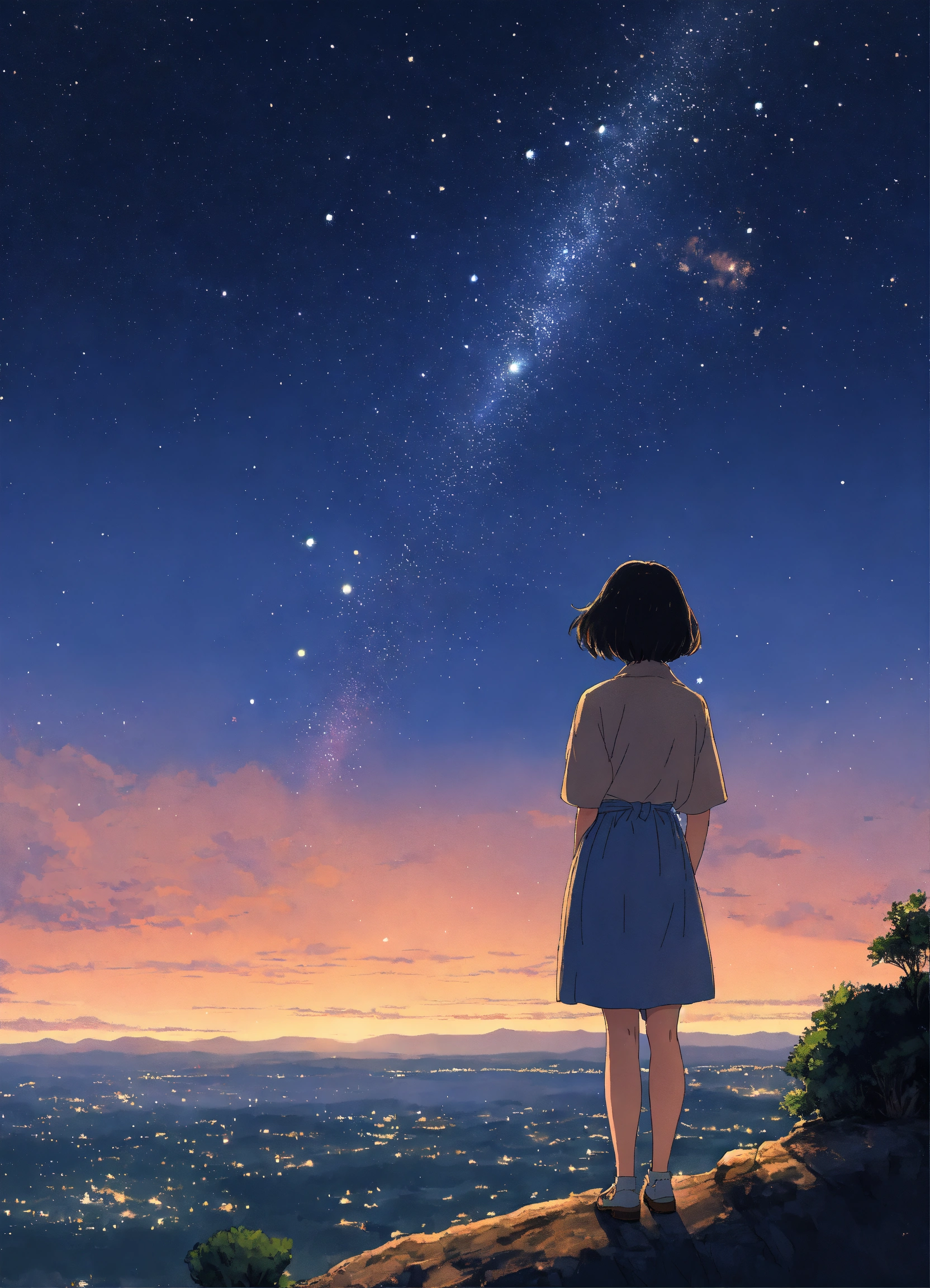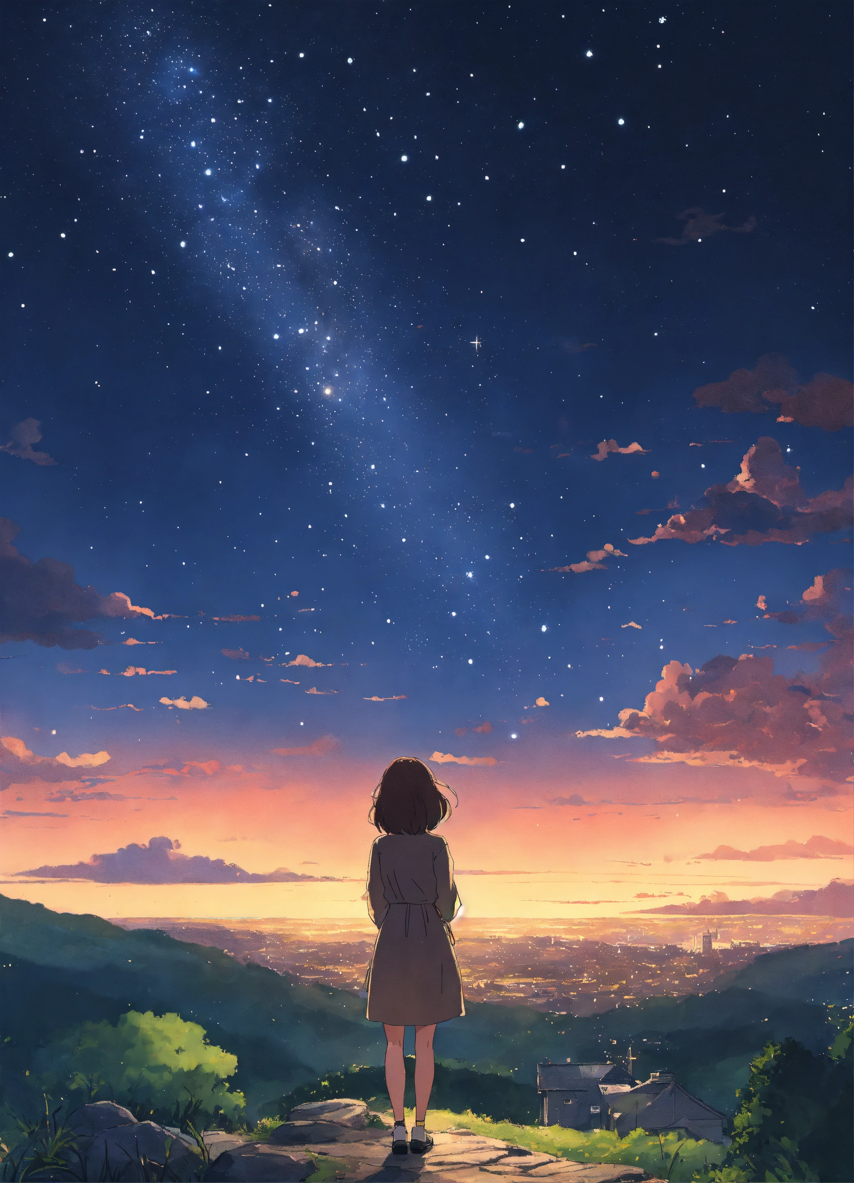 1 woman, 30 years old, short cut, back view, looking at the night sky, comet, starry sky, studio ghibli style illustration, wide angle