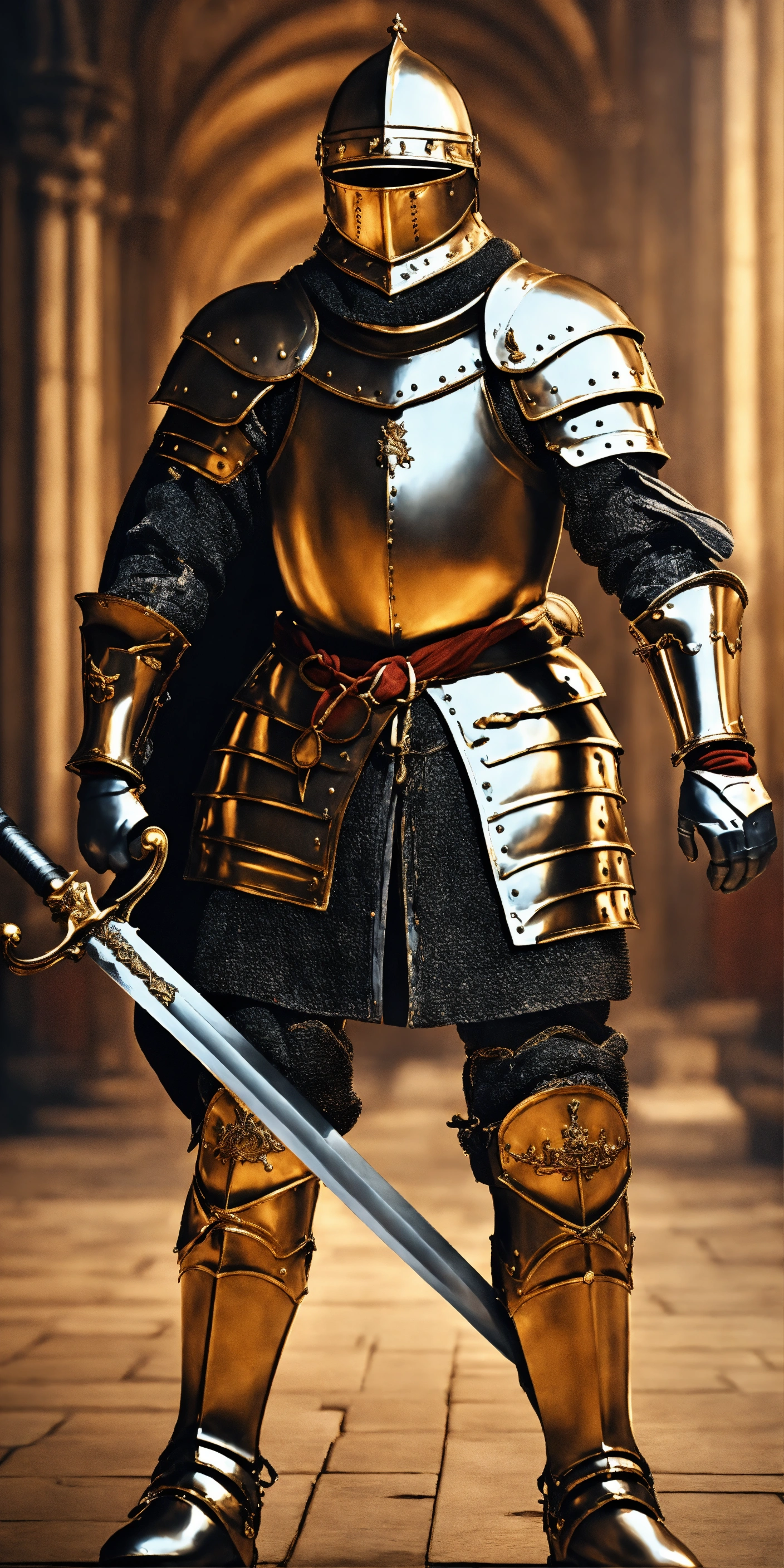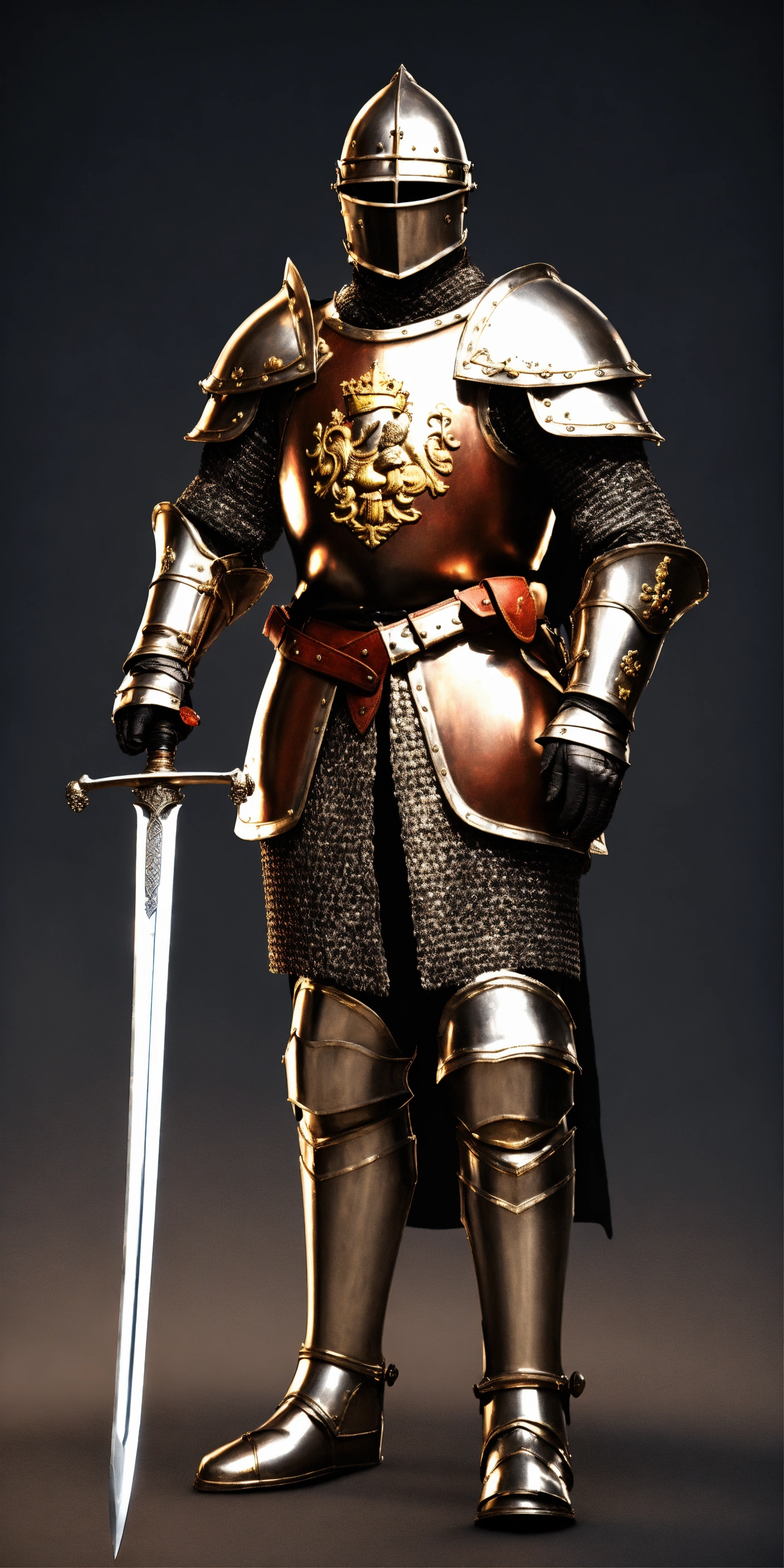 King charles 3 in medieval knight armor with no helmet on his head, holding sword in his hand, entire body, from head to toes, standing up, 8k, photorealistic