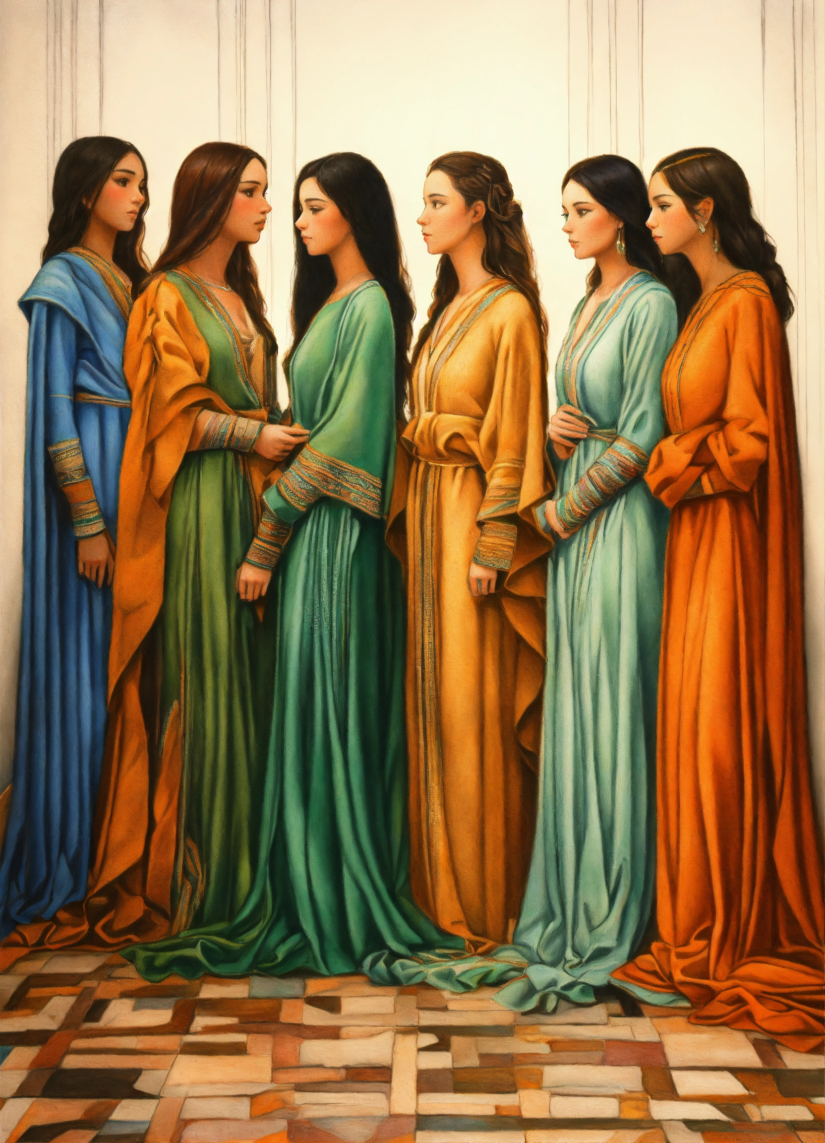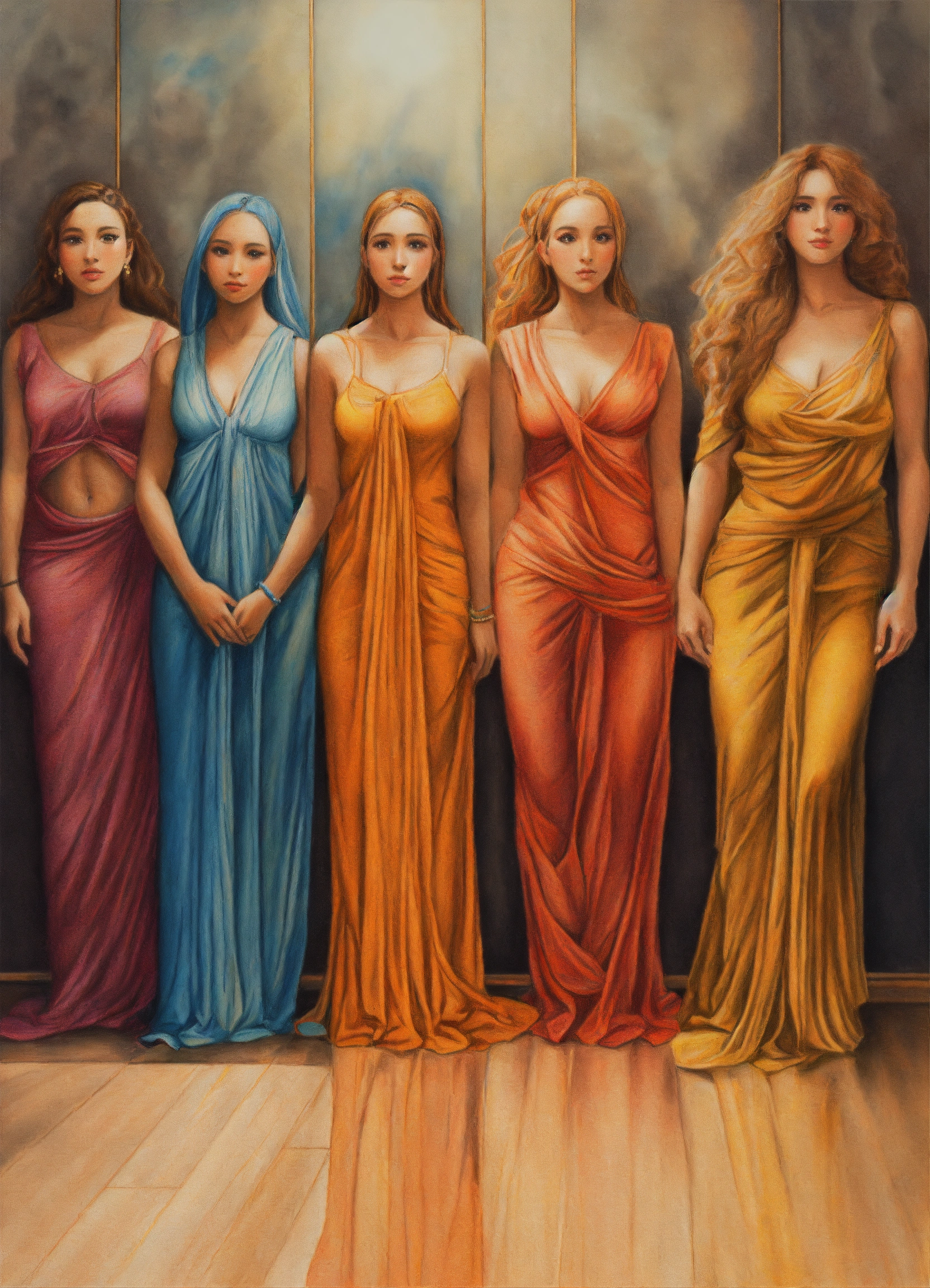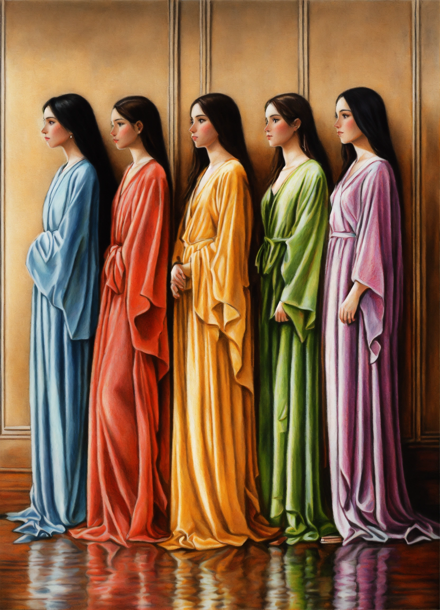 Realistic colored pencil drawing of 5 female souls lined up in a row. one after the other, all looking at the horizon. spiritual art. in order of size, from tallest to shortest. all in front of a big mirror wall.