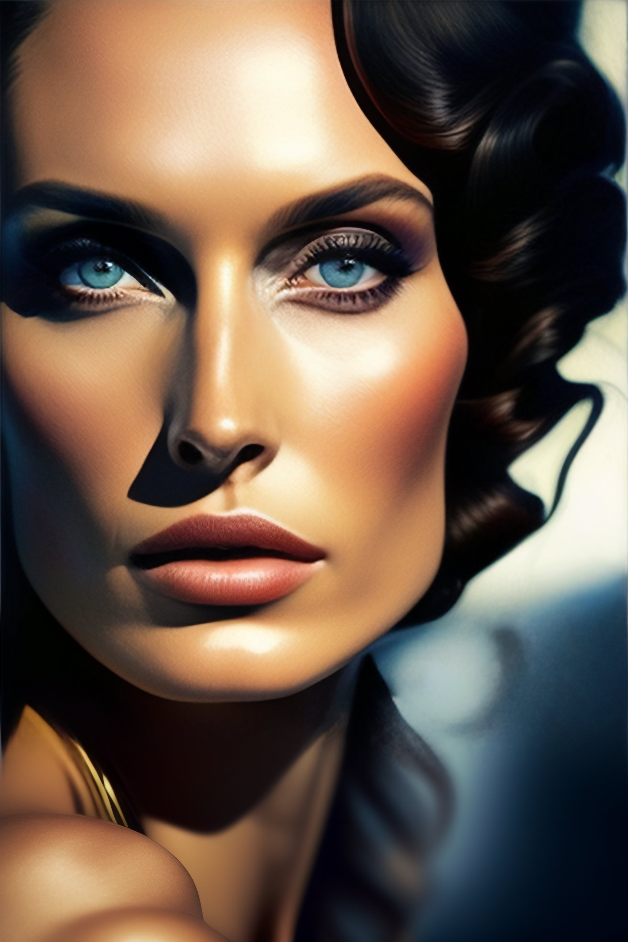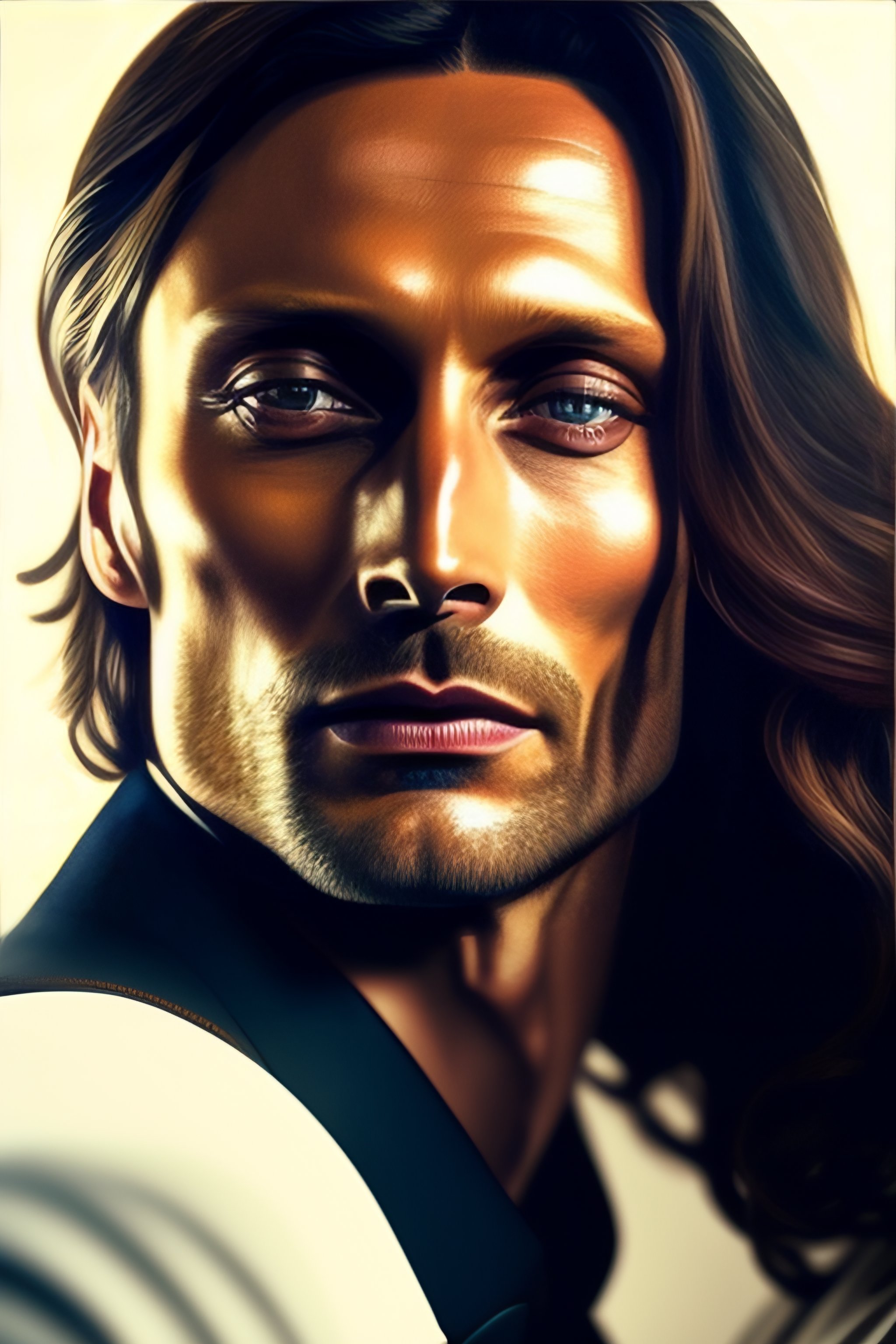 Mads mikkelsen gazing into the eyes of a beautful woman with long brown curly hair, round face and blue eyes. she has eyes like angelina jolie and a face like megan fox and miley cyrus combined. there is a darkness and intensity to this image. it is like the show hannibal, with its stylistic imagery behind them. he is sophisticated and dapper and she is elegant.
