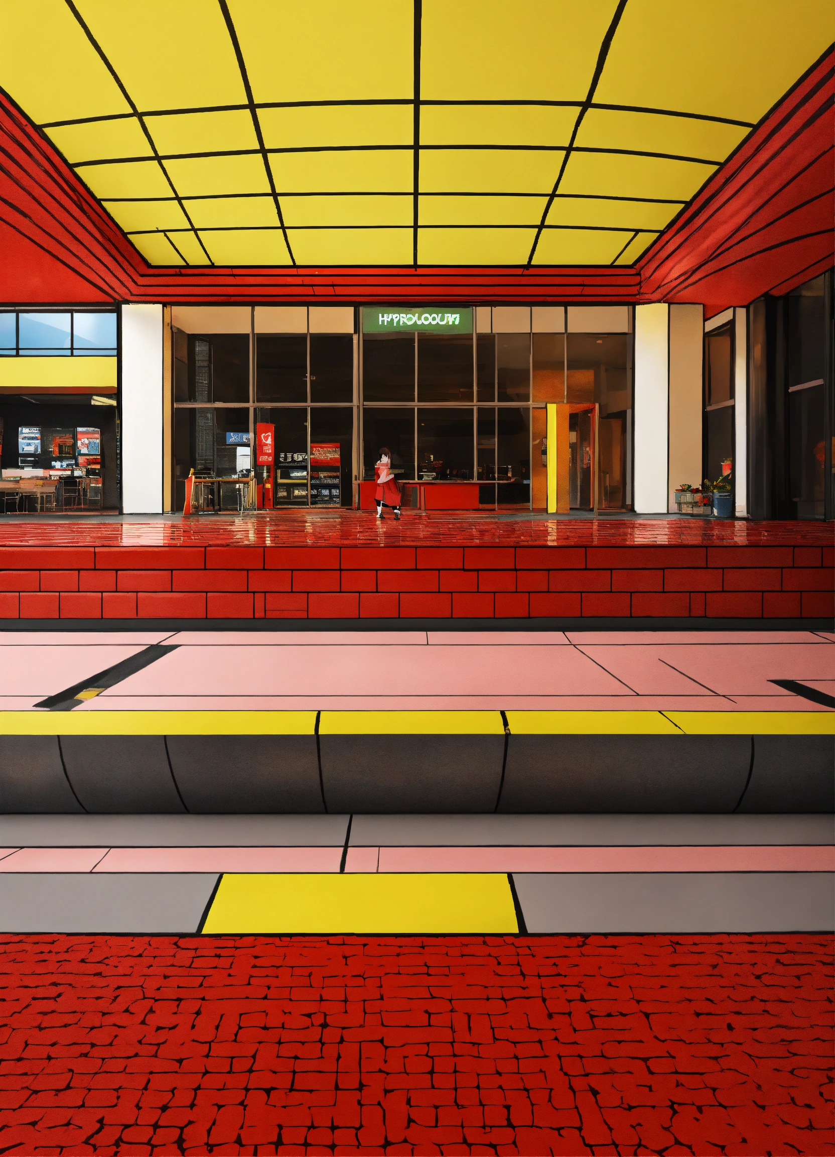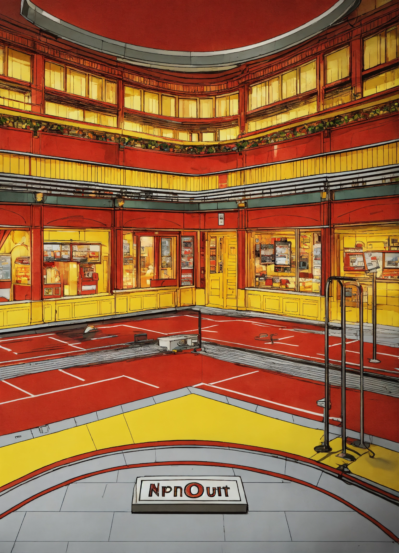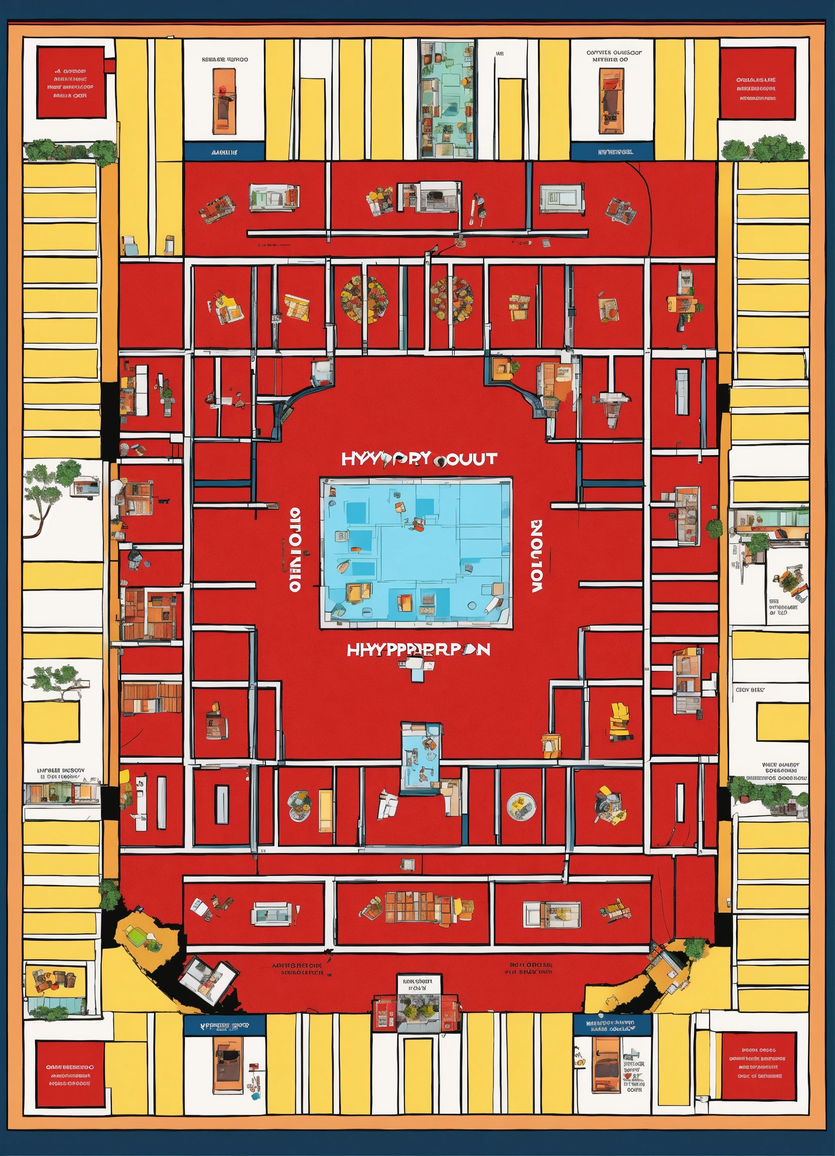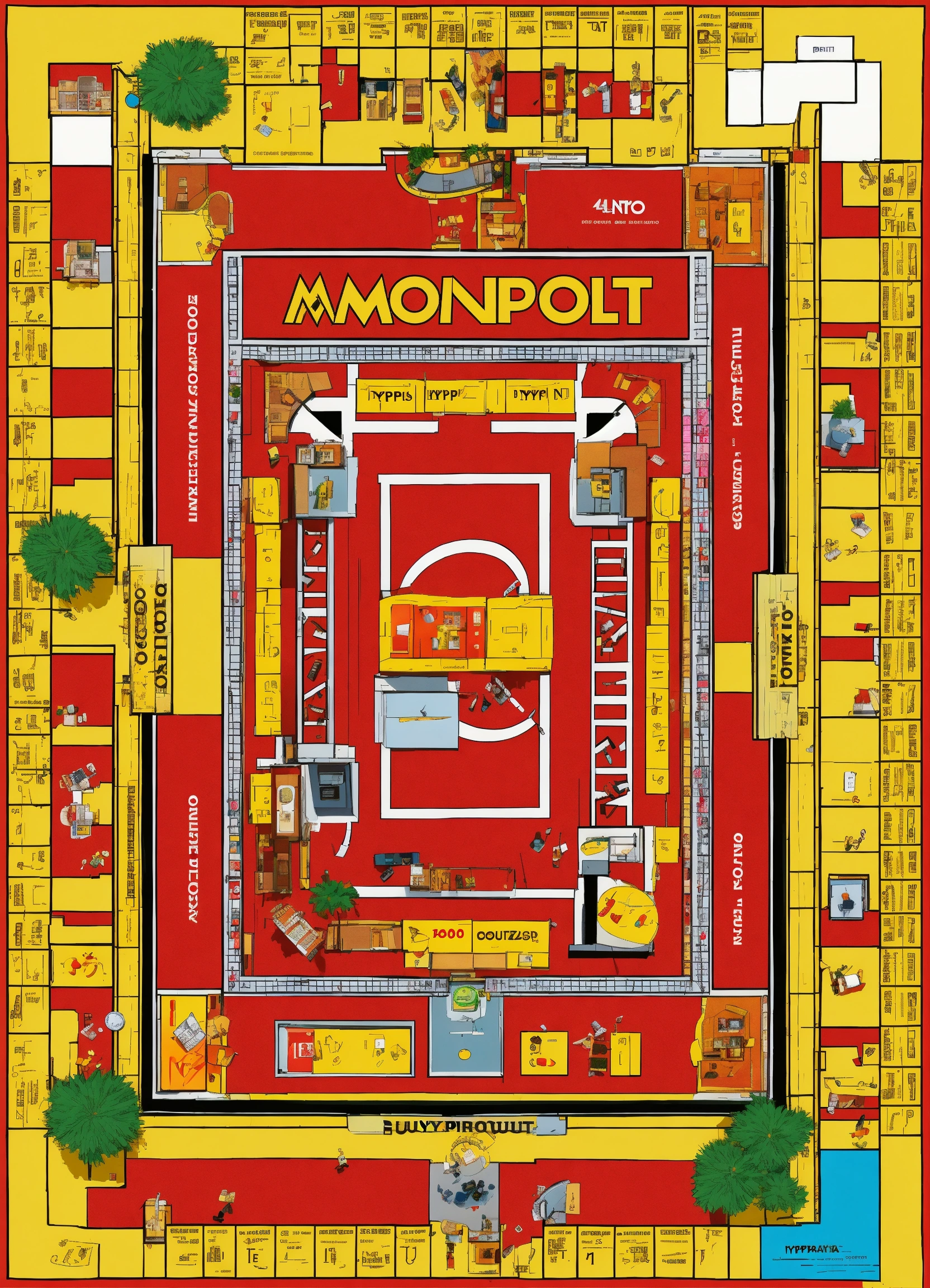 Bodysize monopoly floor utilizing colors red c6001e, yellow ffef02. it should be big enough that people can play as if it is on the floor, and be hyper realistic. artistic styles art deco, cartoon/illustrative, pop art. utilzie in-n-out burger chain's illustrative elements, and realize that the theme is based on locations of in and out. hypera realisitc, 4k, experiential design