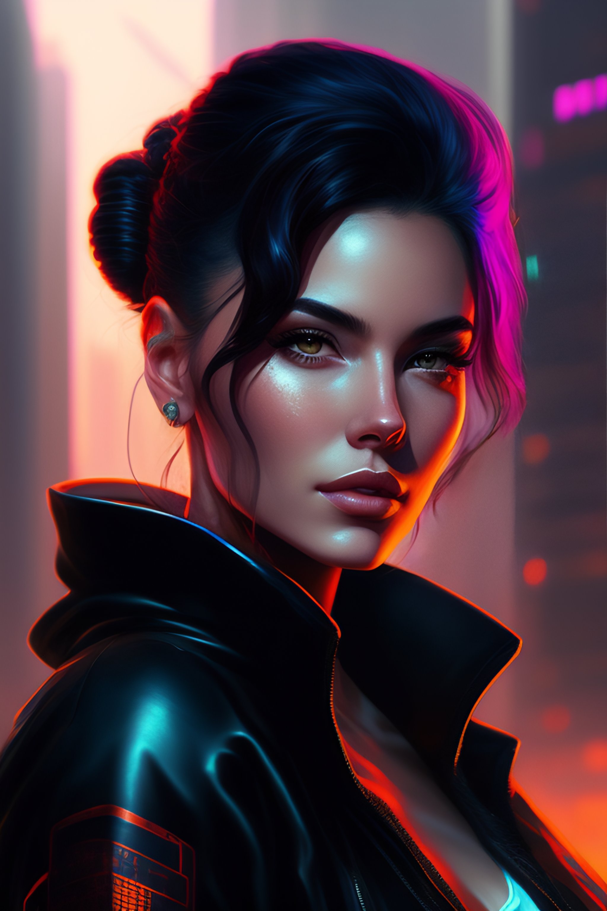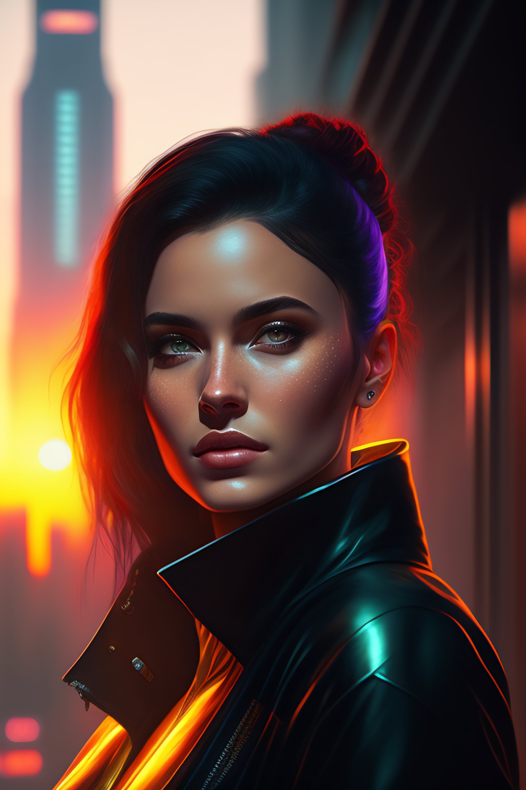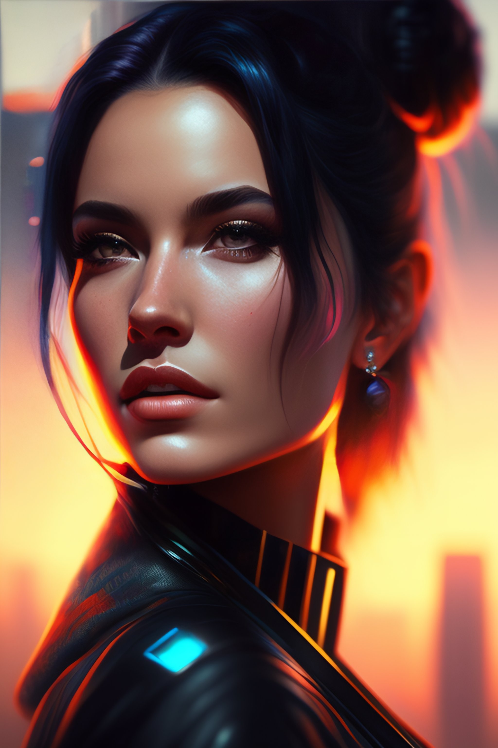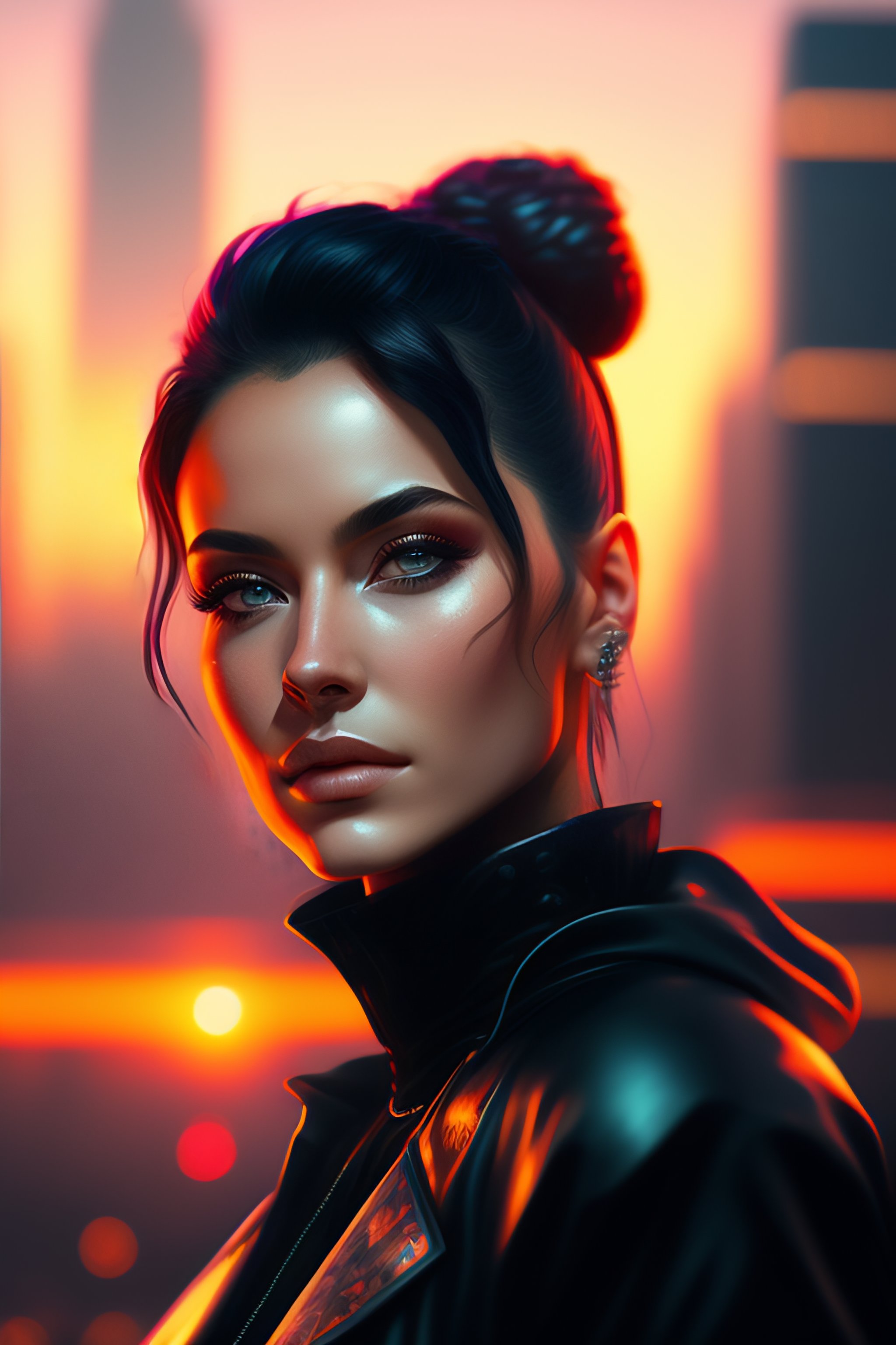 Molly millions, closeup portrait of a young beautiful cyberpunk woman, mirror eye implants, black hair in a rough bun, sunset, neuromancer, street samurai, cyberpunk city background, megacity, gorgeous view, depth, painted by seb mckinnon, high detail, digital art, painted by greg rutkowski, trending on artstation