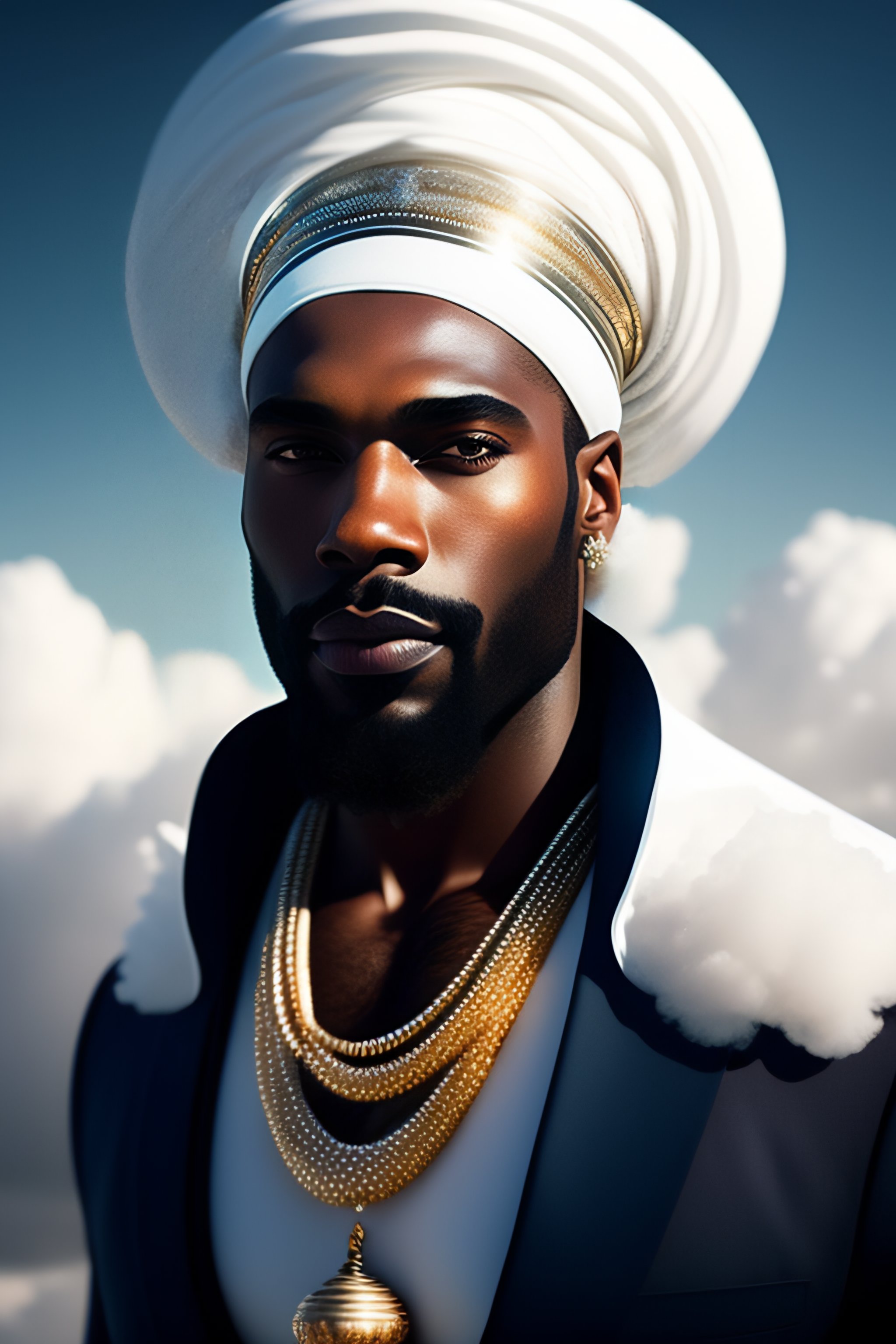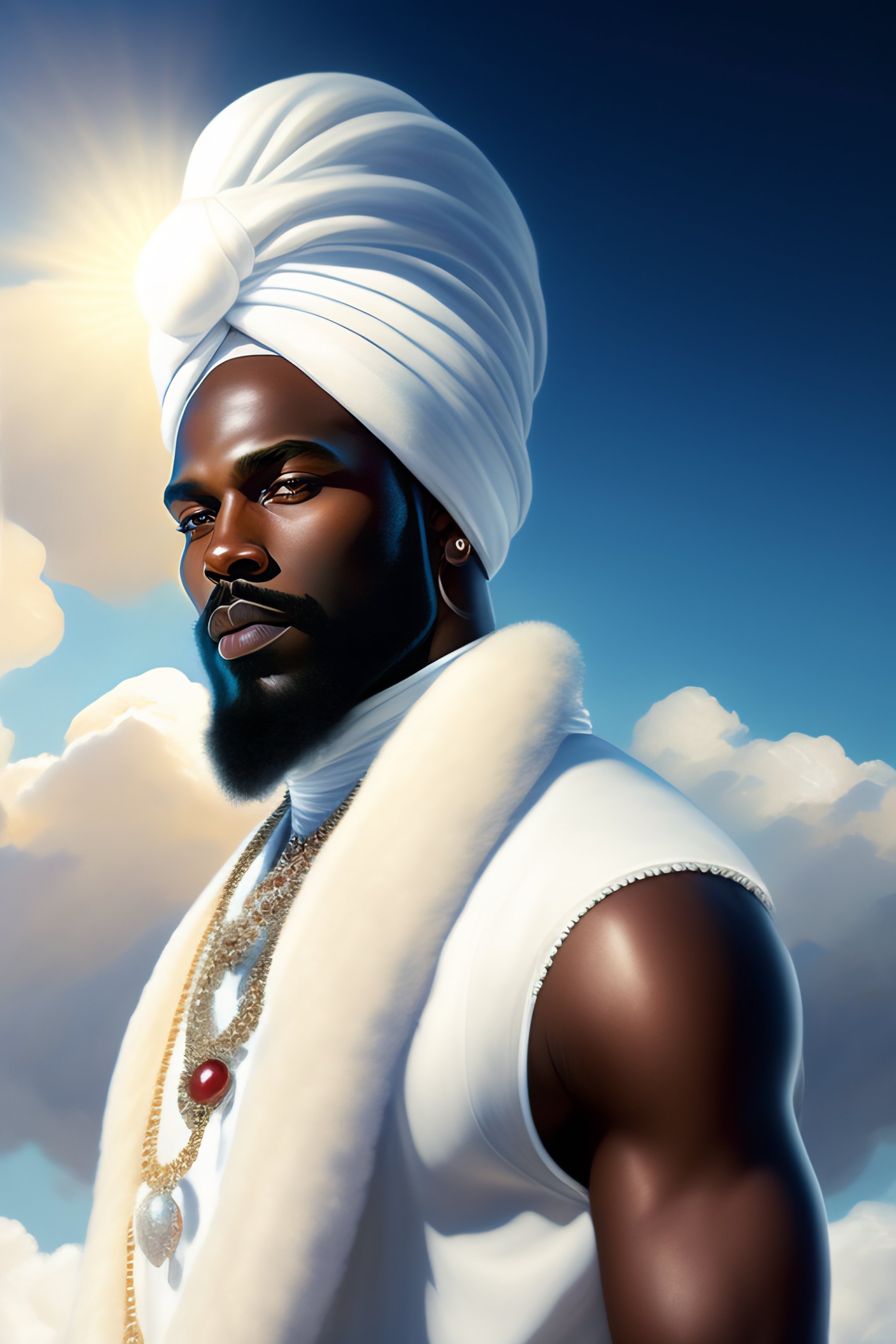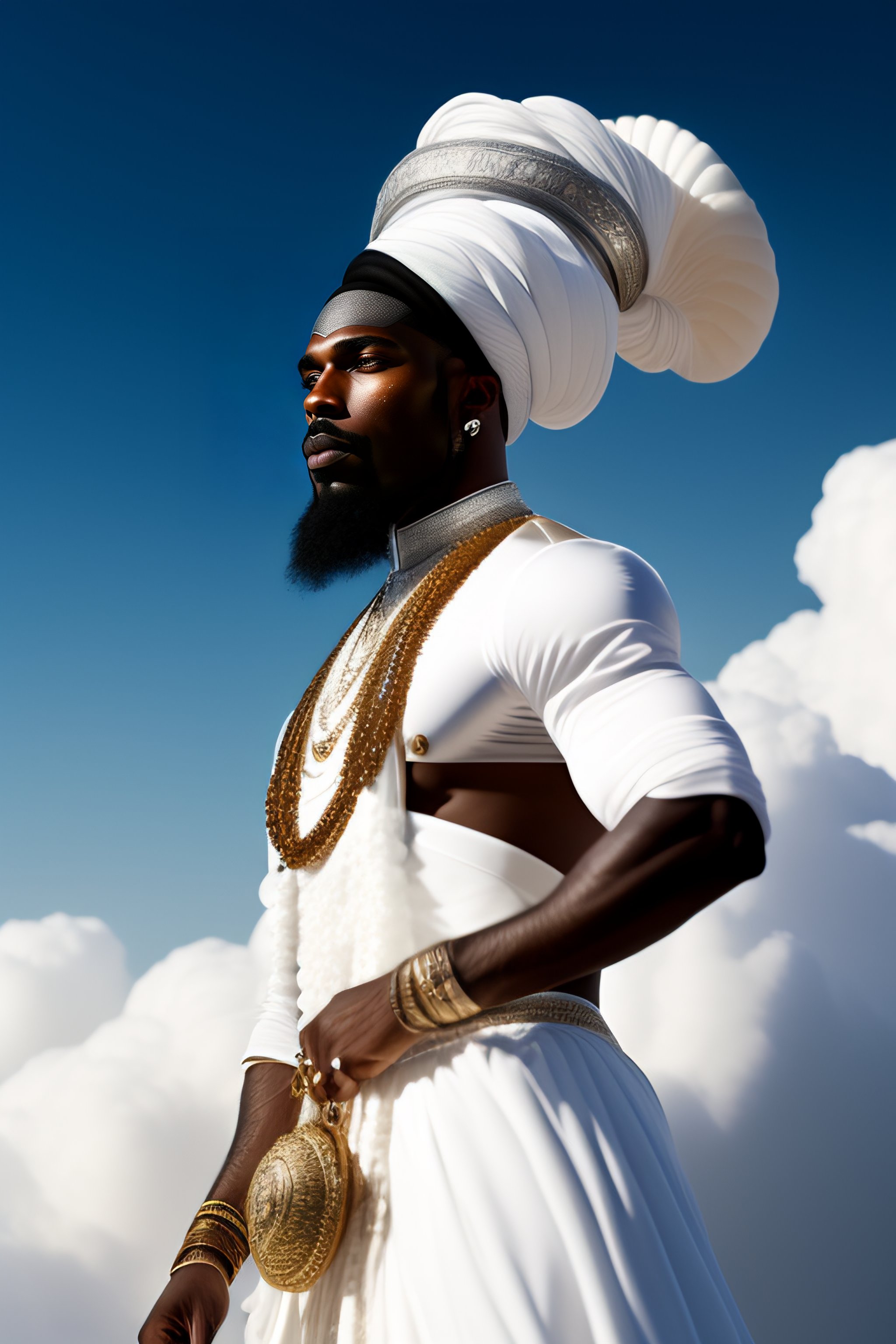 Beautiful black man with white beard wearing white turban on his head wearing sea whelk necklace wearing white dress with silver crown and silver jewelry details, holding silver staff in hand dancing on clouds and white pigeons flying in blue sky between clouds and o sun glare, full length view with bright sun in background, greg rutkowski, ultra detailed, volumetric lighting