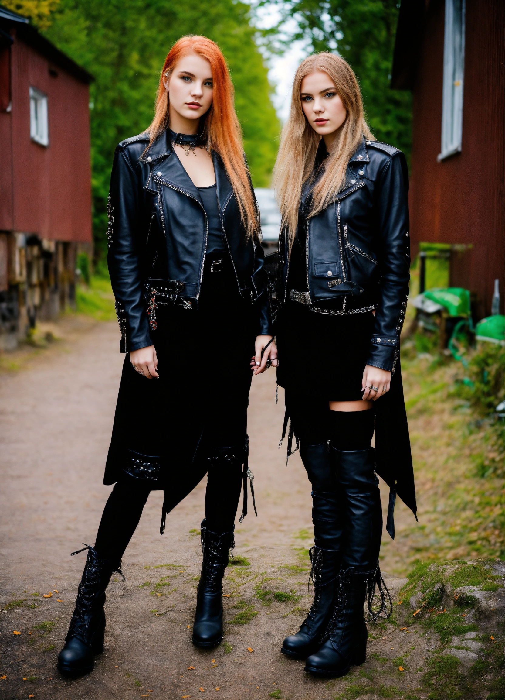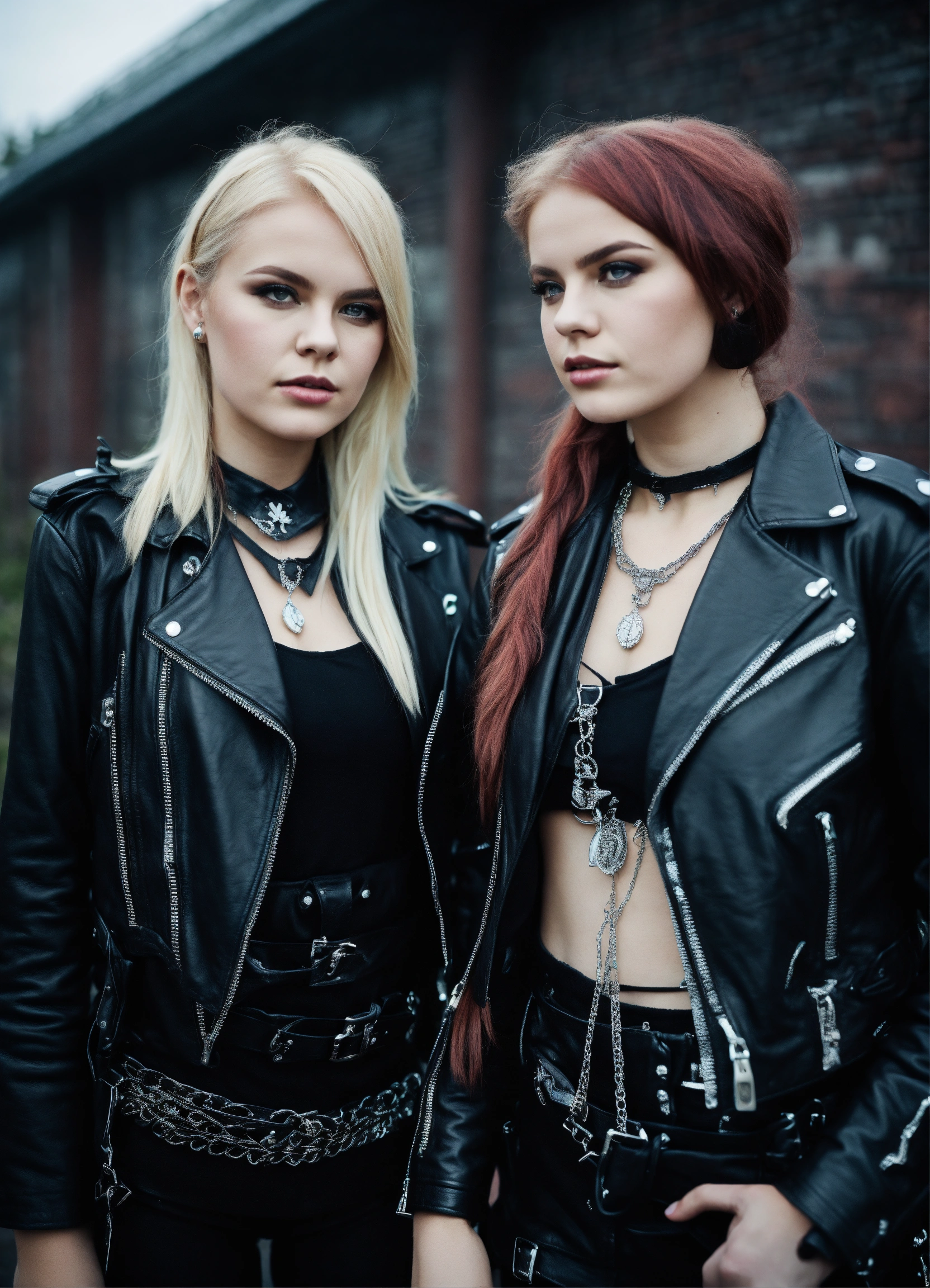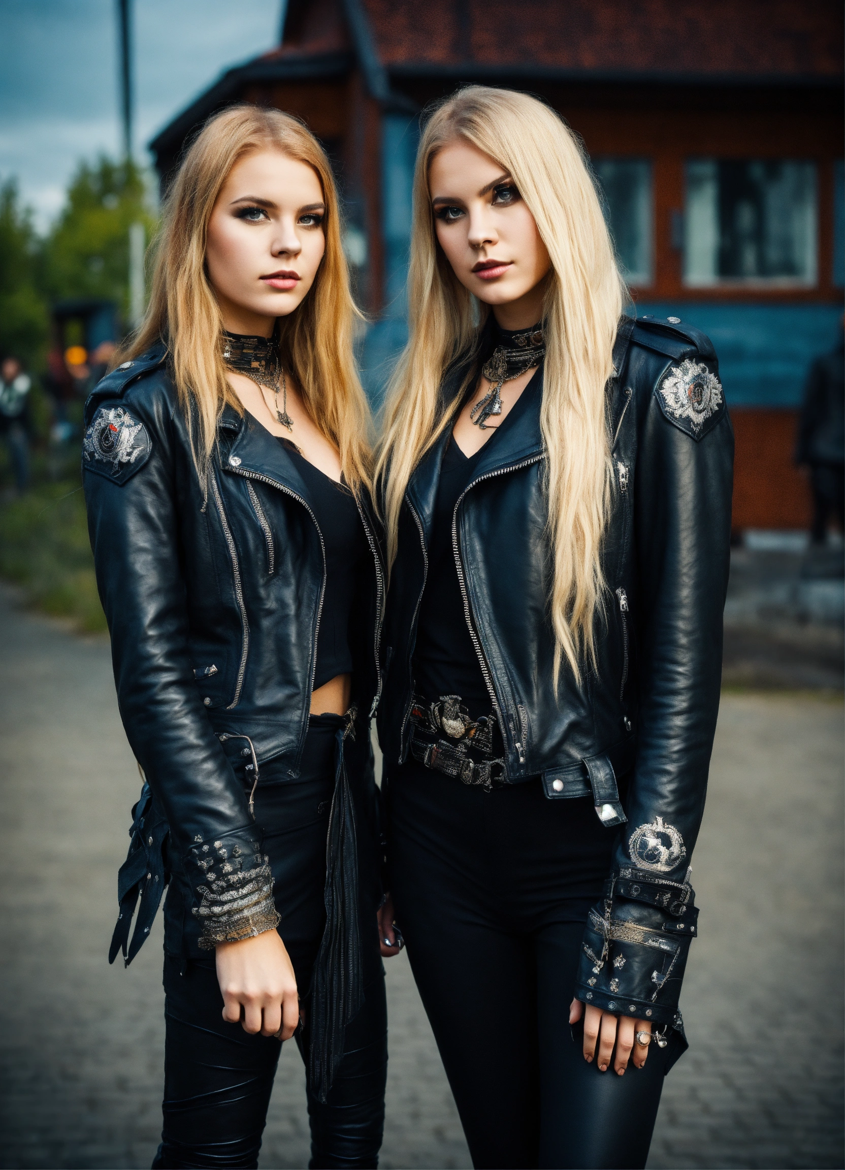 Two 20 year old nordic heavy metal girls wearing a black leather jacket and traditional dress, juwelry, urban enviroment