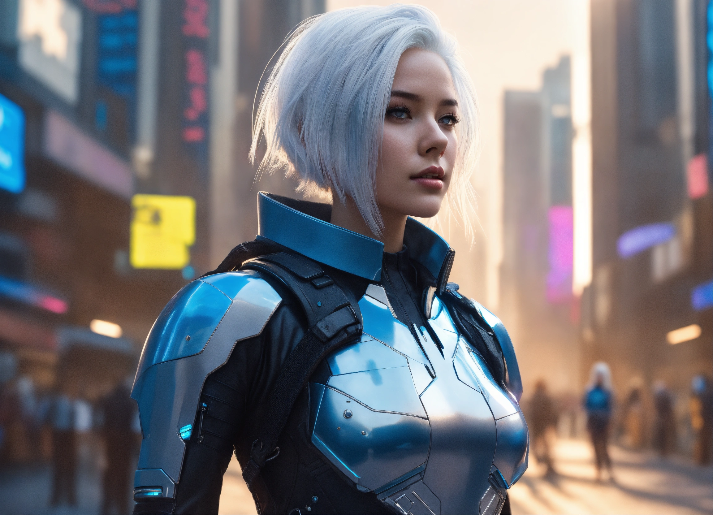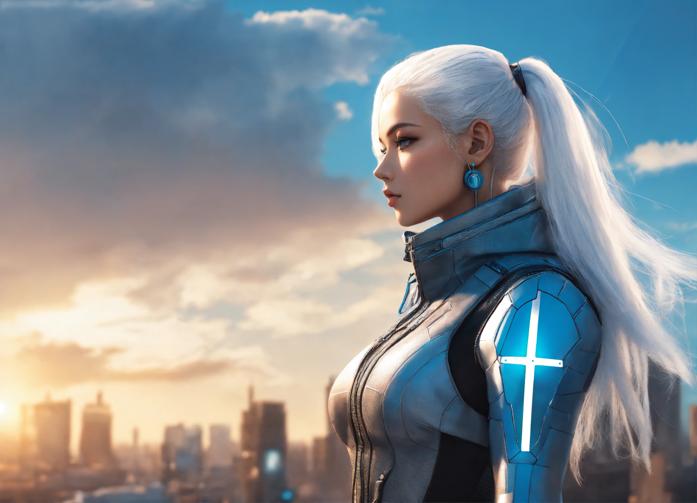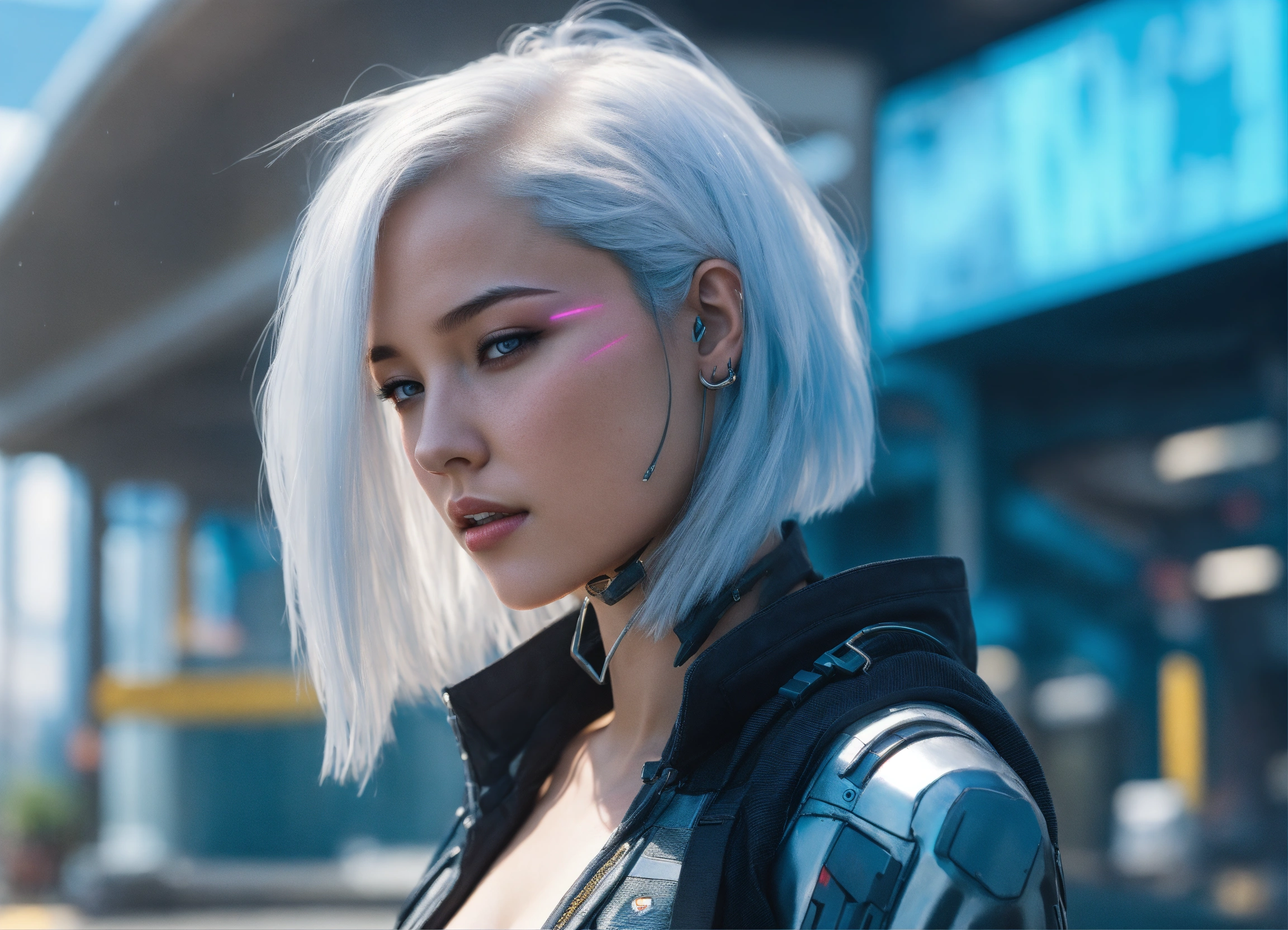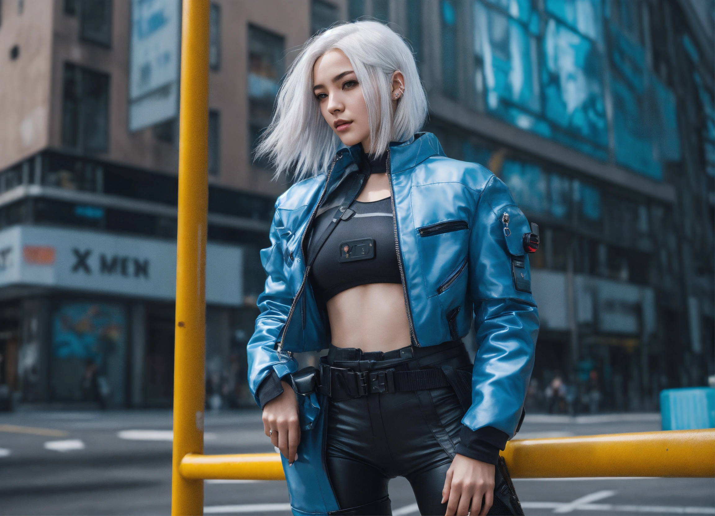 Full body high detailed photo realistic natural photo cyberpunk dream girl, futuristic, sunny weather. x-men white hair silver blue
