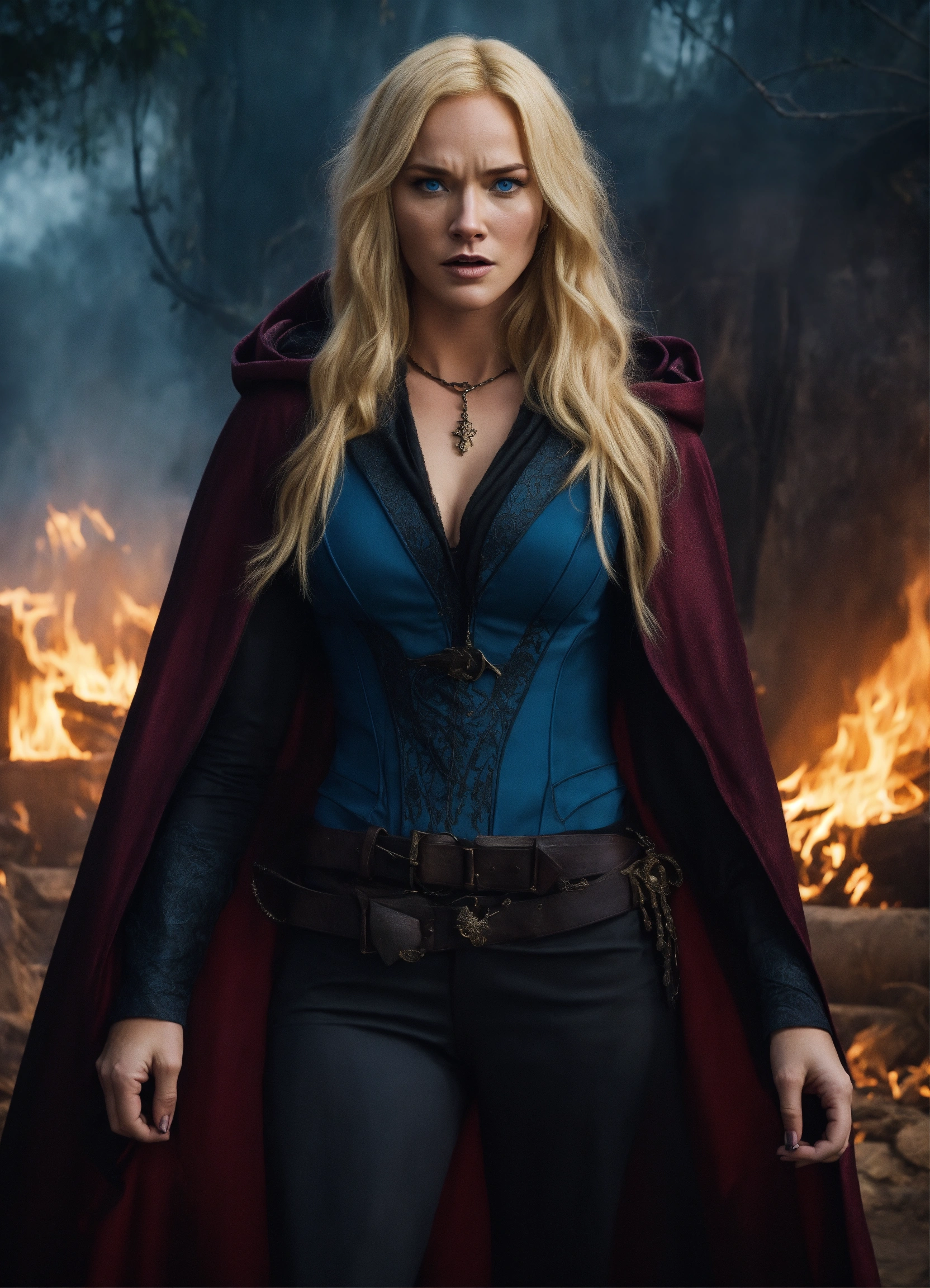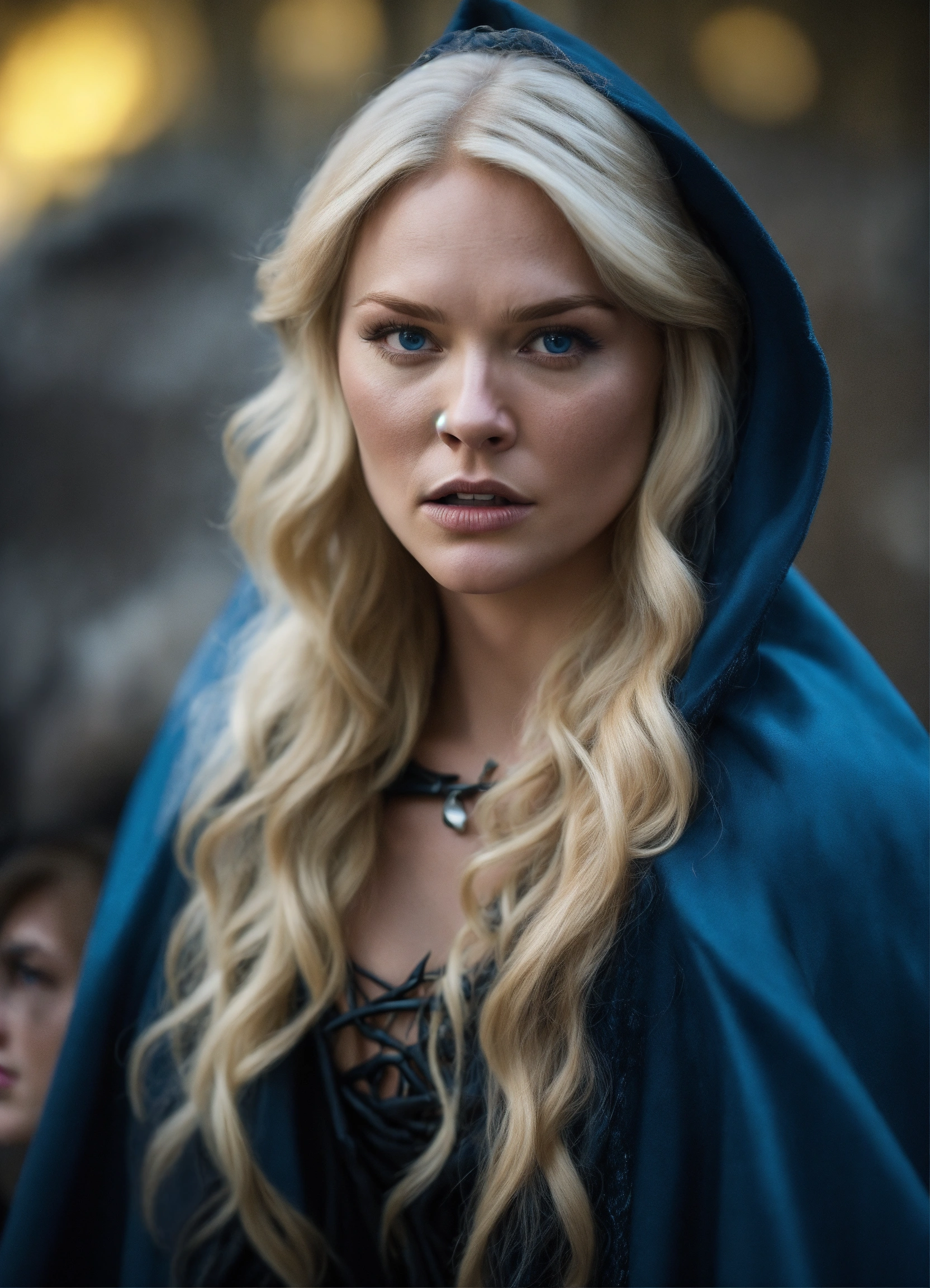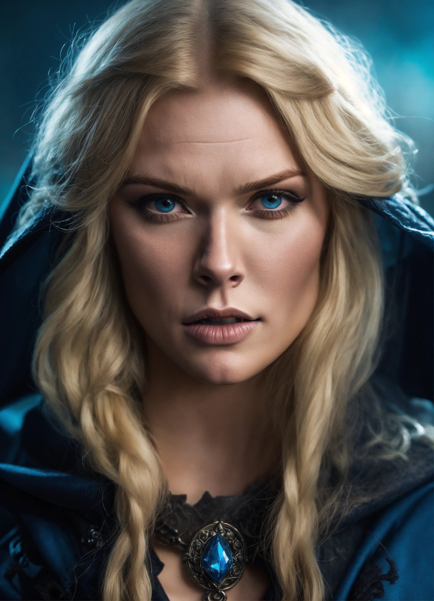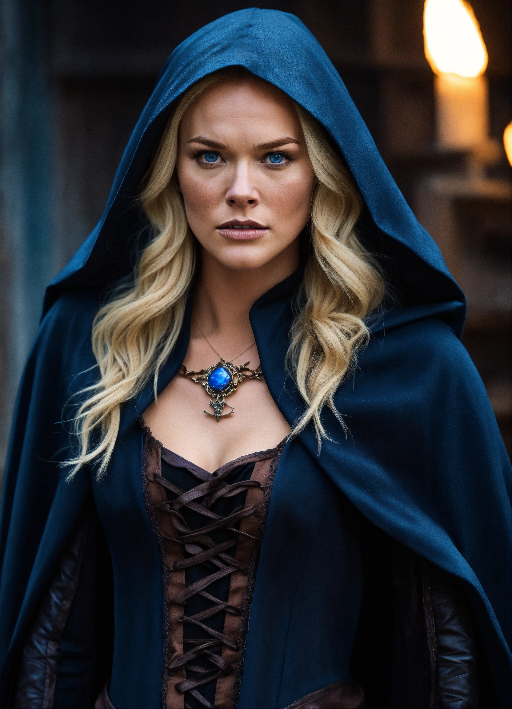 A blonde with blue eyes women wears witch clothes and cloak. she has a very similar features with chris pratt and looks like a villain witch, angry and harsh looking, more thin
