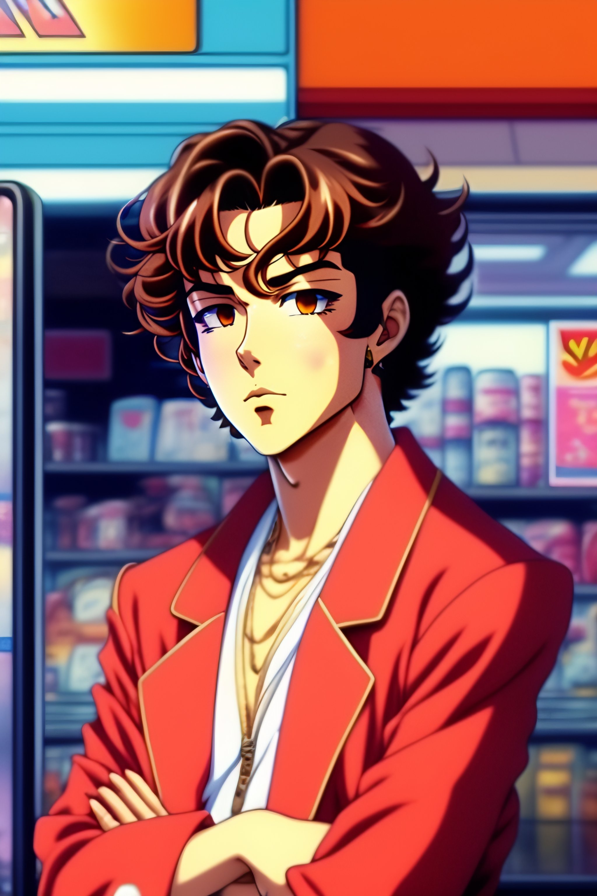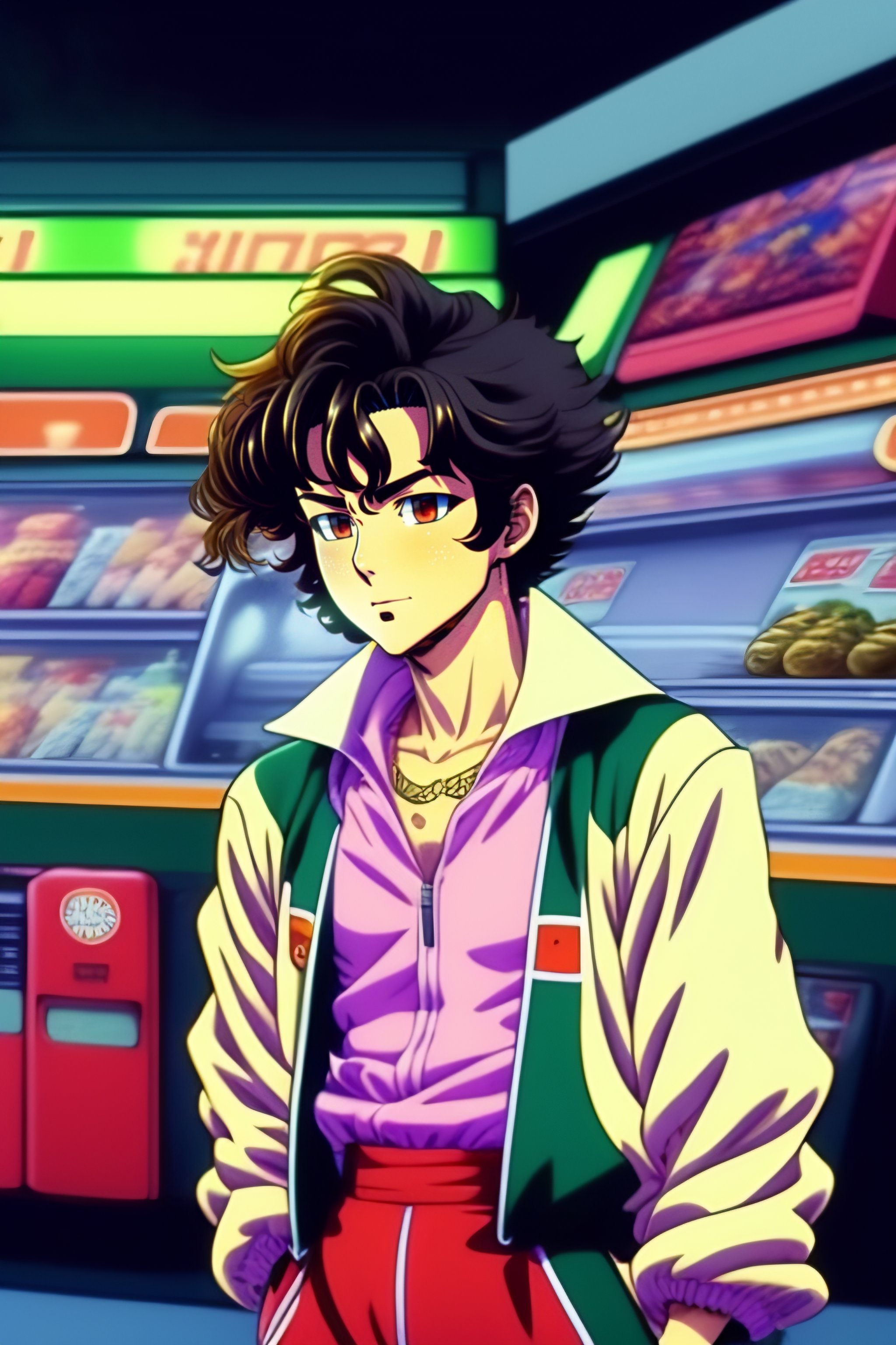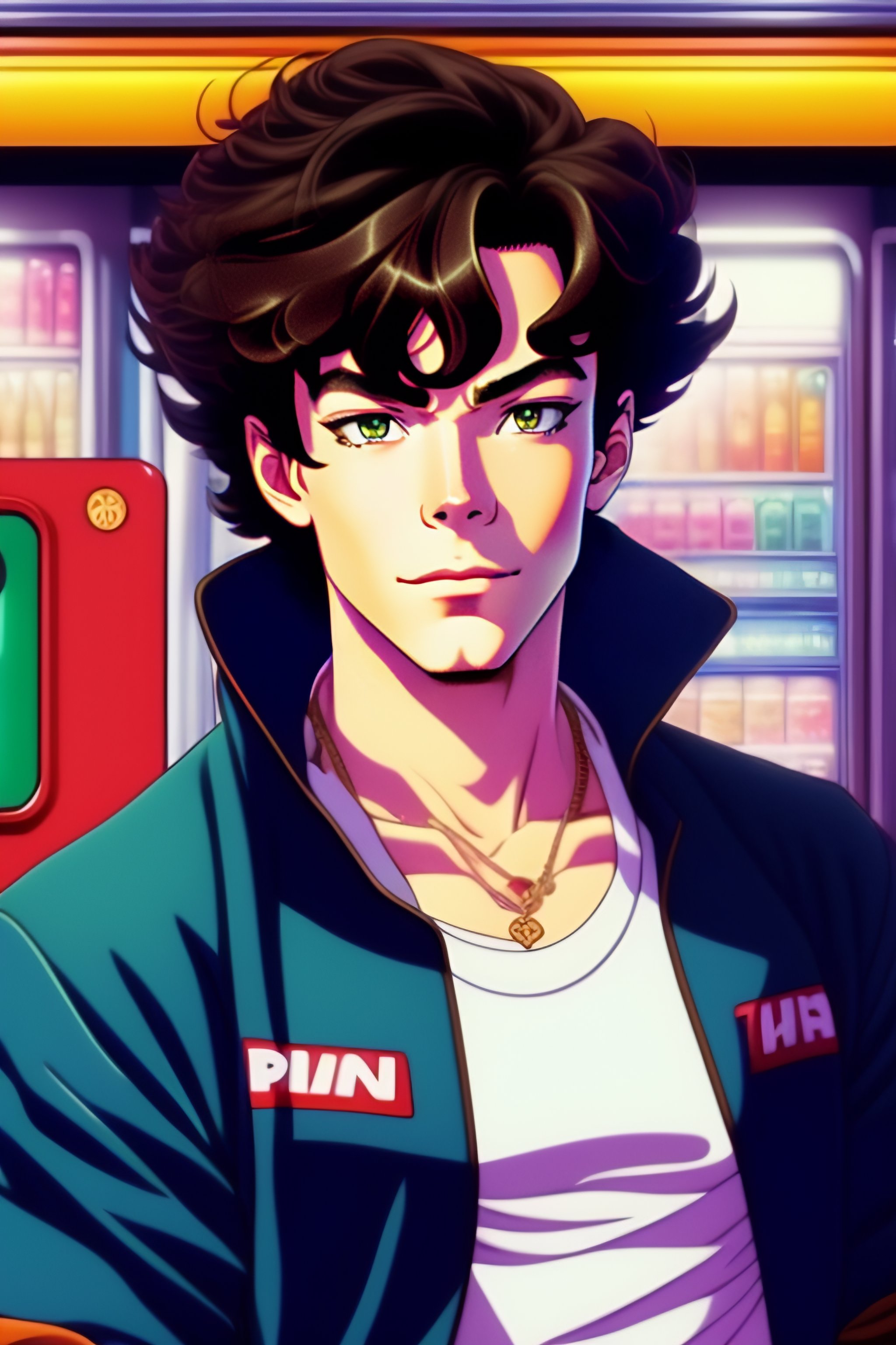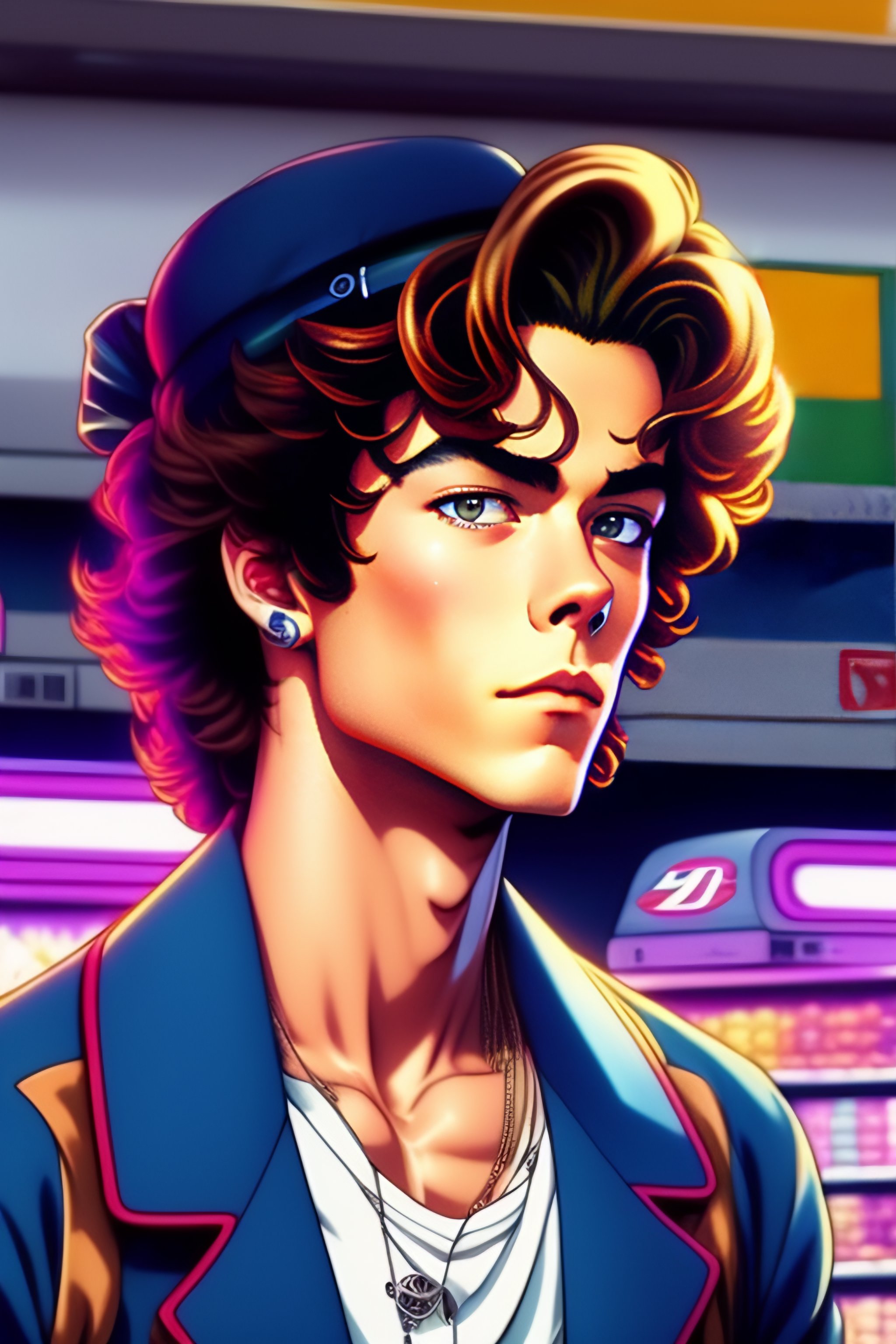 Vintage 90's anime style. harry styles posing in 7/11 convenience store.