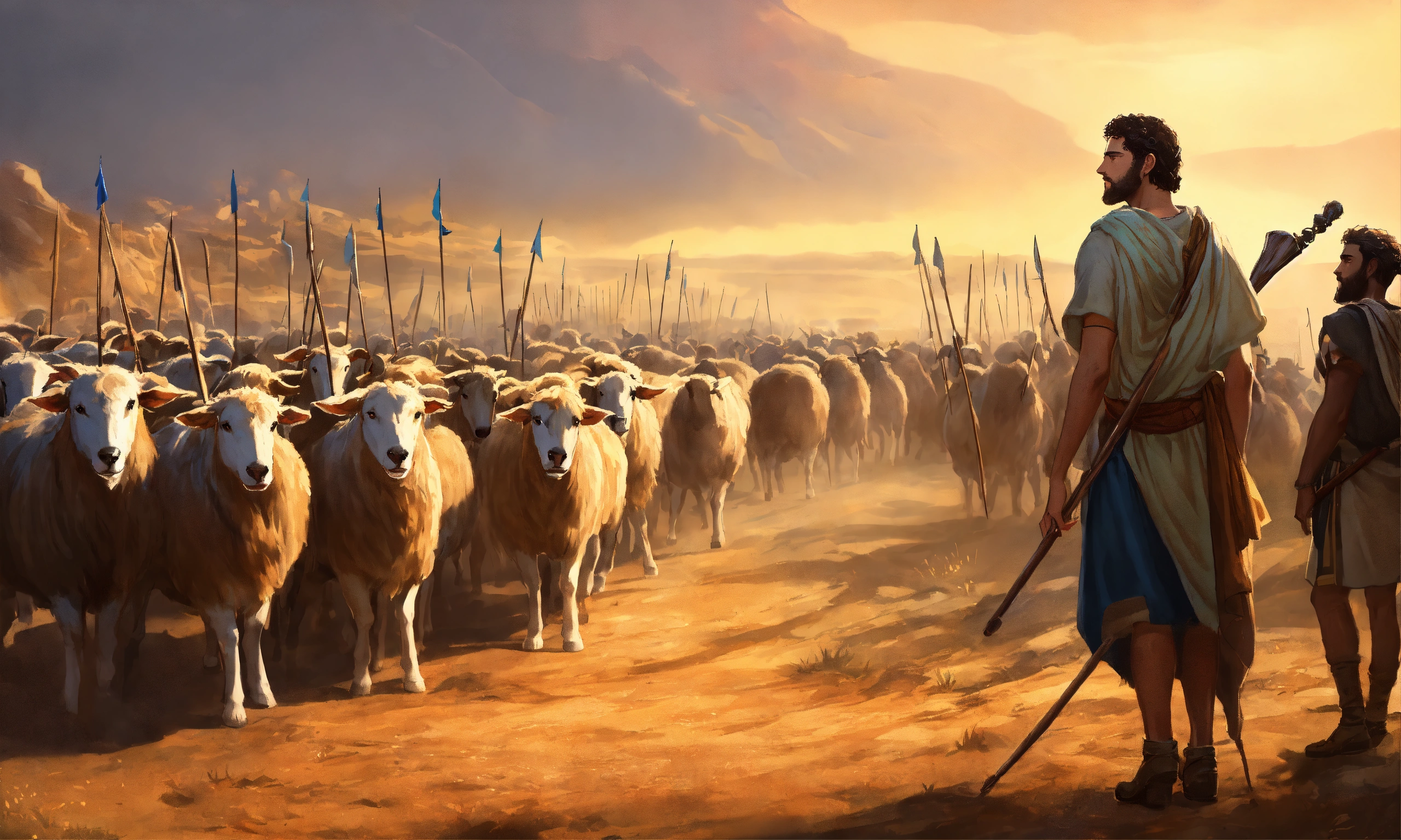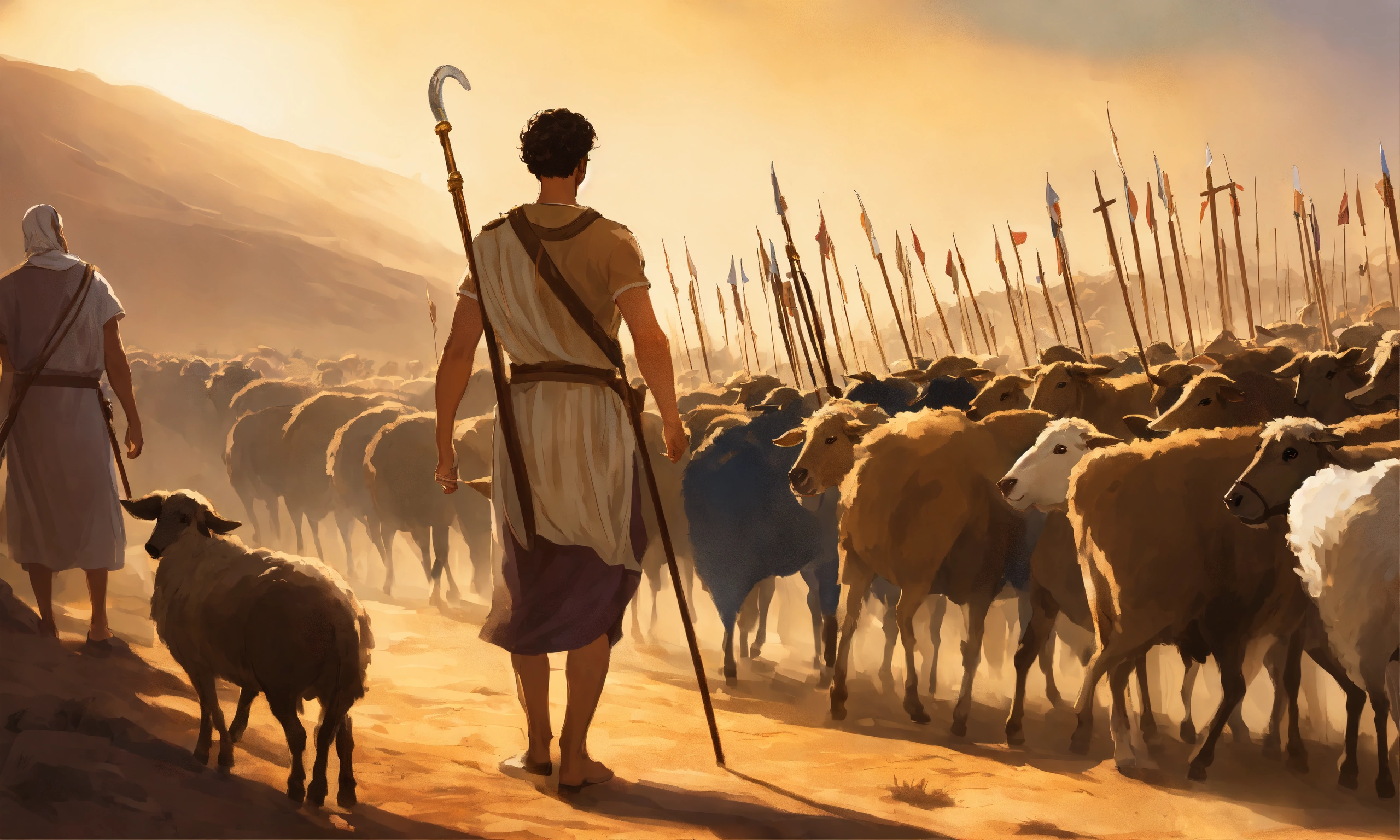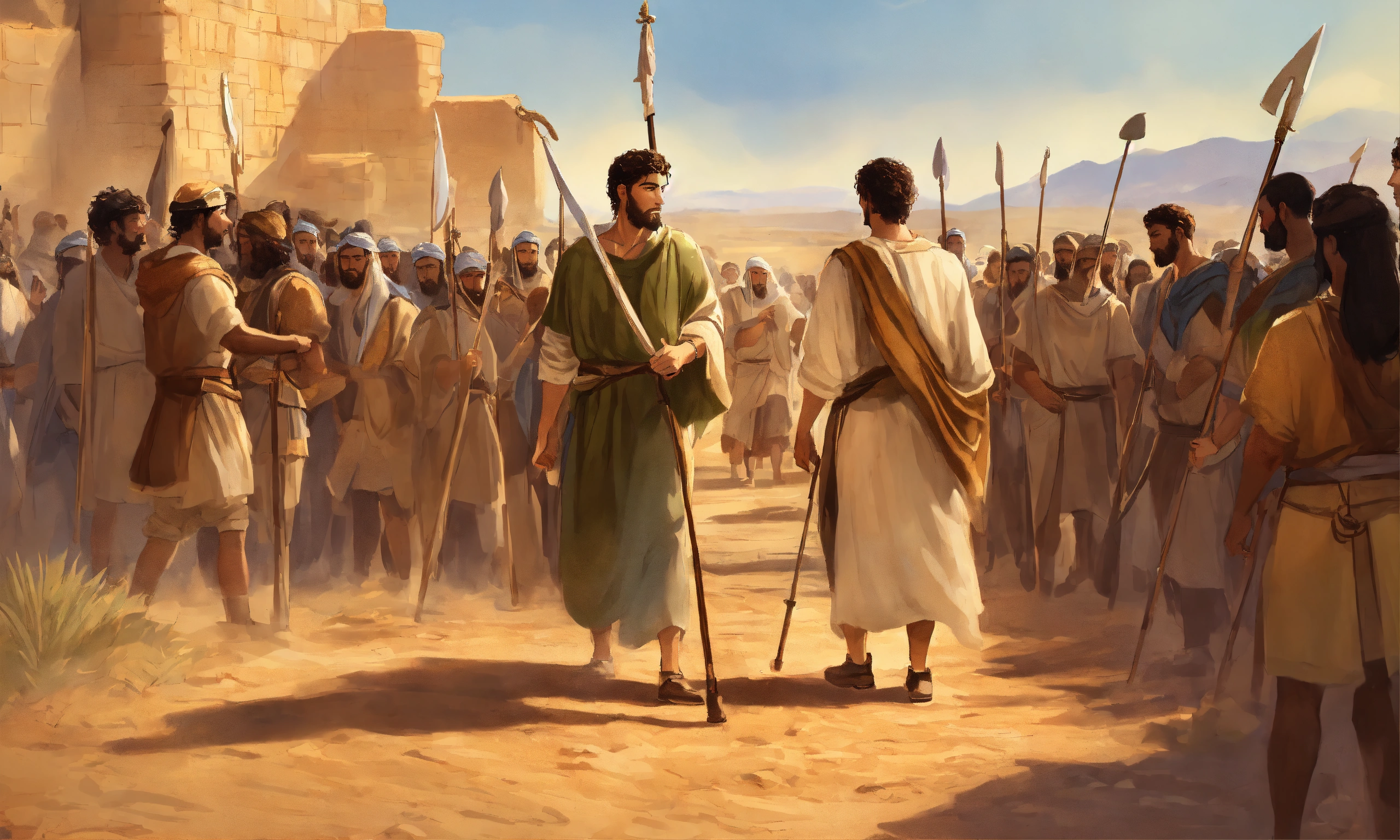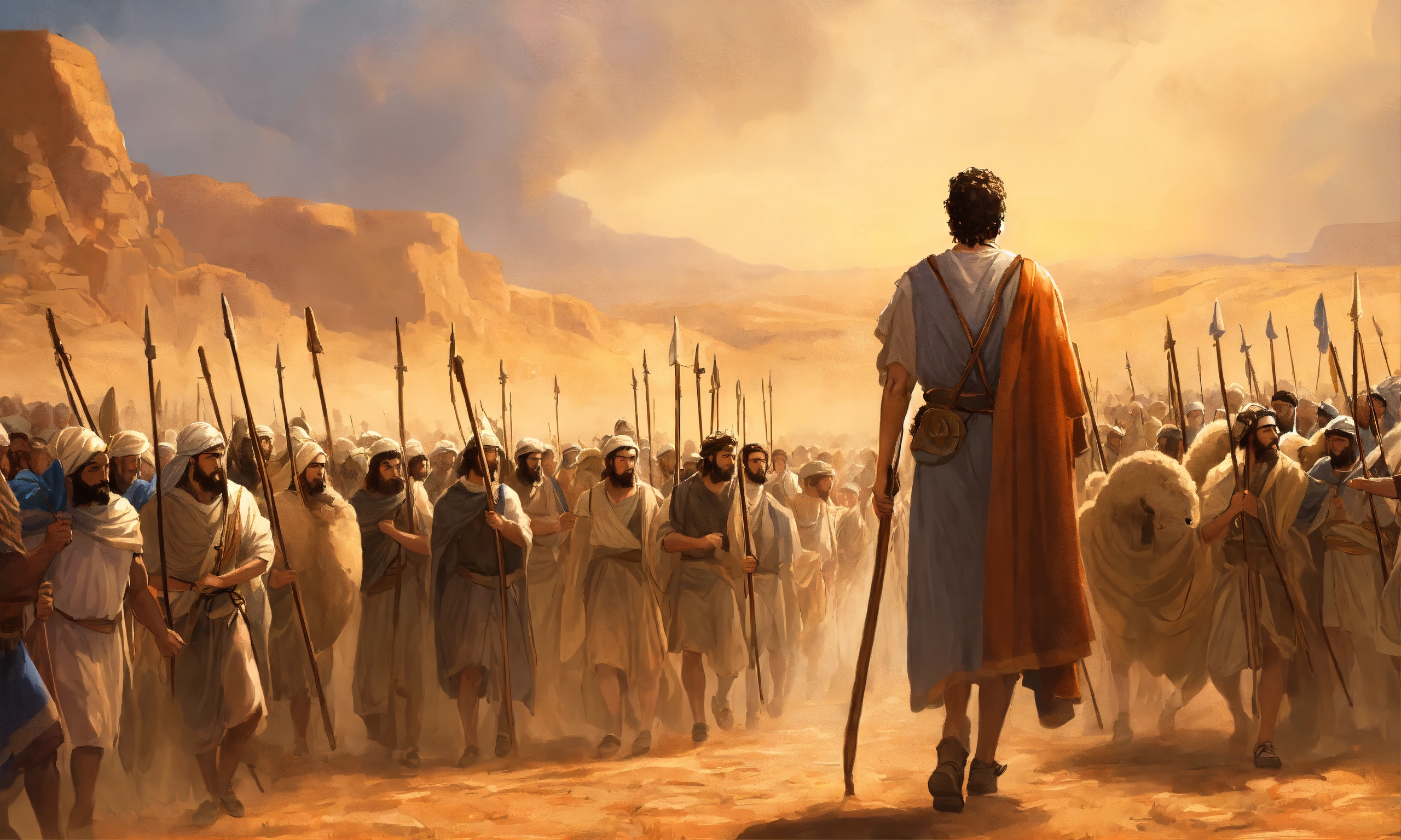 "a young shepherd named david steps forward from the crowd, holding a humble shepherd's staff. king saul and the israelite soldiers look on, surprised and uncertain. david's determined expression and unwavering faith in god are evident. illustrate the moment when david volunteers to face goliath