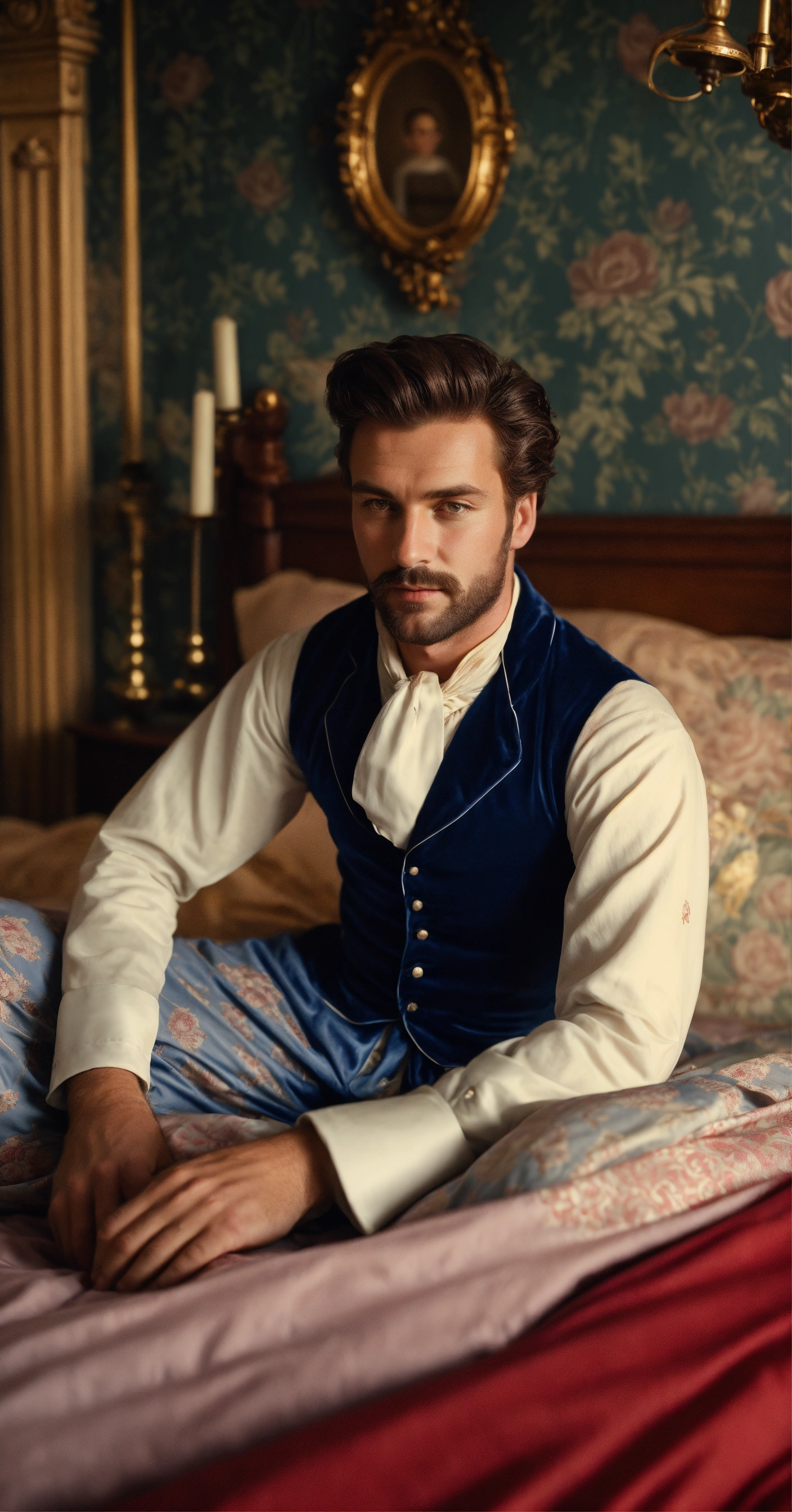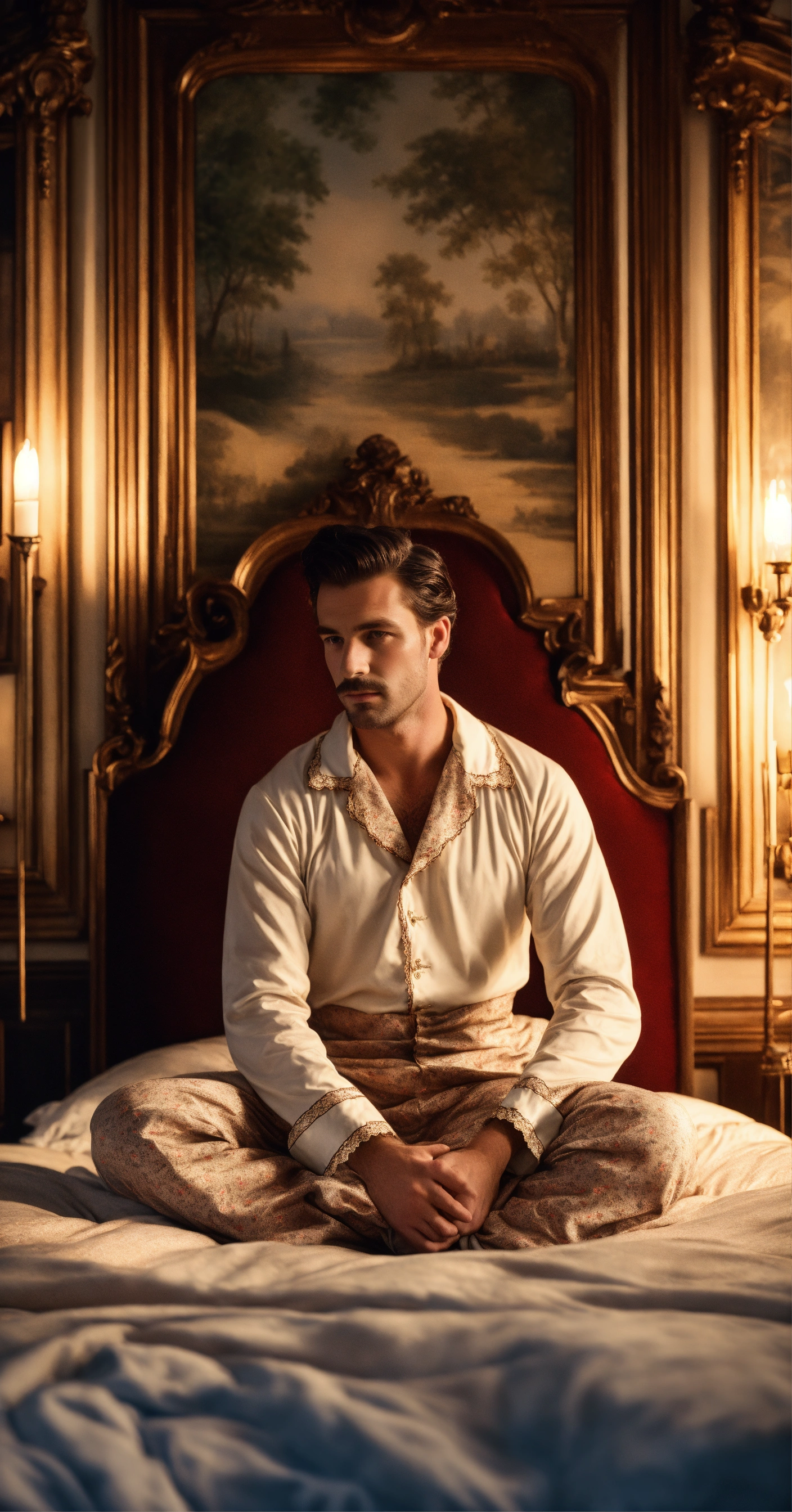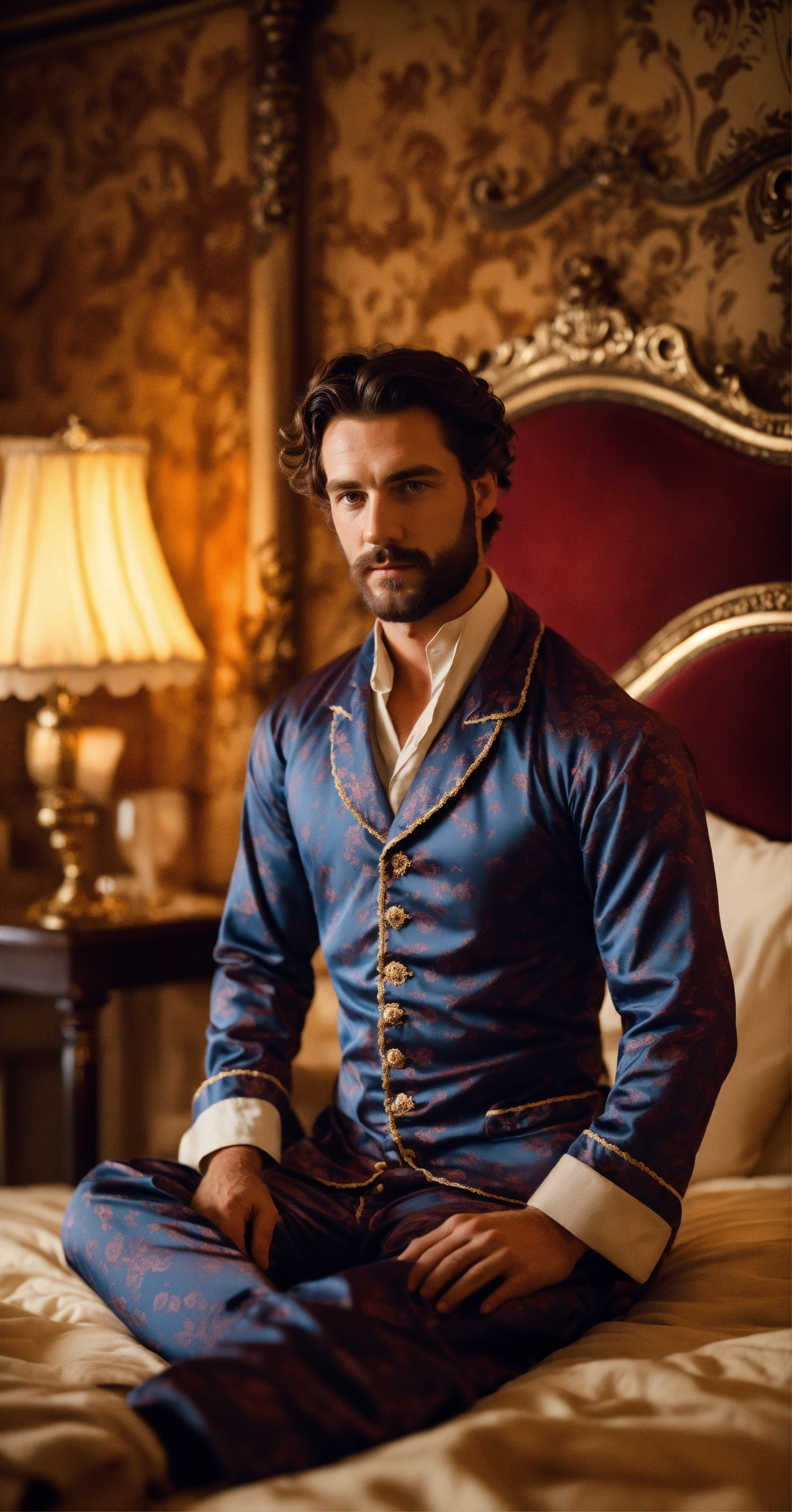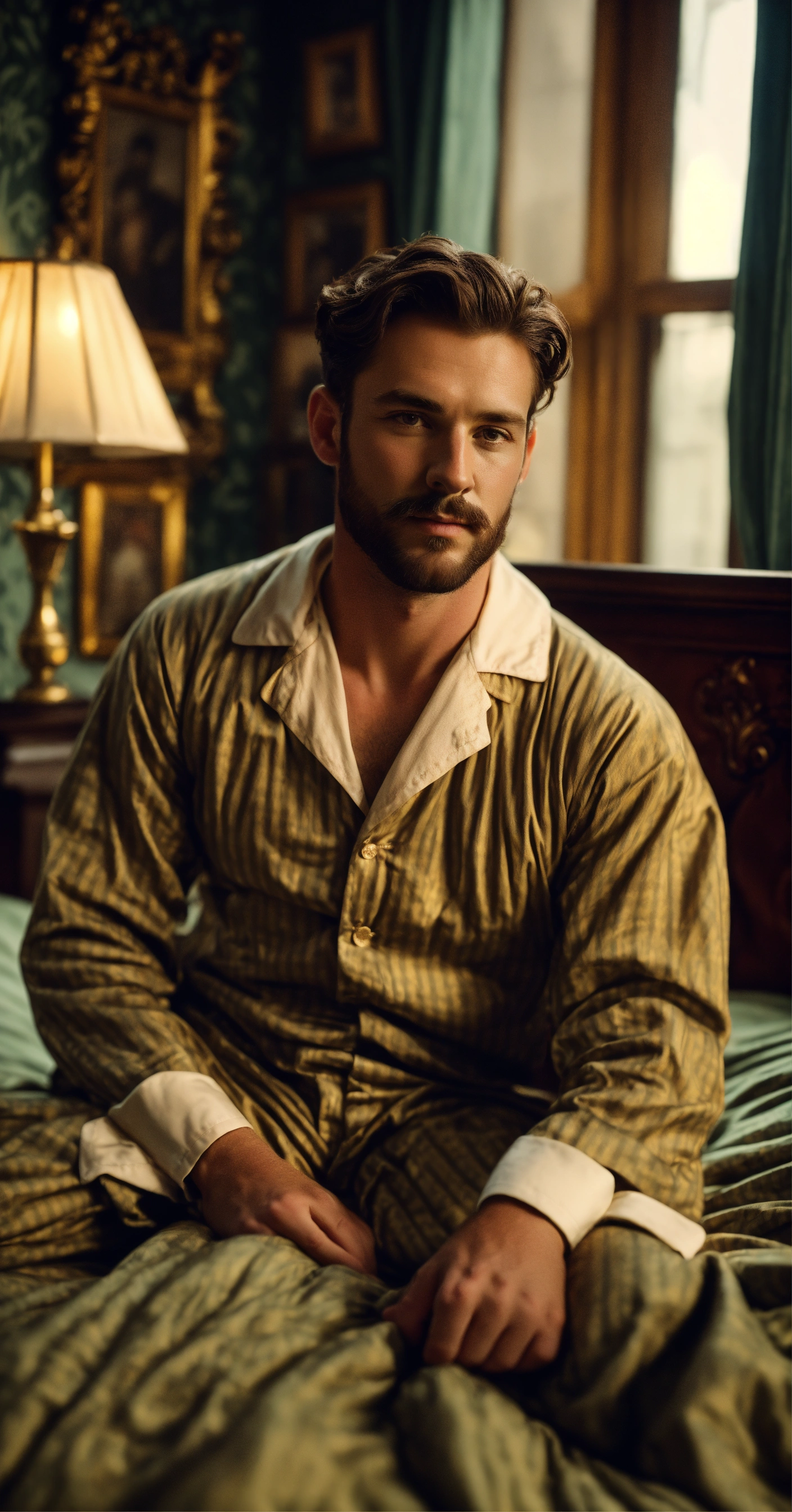 Very much handsome victorian man, wearing victorian pajamas, lying on the bed, looking to us, a romantic and nostalgic bedroom as the background, victorian theme, realistic, 8k, romantic and ultra detailed ambient
