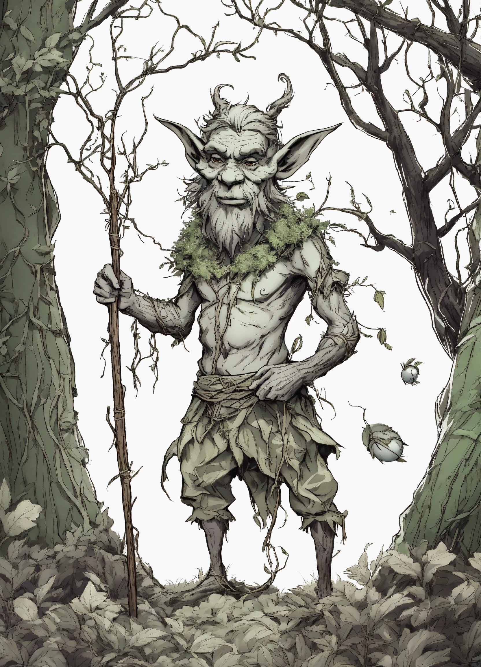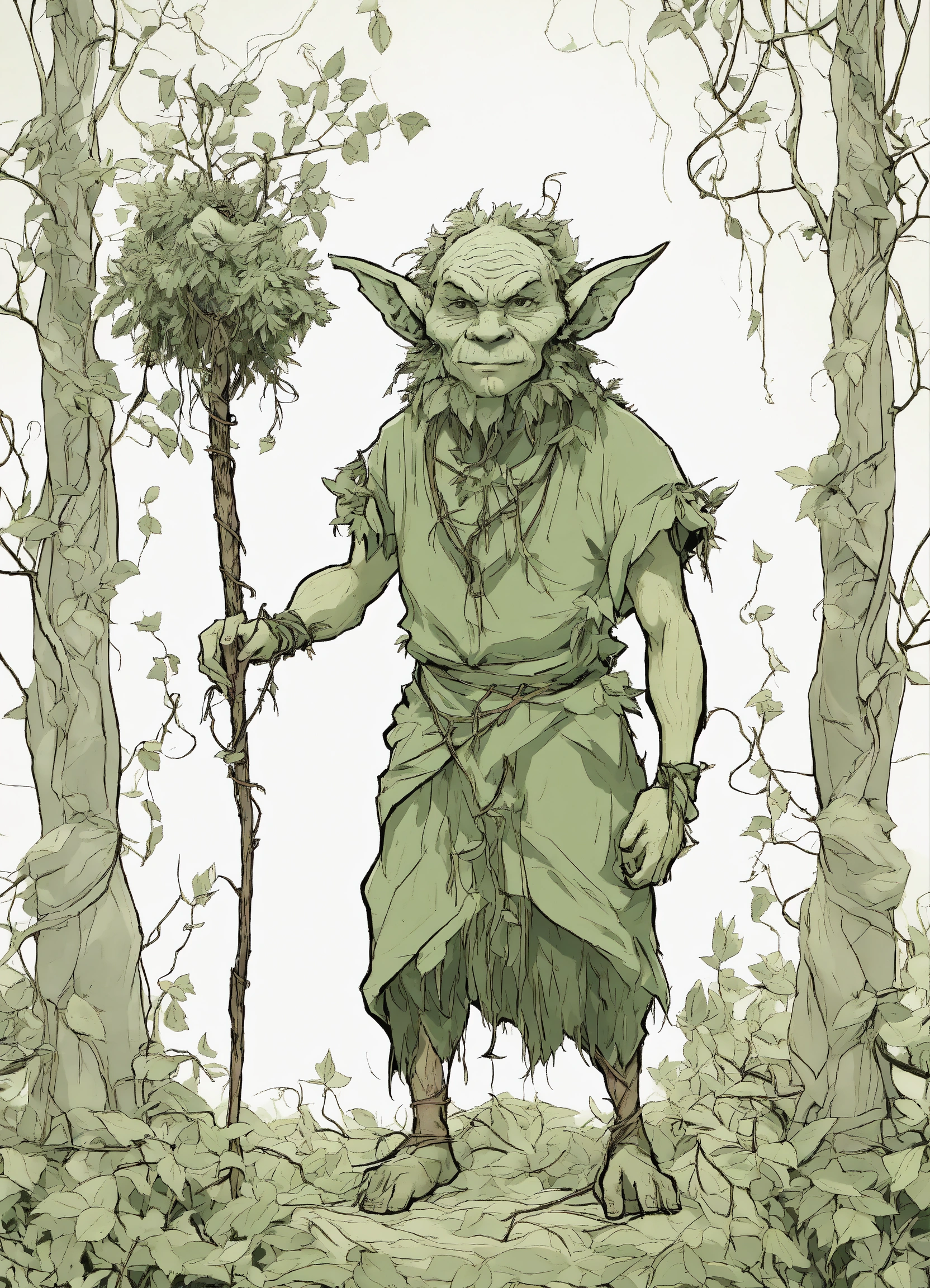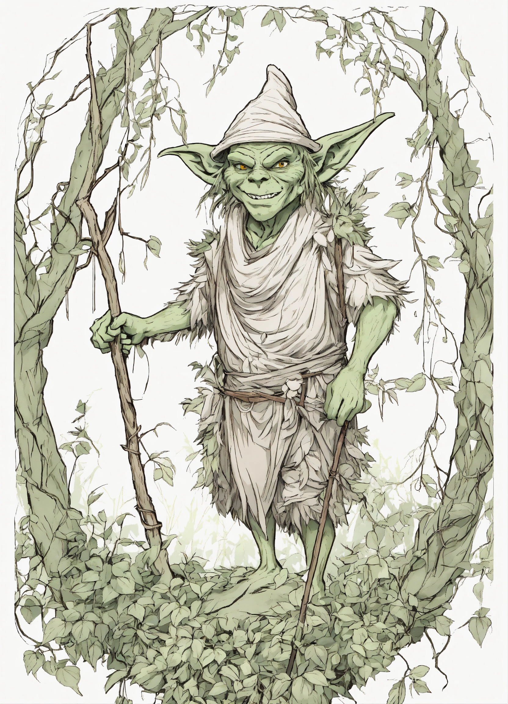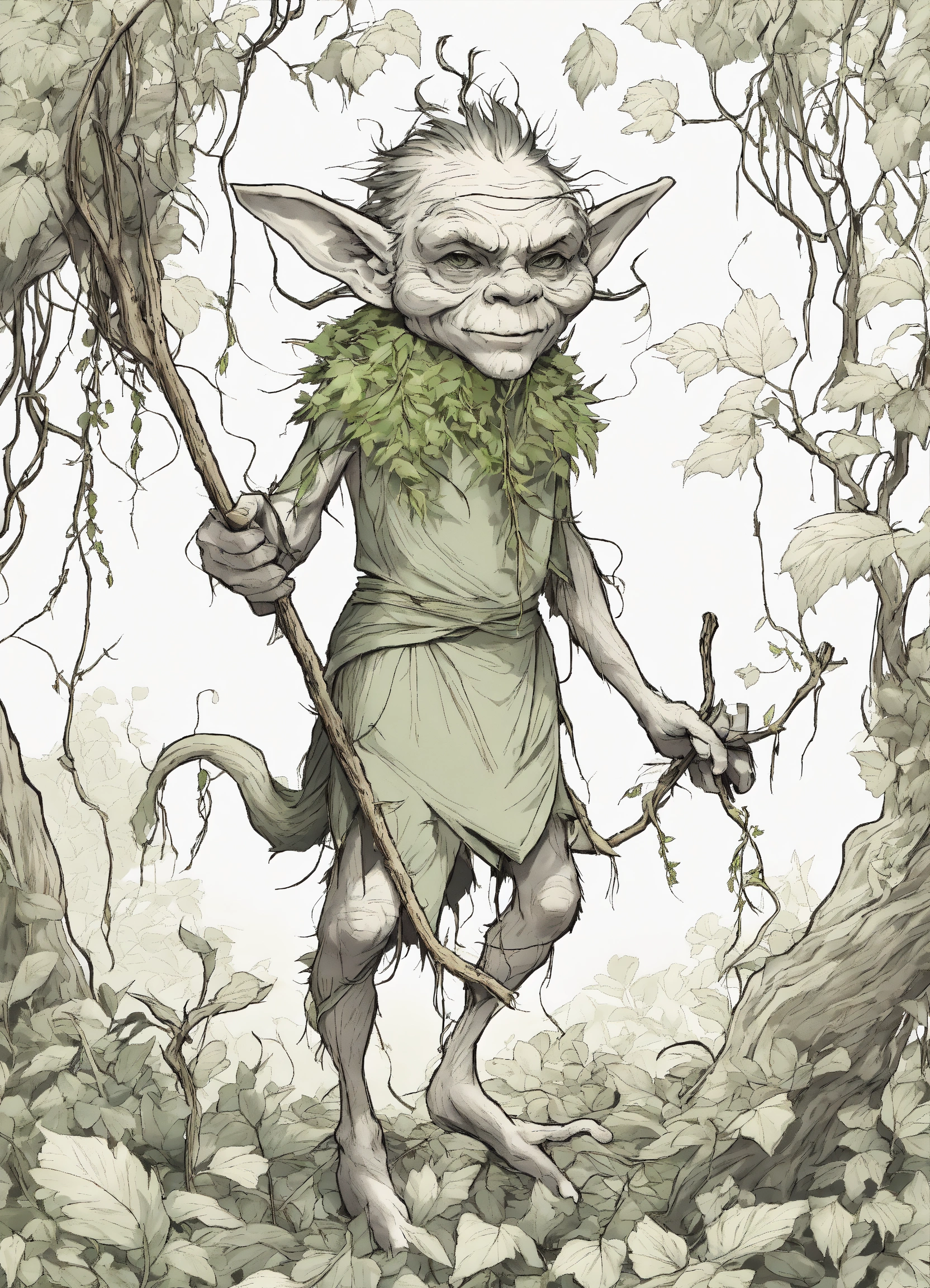 A forest goblin standing in a tunic of tree branches and vines.caricature, 3d model, stunted goblin standing in a tunic made of fluffy green branches of willow and vines hanging down, in one hand holding a staff, in the other hand a ball with a magic potion, black and white vector outline