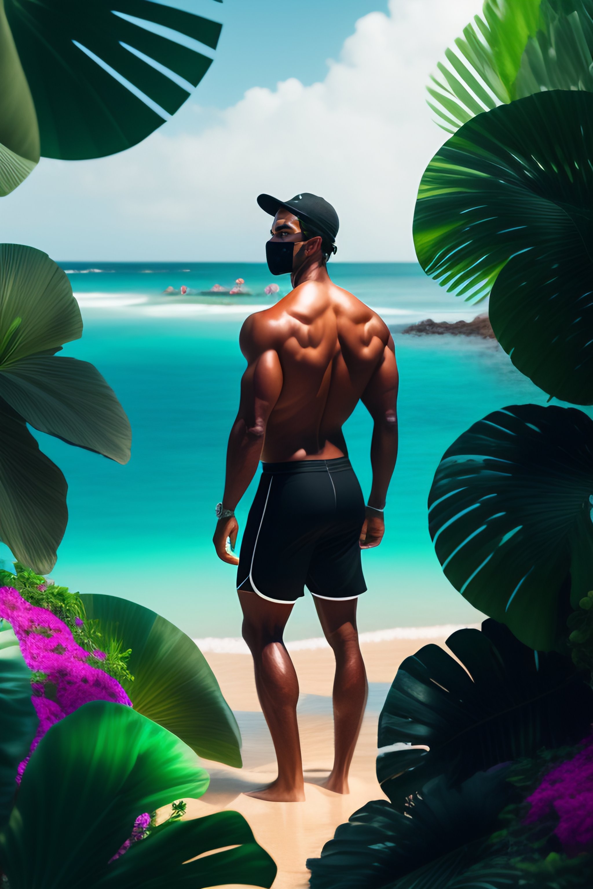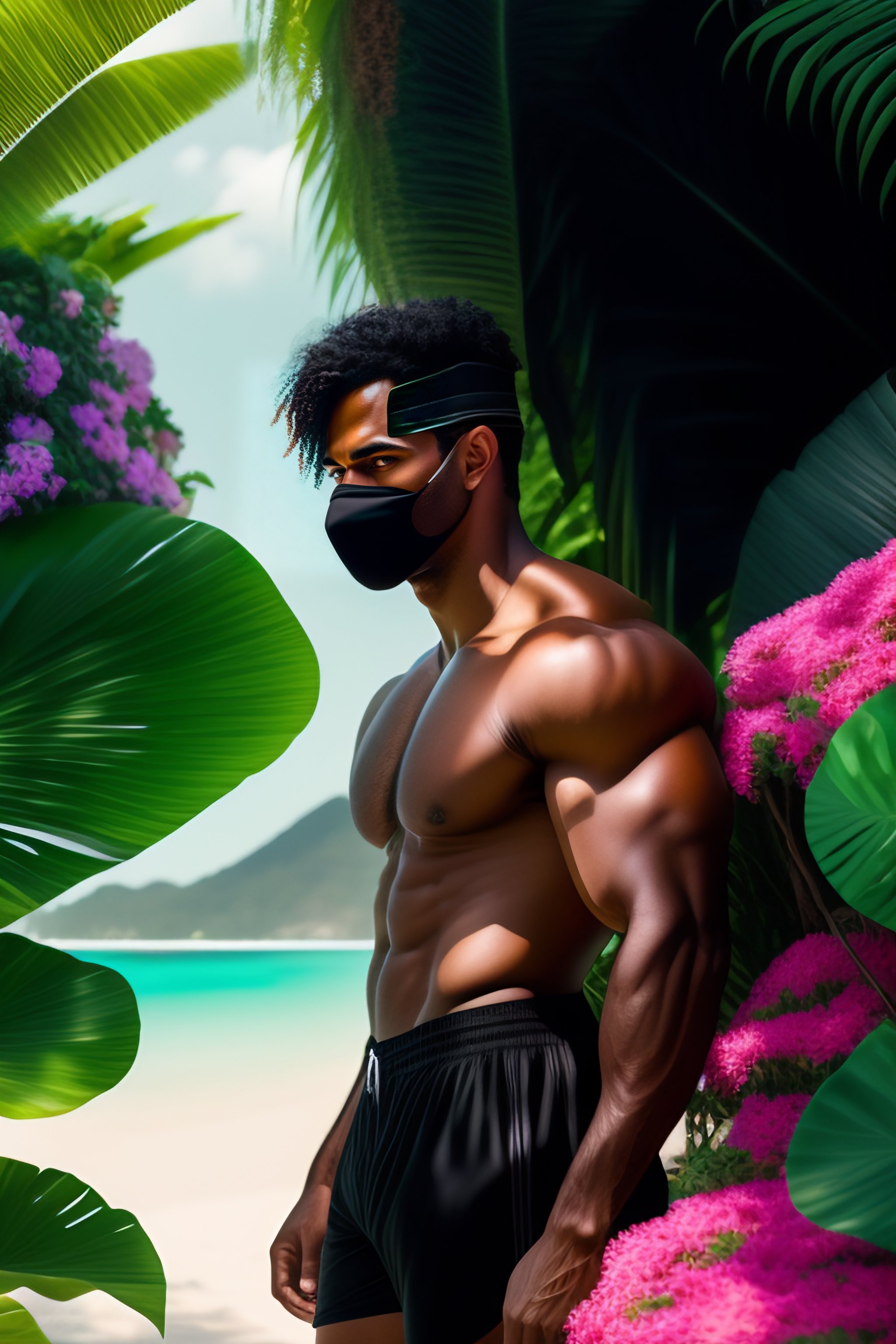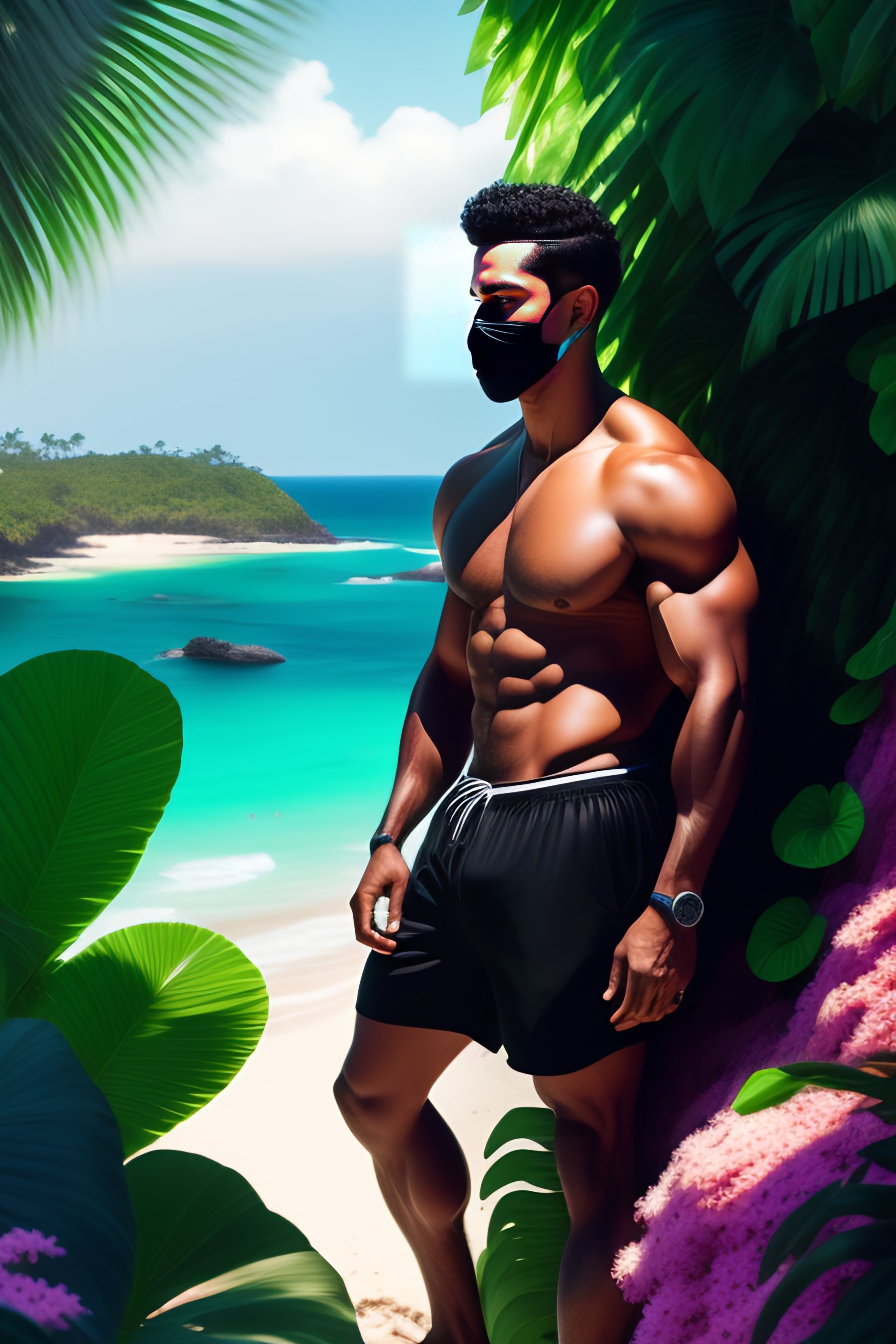 Handsome mulatto brazilian man wearing black swim trunks and wearing cap wearing black white mask hiding in bush on tropical beach with colorful greenery and flowers, full length view, greg rutkowski, ultra detailed, volumetric lighting