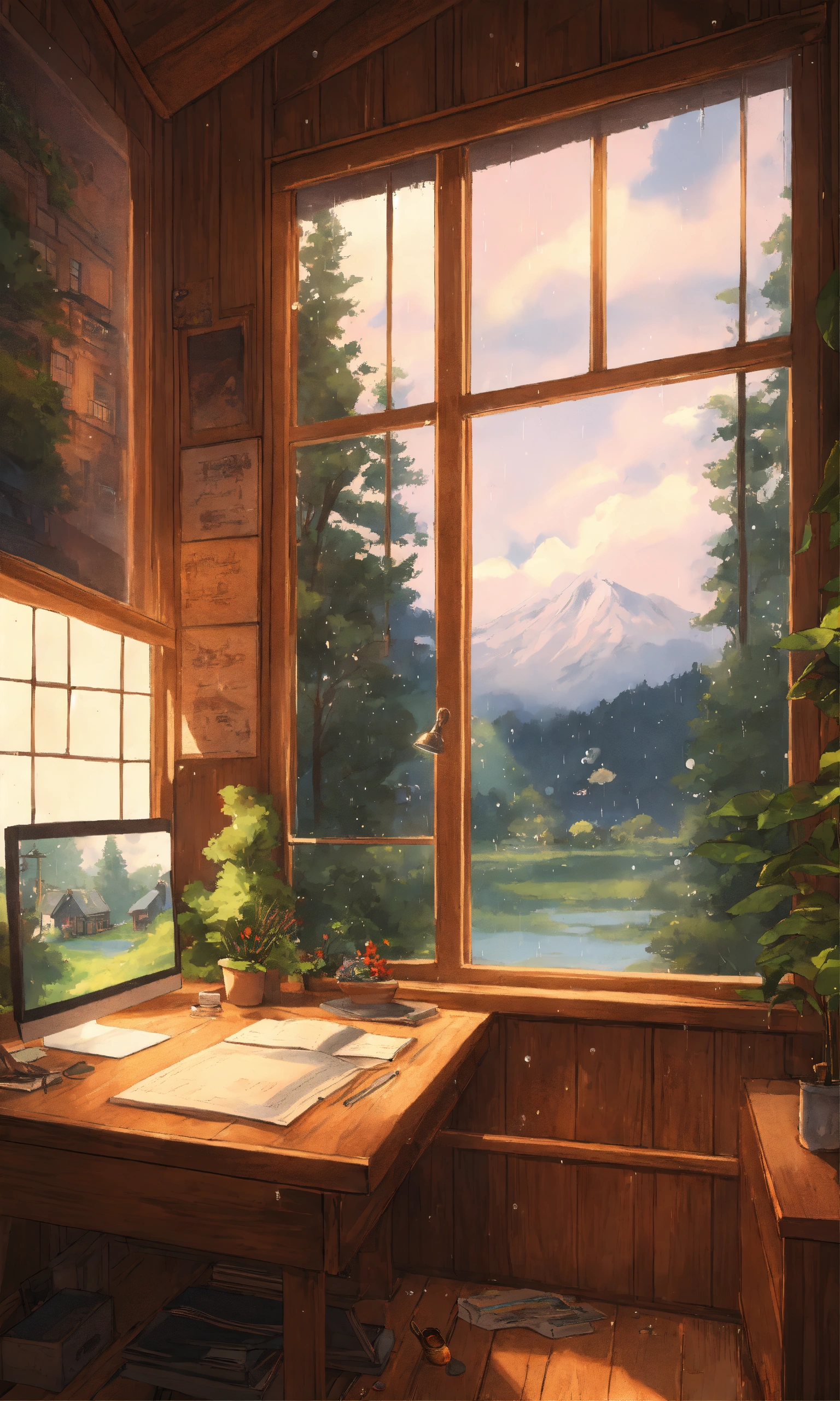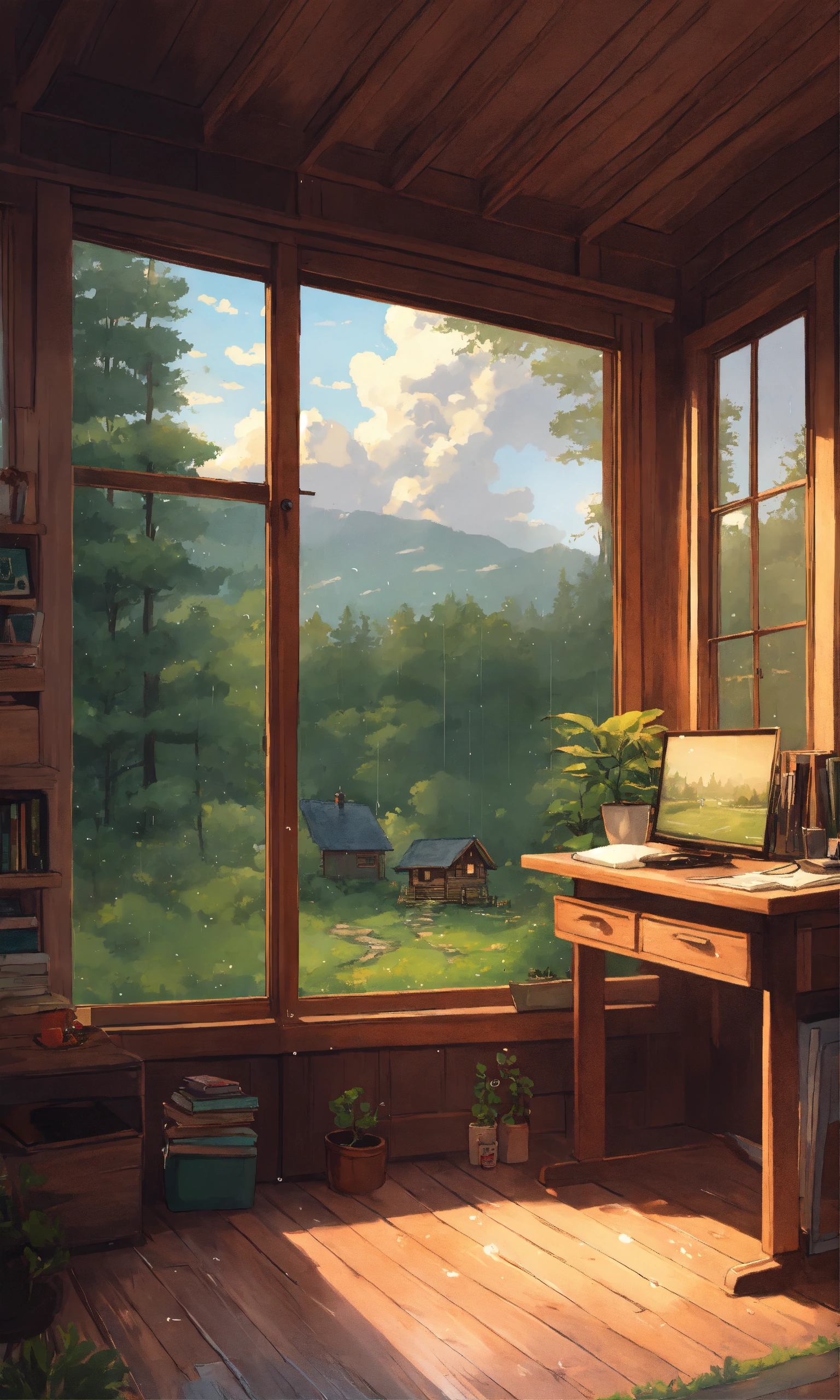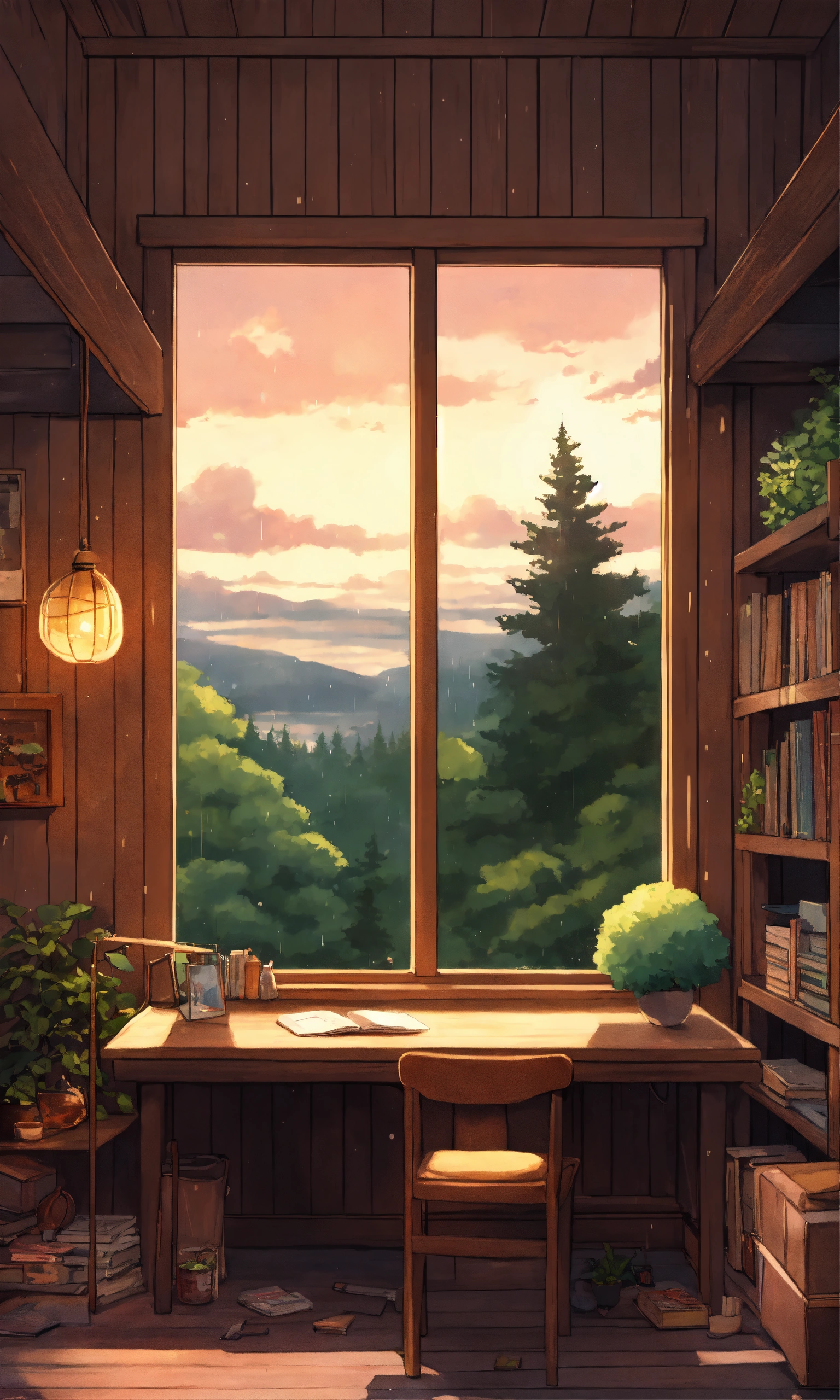 Cozy wooden nordic cabin, anime, studio ghibli, minimalistic, raining outside, big window view with study desk, washed acrylic image, forrest outside, anime lofi artwork