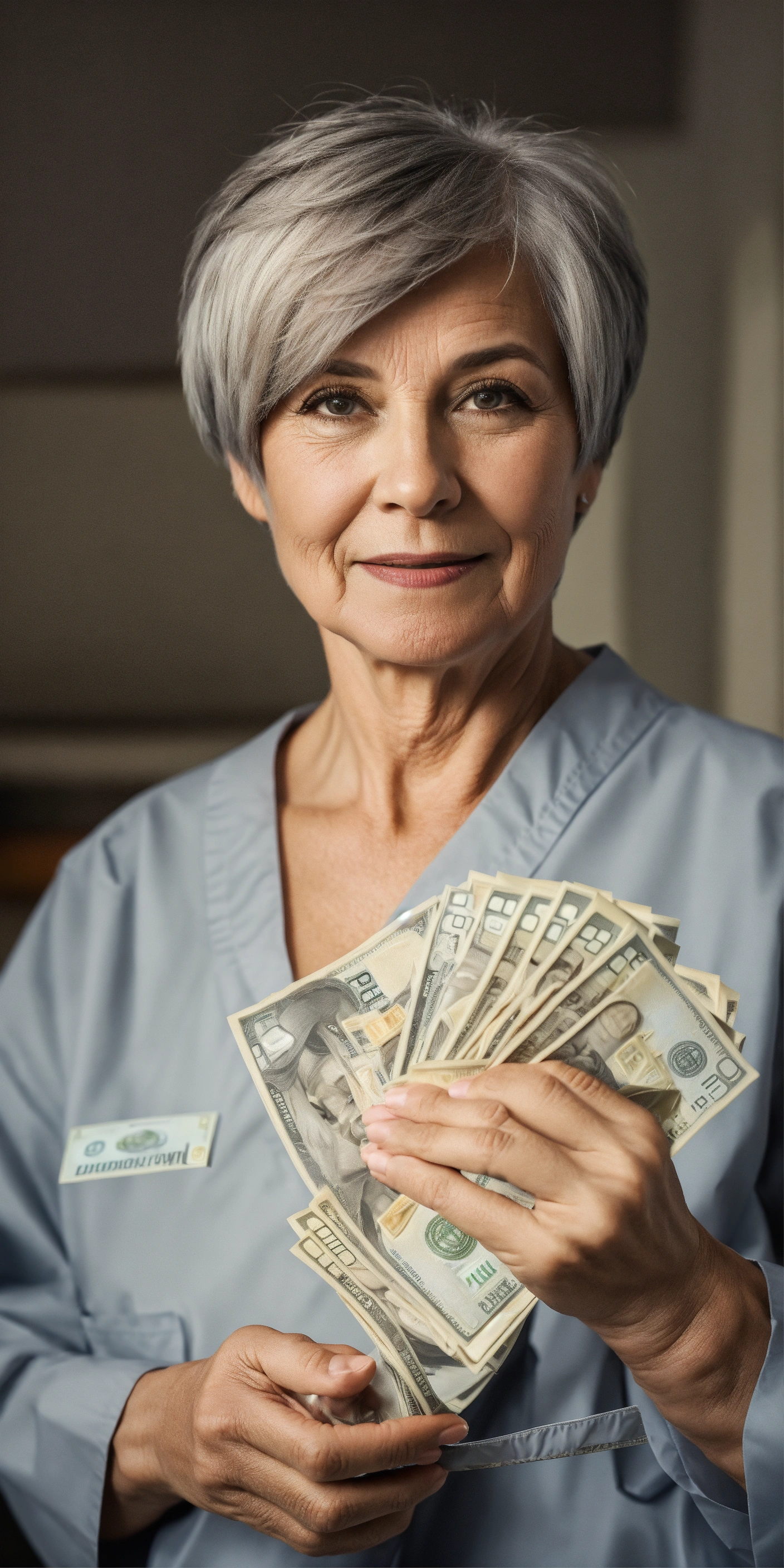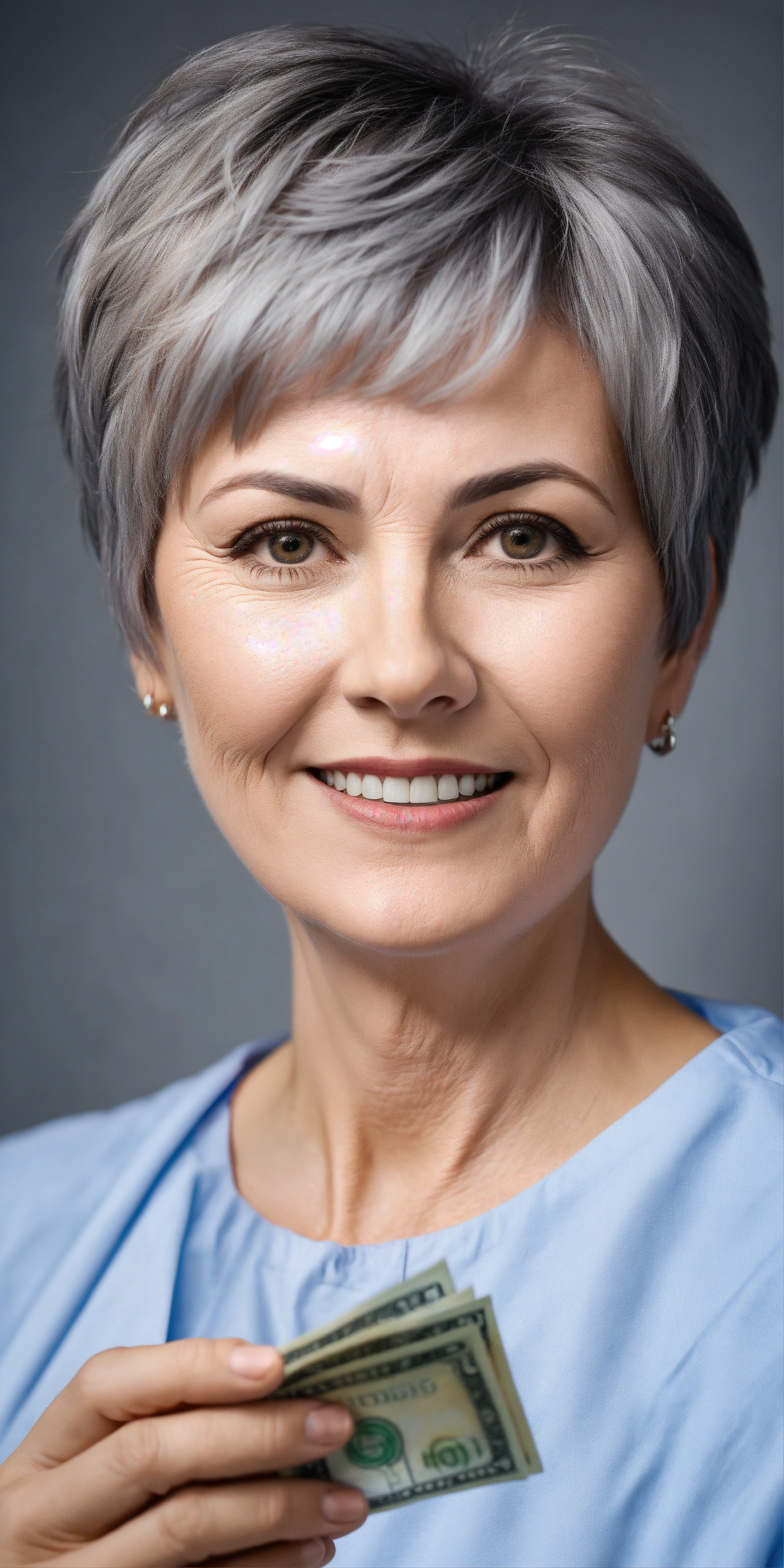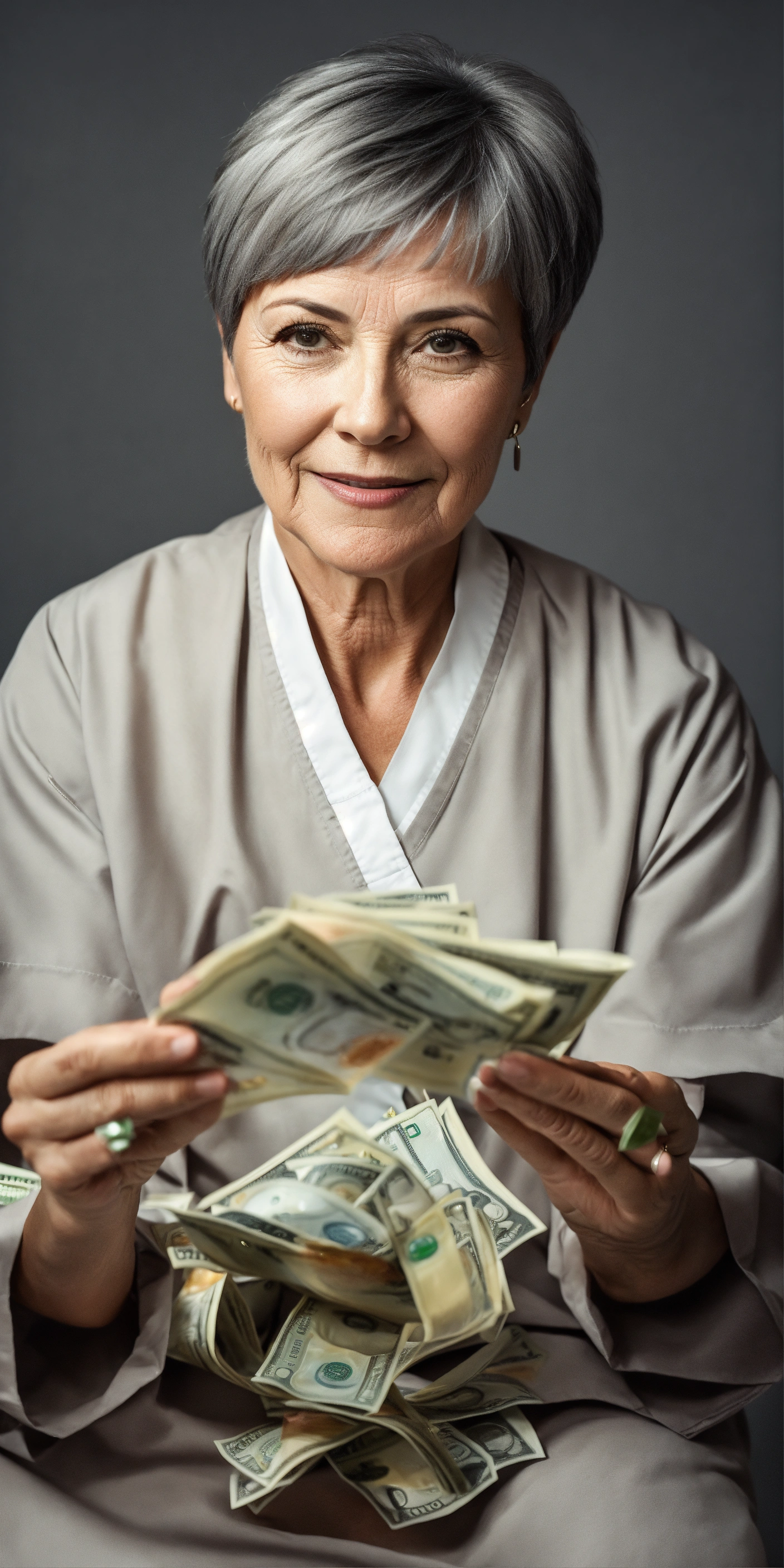 A woman about 55 years old with a short gray haircut wearing hospital clothes, she tosses money above her, the woman is looking at the camera, realistic photo