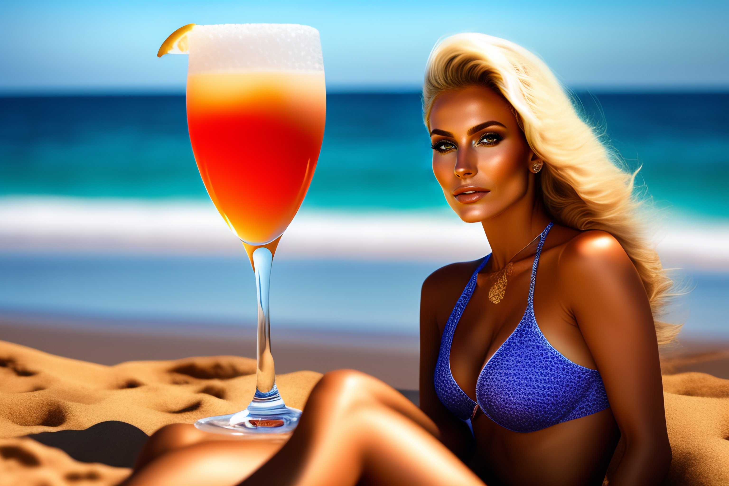 A very pretty woman, blonde, with armenian features, in a bathing suit, on the beach having a cocktail. full body shot.