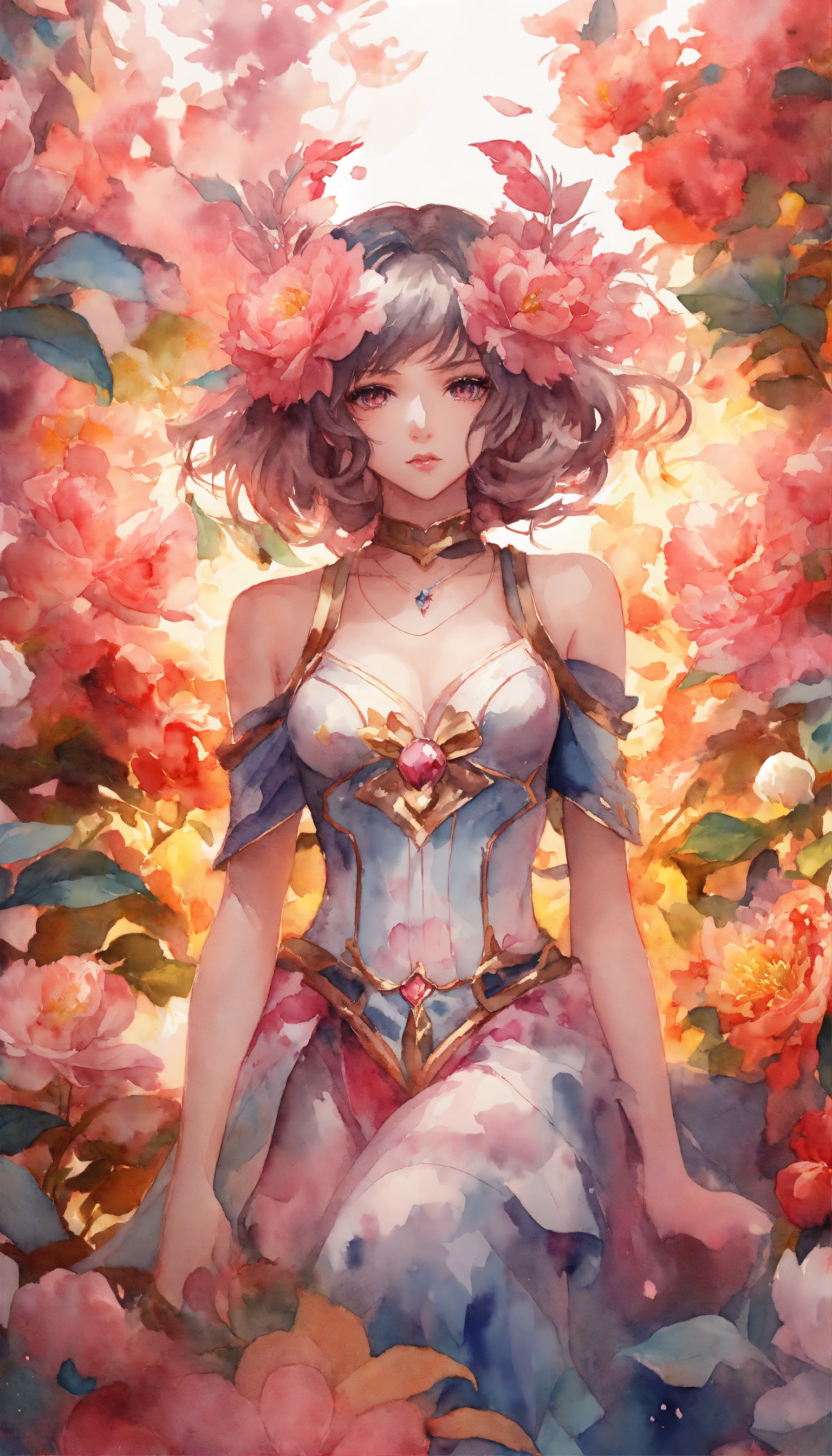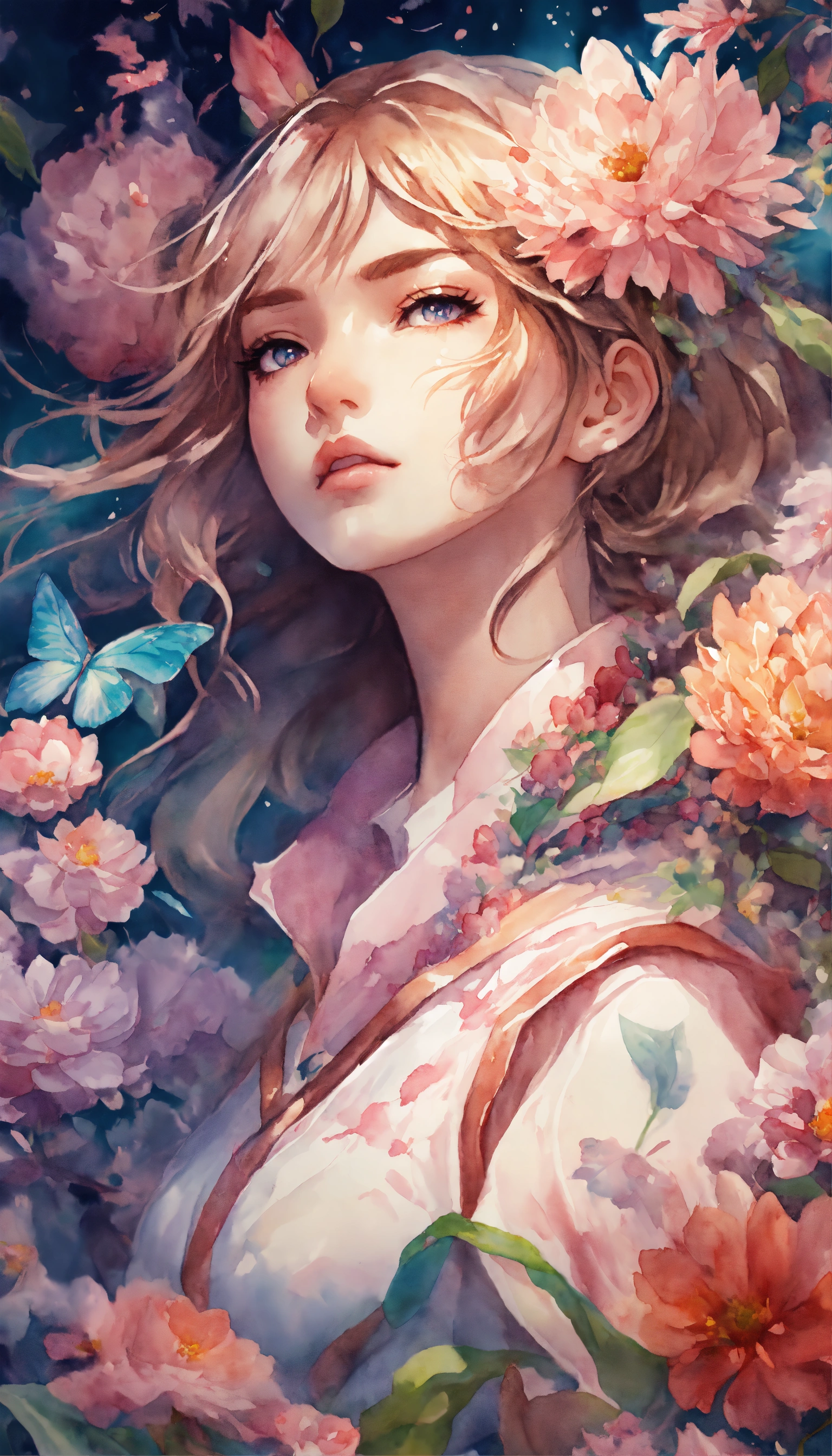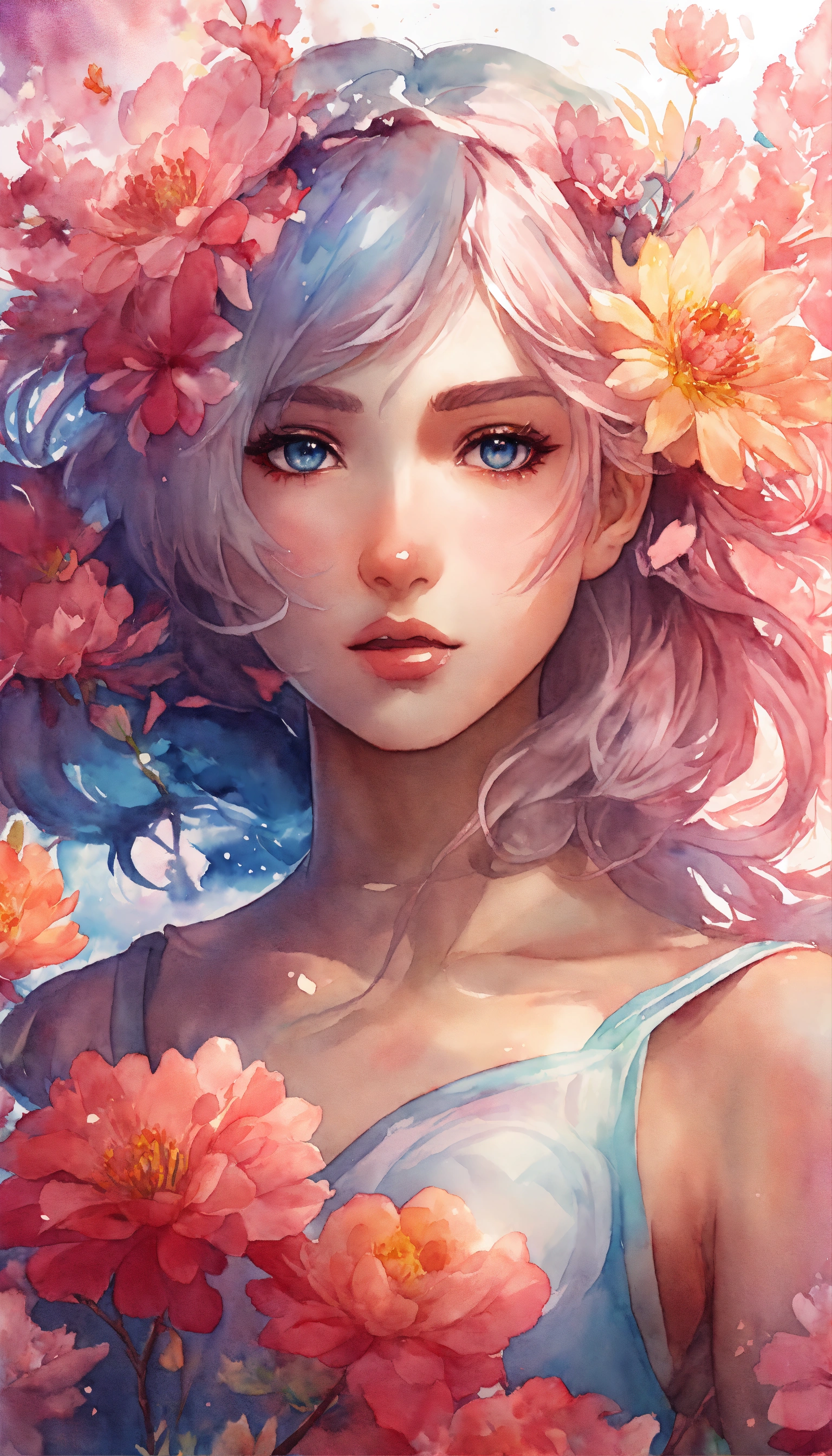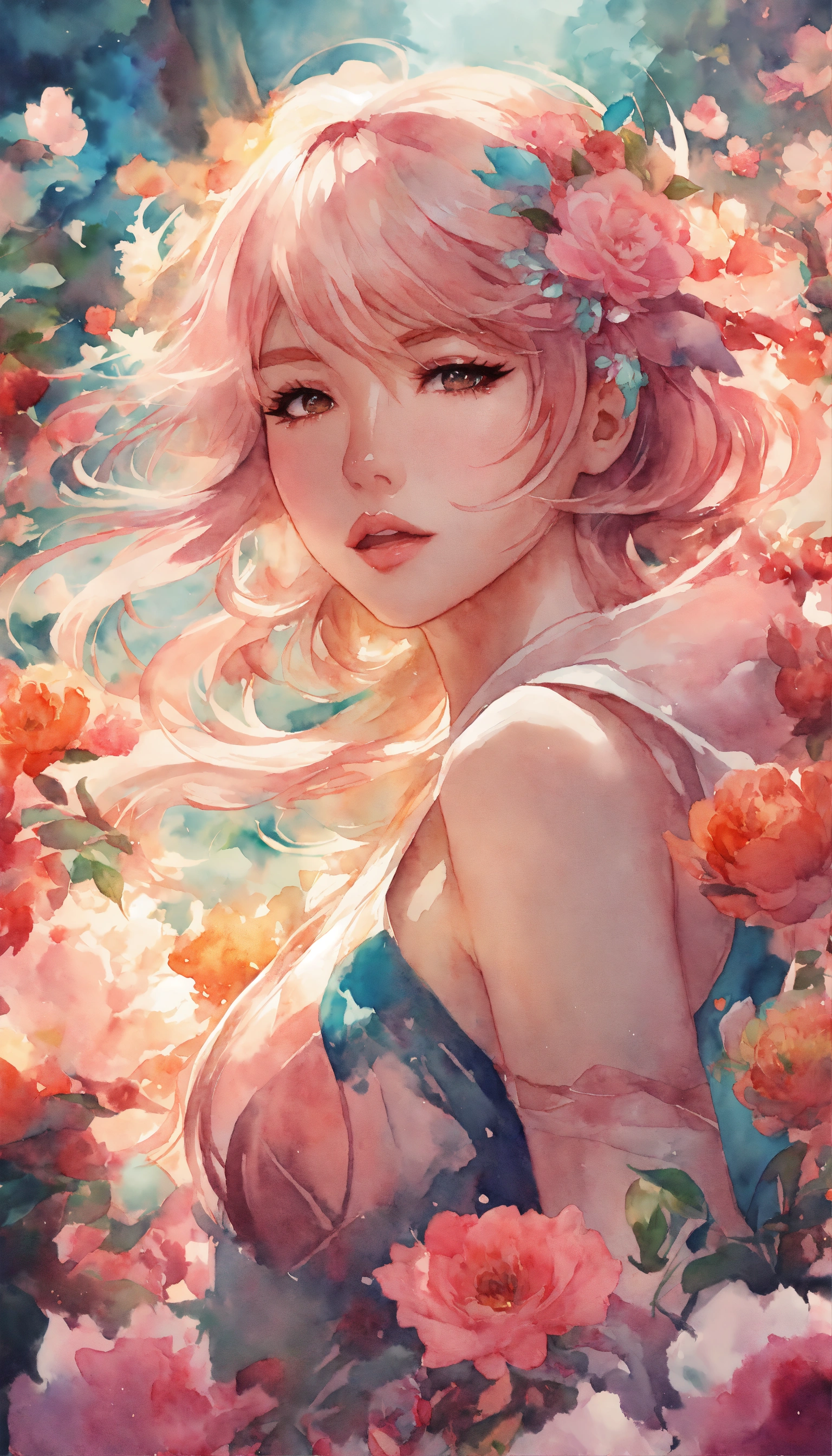 Abstract watercolor anime art of a magical girl surrounded by flowers, 8k, stunning intricate details, by artgerm