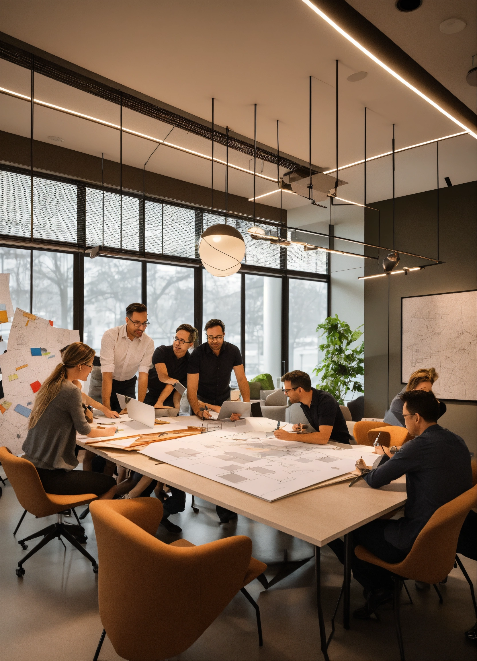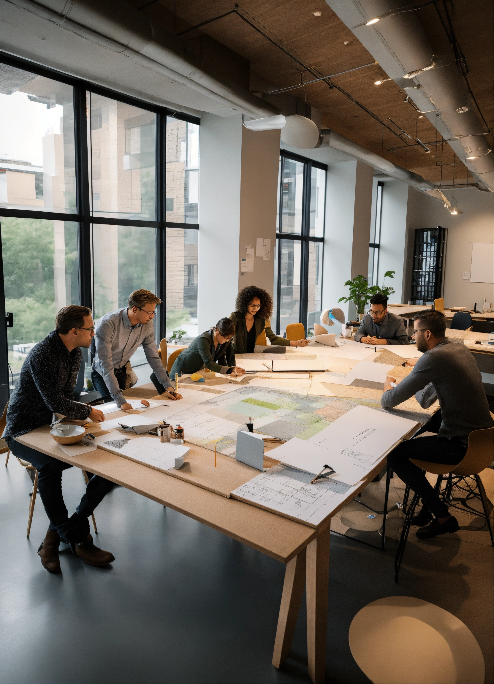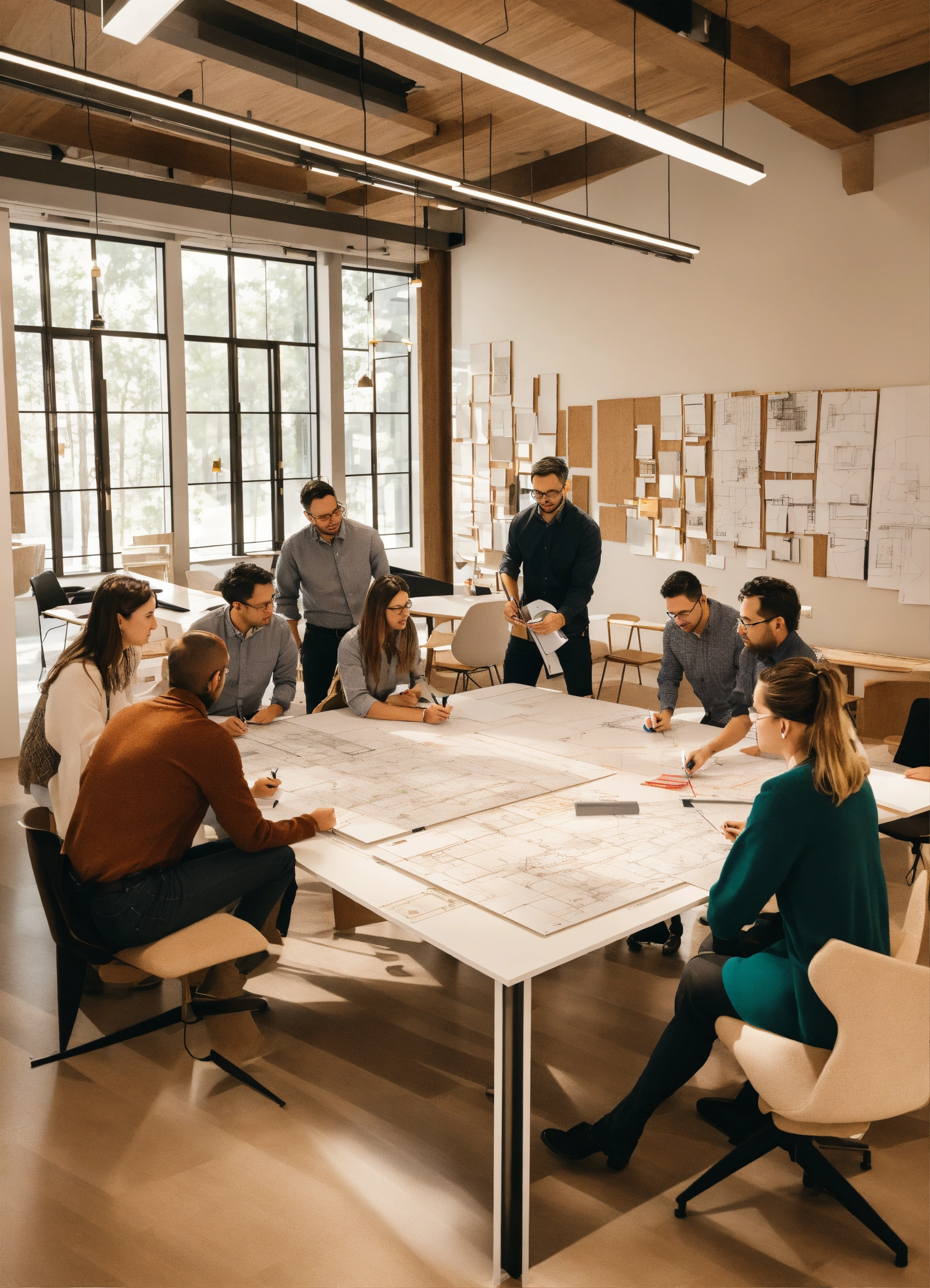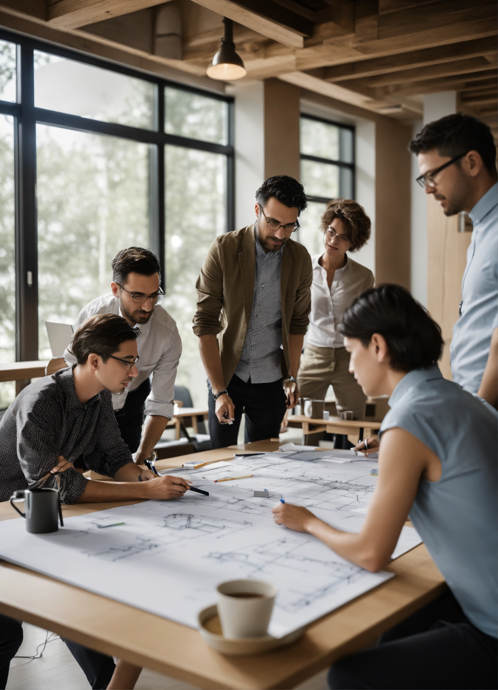 In this image, you can see a team of architects, designers, and clients discussing ideas around a meeting table. they are immersed in sketches, floor plans, and material samples. this illustrates active collaboration and open communication during the project design phase.
