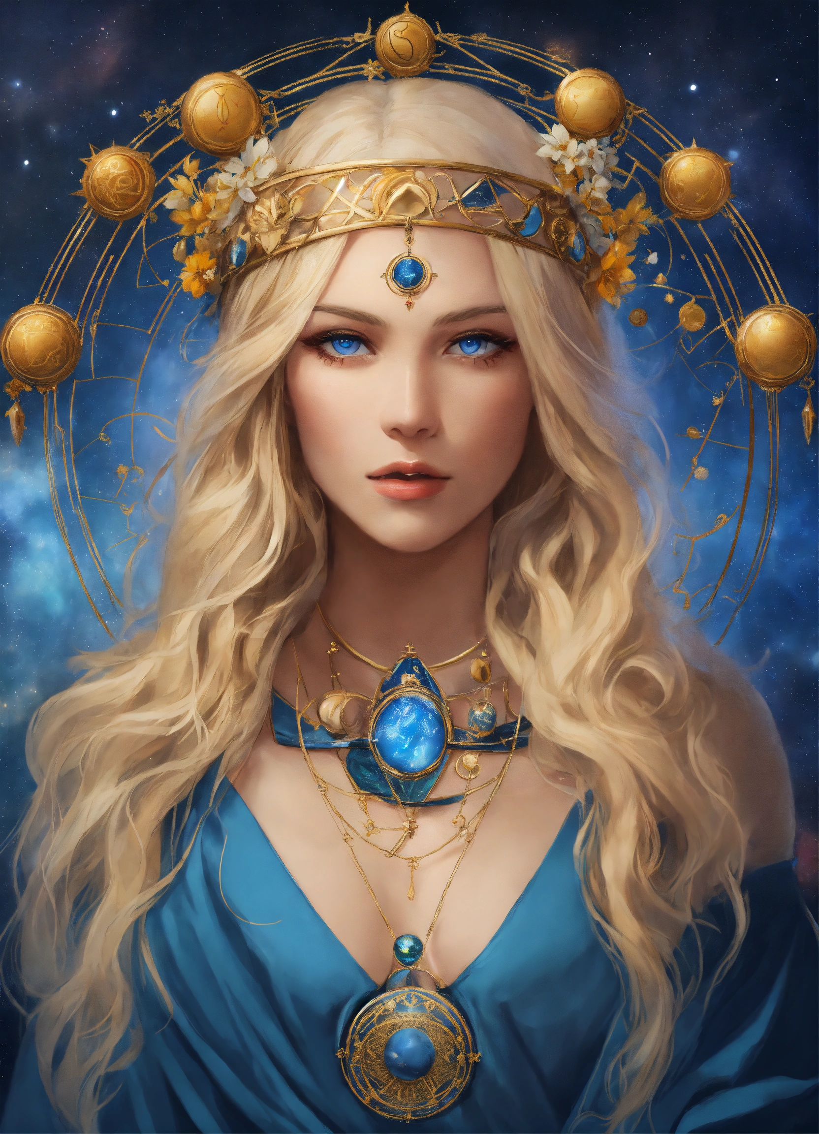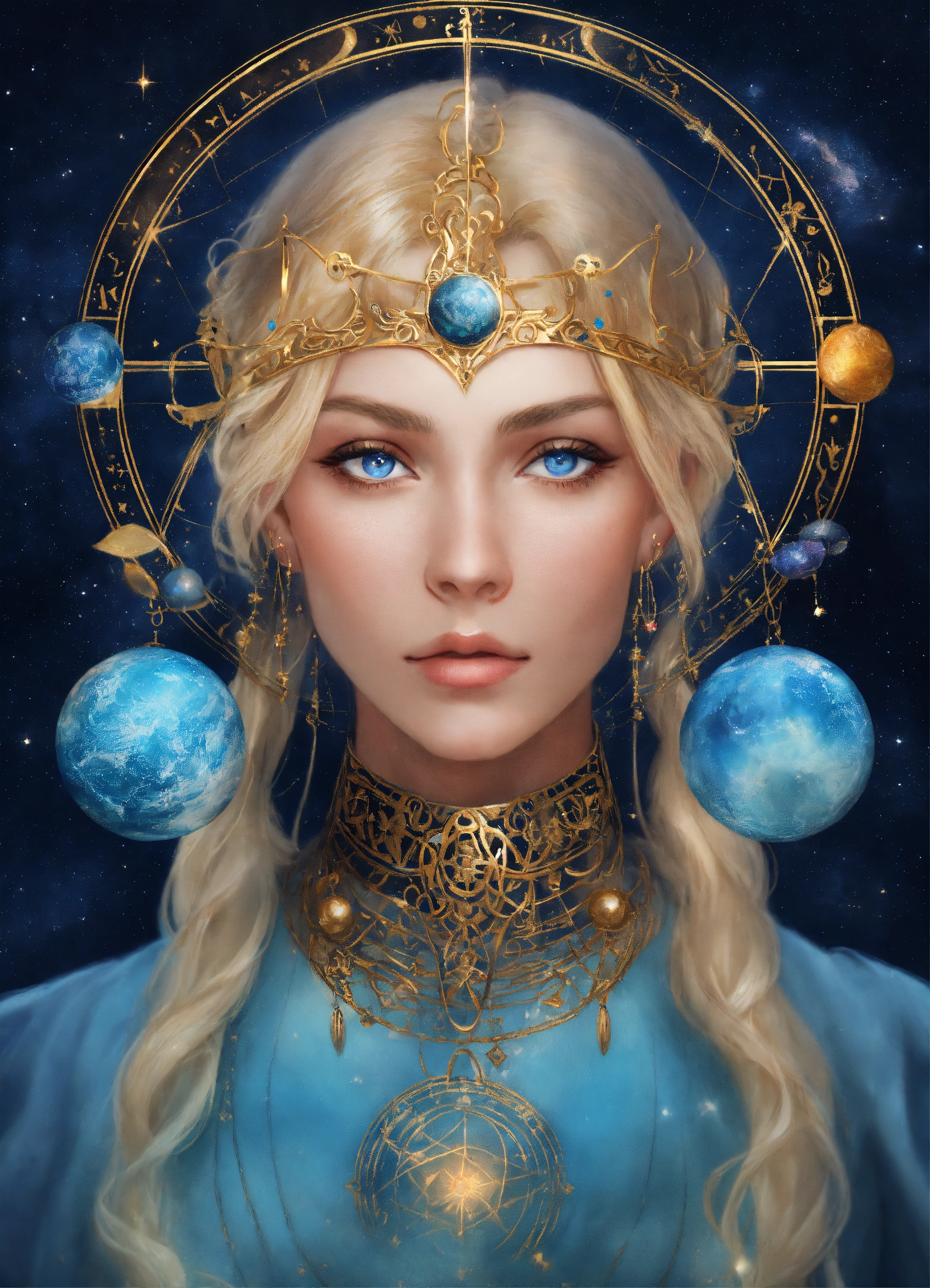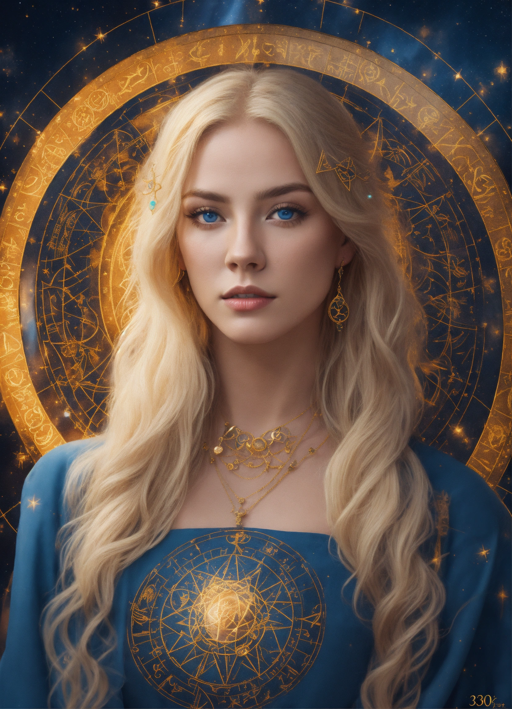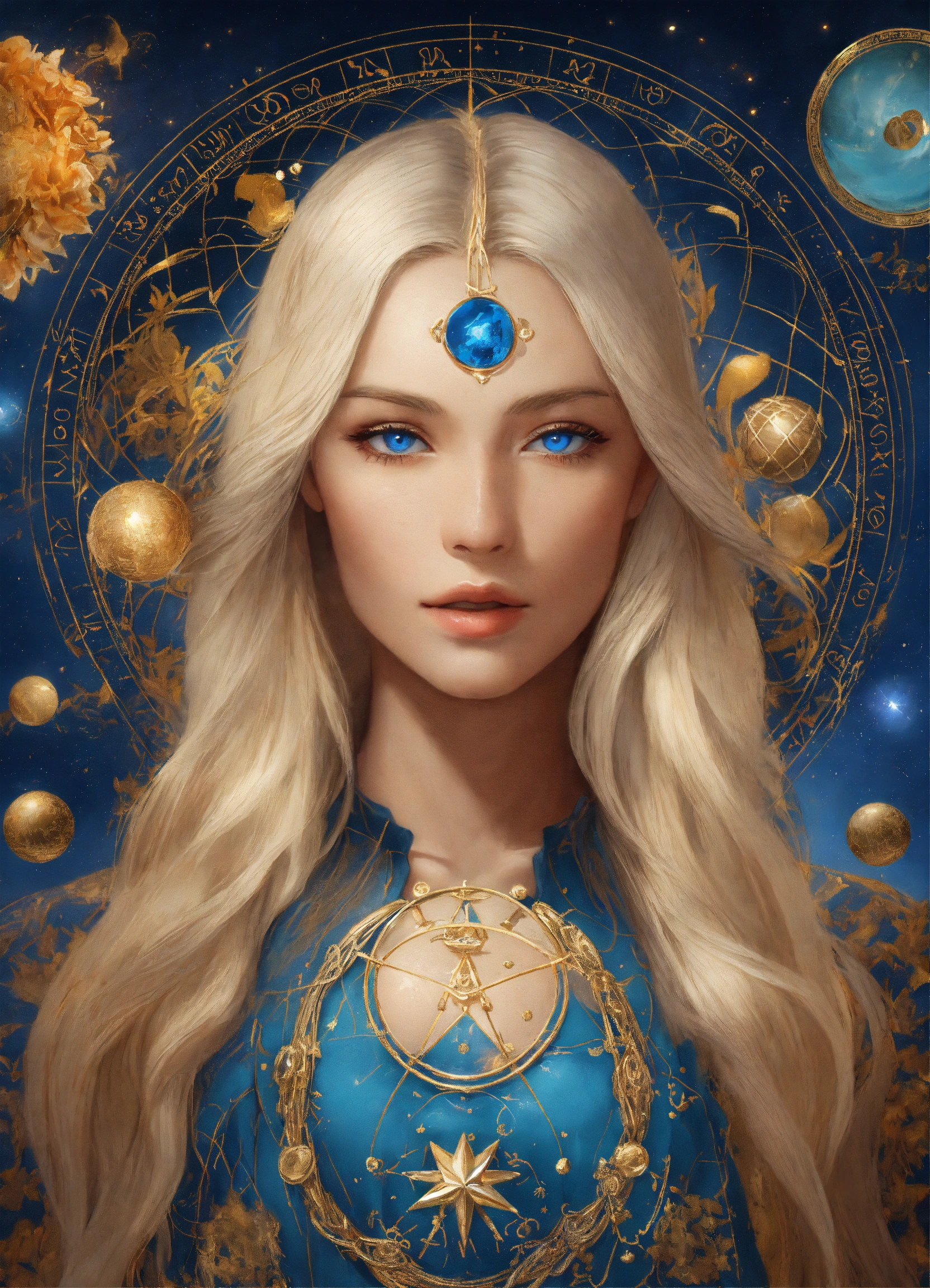 Astrology sorceress, ♑️ zodiac symbols, blond hair, expecting a baby, blue eyes, prominent cheekbones, surrealistic style, 30 year old