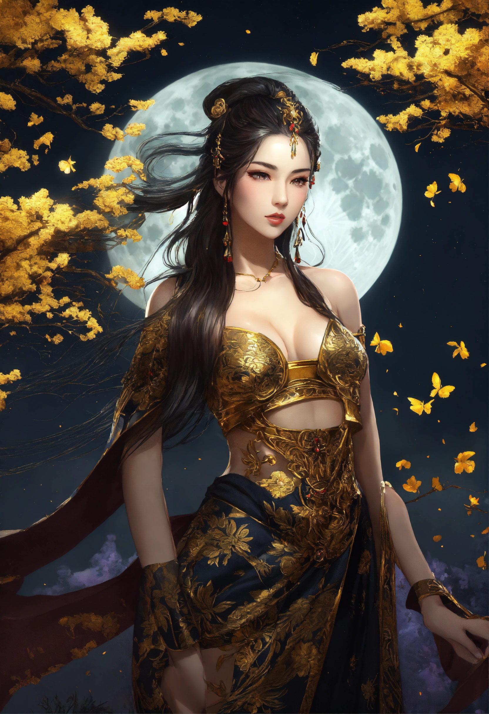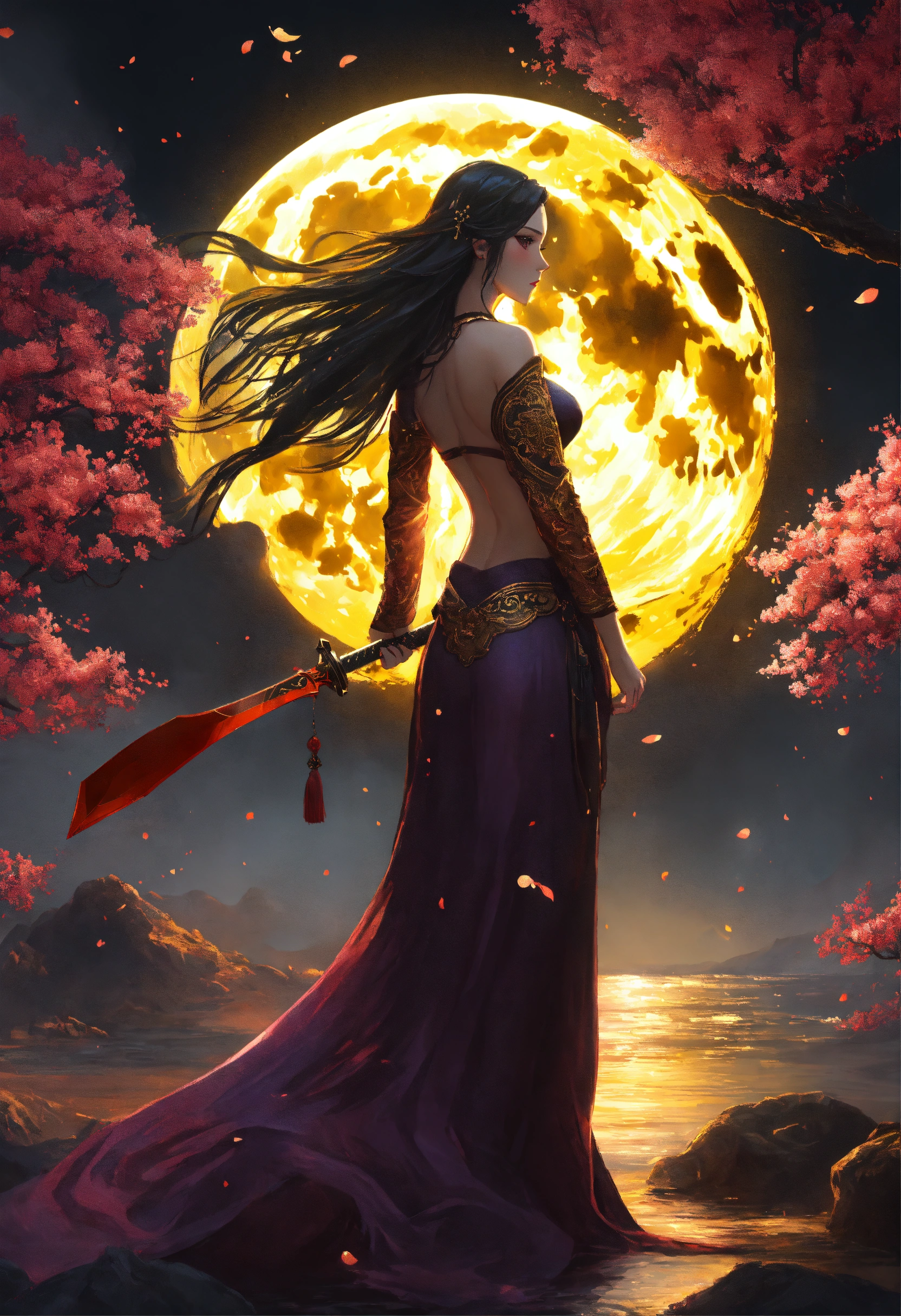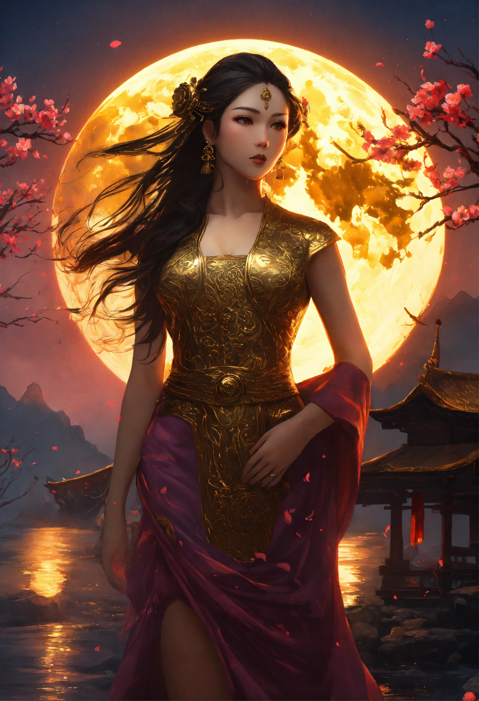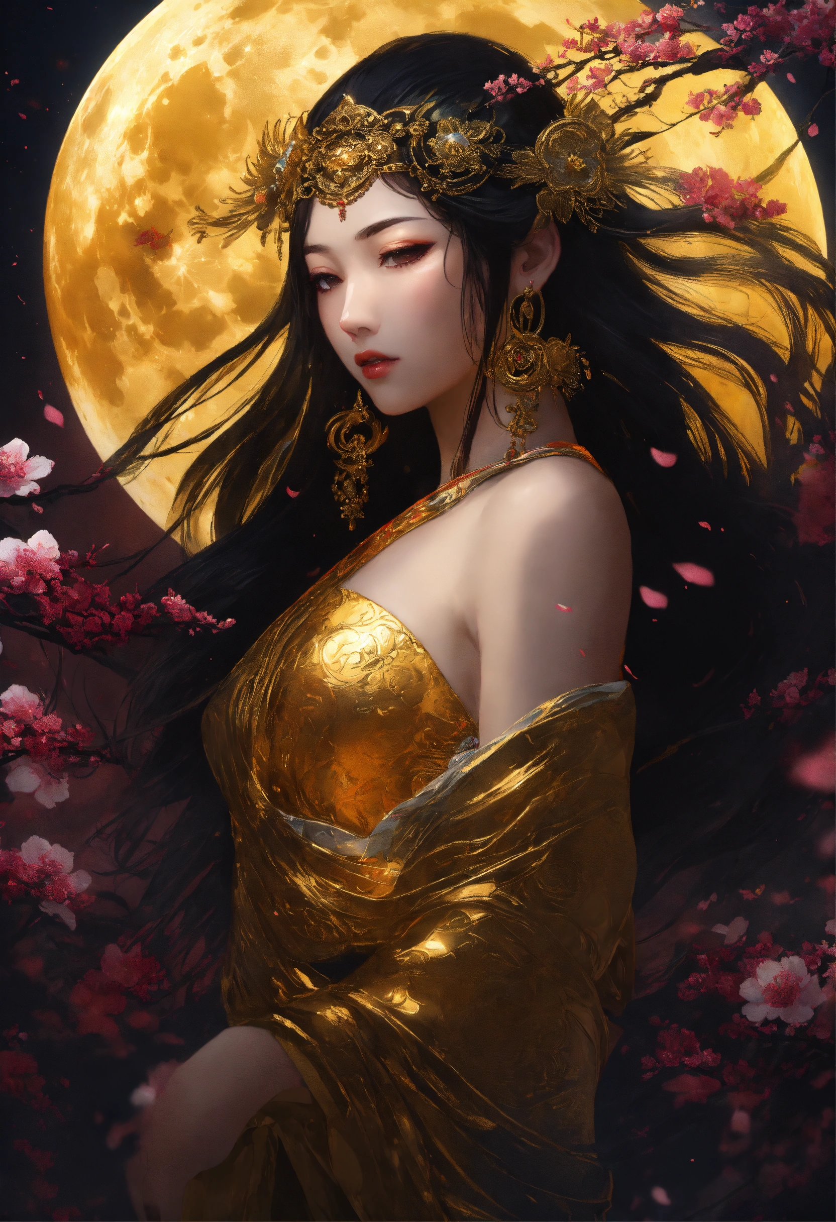 Black and gold ink, a background of a big full moon. 음성듣기번역하기언어전환영어 a background of a big full moon. the back of a mysterious asian goddess in a gold-decorated black full-length dress and an ancient asian male general standing next to her with a sword. a goddess with her long hair down her long hair. no low-cut dress. plum blossom night. m.c.p.a. ink art, fantasy landscape, ultra-precise eyes, line art, black background, ultra-precise art, detail flamboyant face, natural skin, water splash, color splash art, black ink, liquid melting, dreamy, shining, glamour, shadow, oil on canvas, brush strokes, smooth, ultra high definition, 8k, unreal engine 5, ultra sharp focus, complex artwork masterpiece, ominous, golden ratio, very detailed, vibrant, production cinematic character lender, ultra high definition model