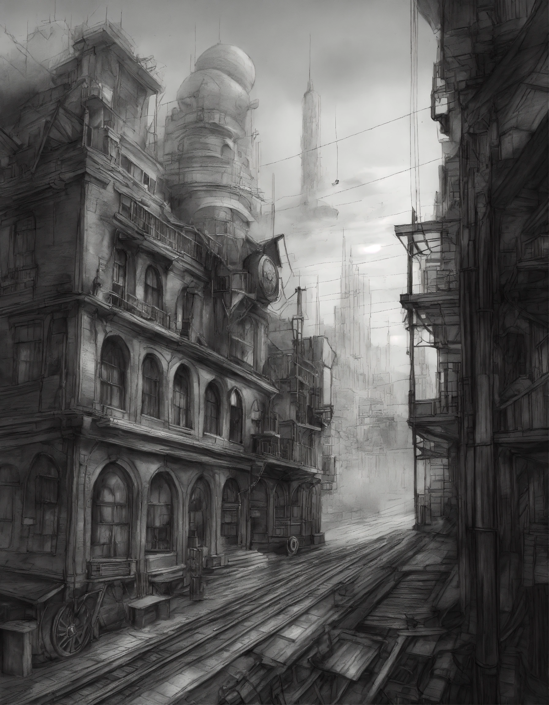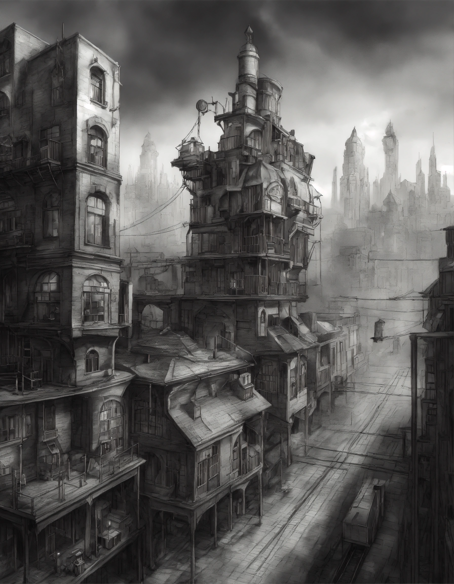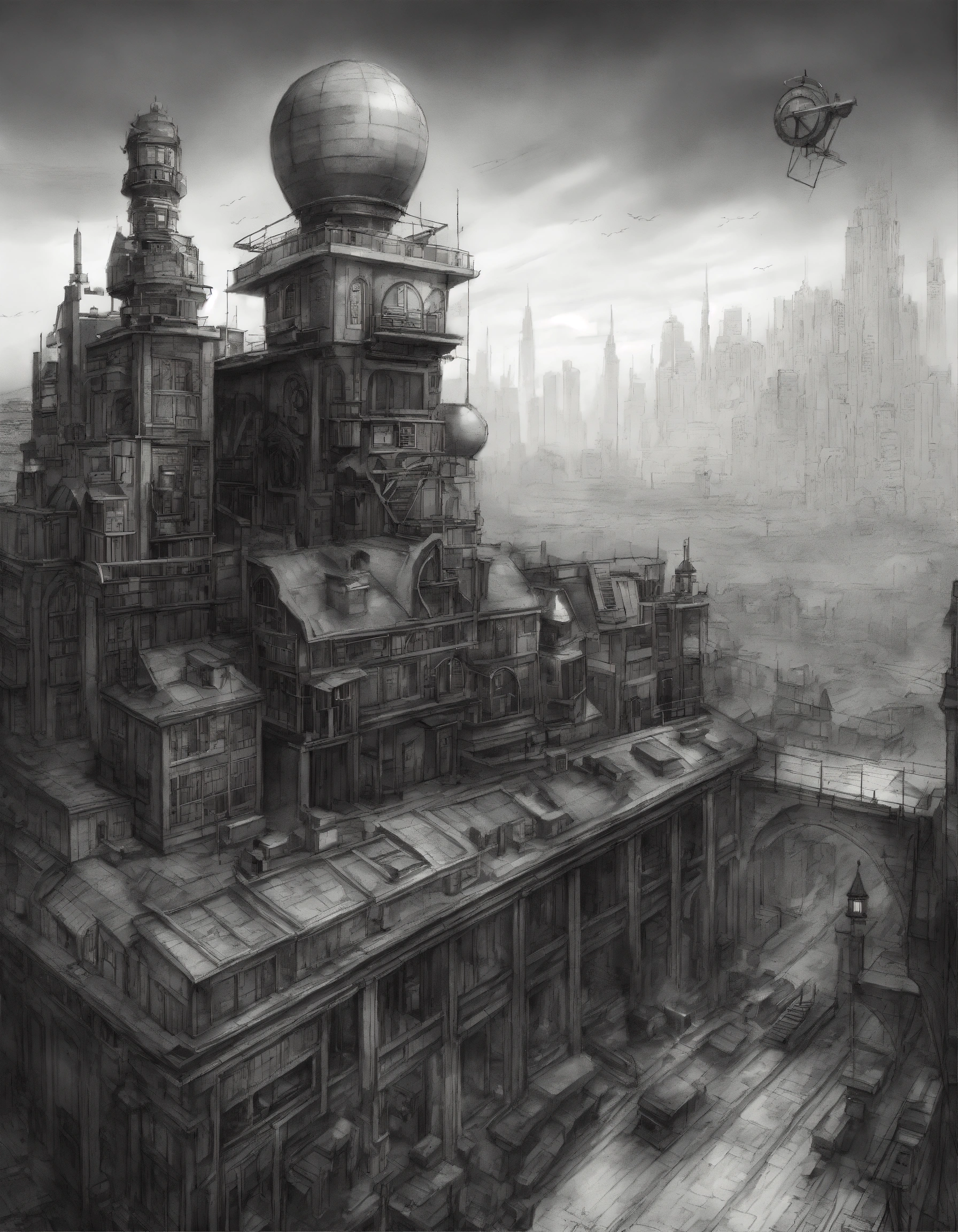 A pencil sketch depicting an haunting view of a fractured steampunk cityscape. realistic. high detailed, 4k greyscale