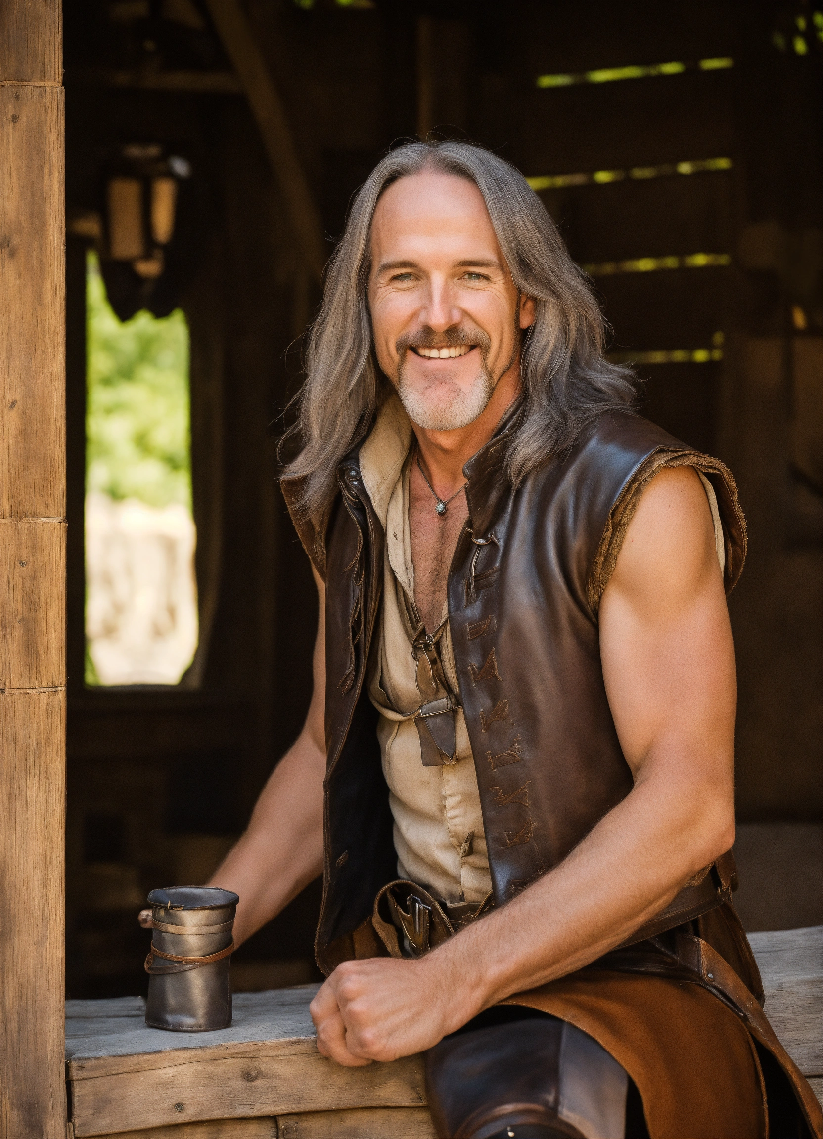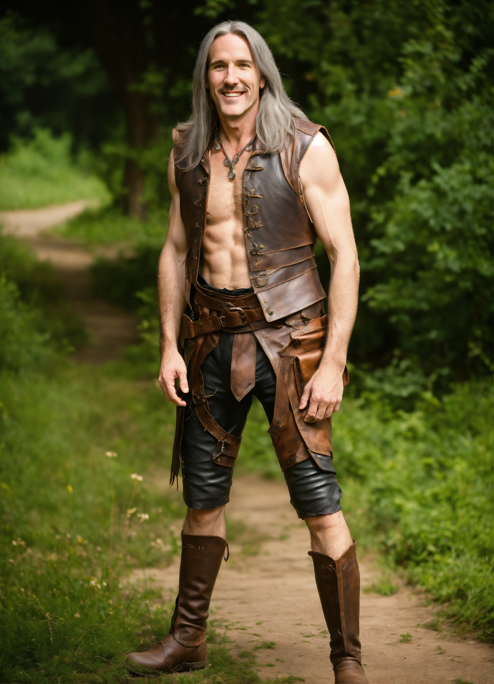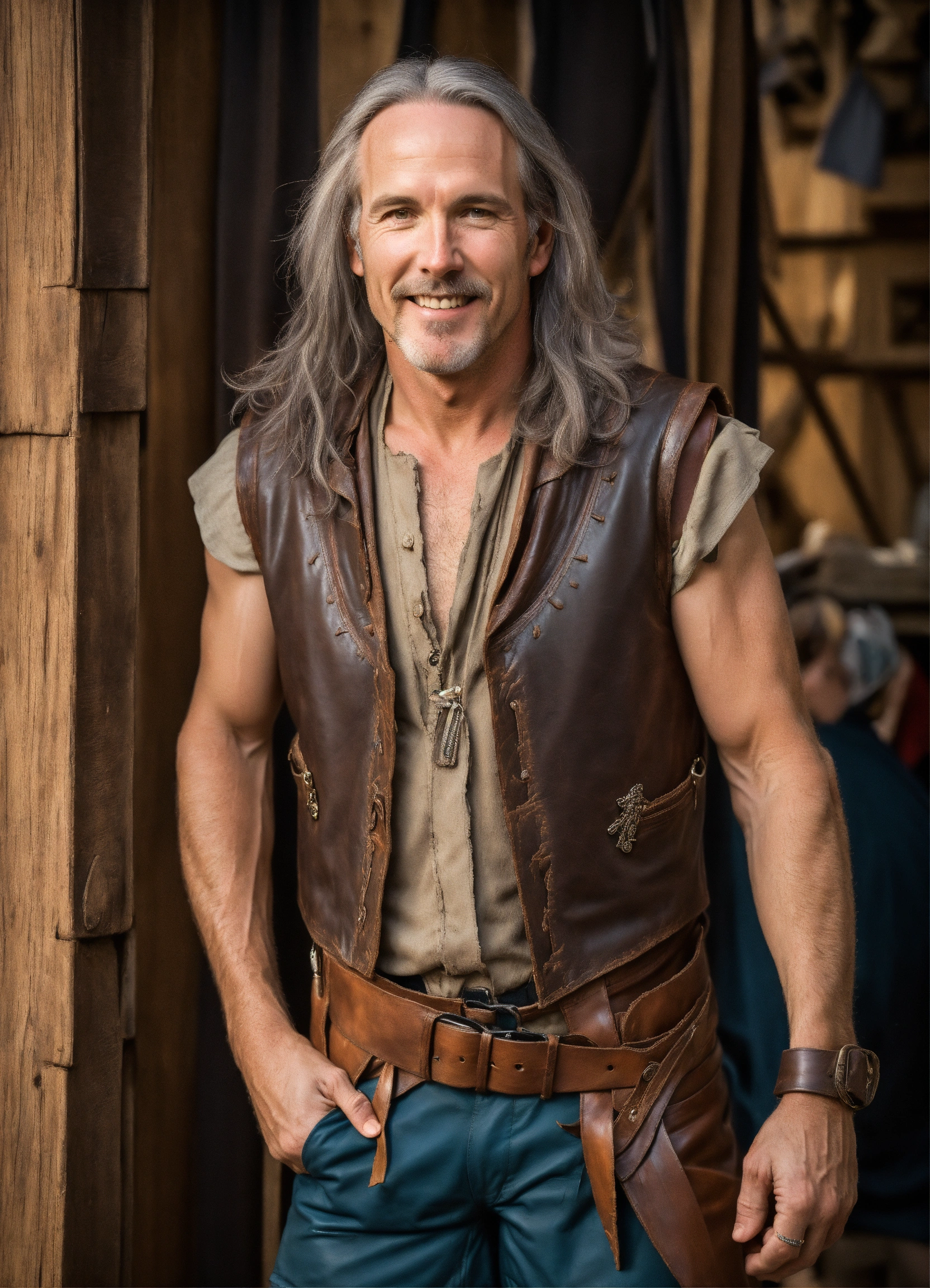 In photographic style matt mercer at 55 years old in the renaissance fair as a tall long distance runner with long straight gray hair wearing sleeveless leather vest leather shorts giving a romantic smile at the mirror, torn shirt