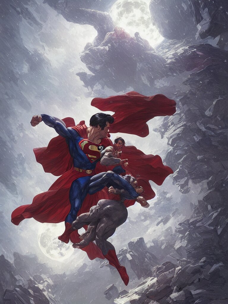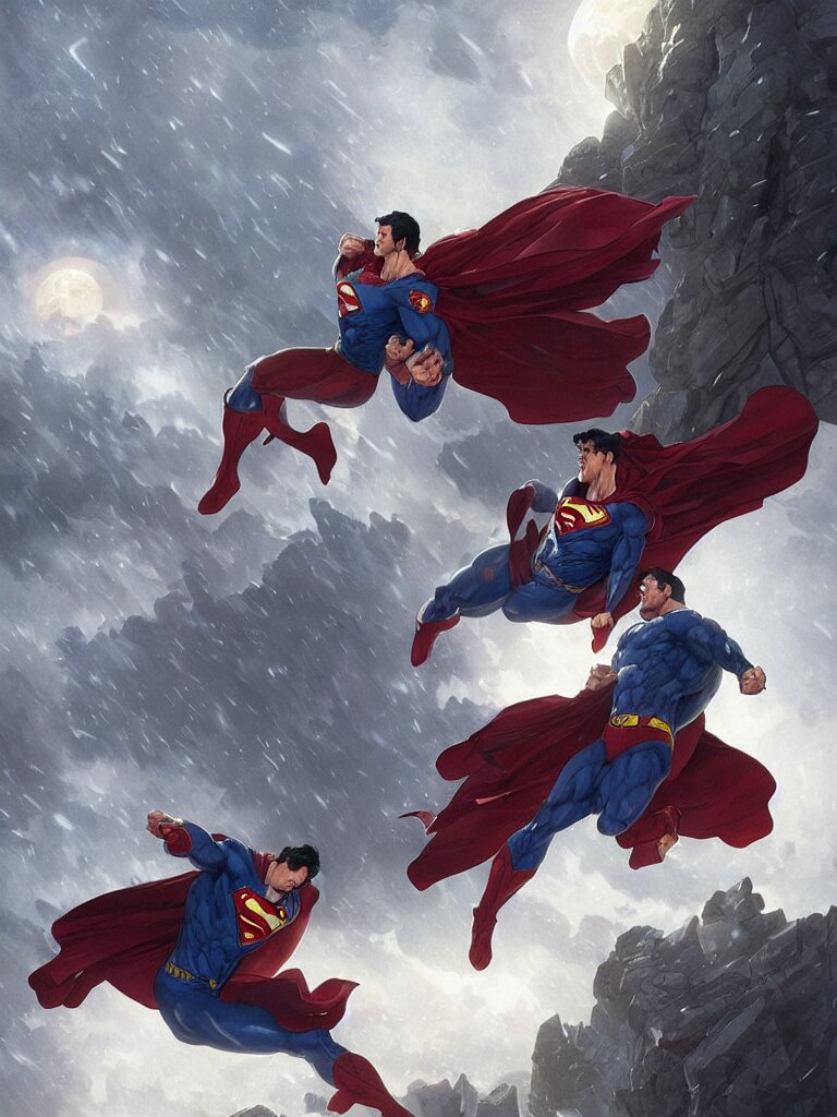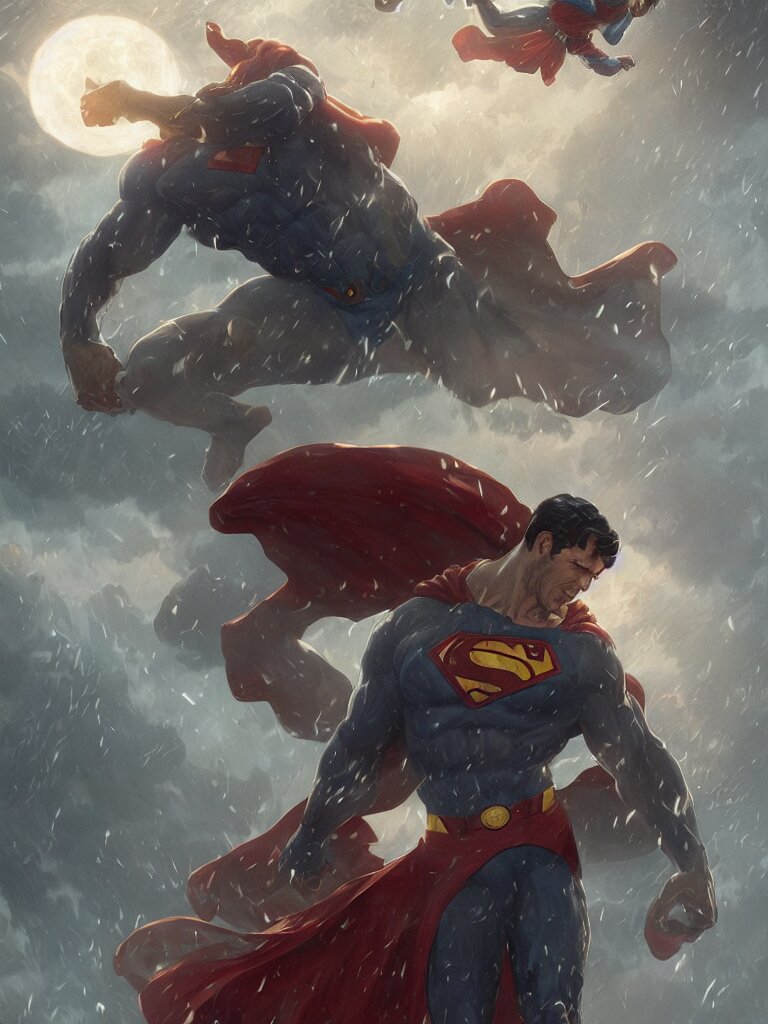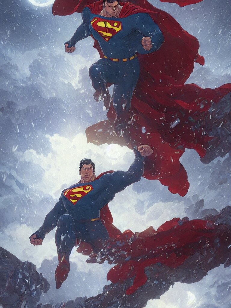 Giant superman attacking during a blizzard, highly detailed, digital illustration, artstation, concept art, matte, sharp focus, illustration, dramatic, full moon, art by artgerm and greg rutkowski and alphonse mucha