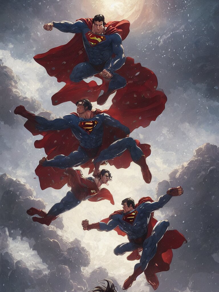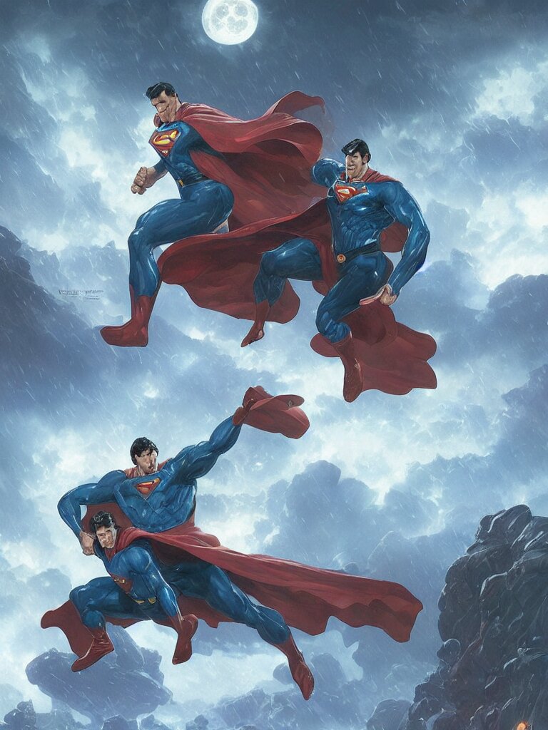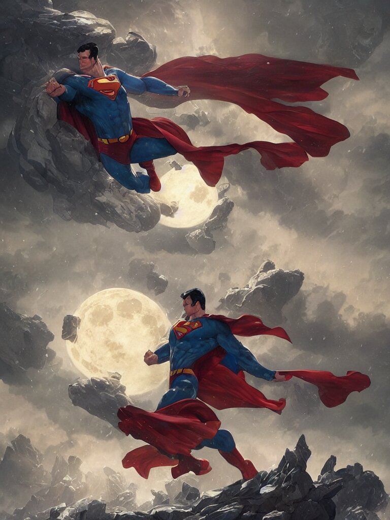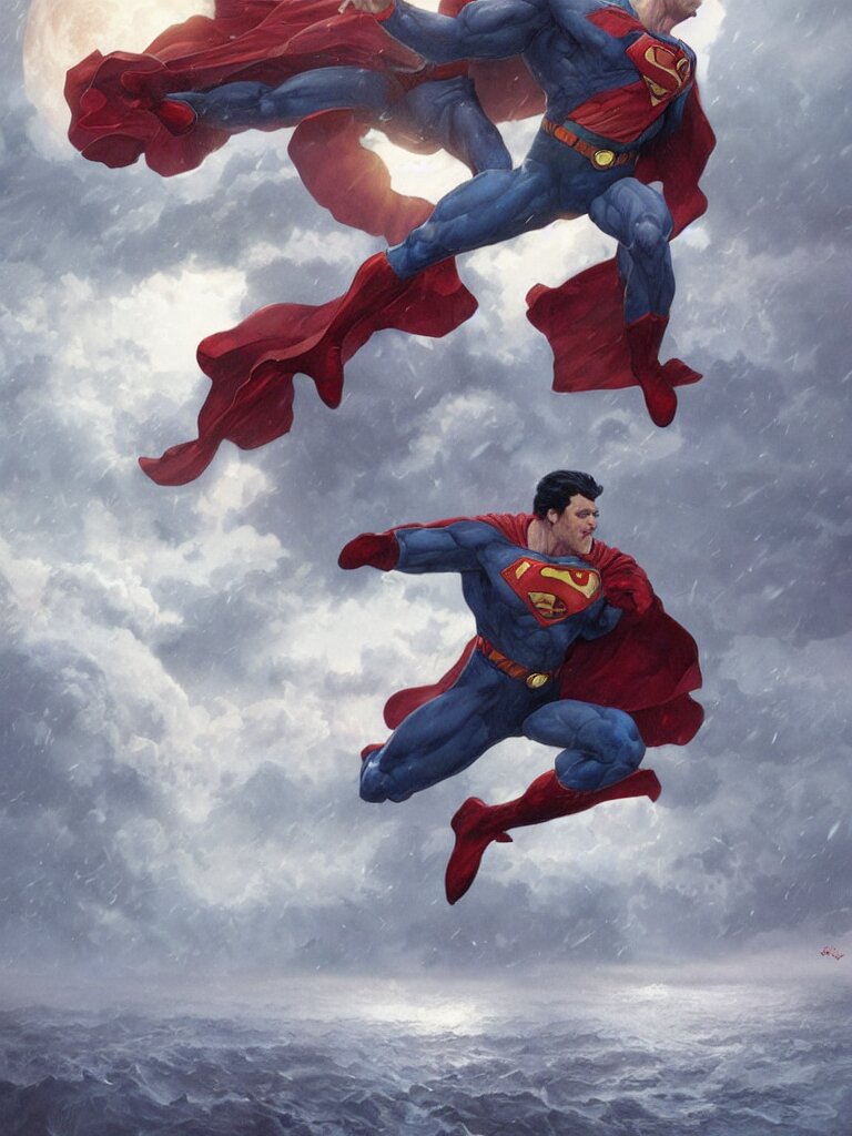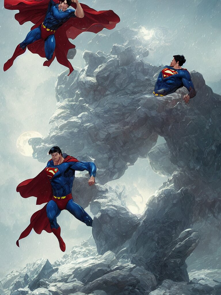 Giant superman attacking during a blizzard, highly detailed, digital illustration, artstation, concept art, matte, sharp focus, illustration, dramatic, full moon, art by artgerm and greg rutkowski and alphonse mucha