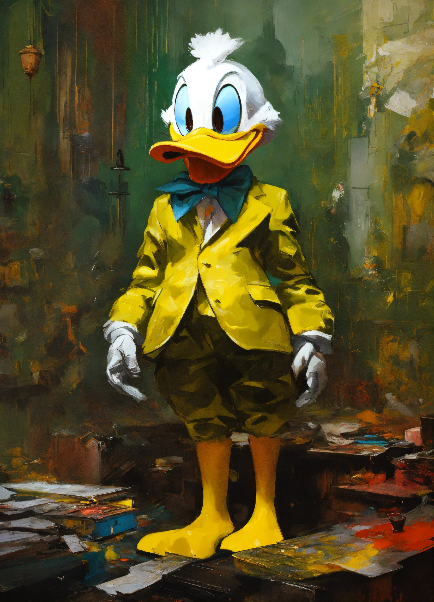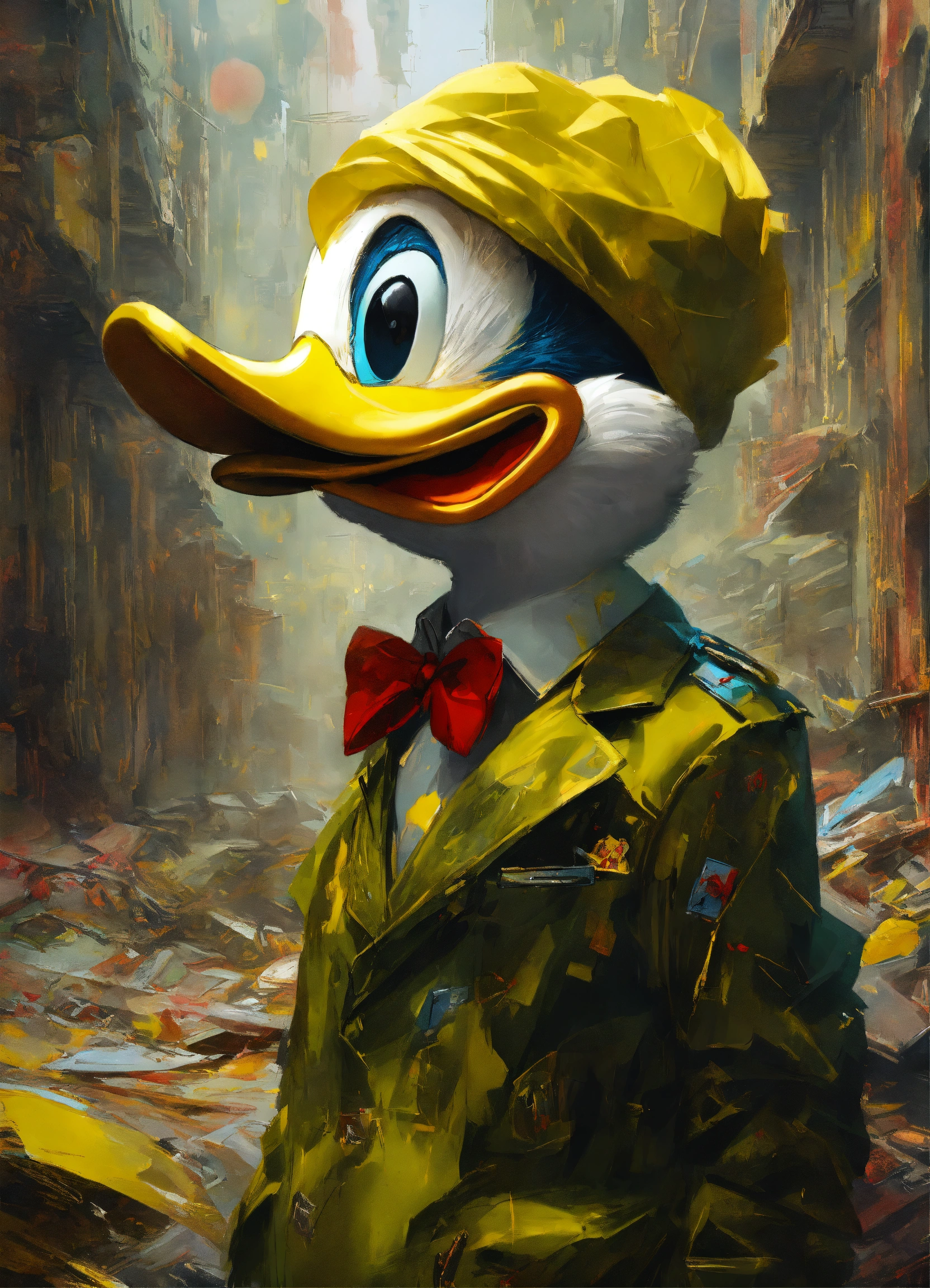Donald duck, unreal engine 7, darkfantasy, mystical colored olive green yellow silver shiny, digital painting, highly detailed, concept art, artstation, intricate, sharp focus, concept art high detailed beksinski painting, part by adrian ghenie and gerhard richter, masterpiece