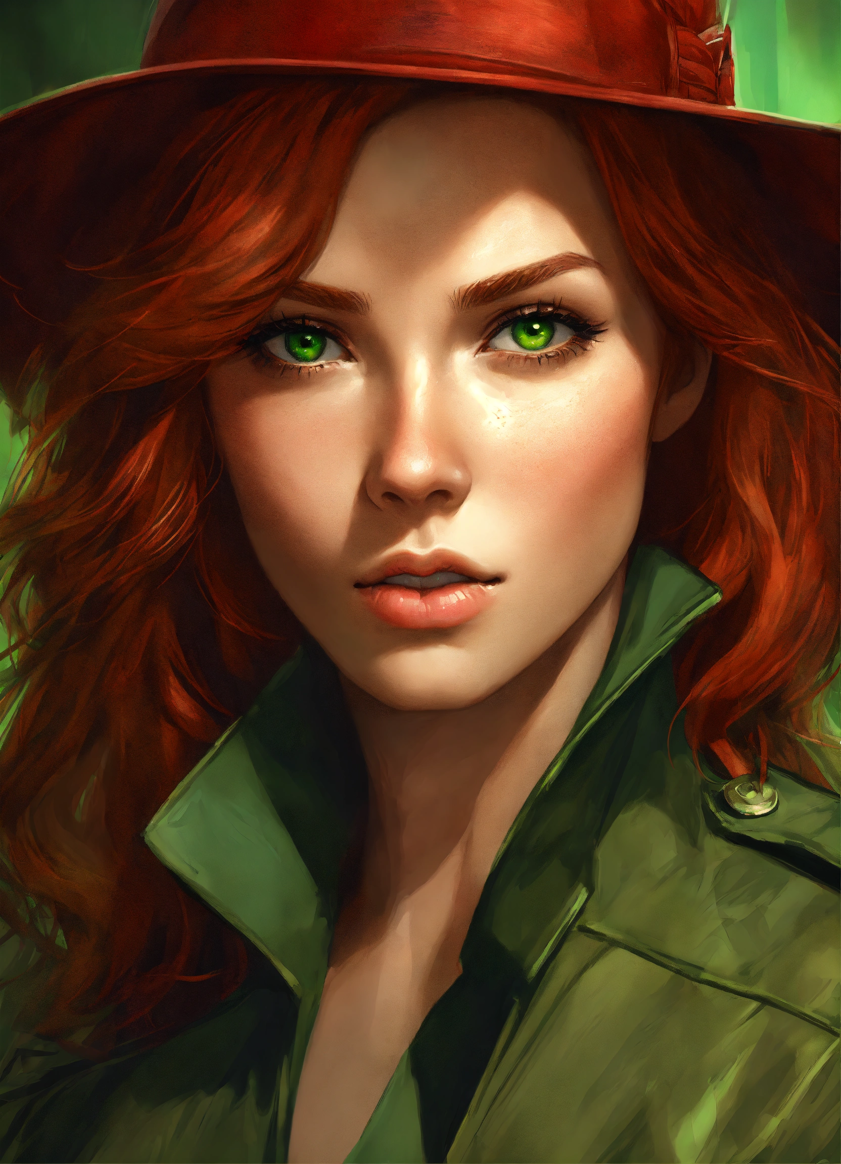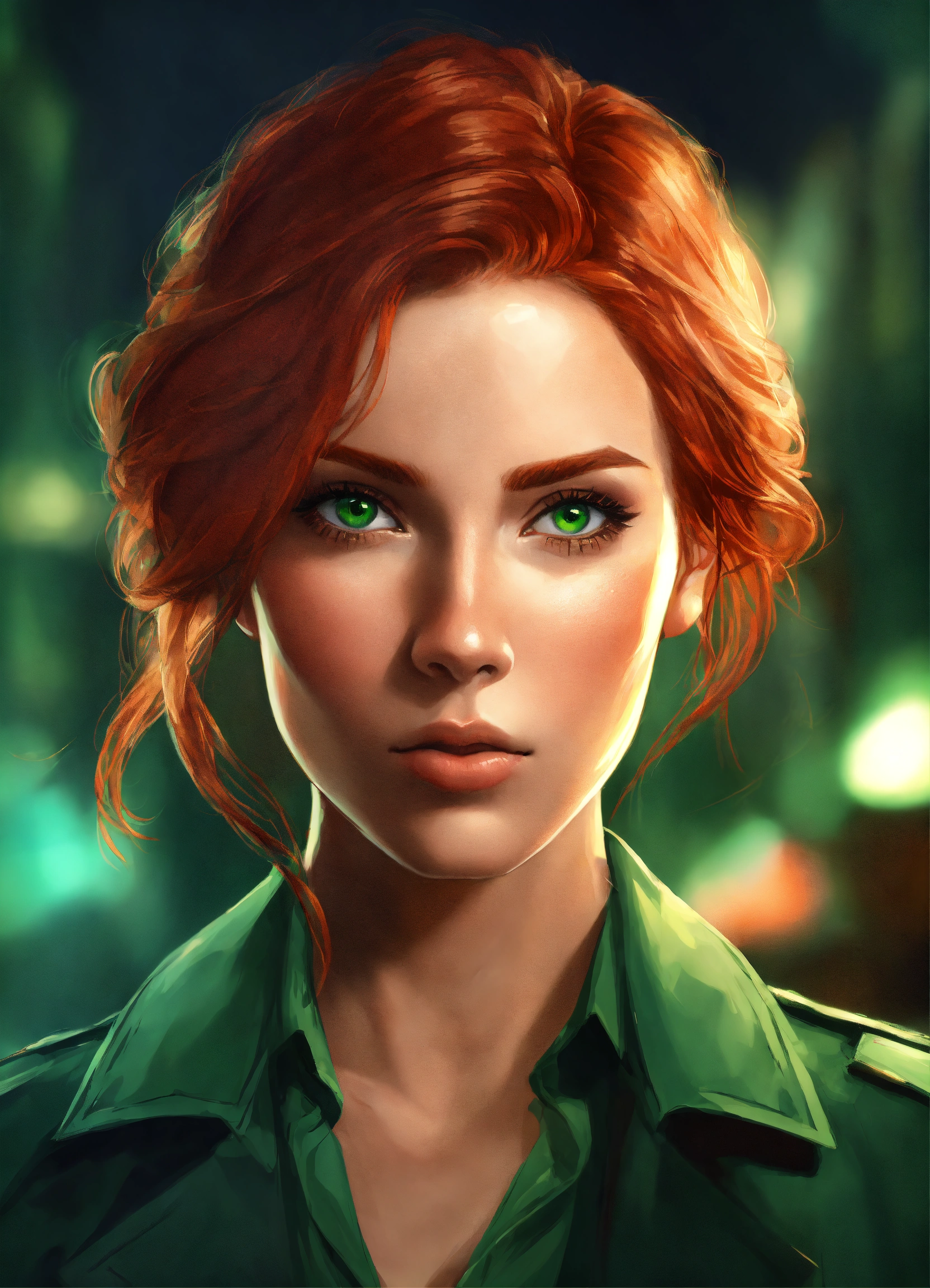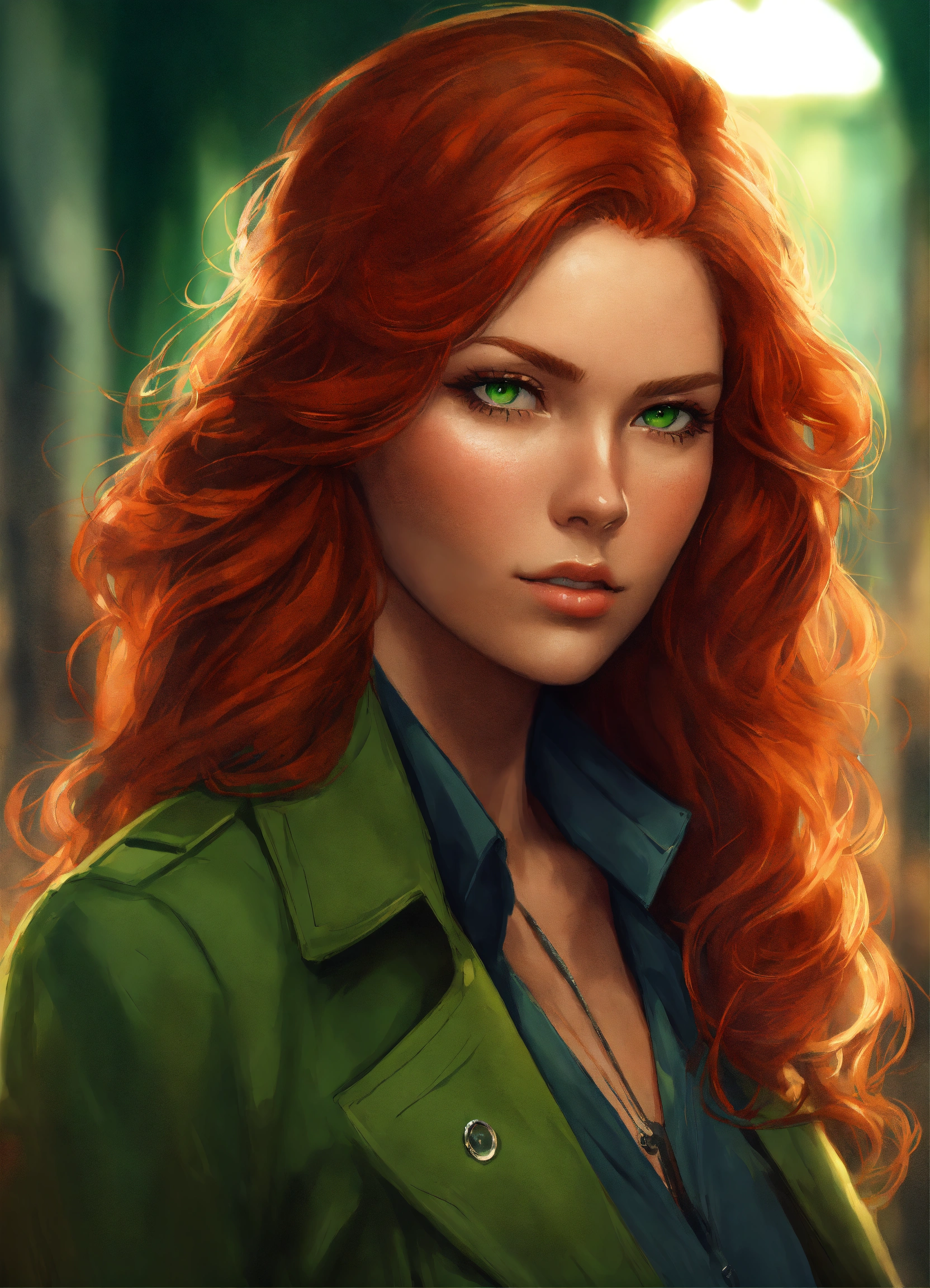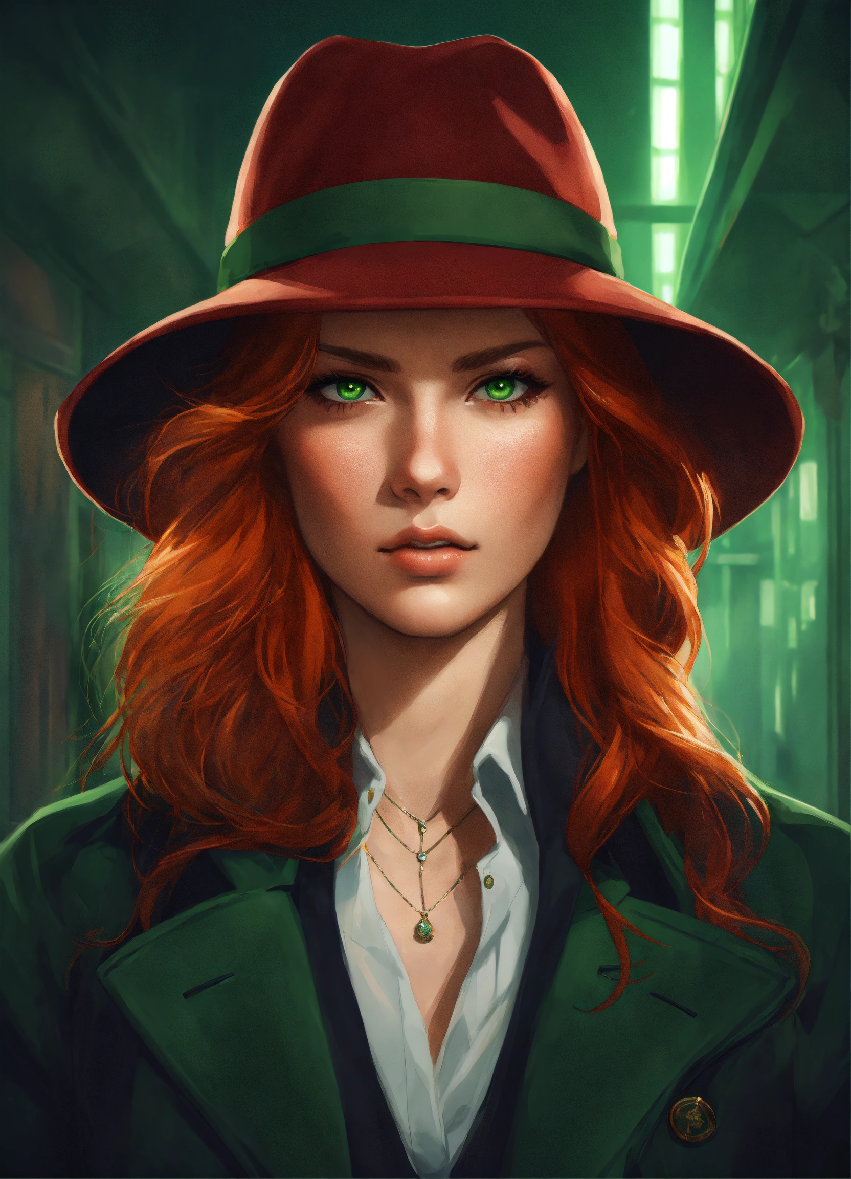 Portrait of a beautiful red haired detective, concept art, symmetrical face, attractive, green eyes, digital art, exquisite detail, female