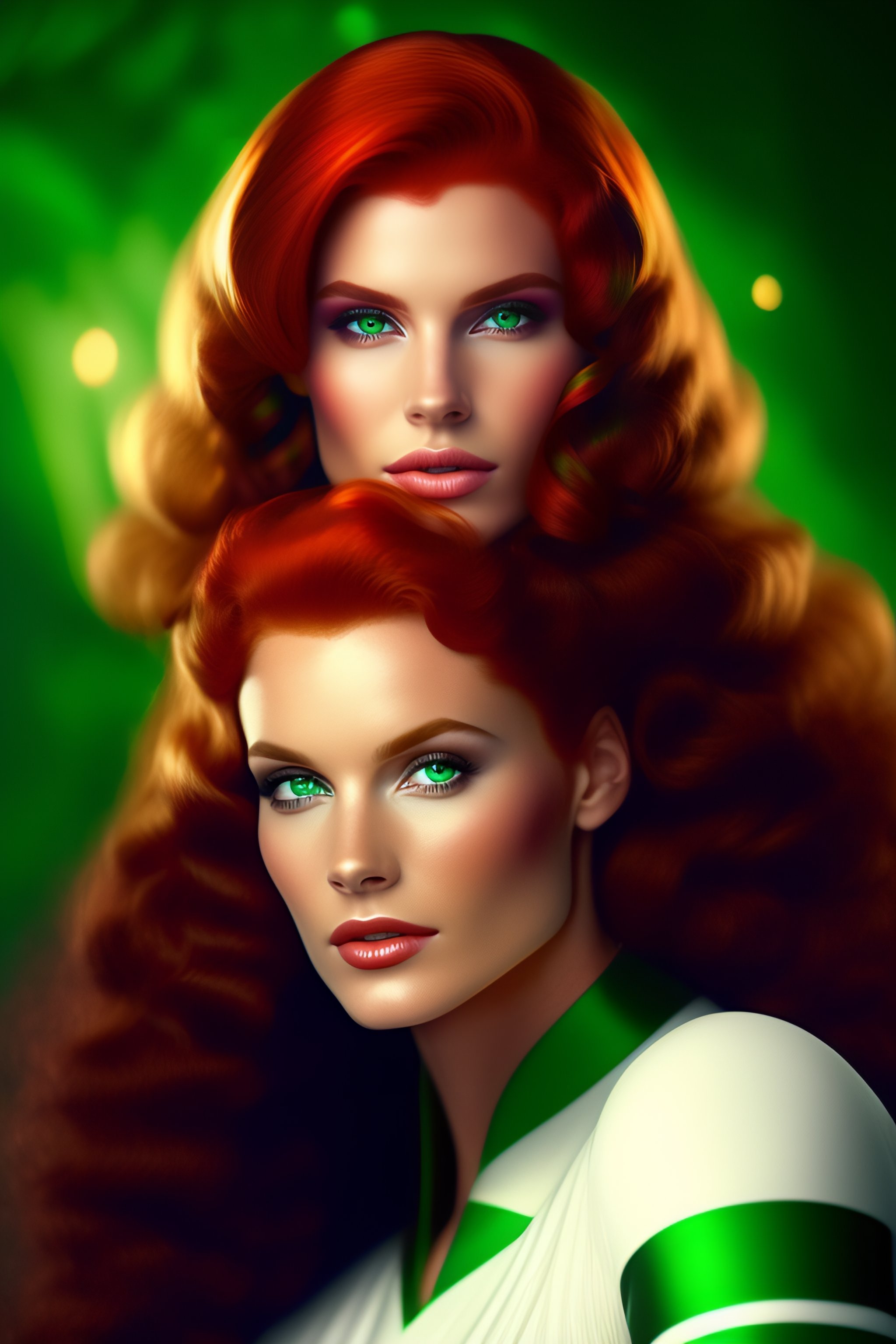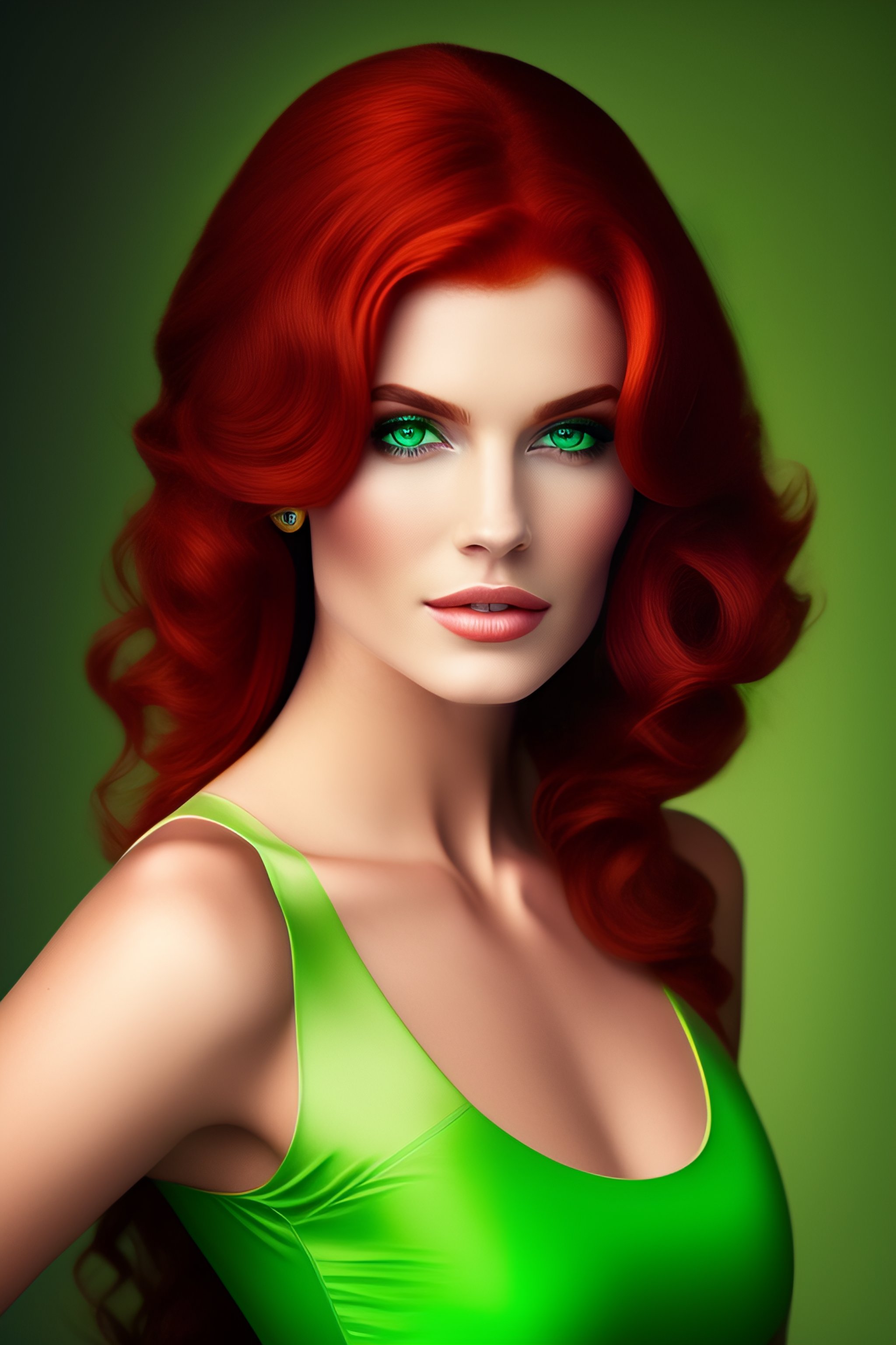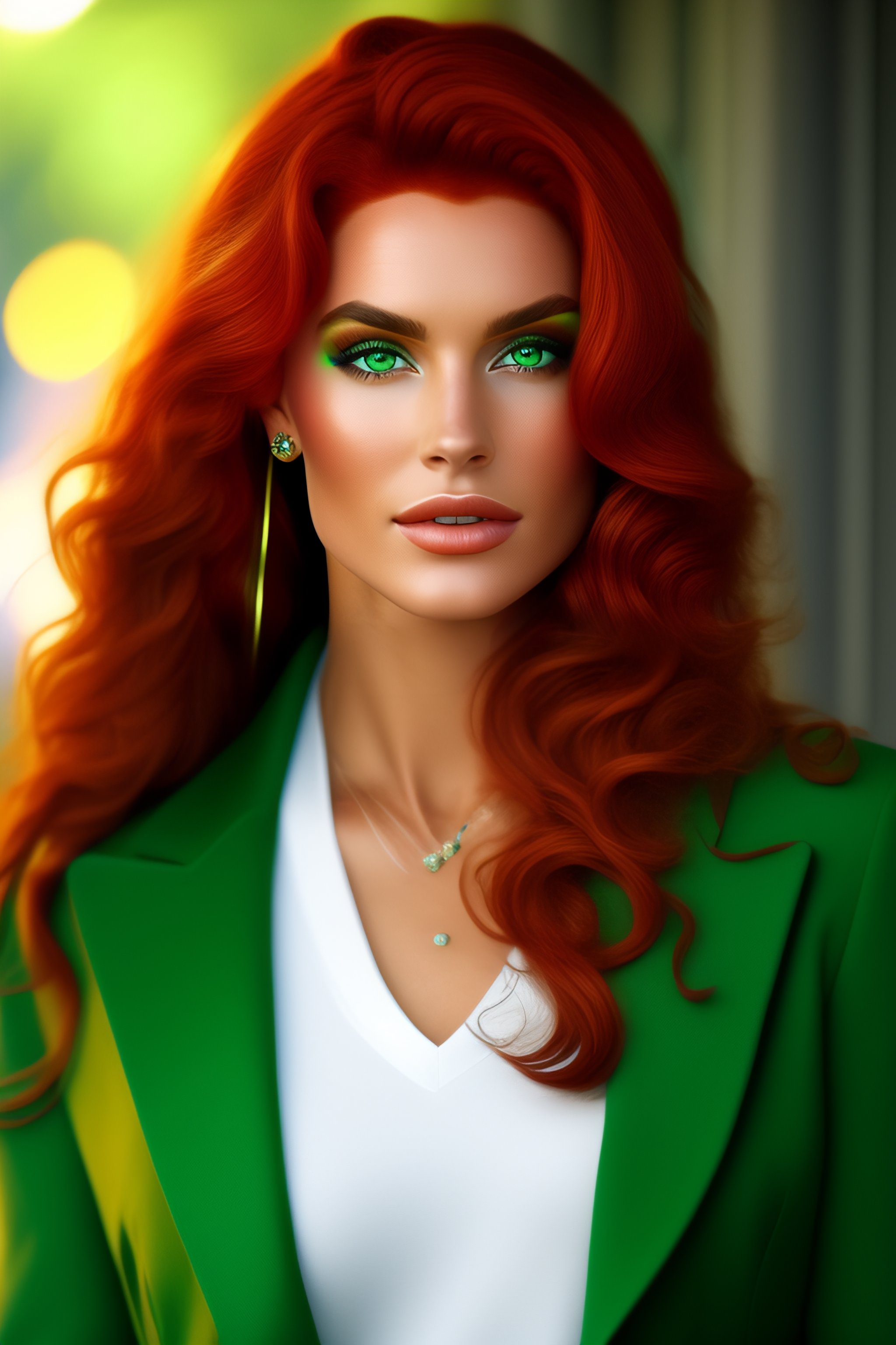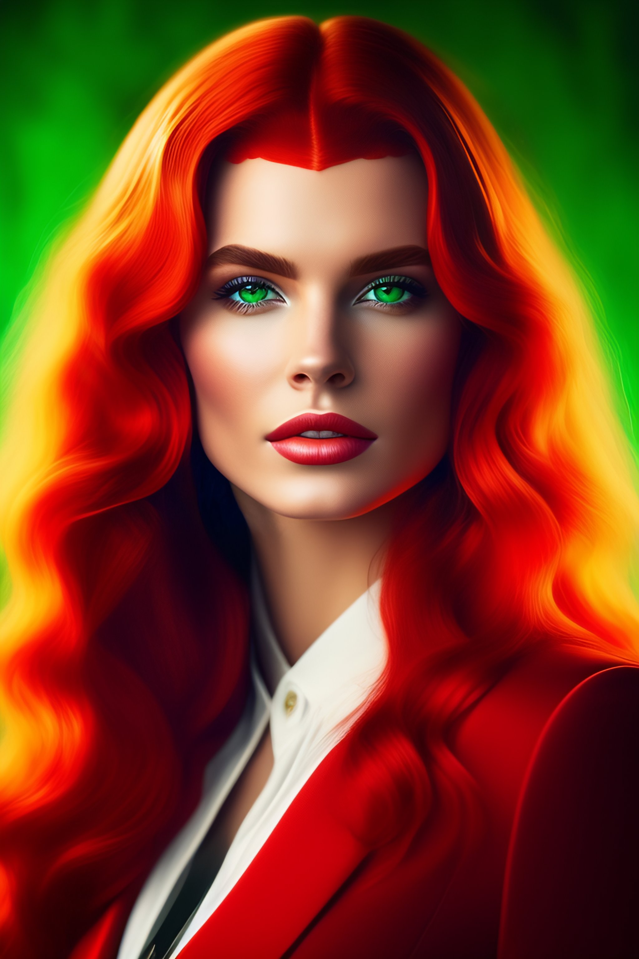 Green eyes slightly reddish hair white streaks in the hair red clothes with light green bands