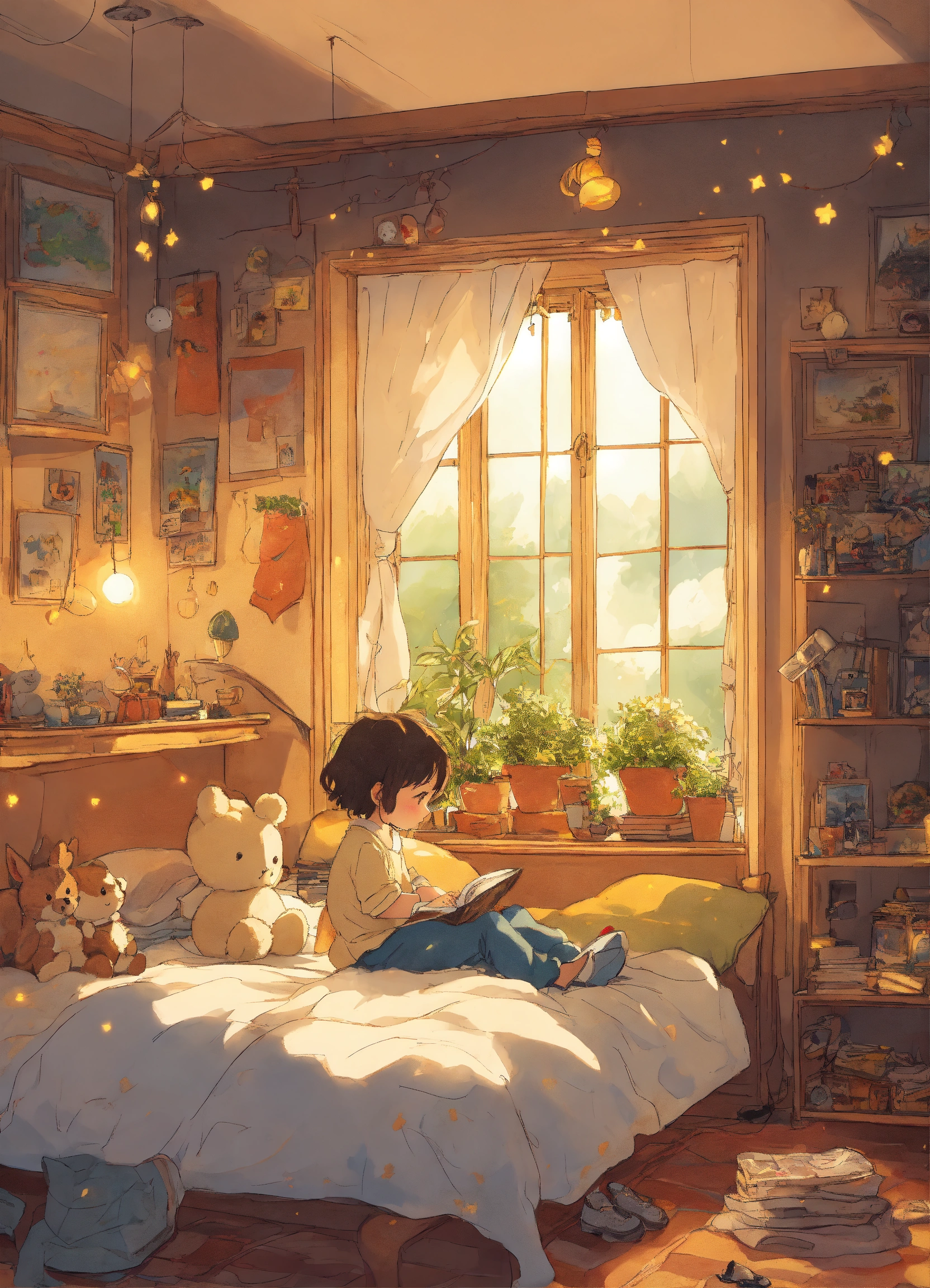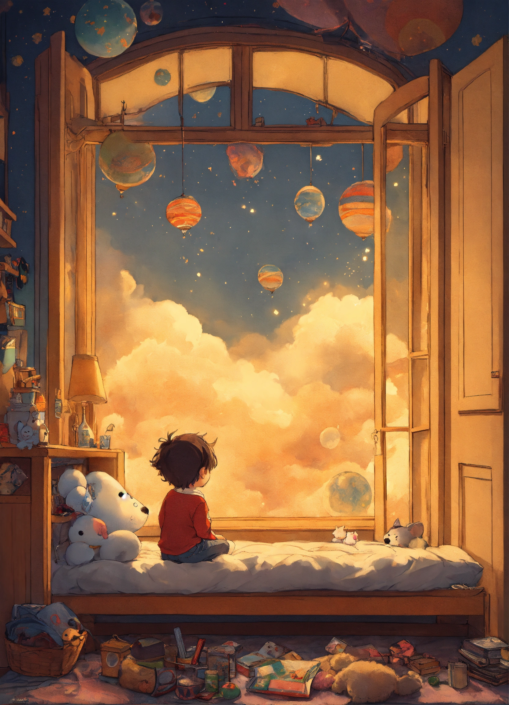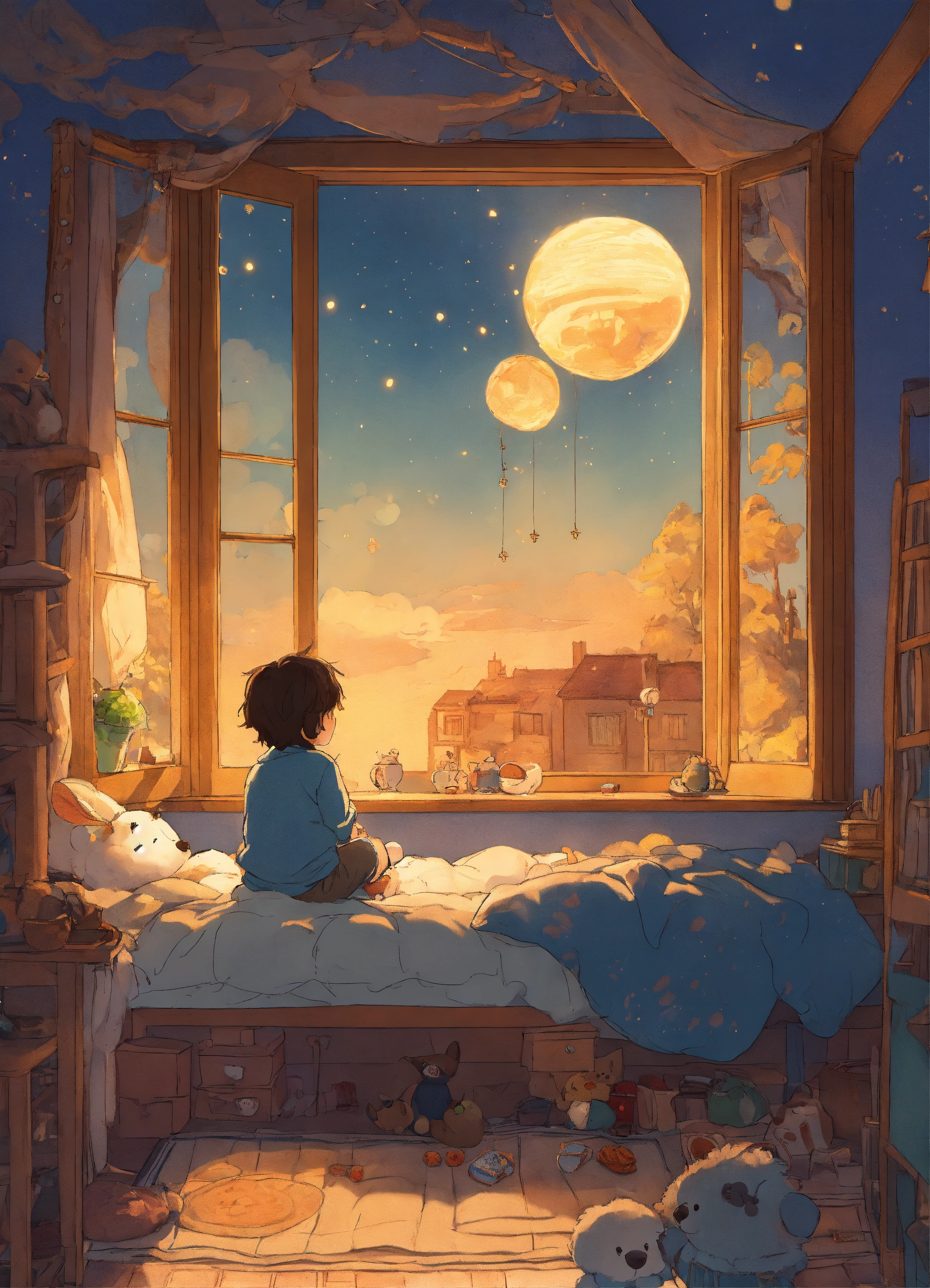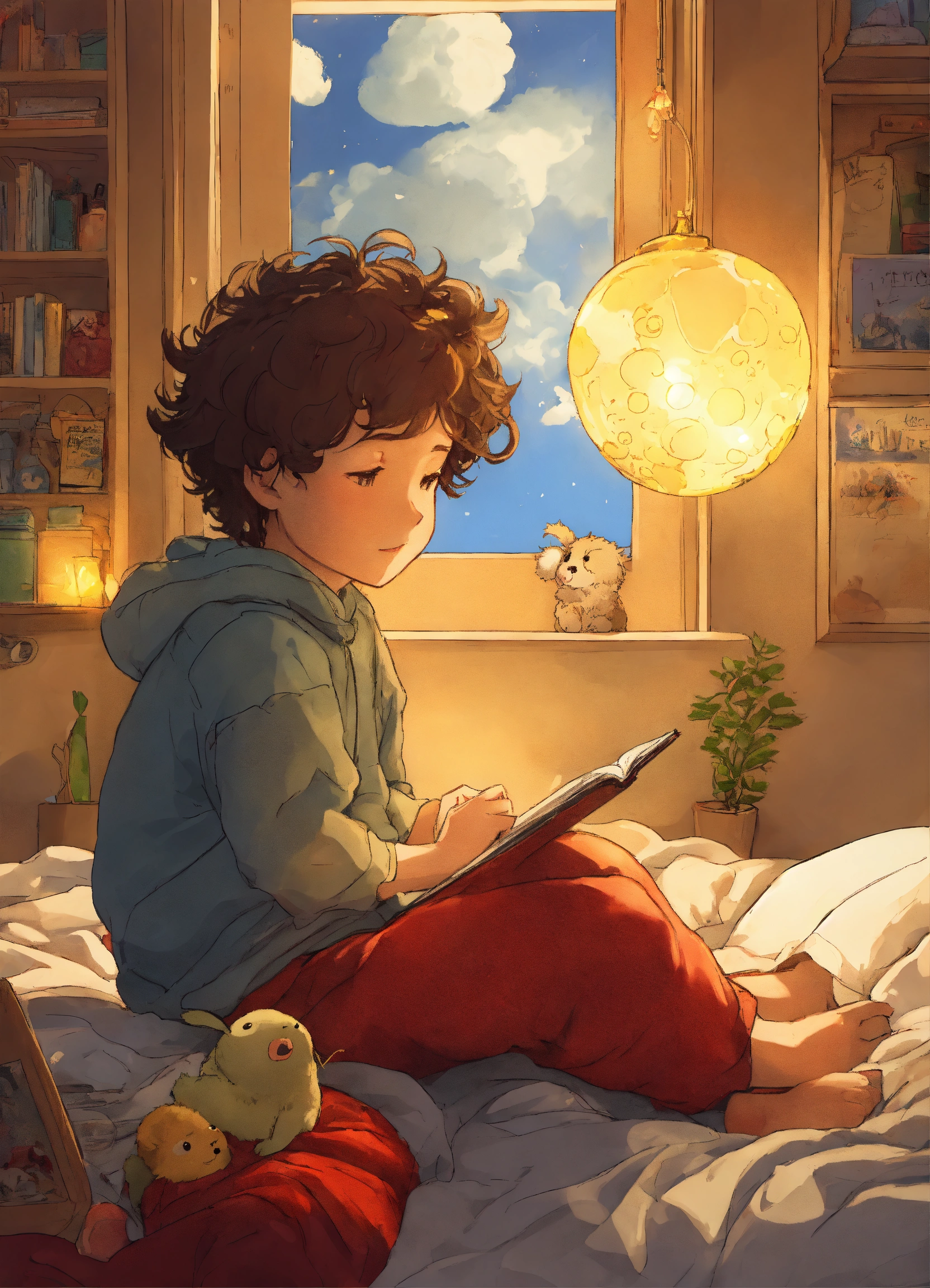Dessine comme une bd japonnaise type studio ghibli un petit garcon de 4 ans metisse cheveux bouclés assis sur son lit dans sa jolie chambre de petit garcon, entouré de ses jouets et peluches, une bulle de lumiere entoure son petit corps et est traversee par un rayon de luliere doree venant du ciel et s'enfoncant dans le sol