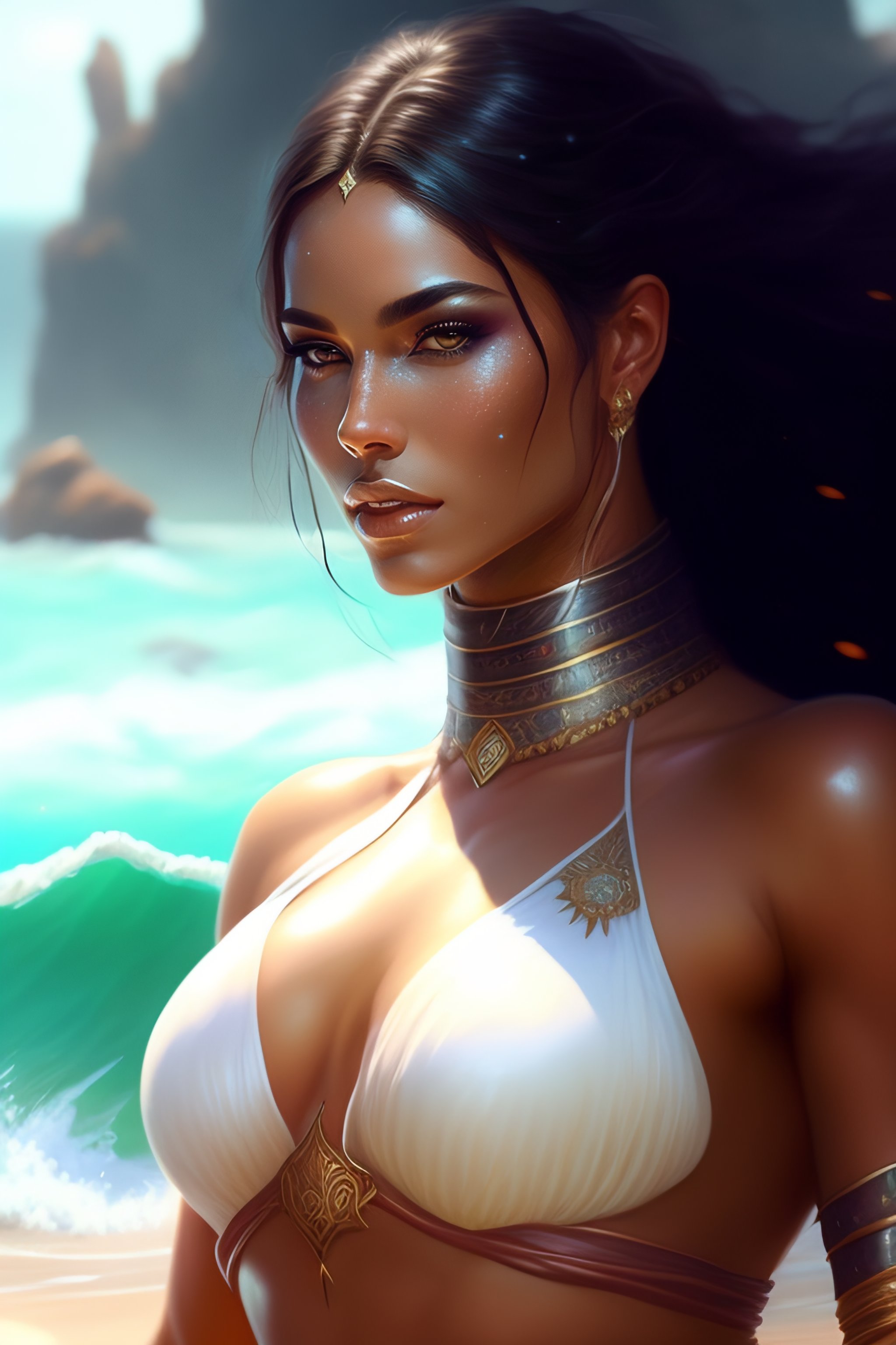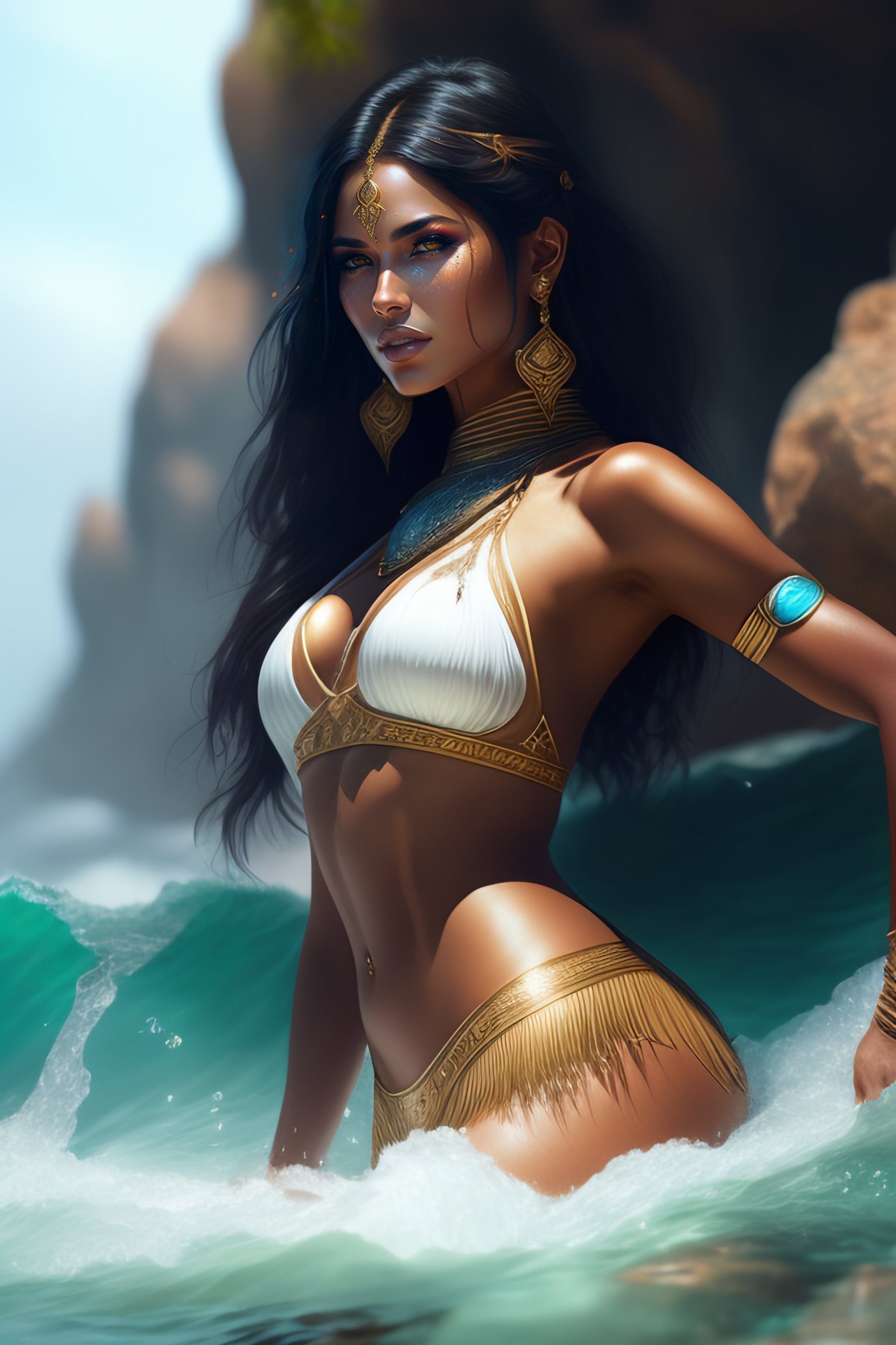 A beautiful woman warrior wearing a magical bikini posing on water up to her knees, beautiful face, white skin, highly detailed face, greg rutkowski, epic, fantasy, intricate, hyper detailed, concept art, smooth, sharp focus, big bazoongas