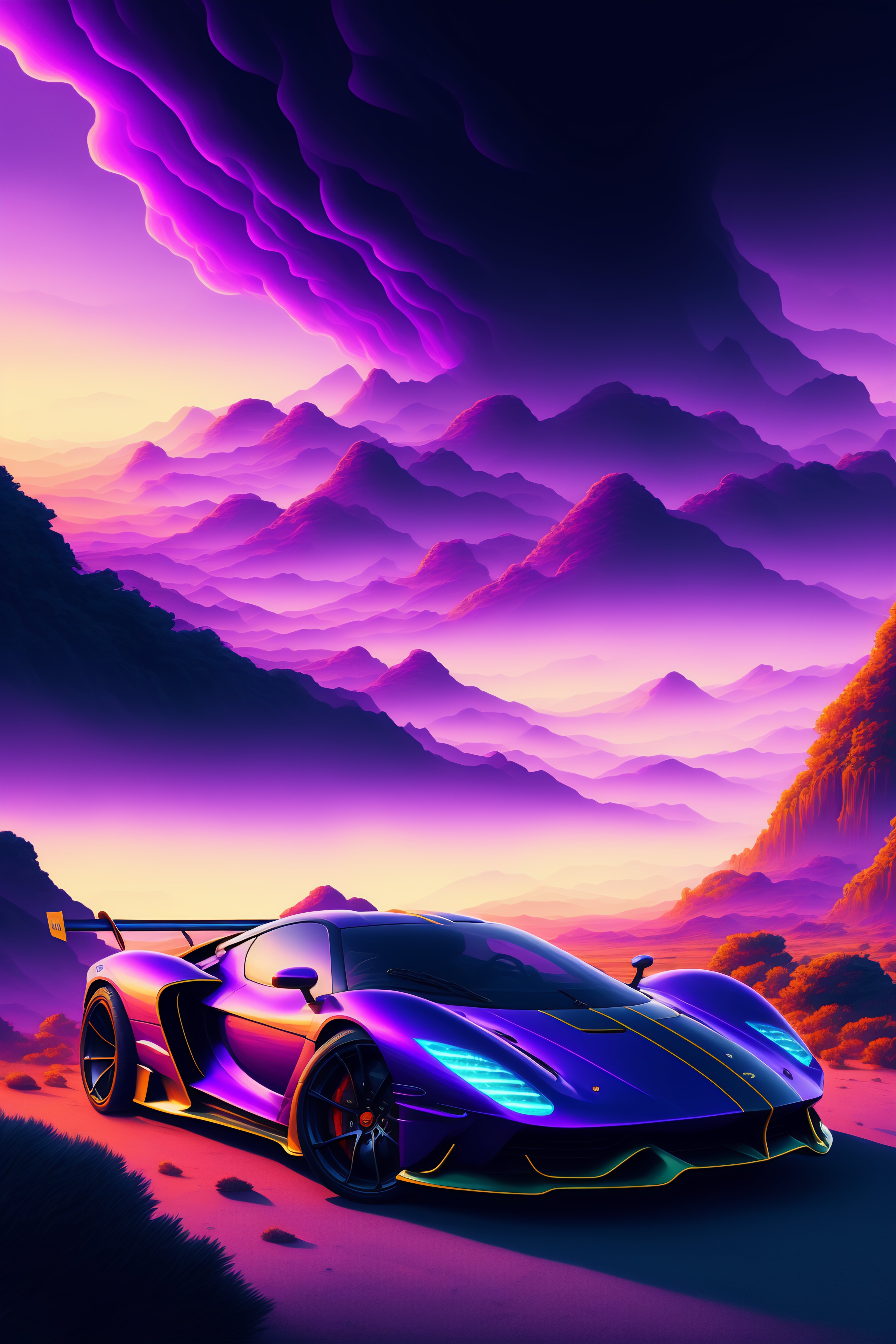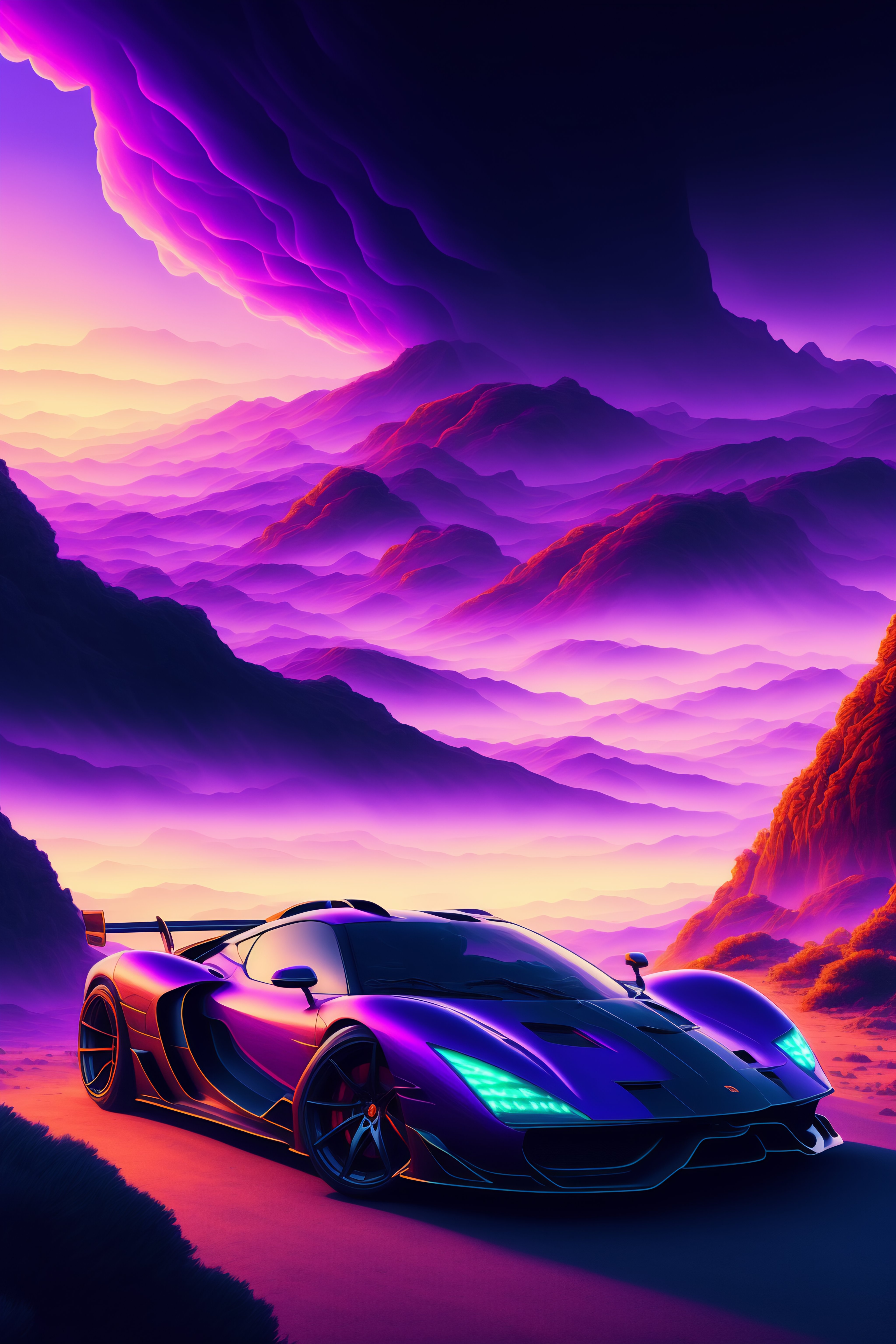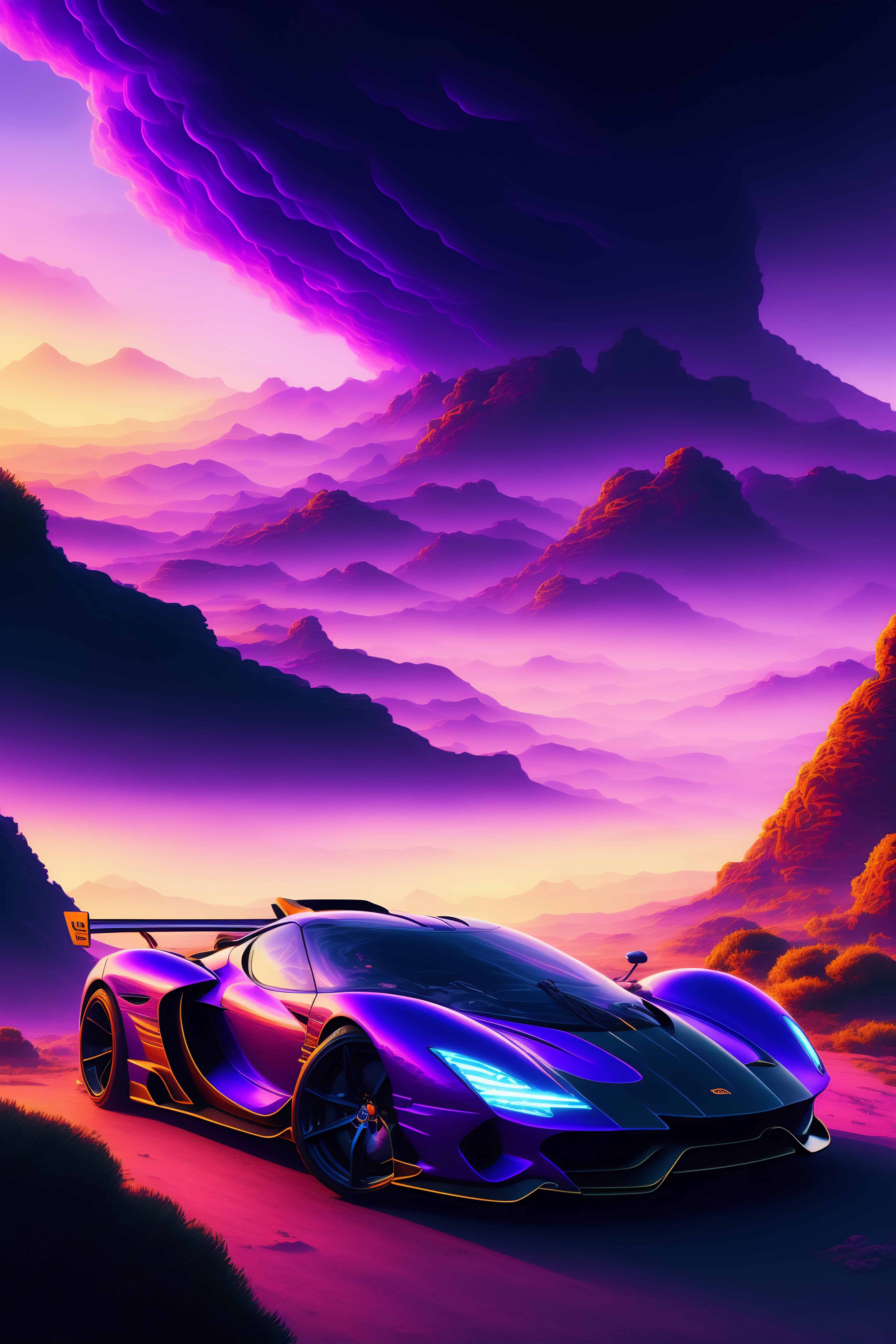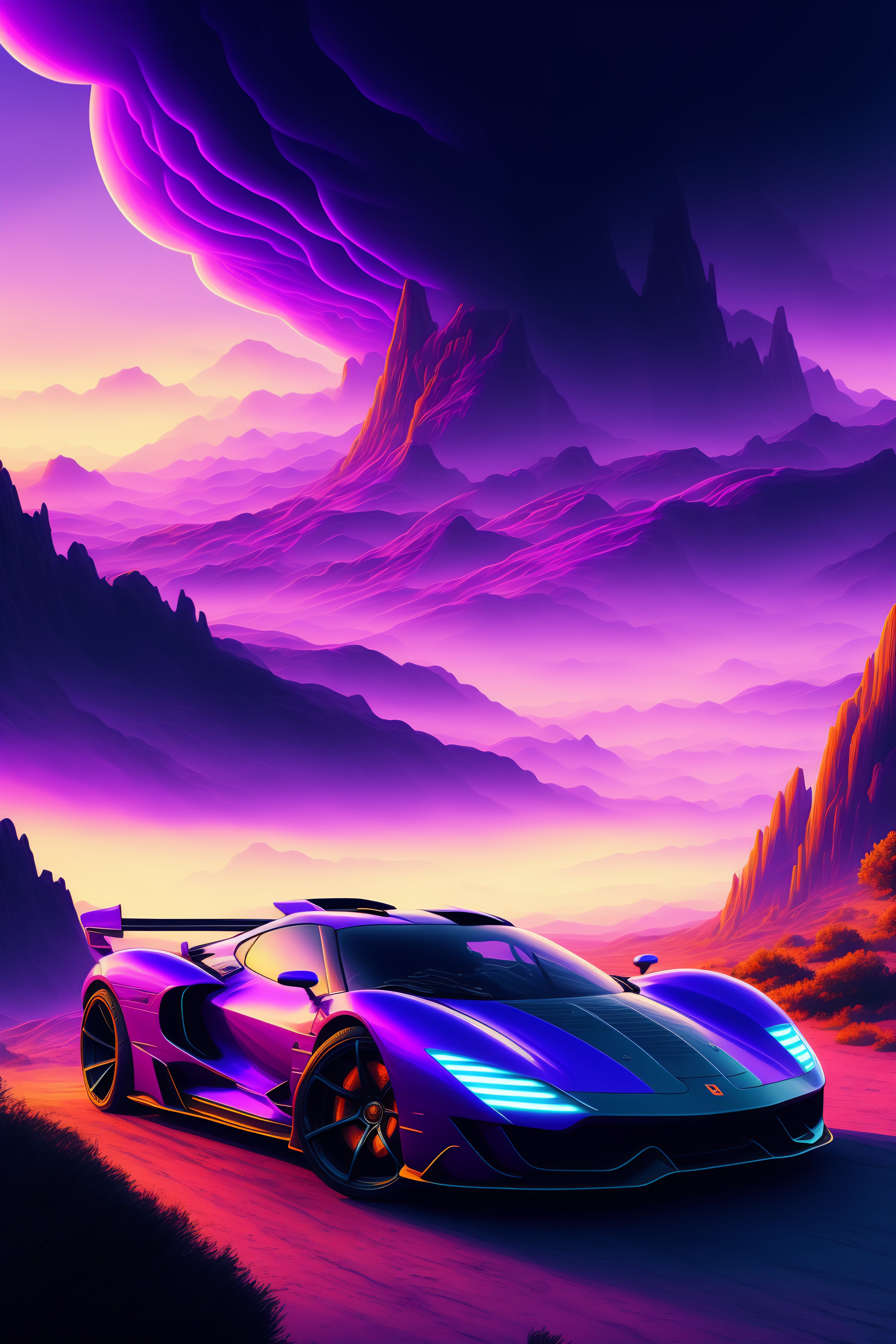 Illustration of super cars by dan mumford, alien landscape and vegetation, epic scene, a lot of swirling clouds, high exposure, highly detailed, fantastical, vibrant purple tinted colors, uhd