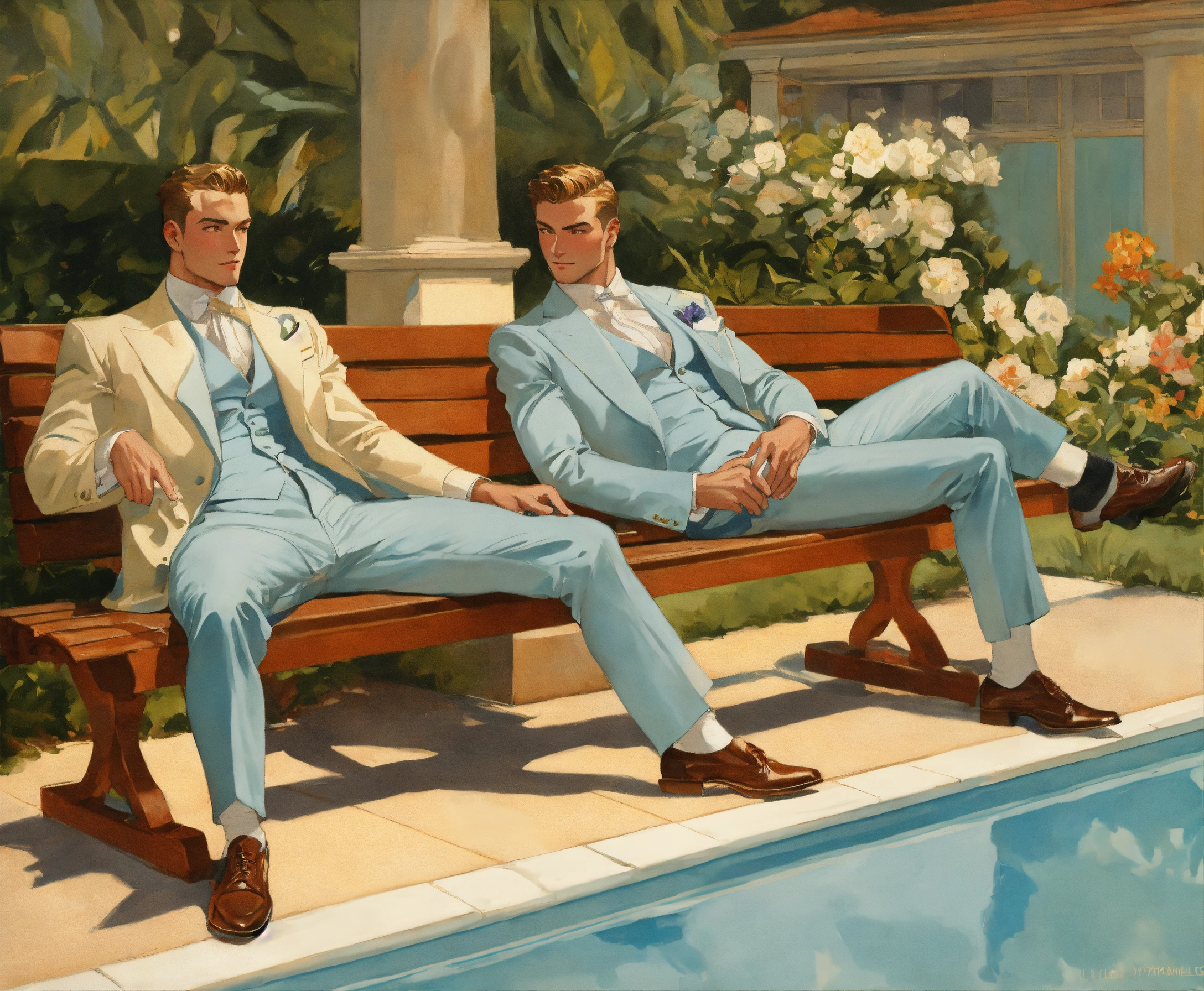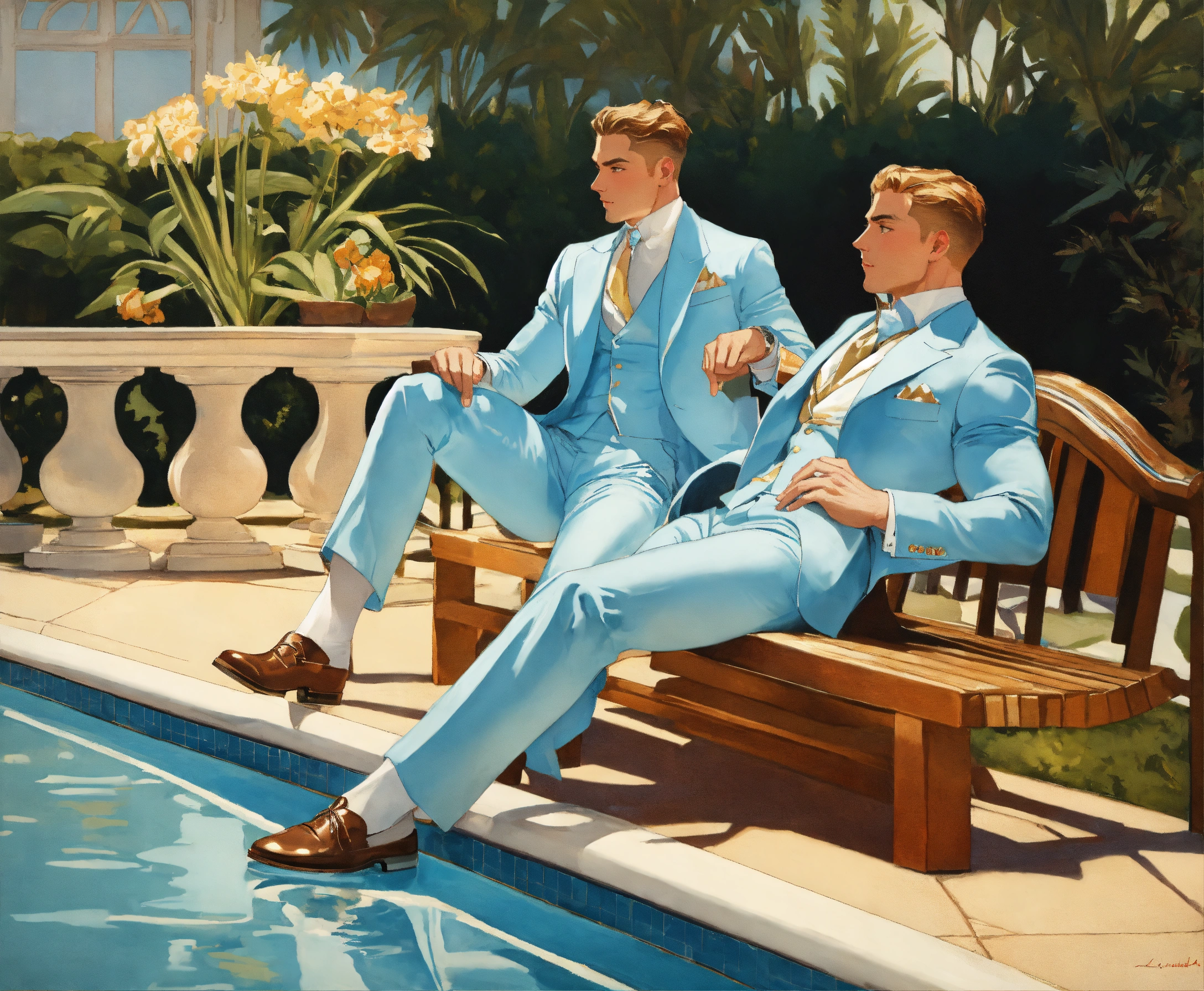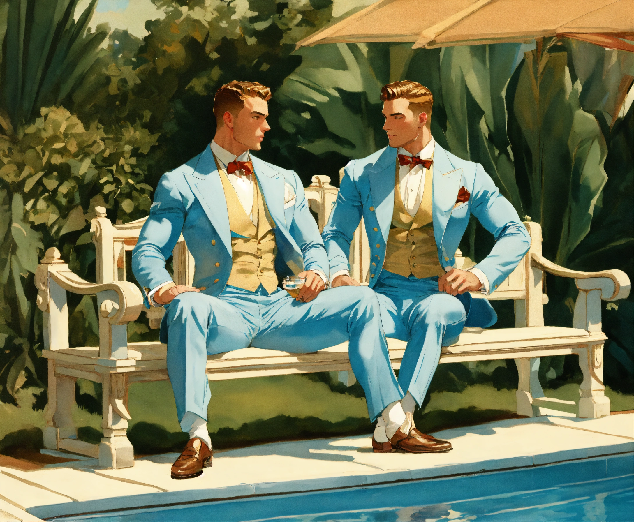 Two muscled male sportsmen in pale blue vested suit stretching their thighs on a bench by the pool, leyendecker style