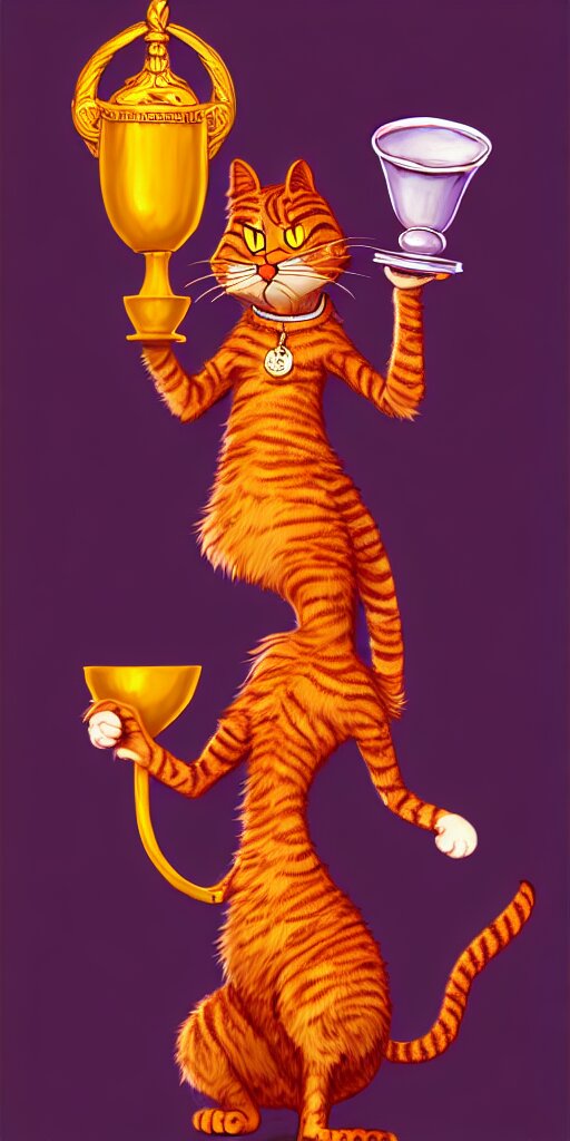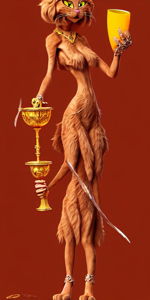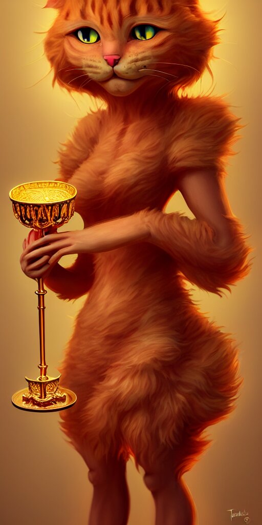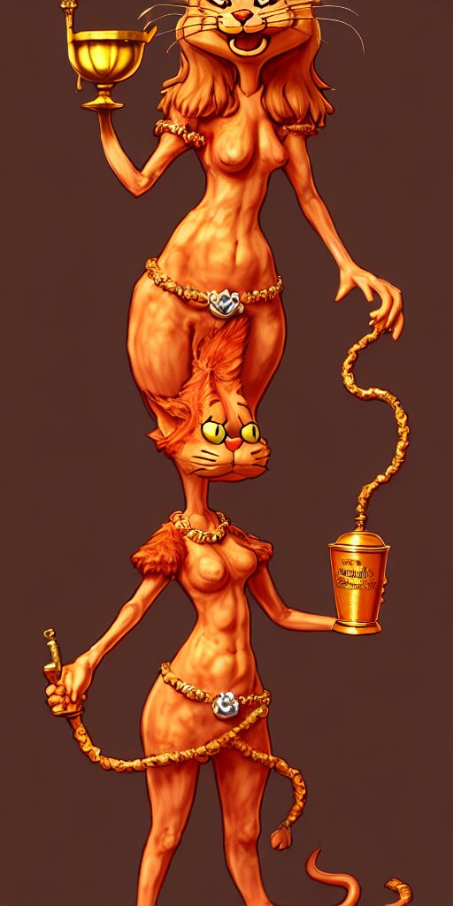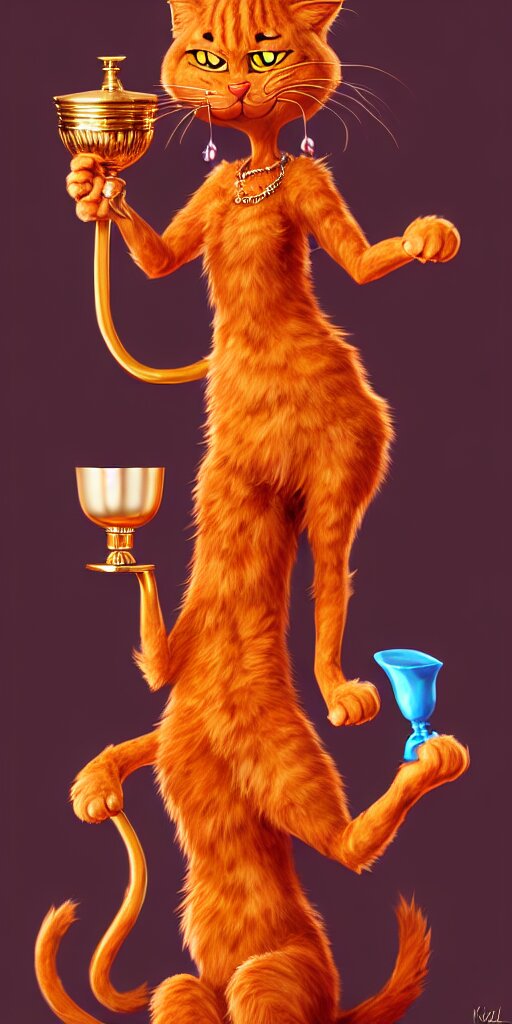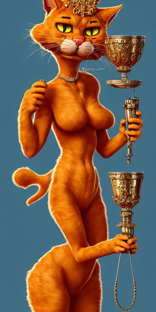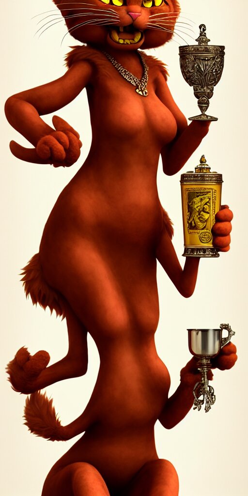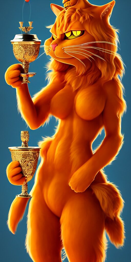 Fullbody!! personification of garfield the cat garfield goddess holding a blood chalice, detailed, stunning, garfield cat face, hyperrealistic, trending on artstation, smooth and sharp, intricate, highly detailed, elegant, professional character concept art by tatyana kupriyanova