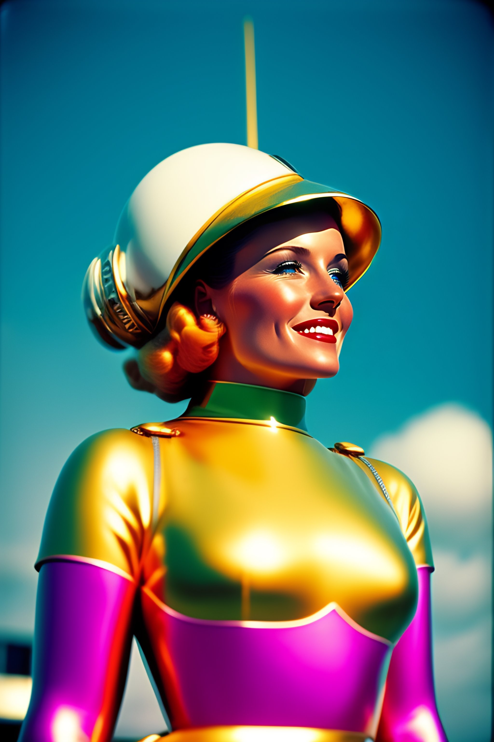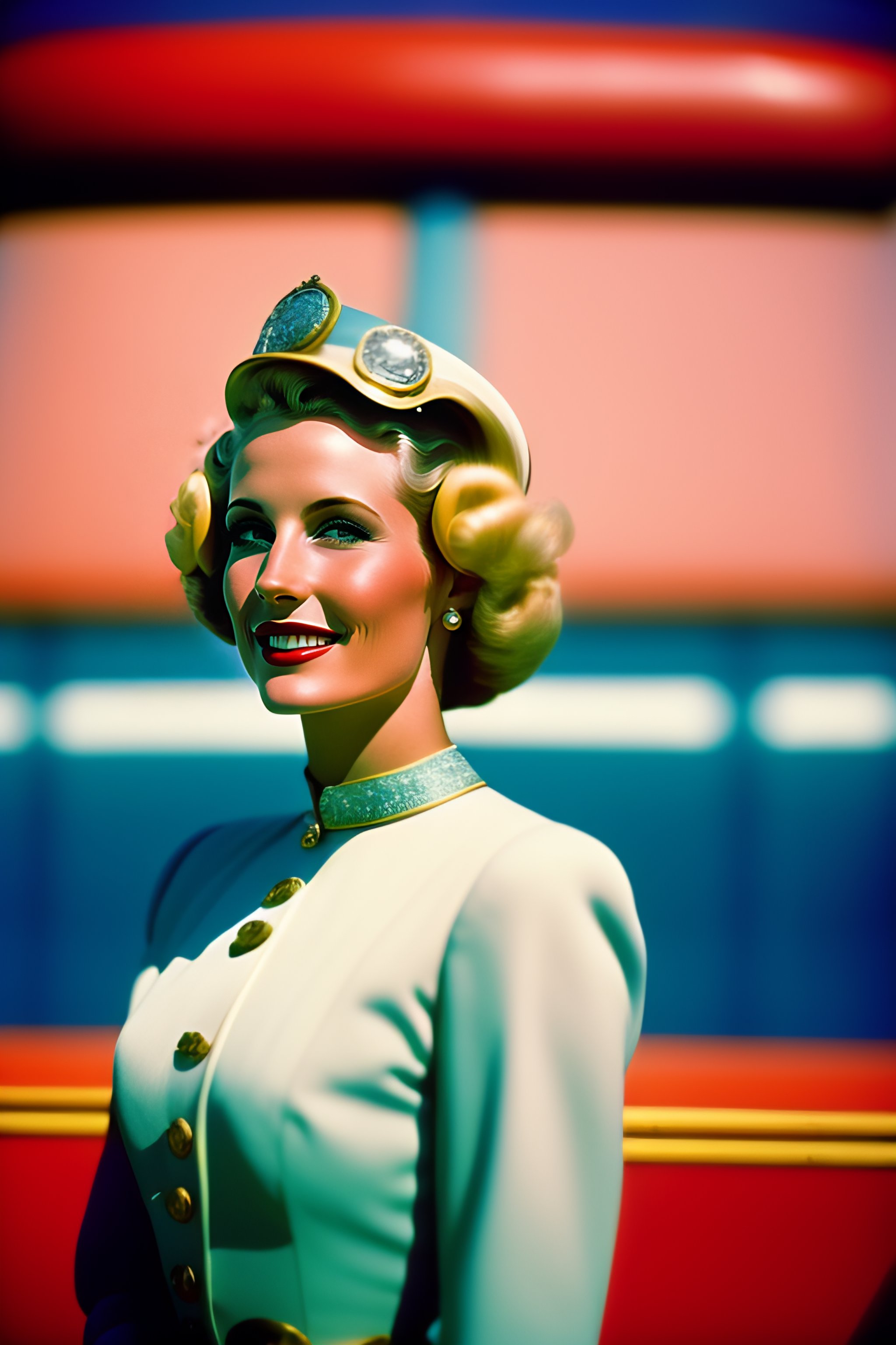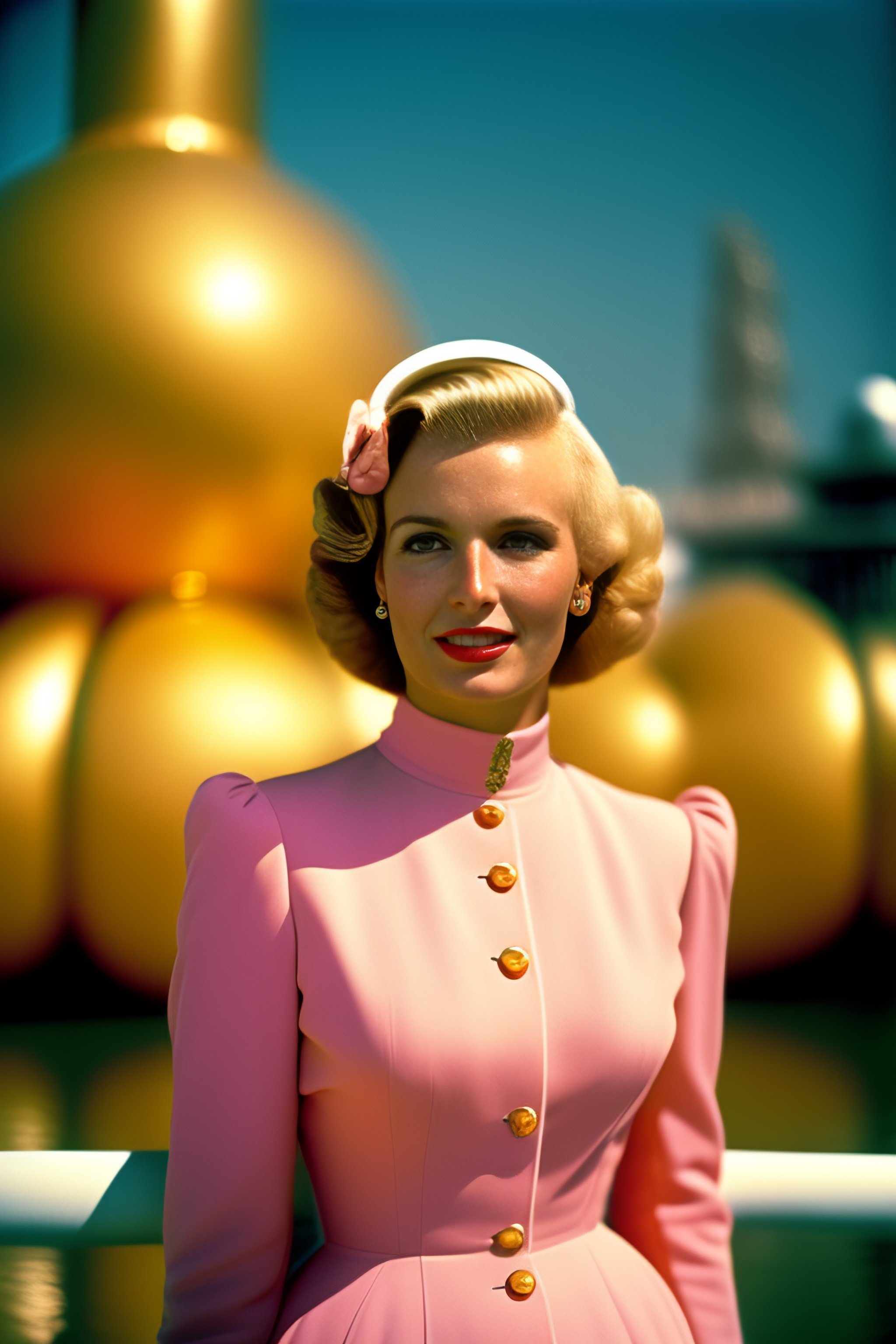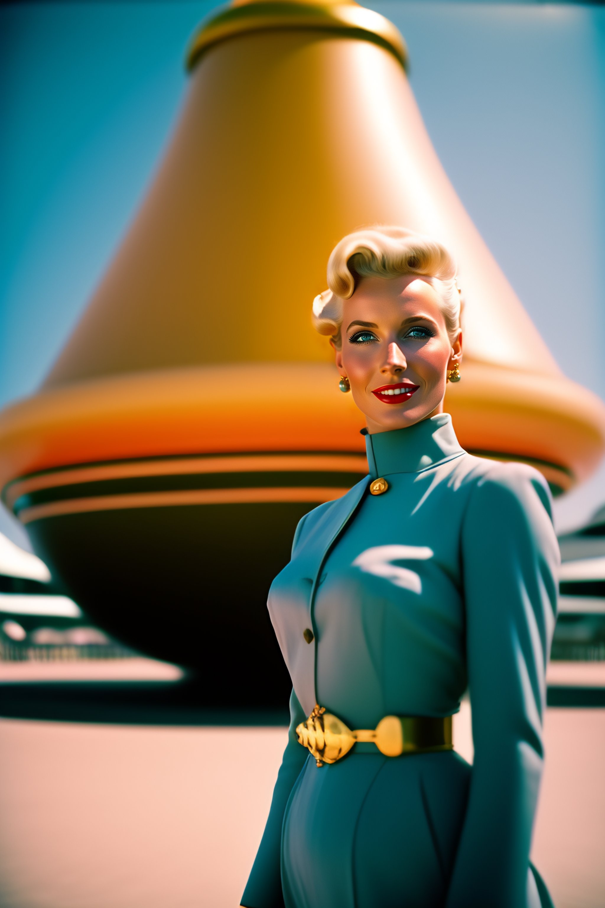 1954, blonde french woman smile, bell diving suit, world's fair googie architecture, pastel, in the style wes anderson, kodak film colour, 35mm lens