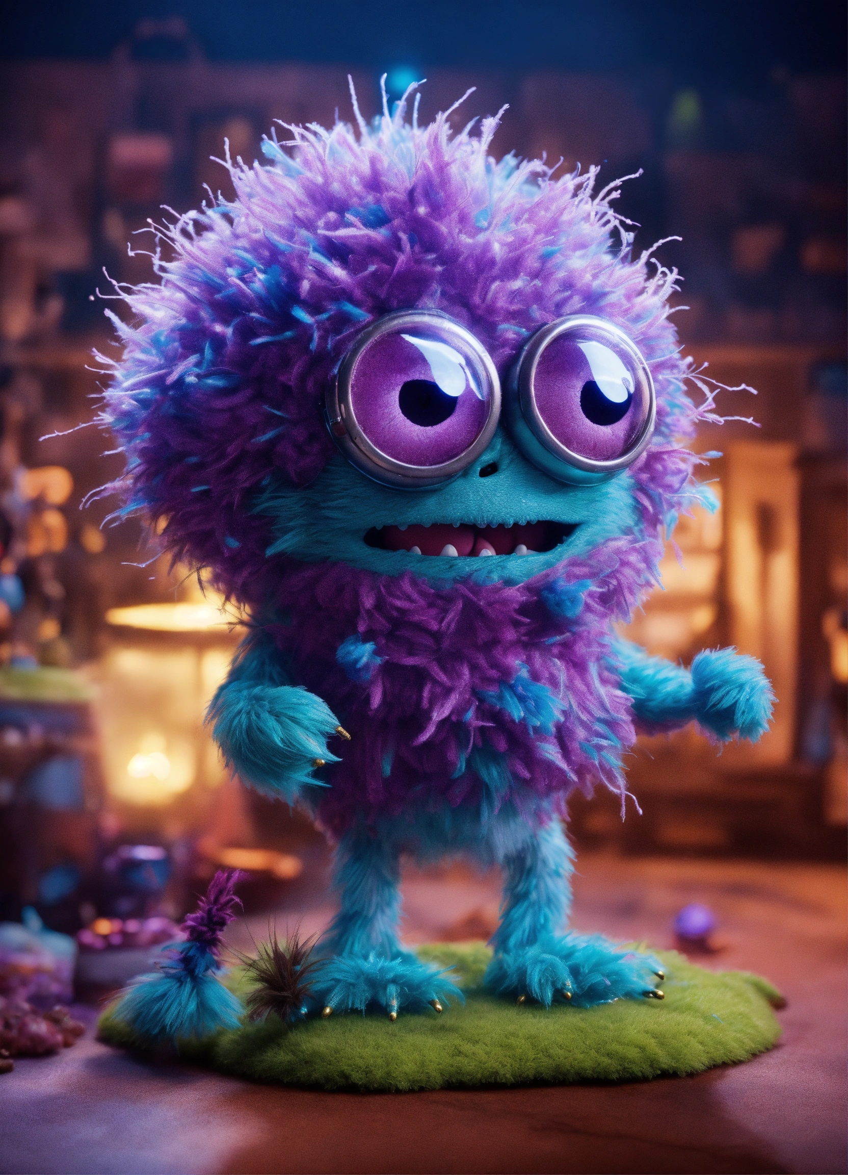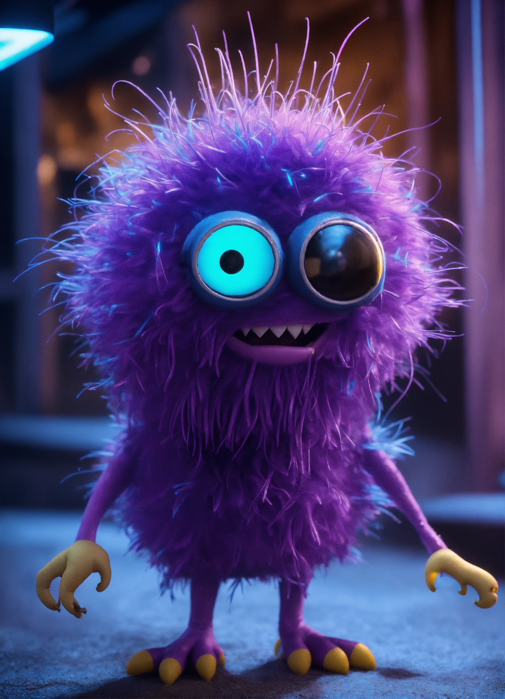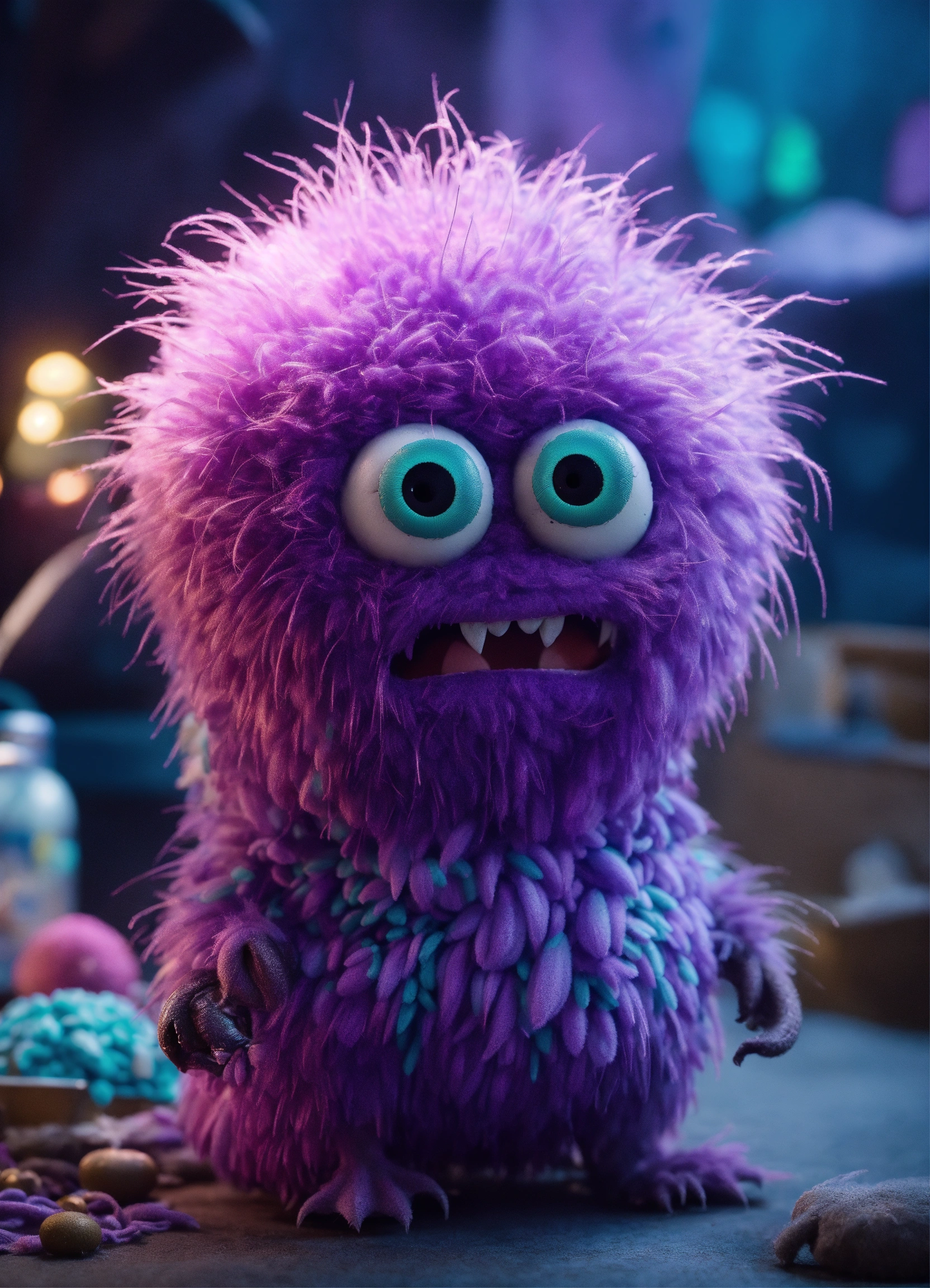 Cgi! germ monster character, highly detailed, scary but charming, gremlin, tribbles, minions, stop motion! purple and blue lighting!
