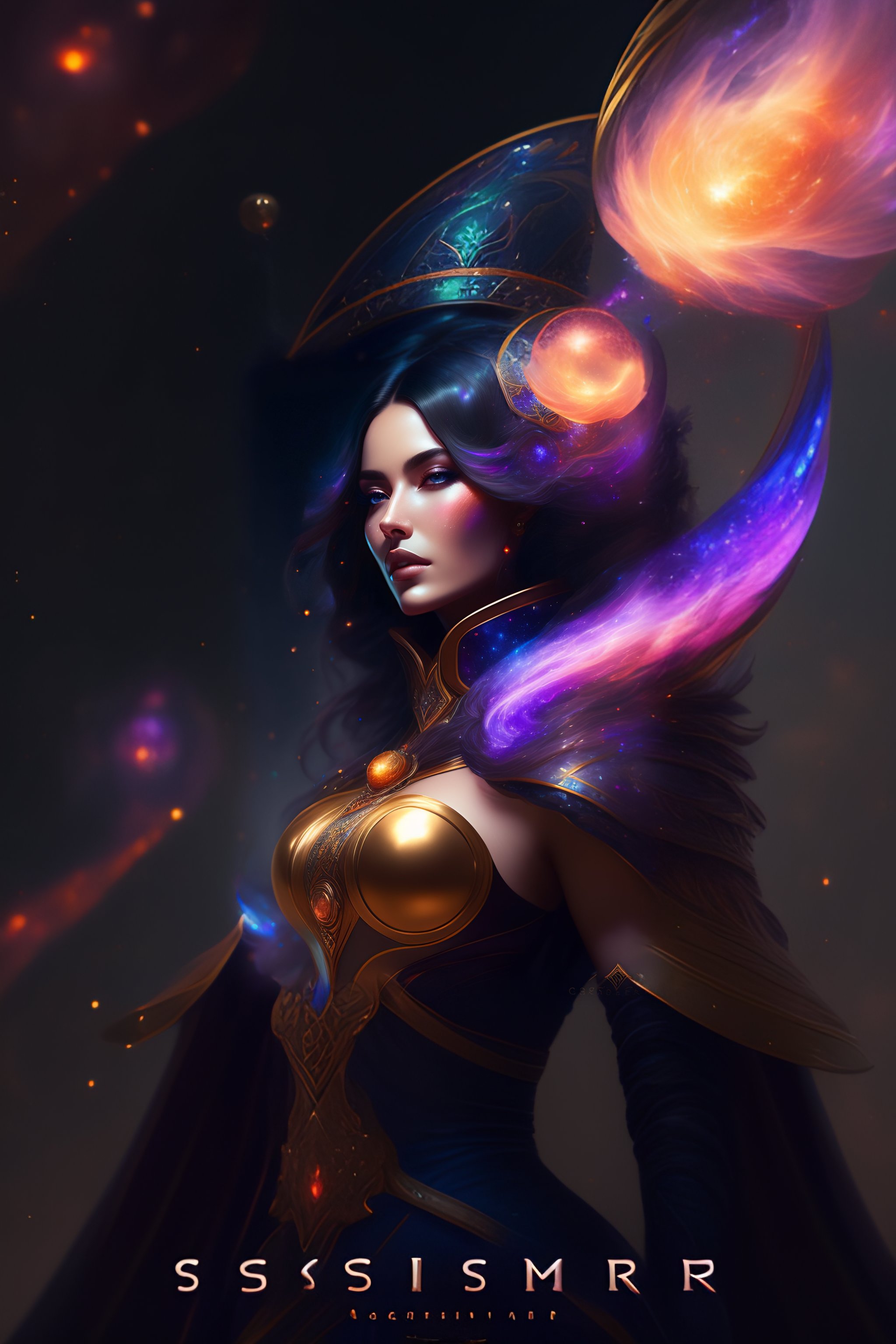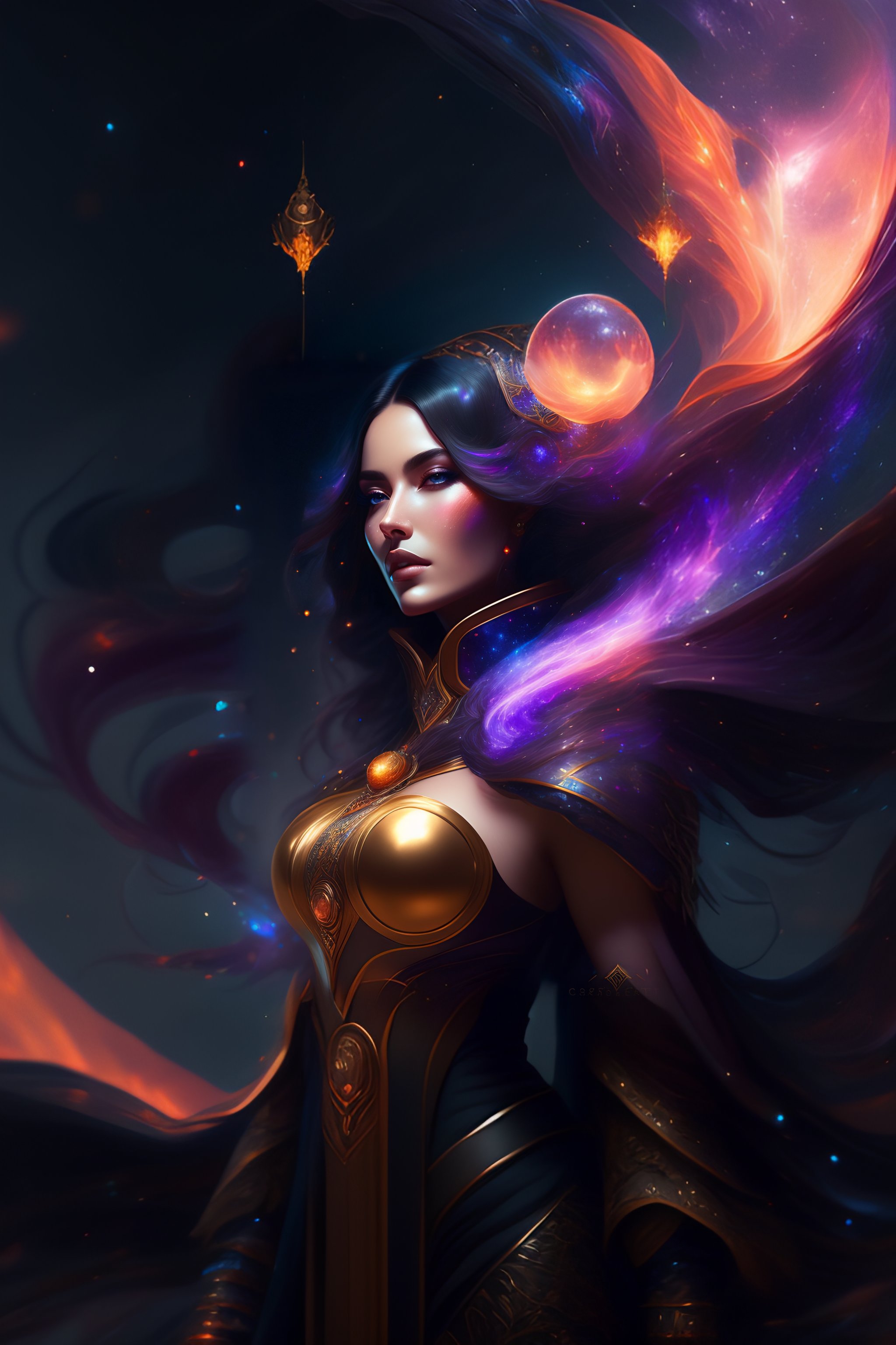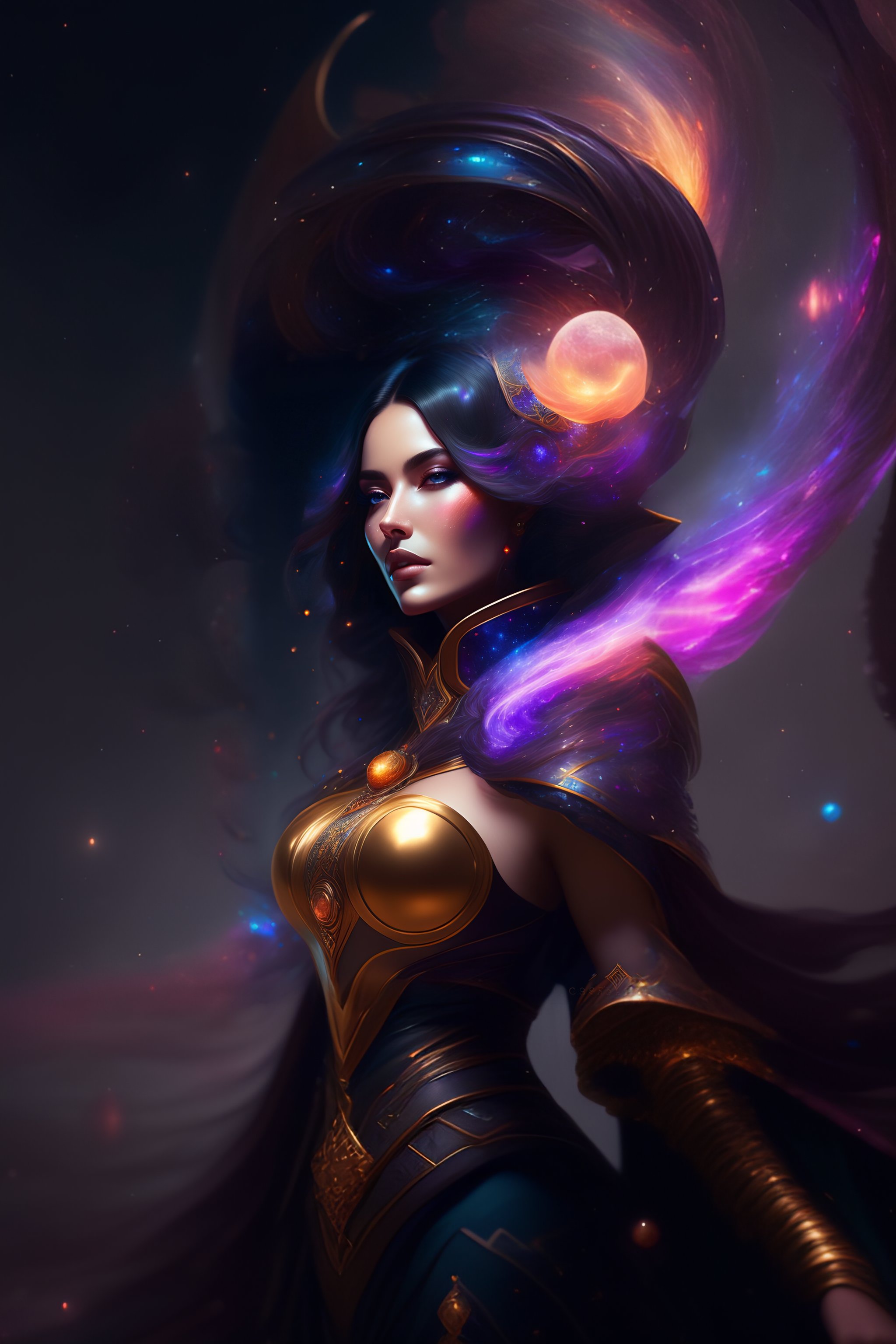 Cosmic sorceress, nebulas, galactic, concept art portrait by greg rutkowski, artgerm, hyperdetailed intricately detailed gothic art trending on artstation triadic colors unreal engine 5 detailed matte painting, deep color, fantastical, intricate detail, splash screen, complementary colors, fantasy concept art, 8k resolution, gothic deviantart masterpiece