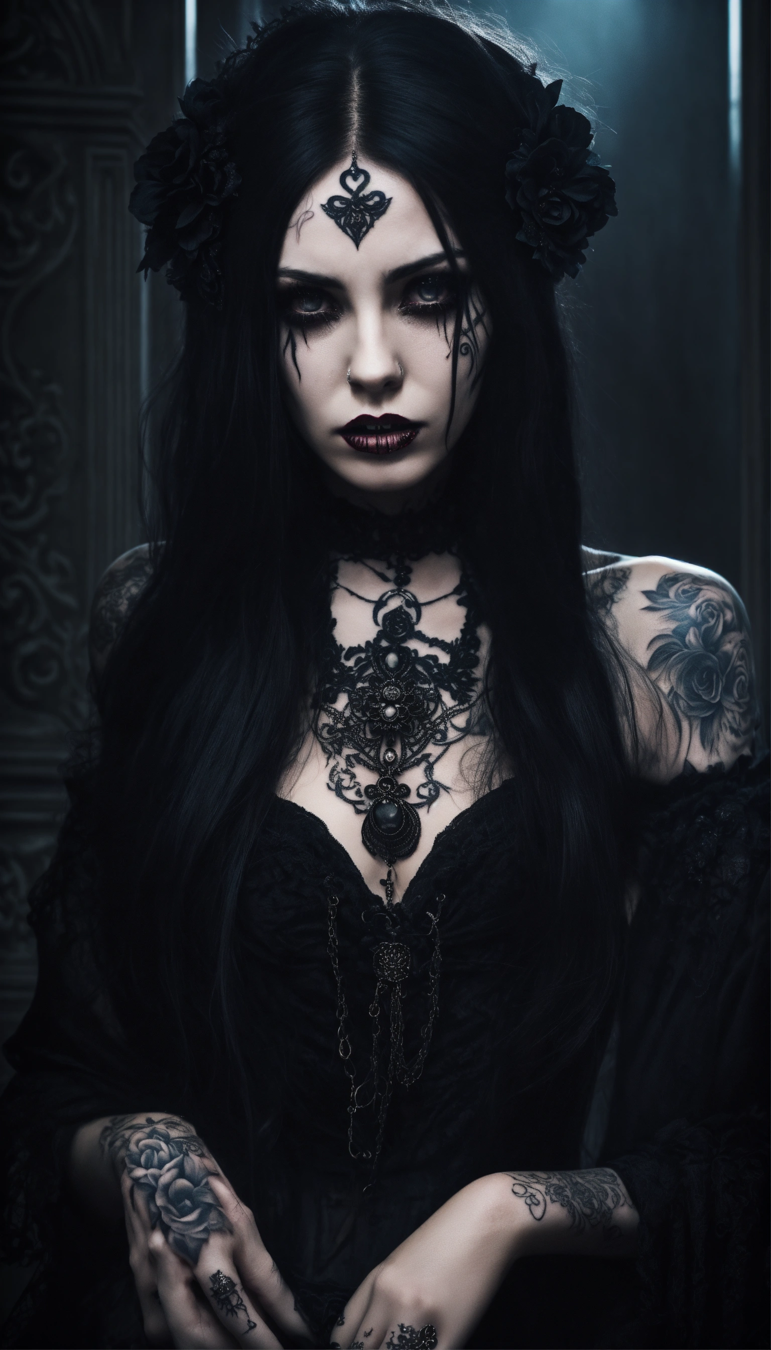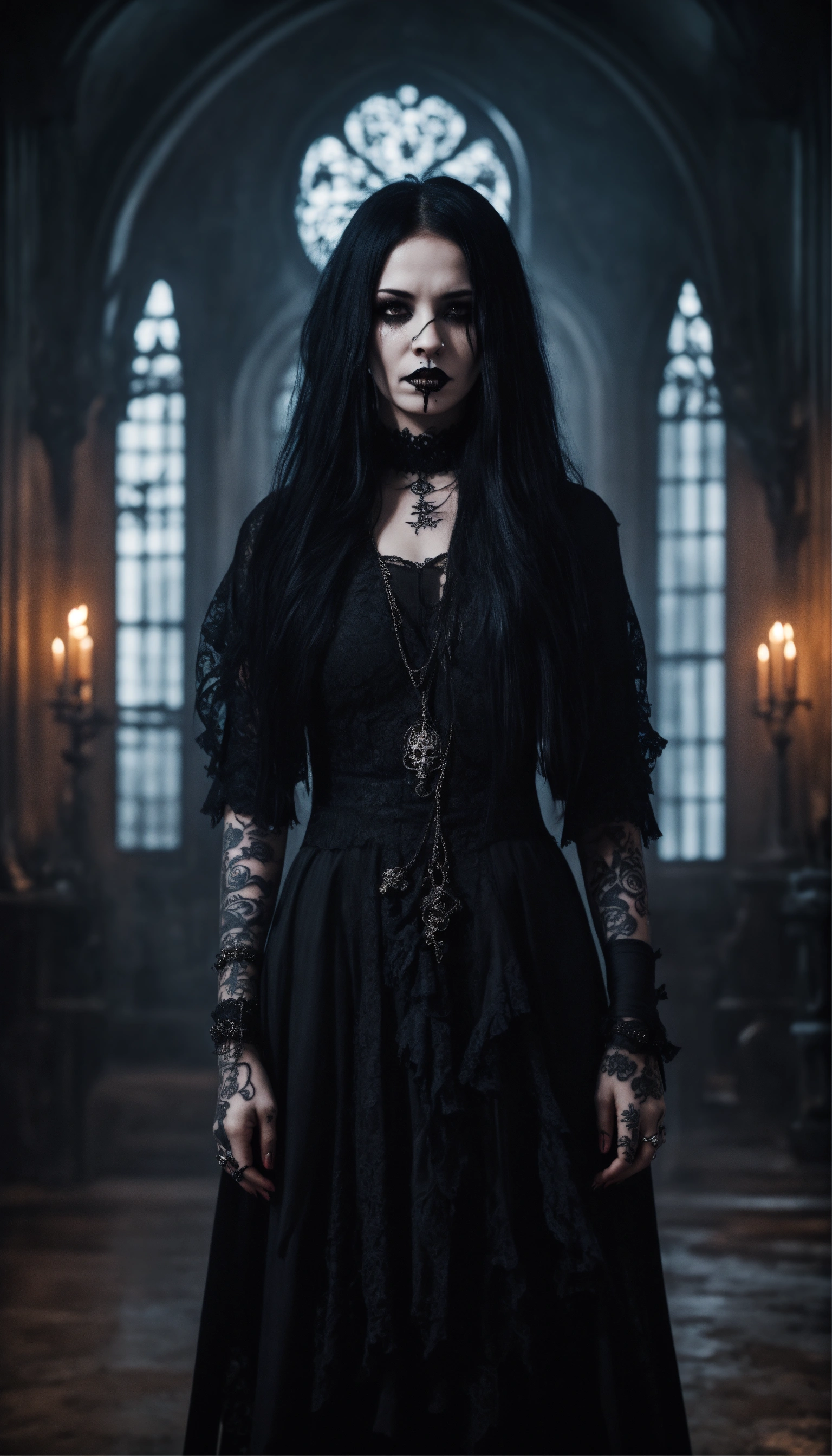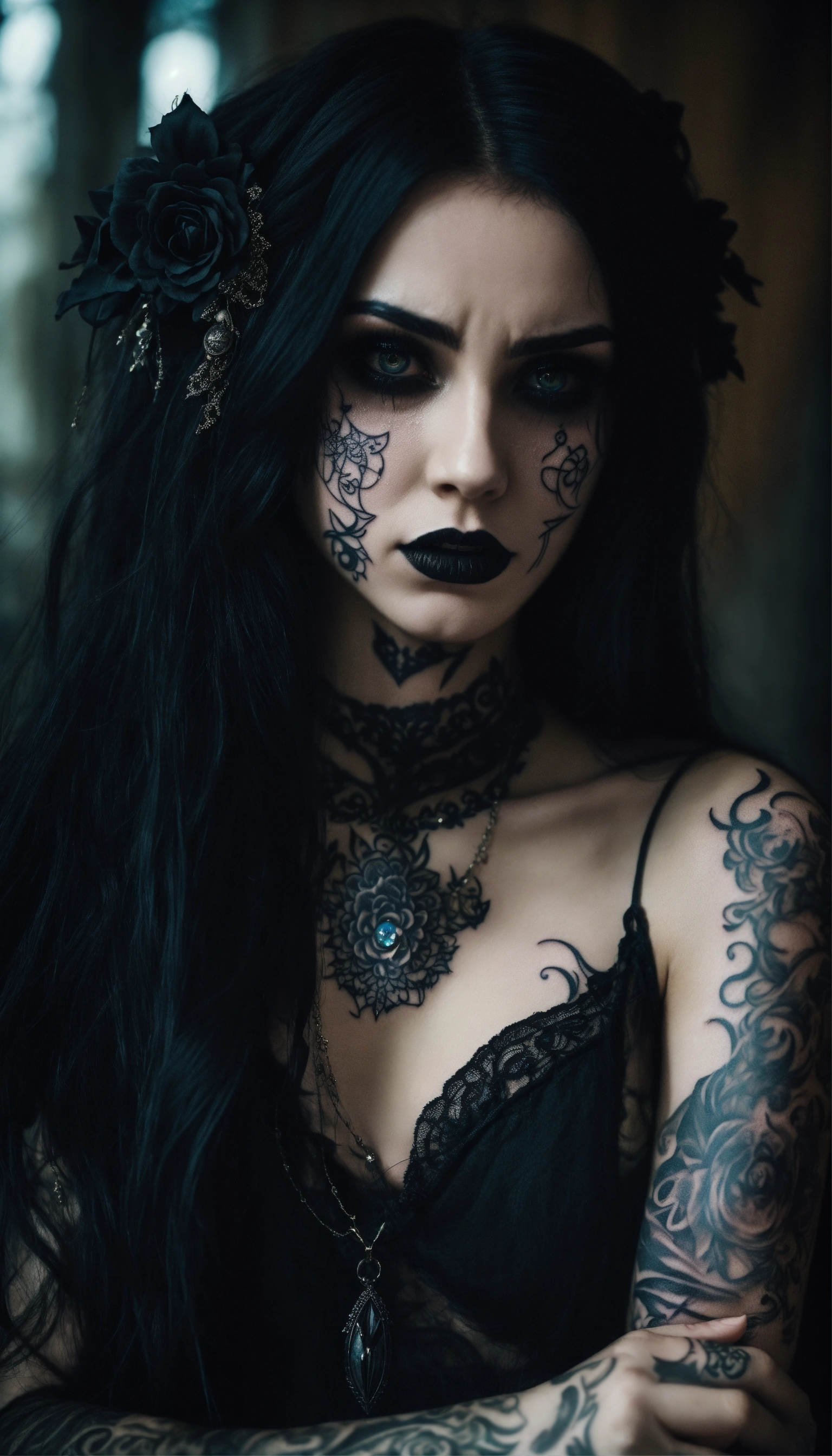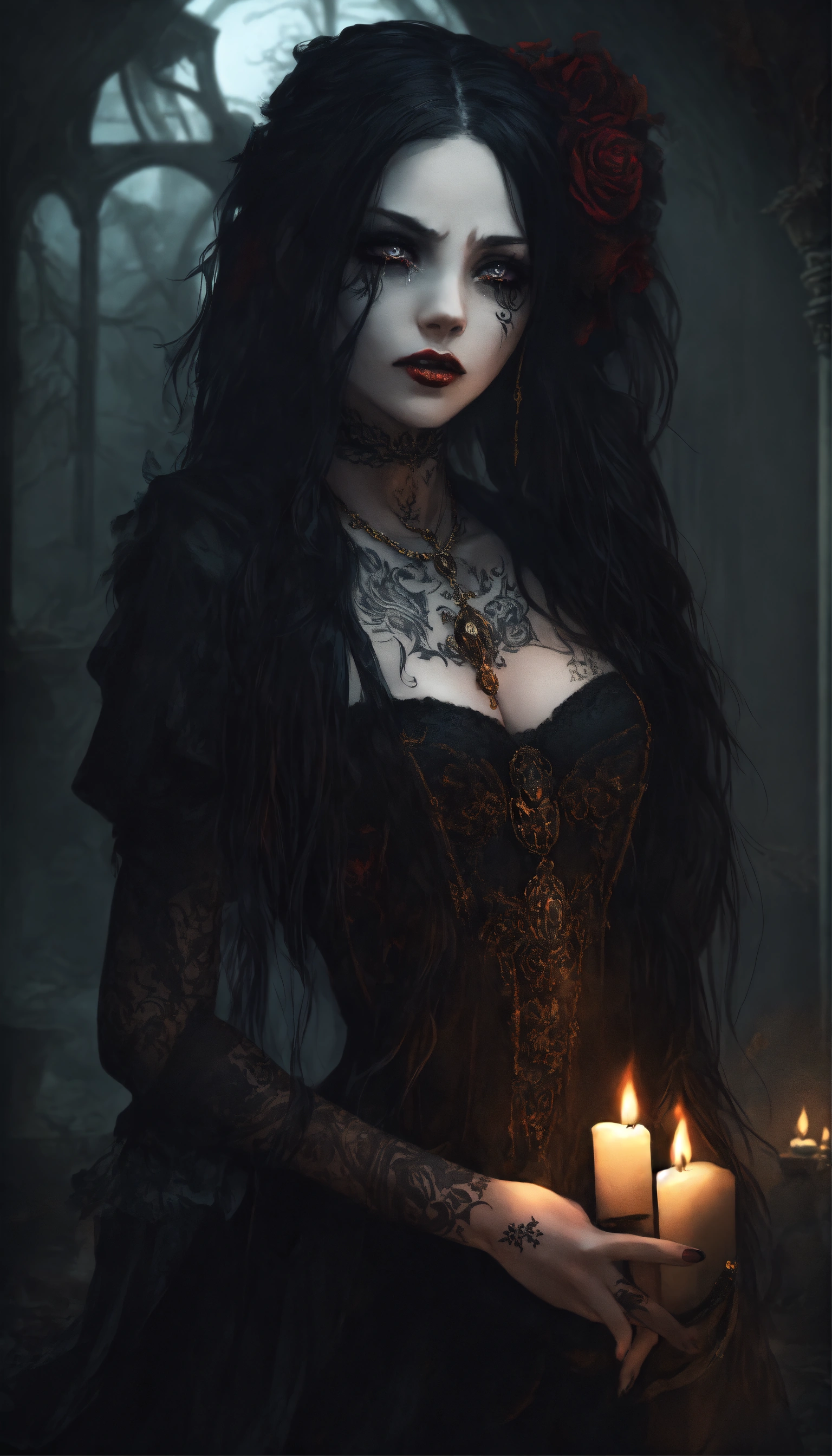 A scary girl, full body, pale skin, long crazy black hair, dark eyes, a dark and mysterious appearance, facial tattoos, gothic aura, crying