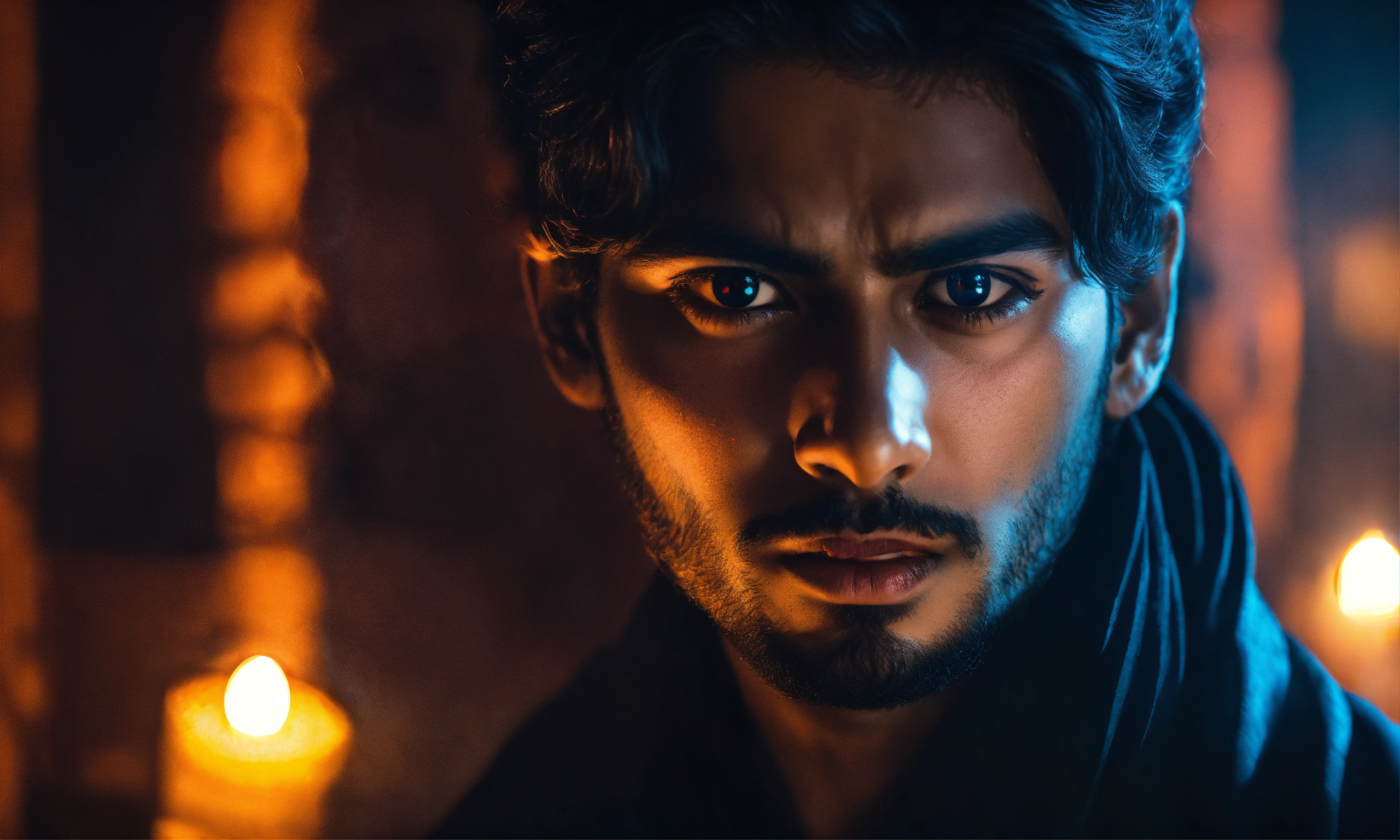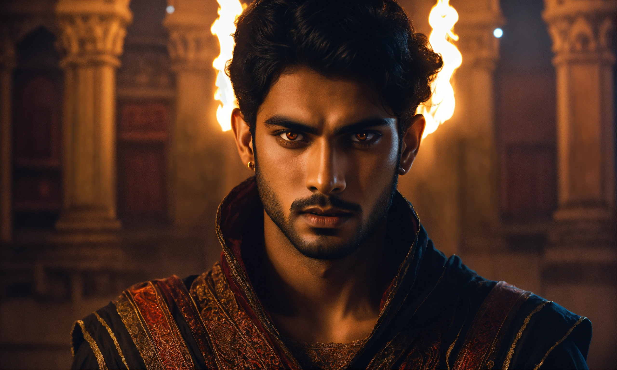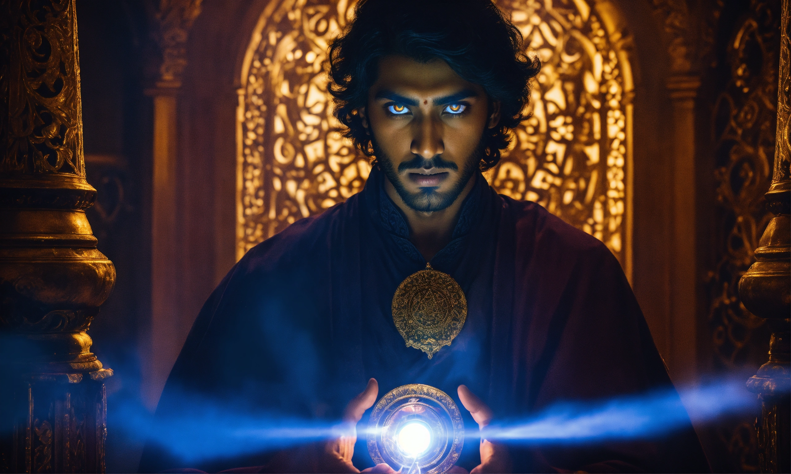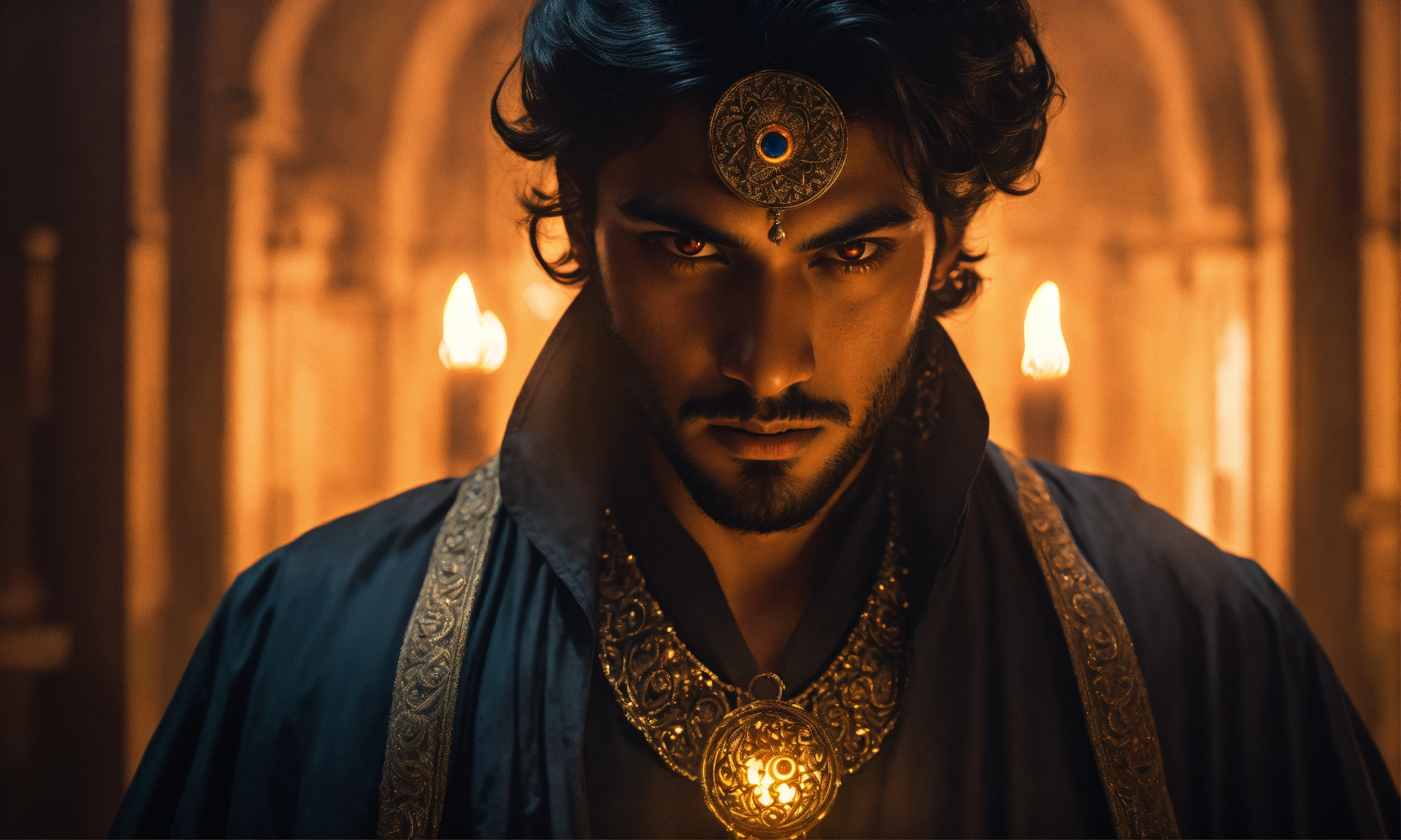 Dramatic headshot of a young handsome, wicked south asian sorcerer casting a spell with hypnotic glowing eyes, ominous palace, mysterious, shadowy.