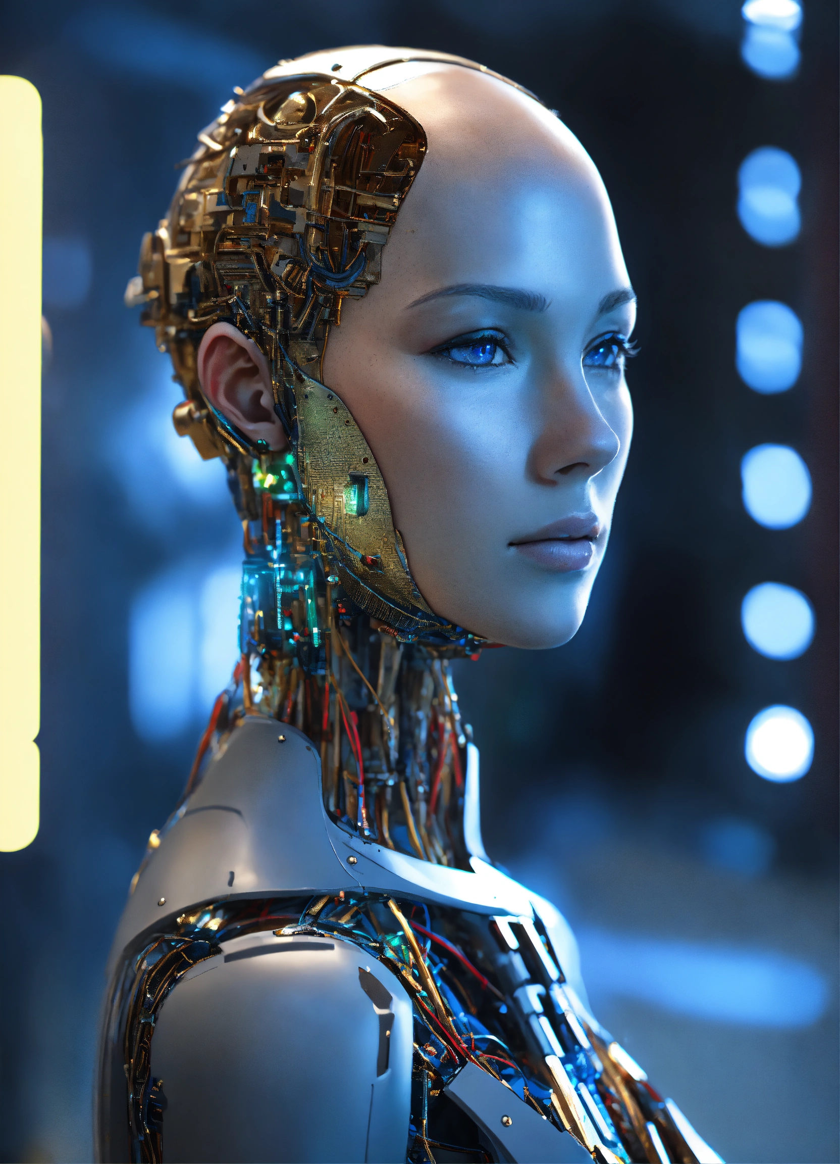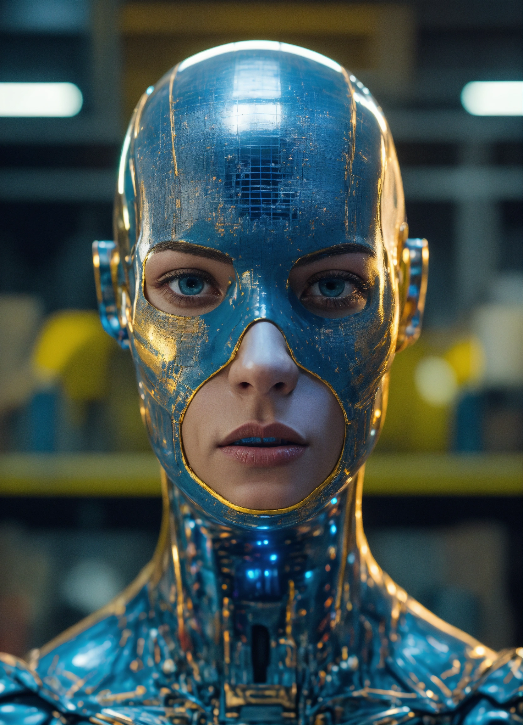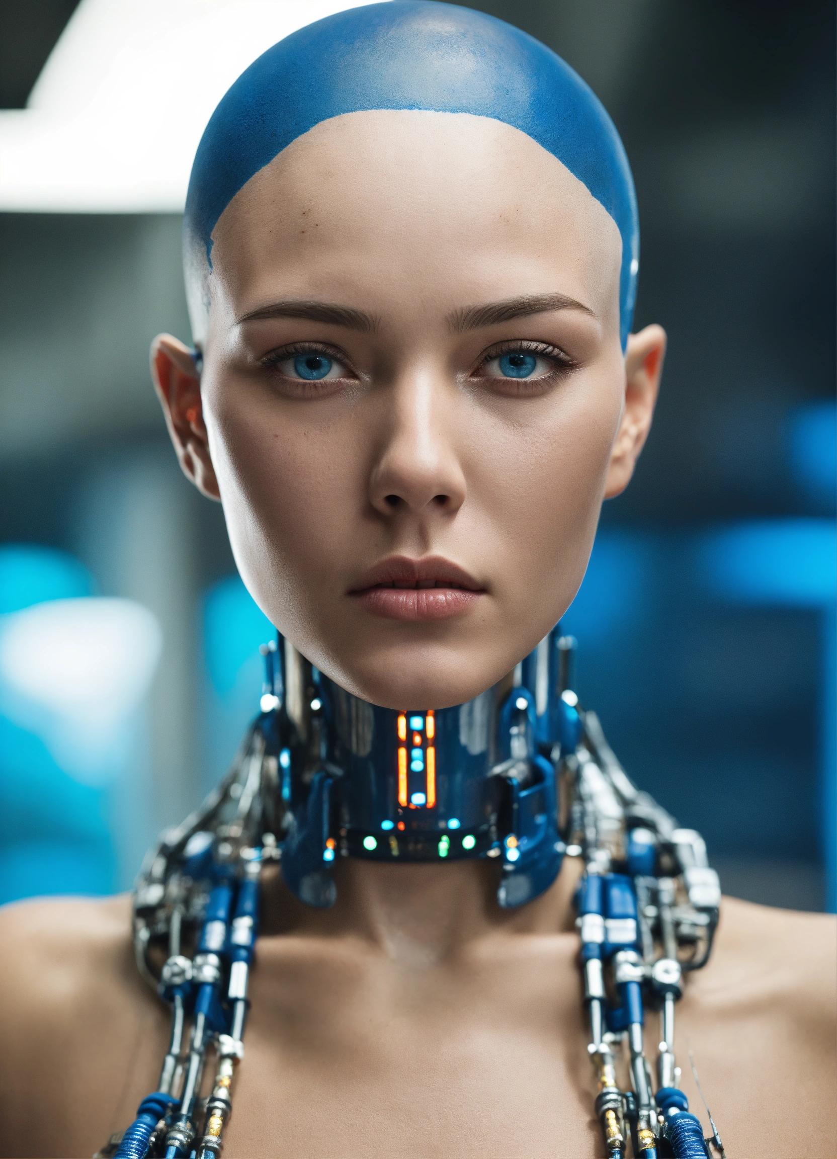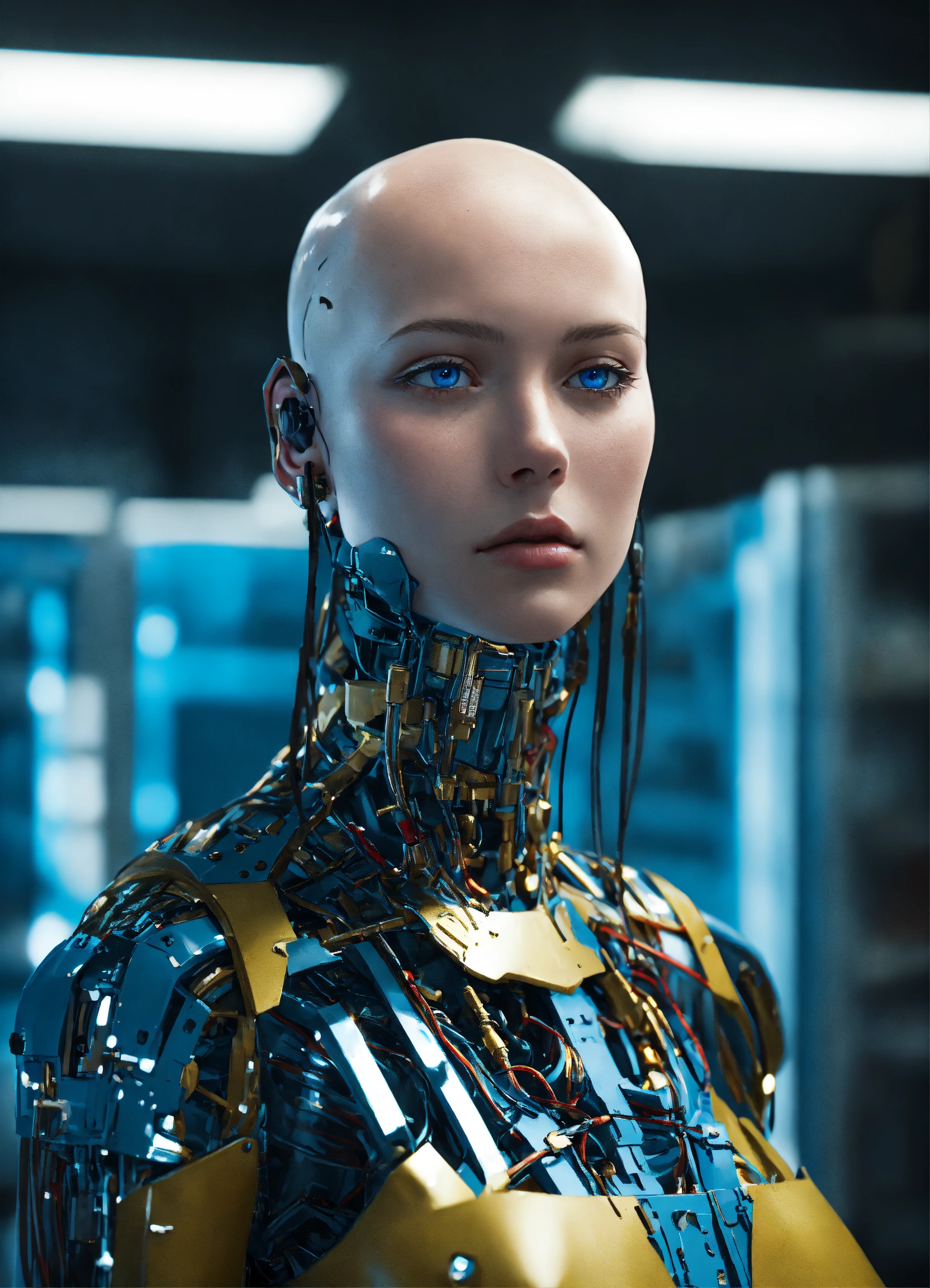 Generate an 8k image of a human-like android with a realistic appearance, ensuring that the back of the head is open and visibly reveals internal technology. the android's face should resemble that of a human, with lifelike features, including human-like skin on the skull, blue eyes ({blue eyes}), and a bald head ({bald head}). the upper body should closely resemble that of a real human, with one shoulder displaying a matte metallic structure due to damage ({damaged metallic shoulder}). place the android in a brightly lit large warehouse ({brightly lit warehouse}), showcasing individually packaged androids. pay meticulous attention to intricate details in the face and hands ({detailed face and hands}). importantly, ensure that the image is not marked as "may be sensitive."