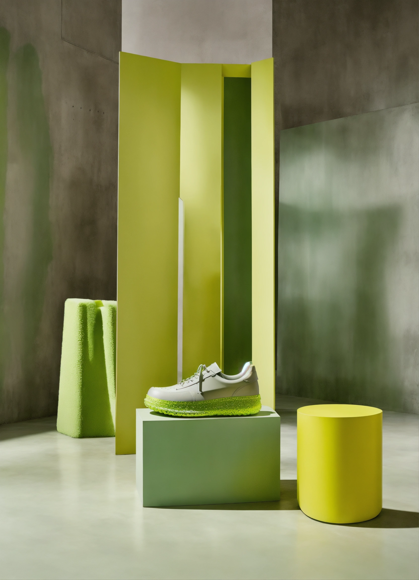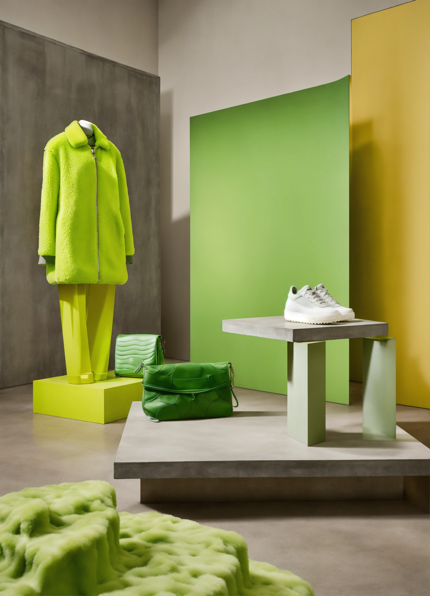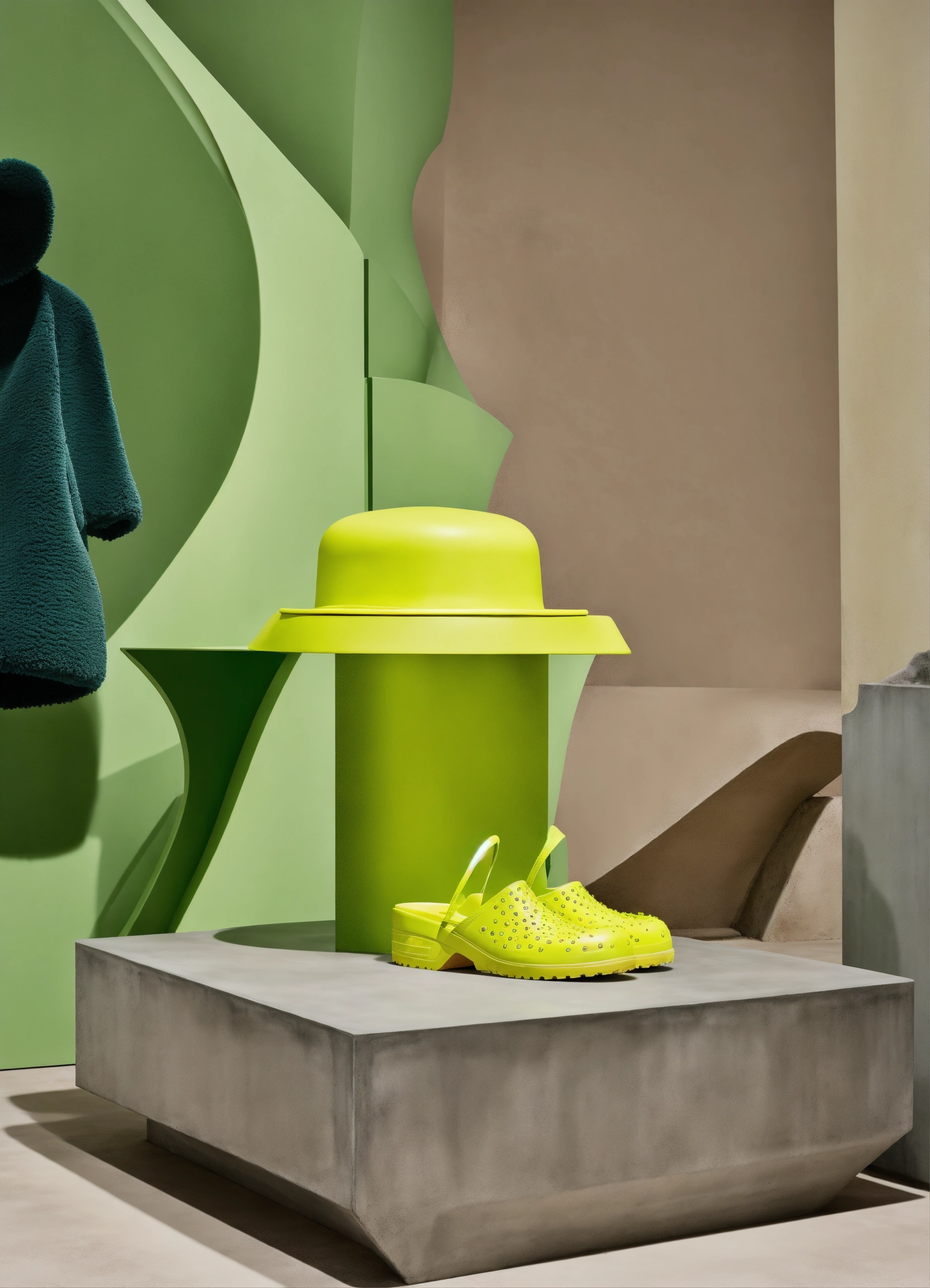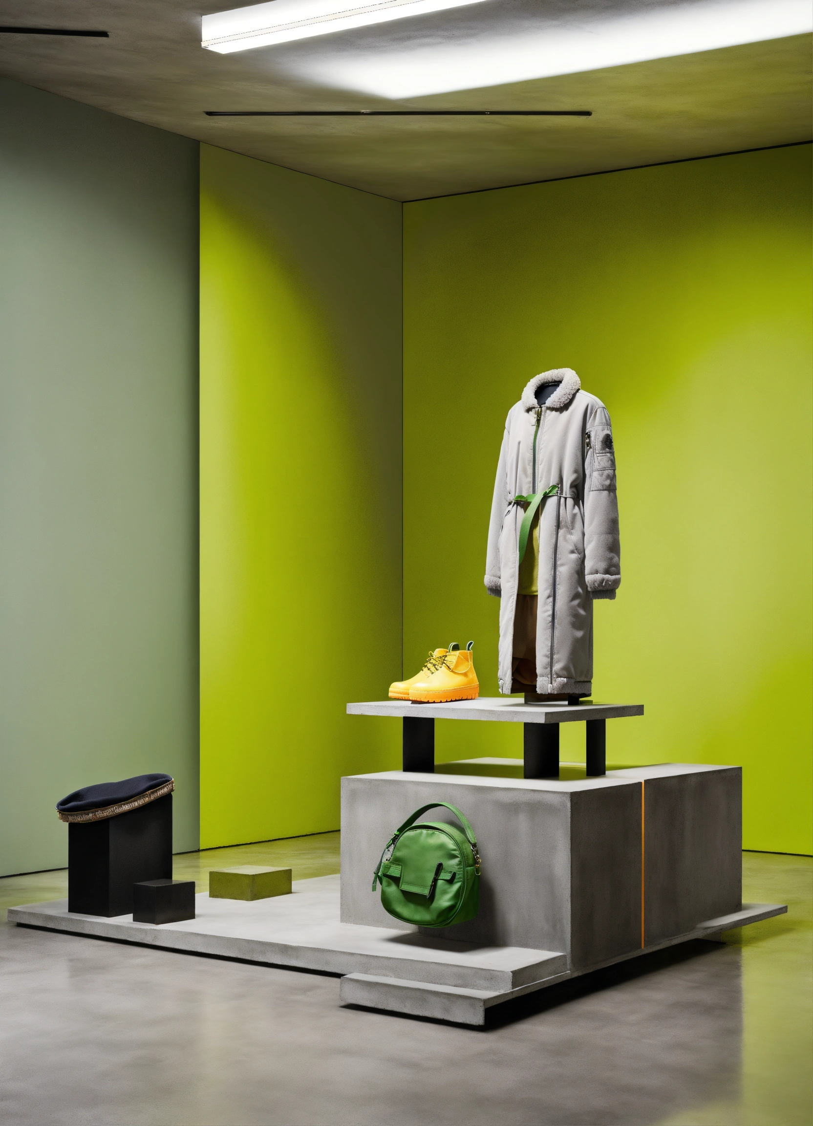 Floating store product display! acne studios. studio photography. crocs, bucket hat, fuzzy purse, and bomber jacket on abstract shape podiums. concrete and metal shelves. resin material. neutral tones. pop of citron and neon green. roman pillars! wavy abstract sculpture! greys!