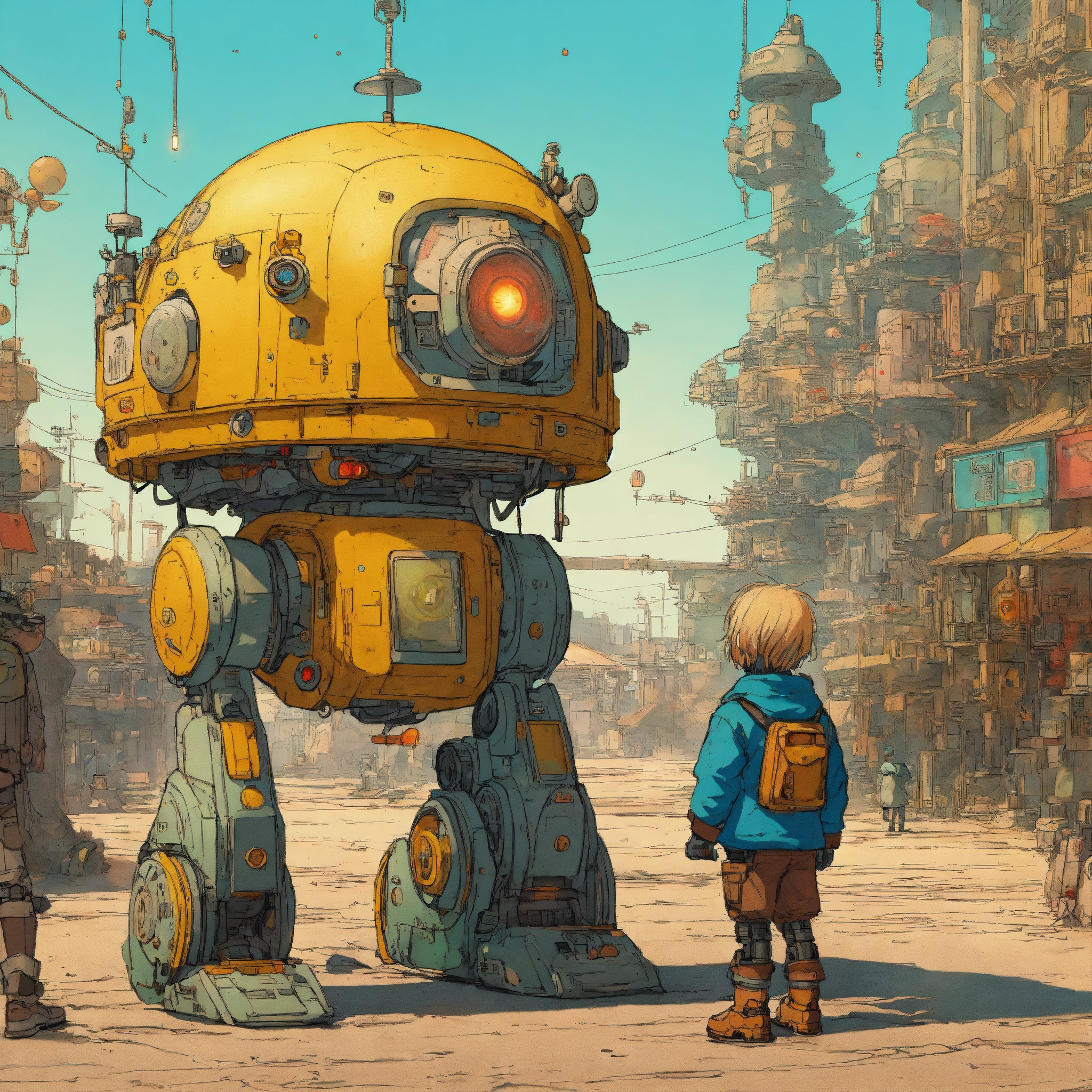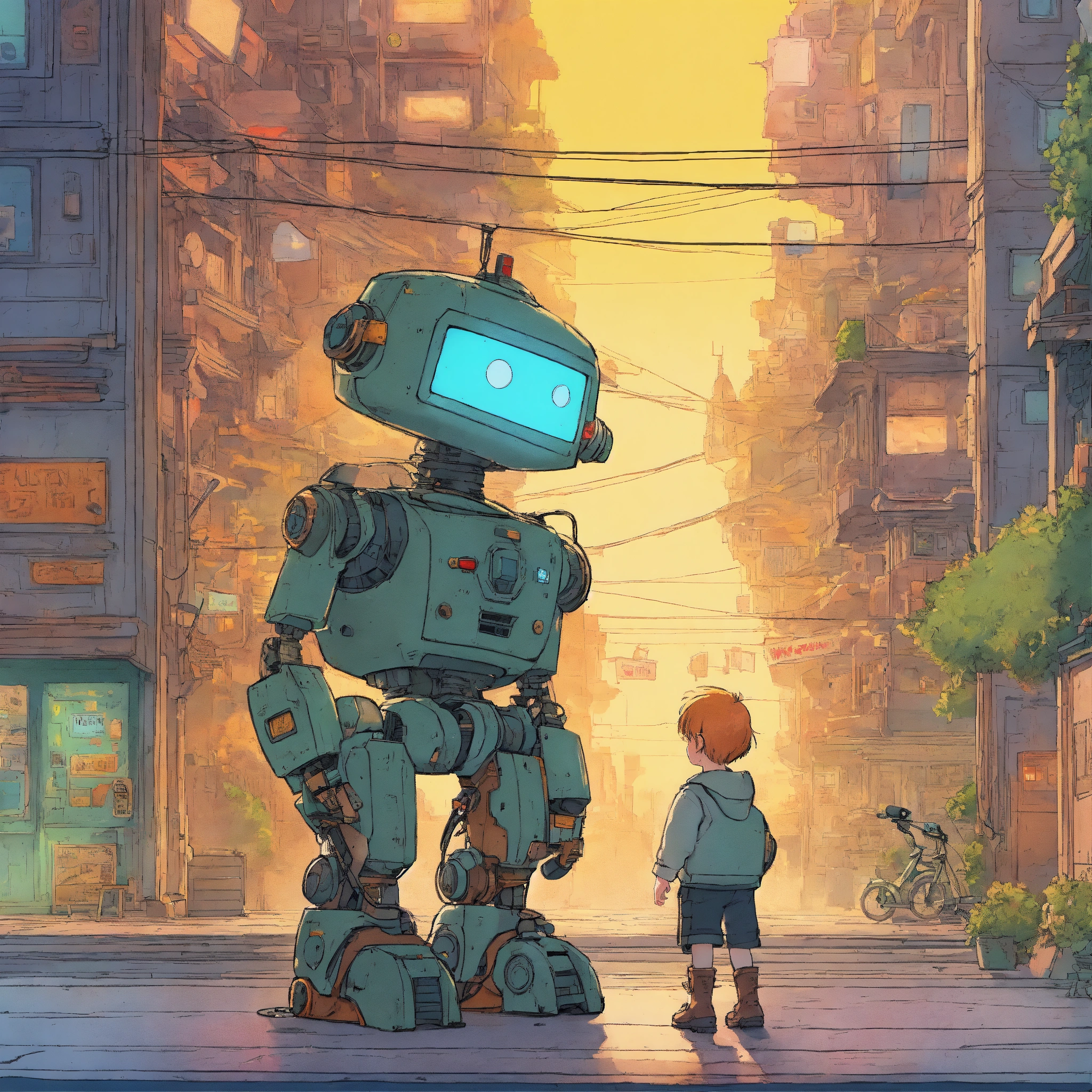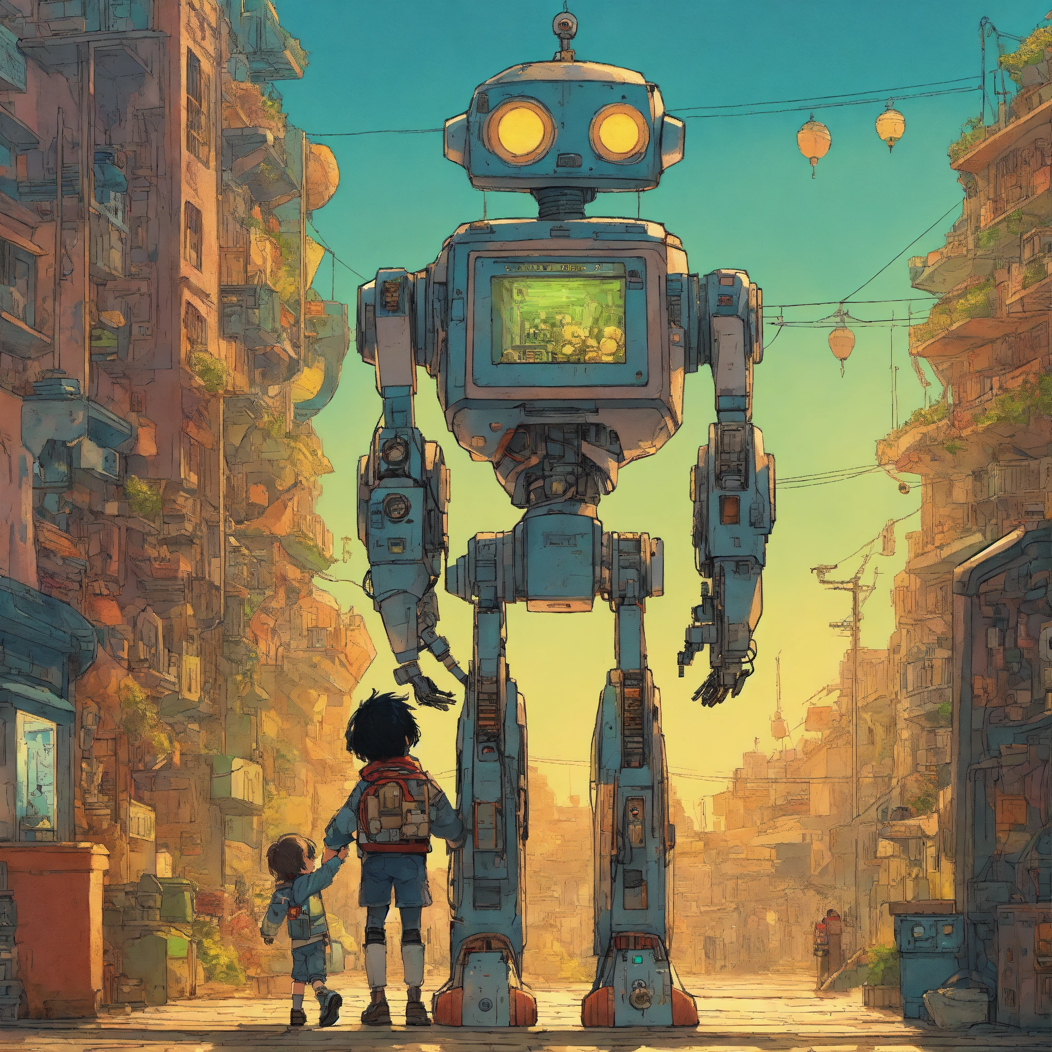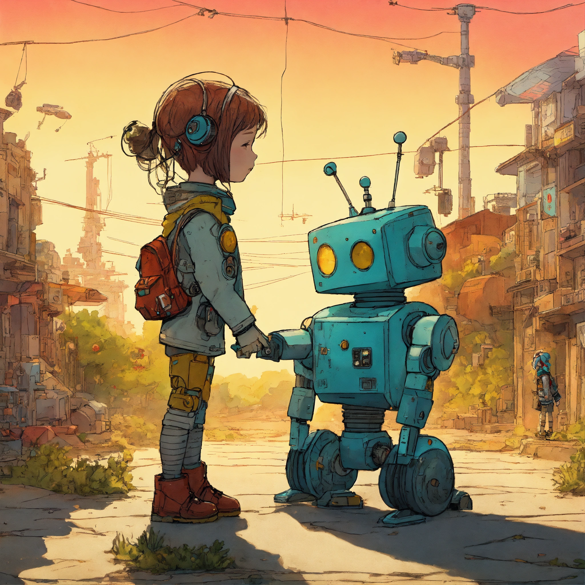 Futurepunk child and robot hugging each other, sunny day, colorful lighting, wide shot of the scene, sci-fi atmosphere, ultra-high definition (uhd), very detailed, by mattias adolfsson
